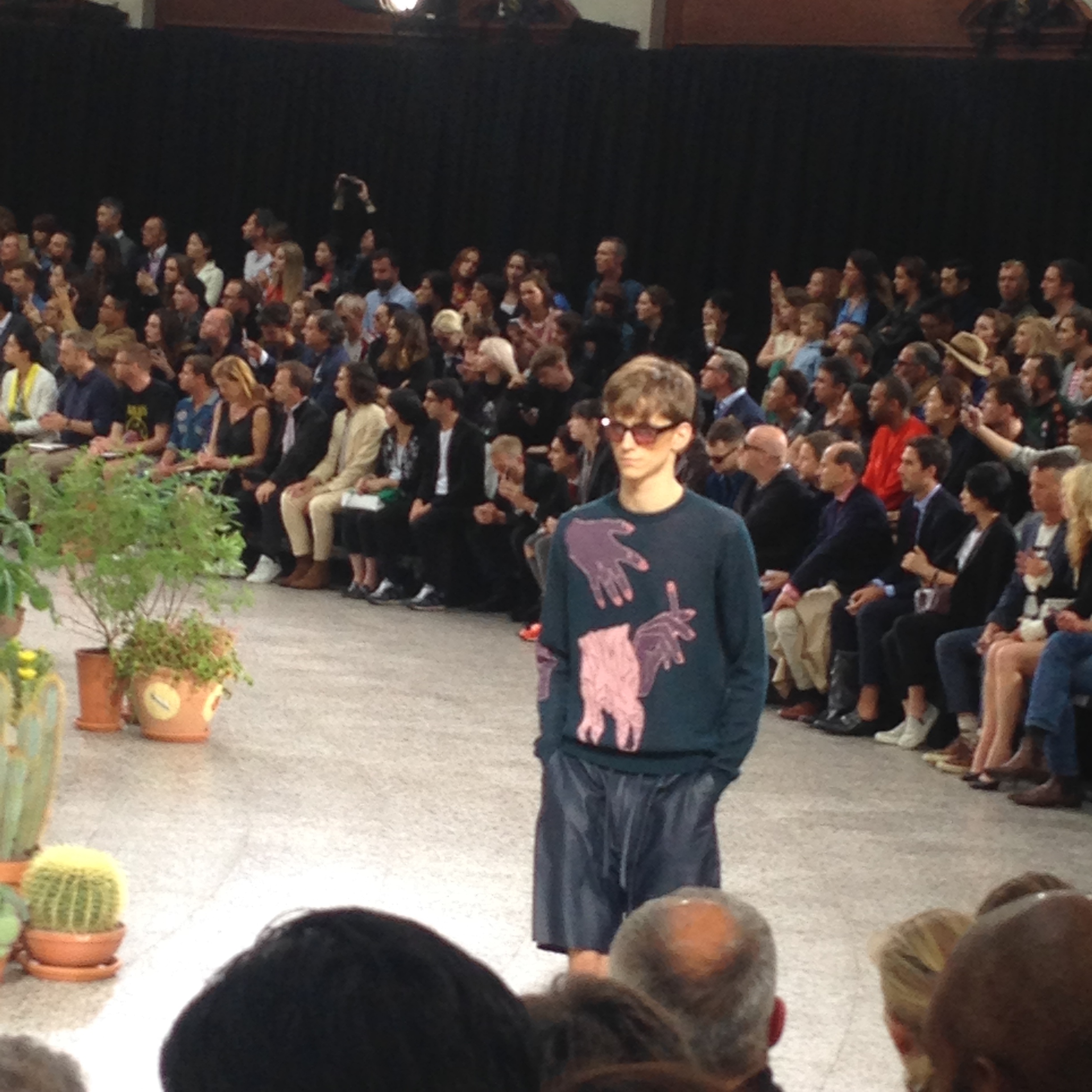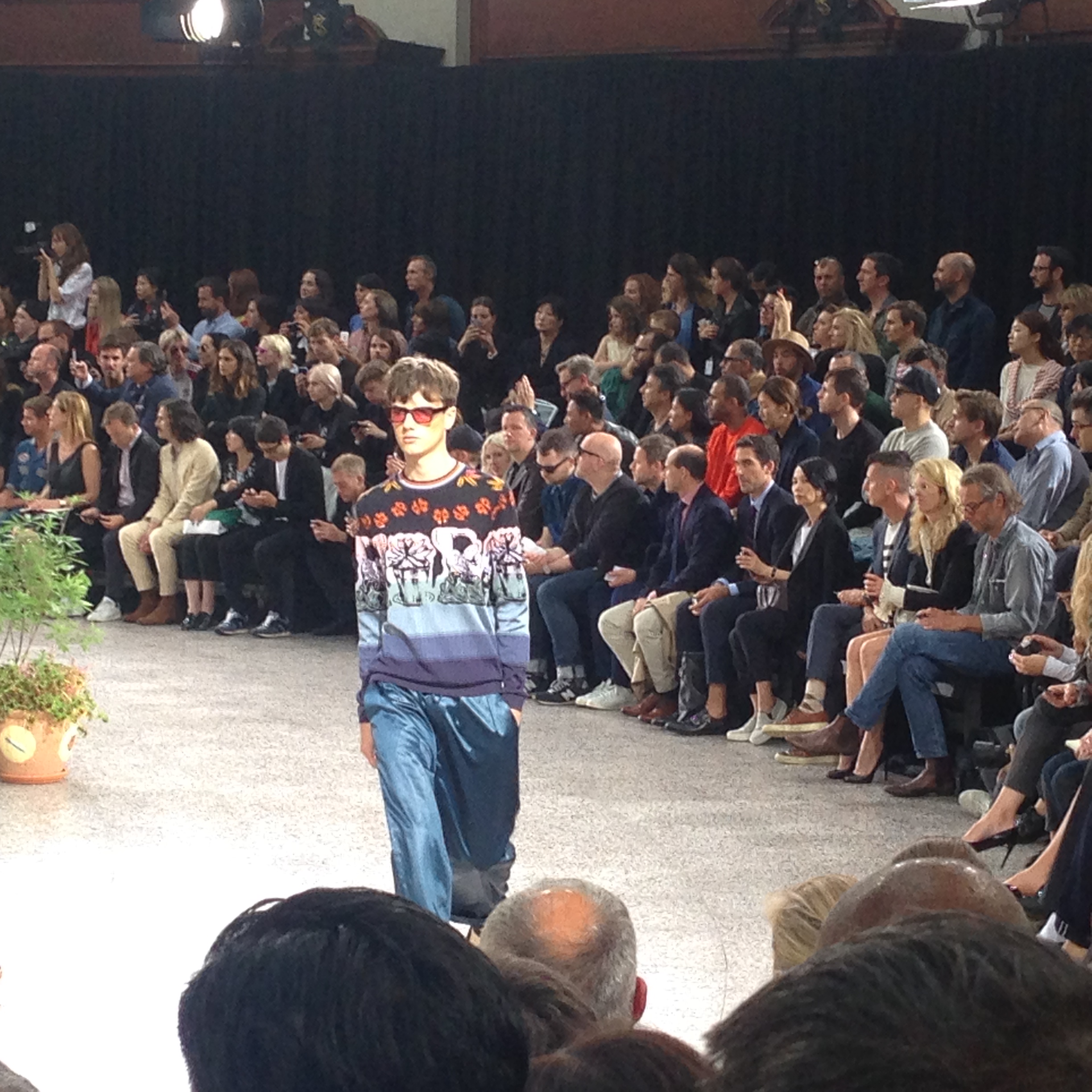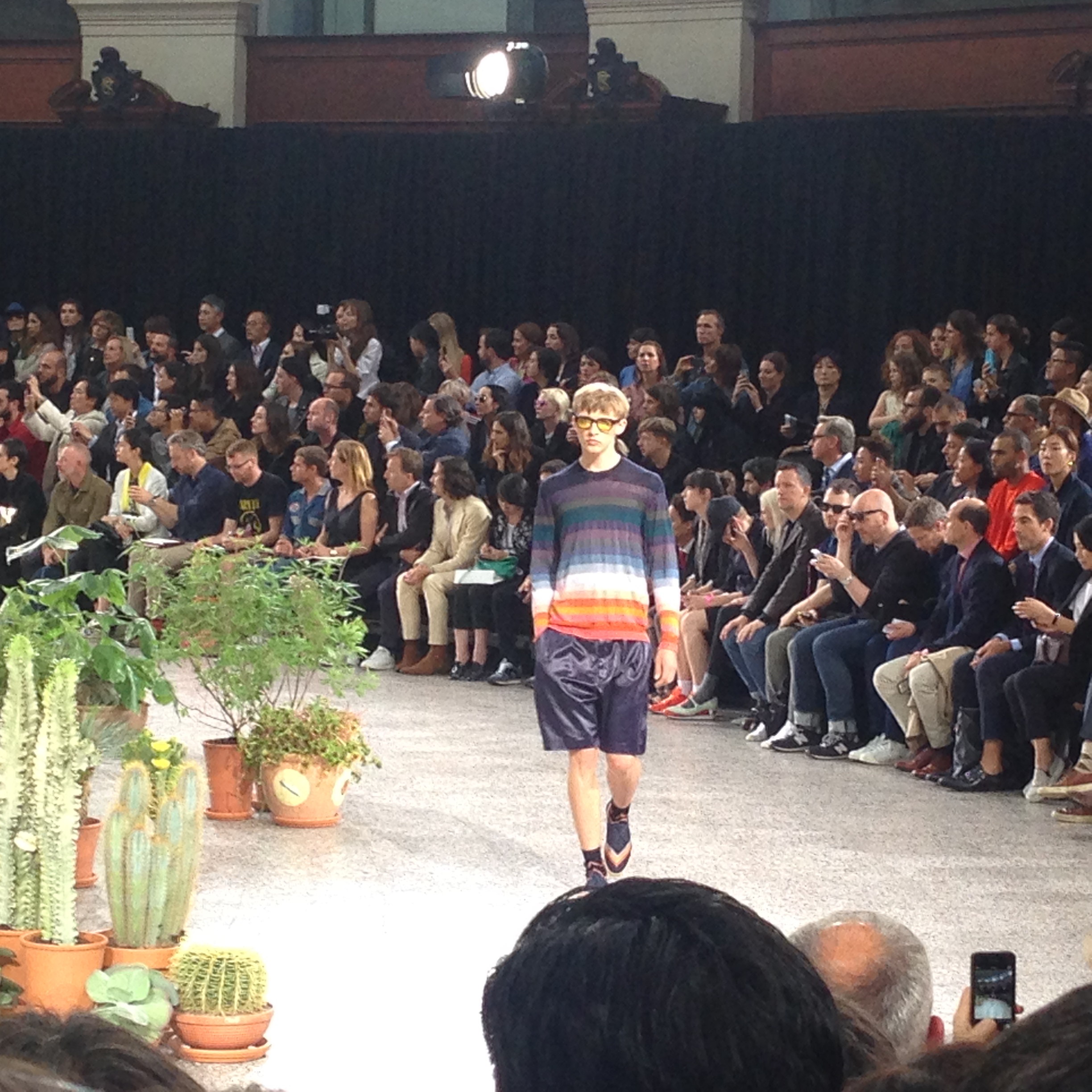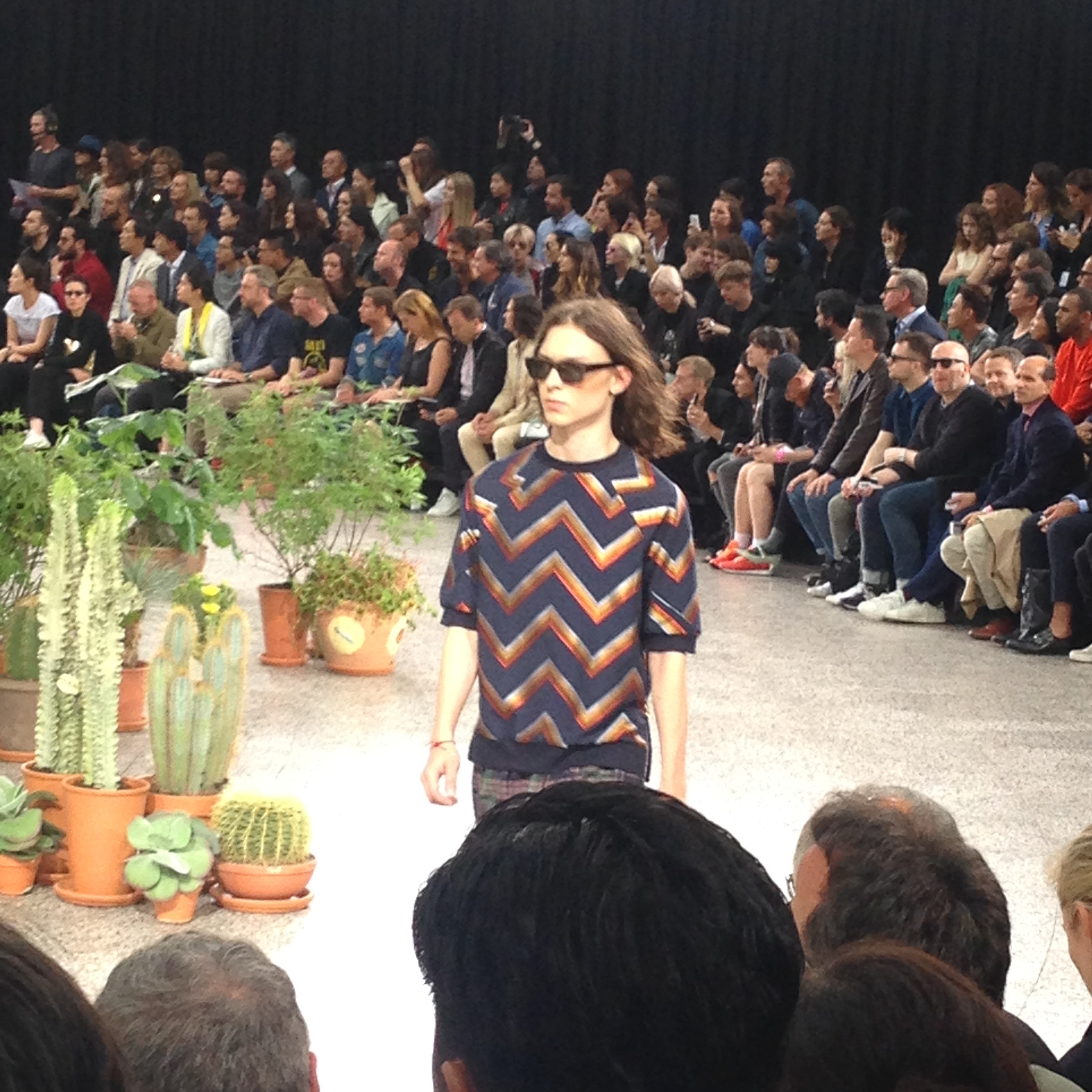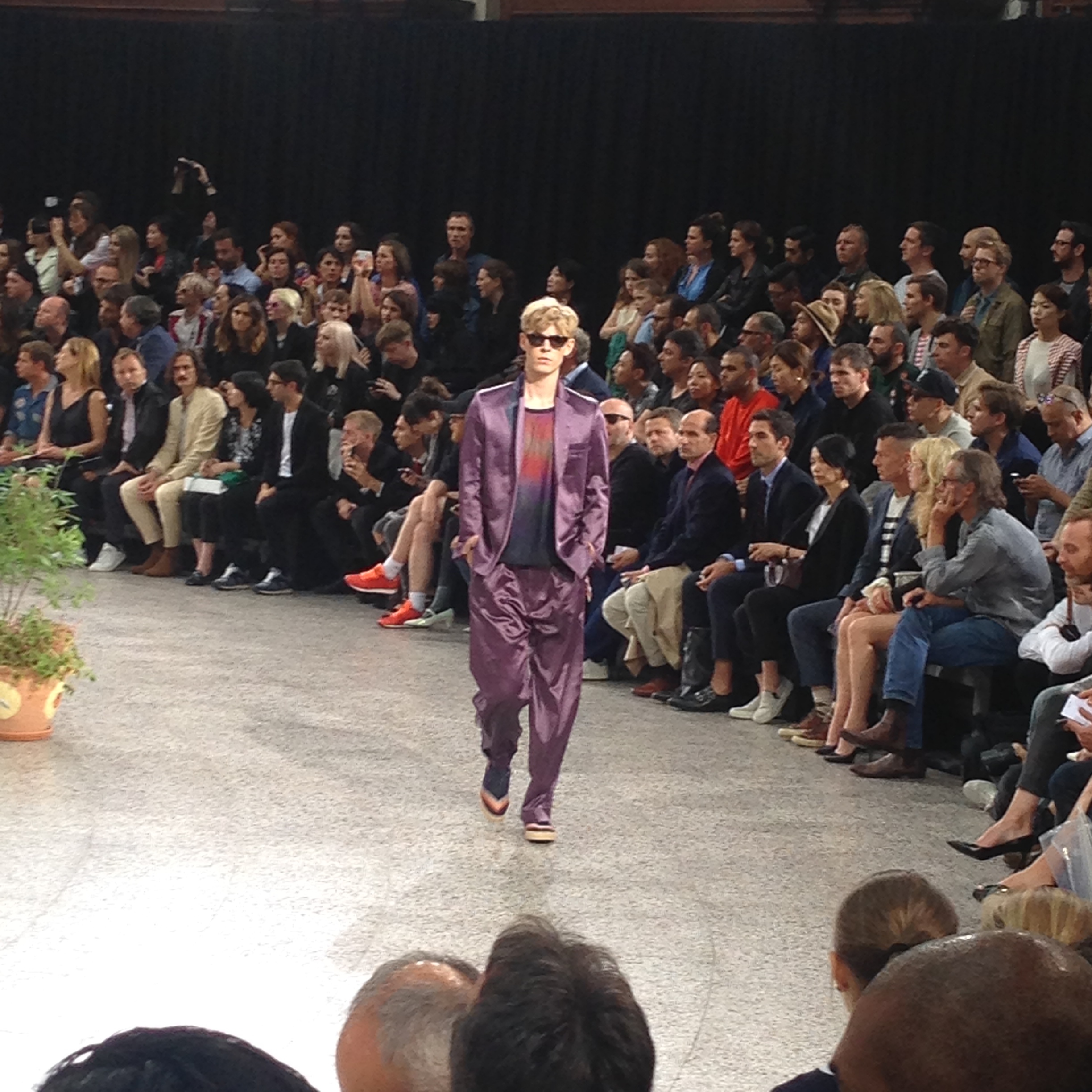 Paul Smith parsème des plantes de partout, en mise en scène, comme dans sa collection… pour mettre tout simplement du vert dans le vie de chacun. Paul Smith parsème la Bourse du Commerce à Paris de plantes, pour mettre du vert dans les vies de chacun. Cela se répercute dans le vestiaire par beaucoup de fluidité et de souplesse, dans les pantalons amples, les vestes légères portées comme des chemises, les tuniques à enfiler. Bien sûr on retrouve également quelques fleurs tropicales, et même des coccinelles et des bananes, en imprimés sur les pulls, sweats et accessoires. Les franges en cuir s’invitent sur quelques pièces ou autour du cou. Les tonalités de bleu dominent, Paul ajoute des rayures formant des dégradés de couleurs sur les tee-shirts, chemises et pulls en maille légère. Le sportswear est également présent dans la collection avec des bas de jogging, des zips sur le côté des sweats. Une garde-robe « easy », facile à porter, avec de bonnes vibrations ,nous donnant envie de conclure tout simplement avec le mot « yeah », exactement comme marqué sur le dernier tee-shirt qui clôture le show.