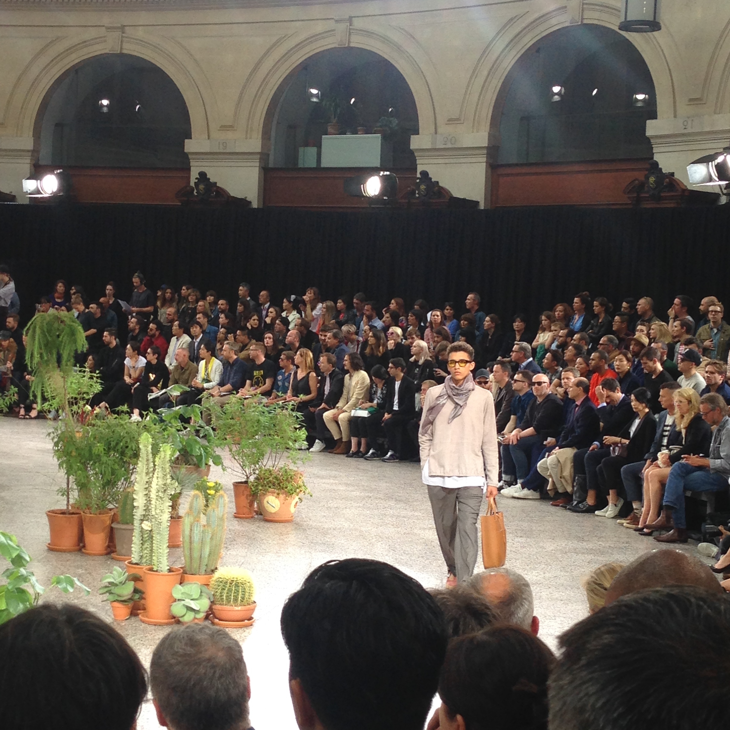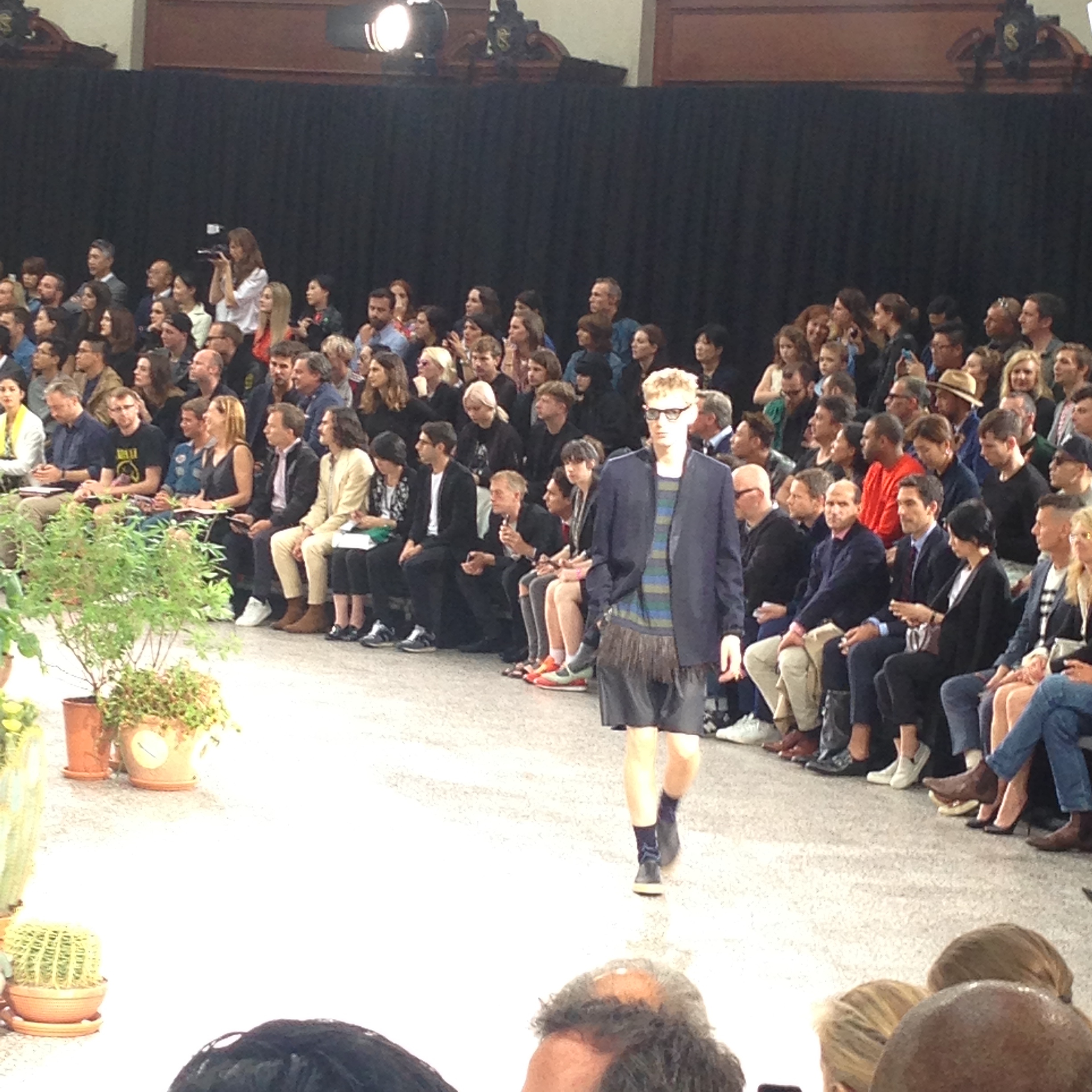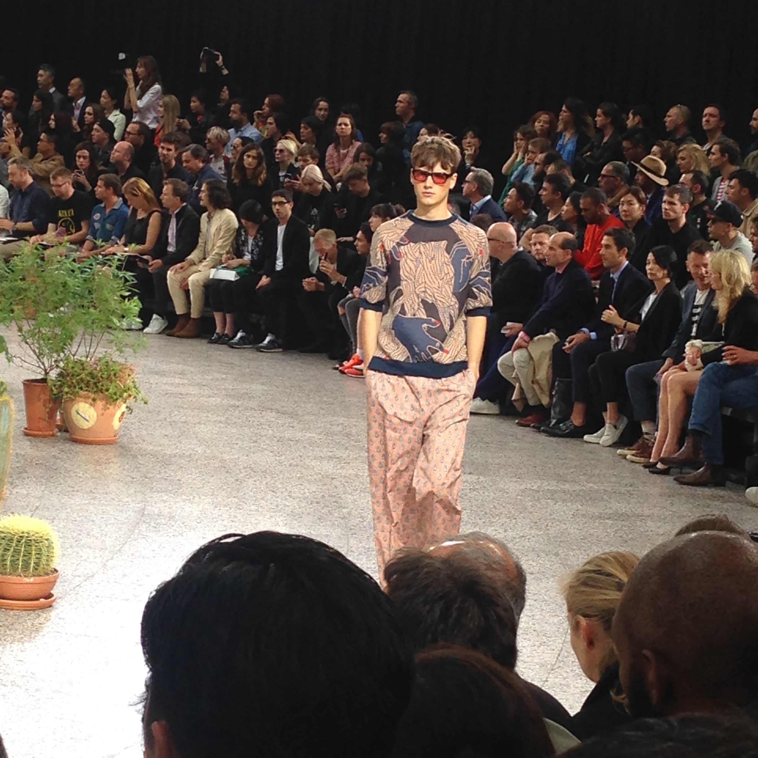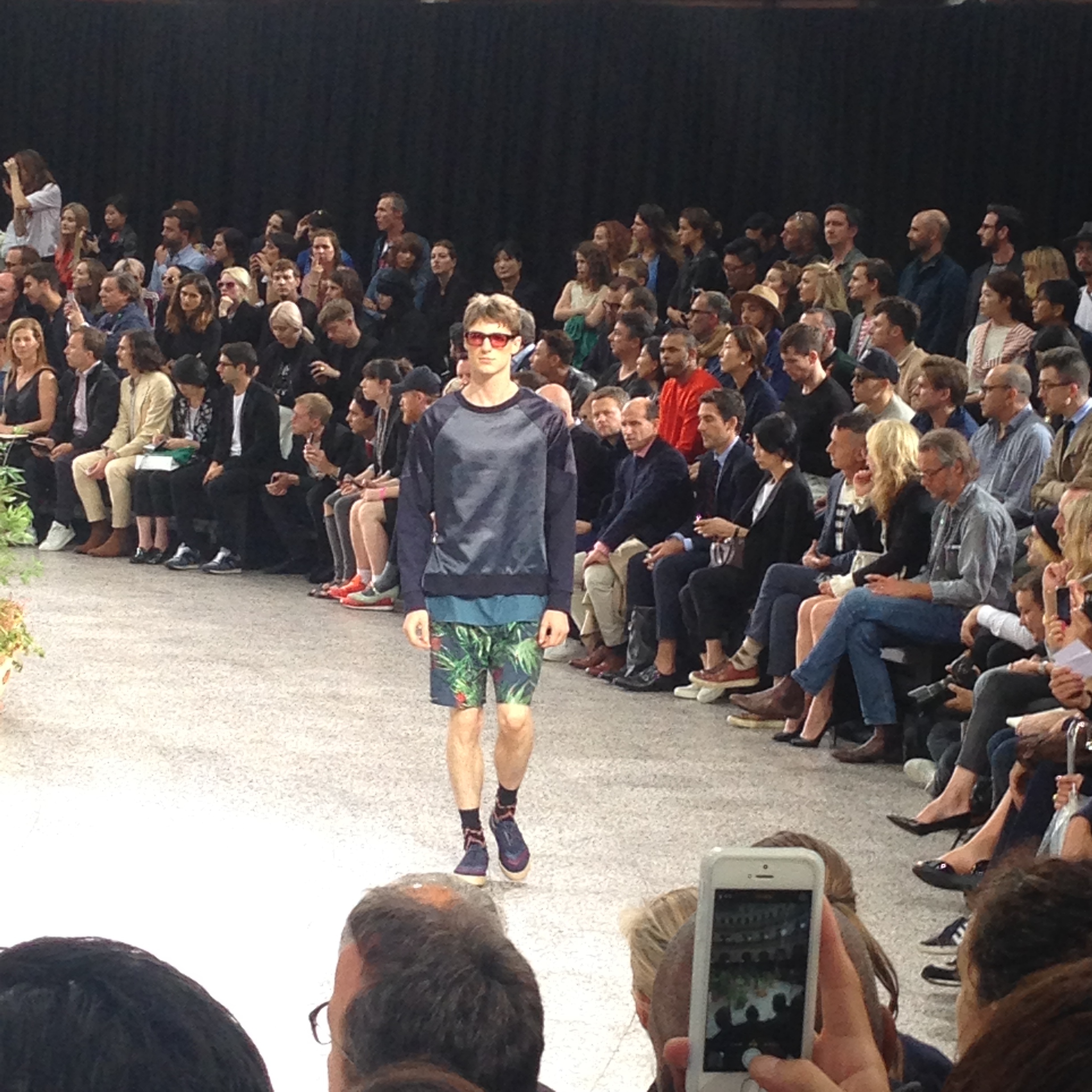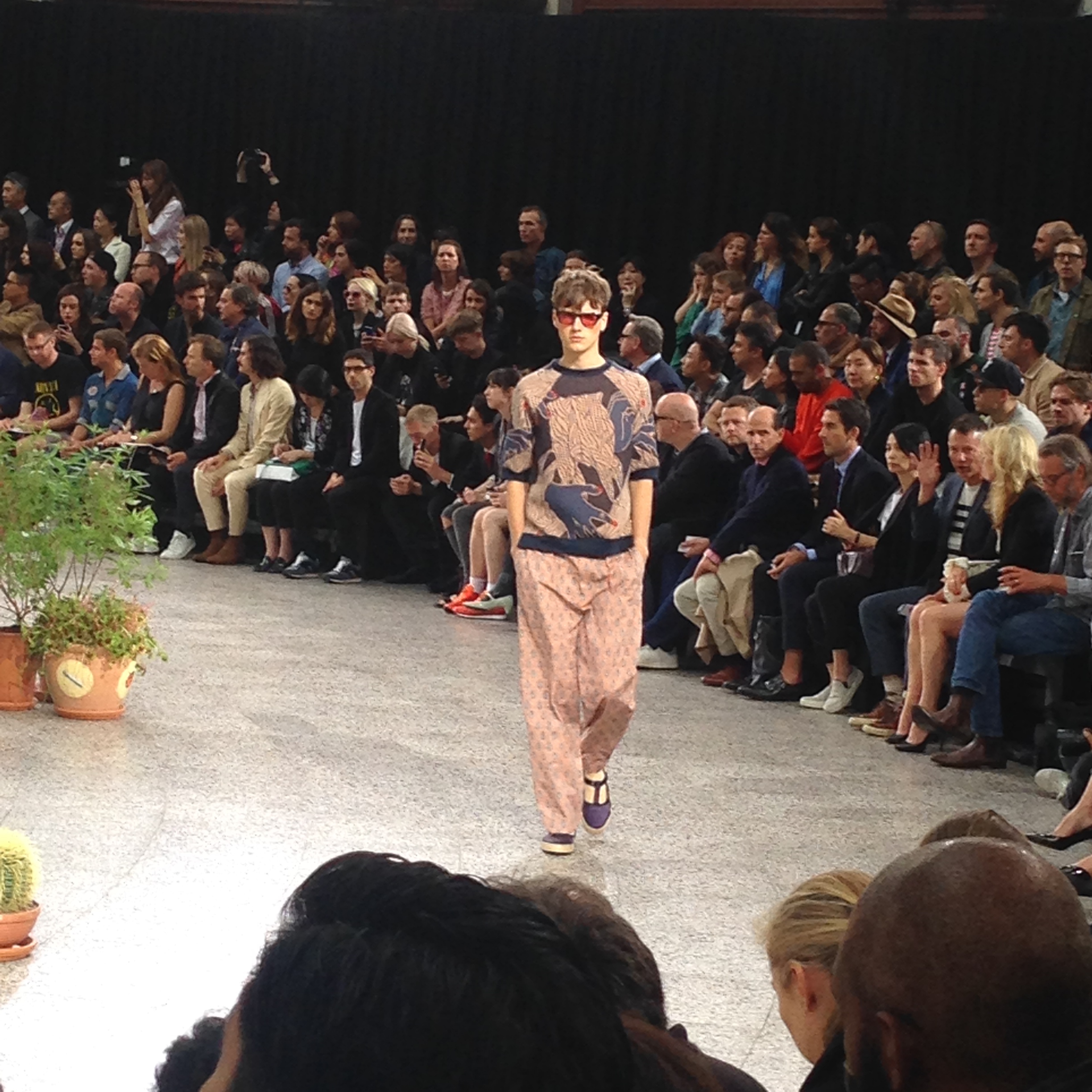 Paul Smith parsème des plantes de partout, en mise en scène, comme dans sa collection… pour mettre tout simplement du vert dans le vie de chacun. Paul Smith parsème la Bourse du Commerce à Paris de plantes, pour mettre du vert dans les vies de chacun. Cela se répercute dans le vestiaire par beaucoup de fluidité et de souplesse, dans les pantalons amples, les vestes légères portées comme des chemises, les tuniques à enfiler. Bien sûr on retrouve également quelques fleurs tropicales, et même des coccinelles et des bananes, en imprimés sur les pulls, sweats et accessoires. Les franges en cuir s’invitent sur quelques pièces ou autour du cou. Les tonalités de bleu dominent, Paul ajoute des rayures formant des dégradés de couleurs sur les tee-shirts, chemises et pulls en maille légère. Le sportswear est également présent dans la collection avec des bas de jogging, des zips sur le côté des sweats. Une garde-robe « easy », facile à porter, avec de bonnes vibrations ,nous donnant envie de conclure tout simplement avec le mot « yeah », exactement comme marqué sur le dernier tee-shirt qui clôture le show.