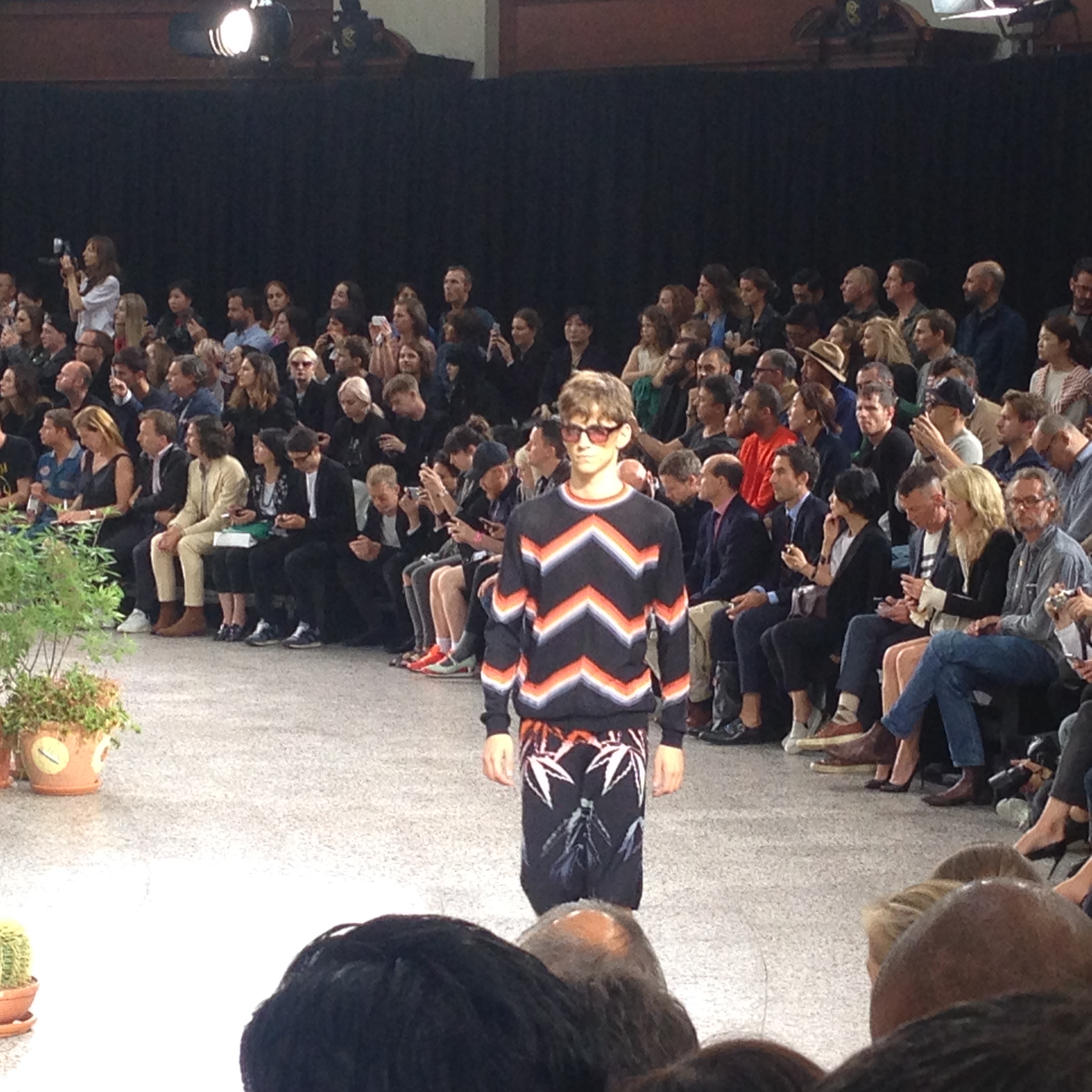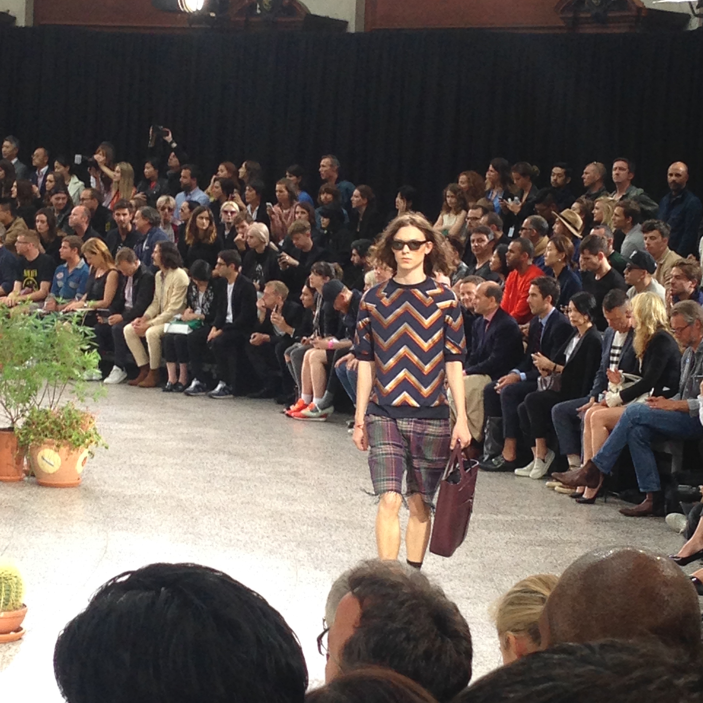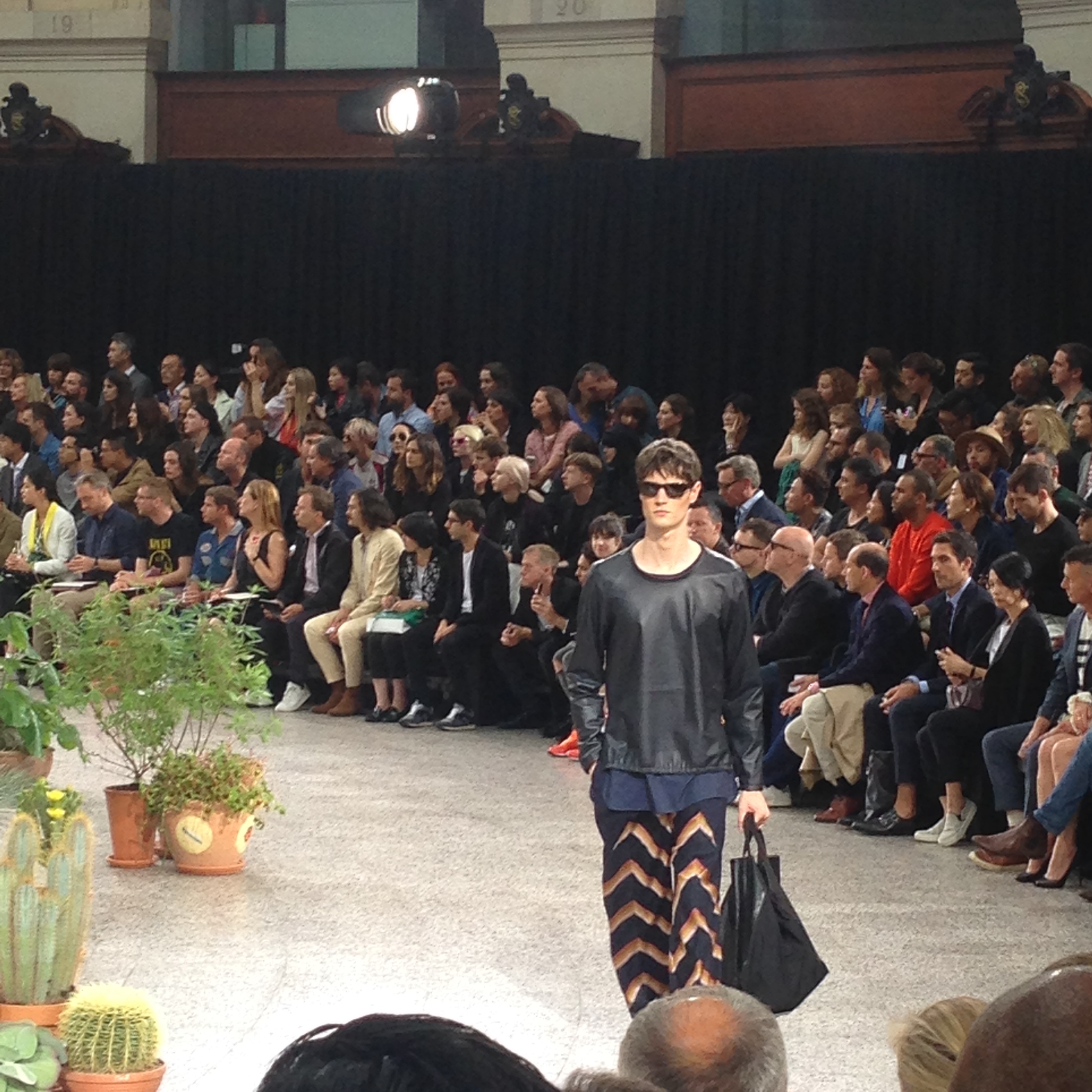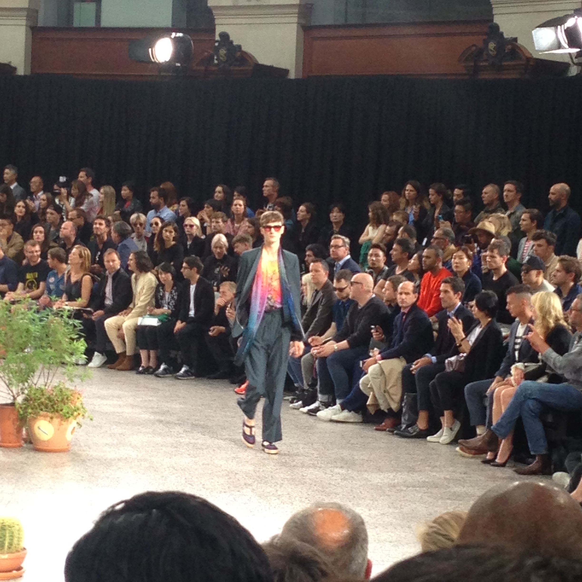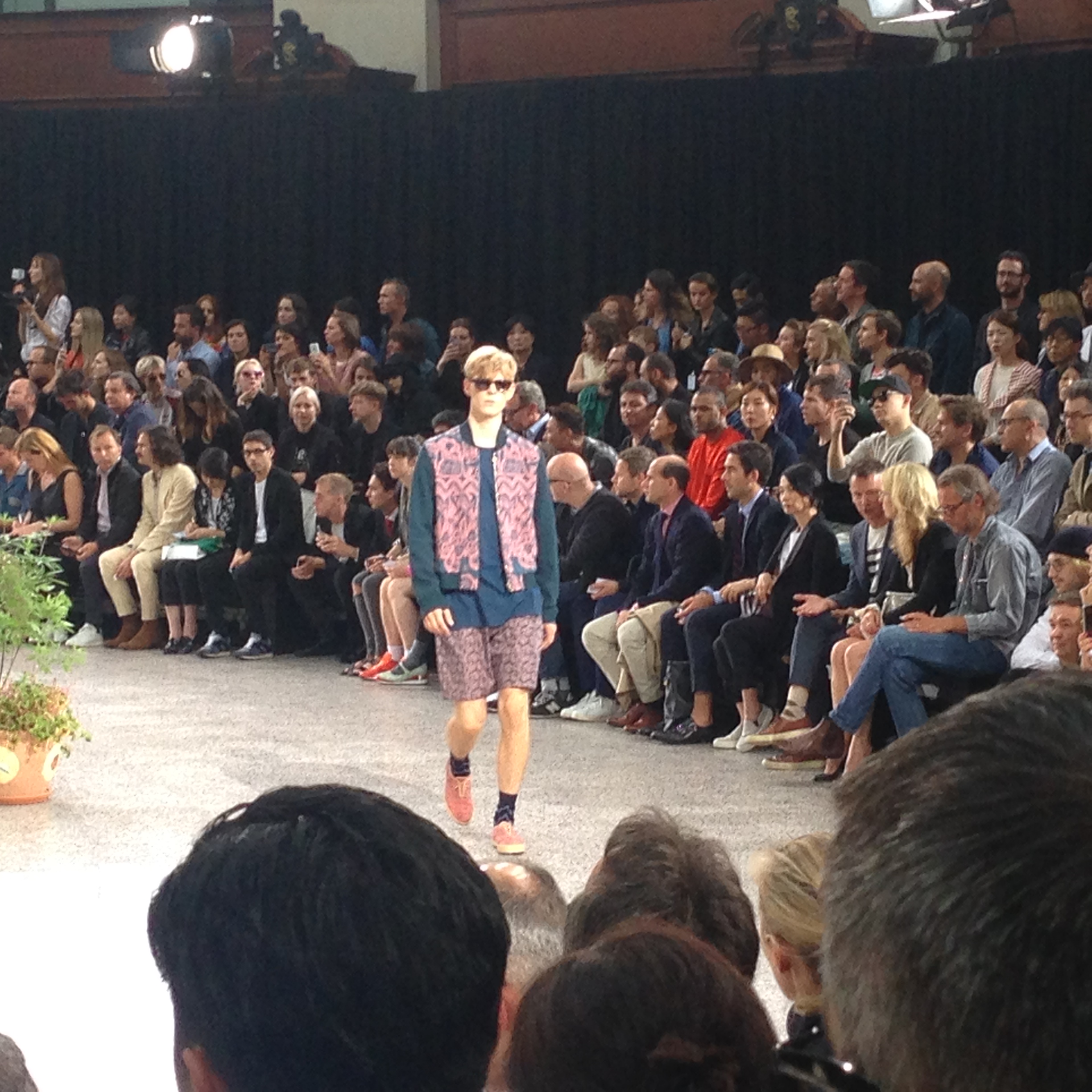 Paul Smith parsème des plantes de partout, en mise en scène, comme dans sa collection… pour mettre tout simplement du vert dans le vie de chacun. Paul Smith parsème la Bourse du Commerce à Paris de plantes, pour mettre du vert dans les vies de chacun. Cela se répercute dans le vestiaire par beaucoup de fluidité et de souplesse, dans les pantalons amples, les vestes légères portées comme des chemises, les tuniques à enfiler. Bien sûr on retrouve également quelques fleurs tropicales, et même des coccinelles et des bananes, en imprimés sur les pulls, sweats et accessoires. Les franges en cuir s’invitent sur quelques pièces ou autour du cou. Les tonalités de bleu dominent, Paul ajoute des rayures formant des dégradés de couleurs sur les tee-shirts, chemises et pulls en maille légère. Le sportswear est également présent dans la collection avec des bas de jogging, des zips sur le côté des sweats. Une garde-robe « easy », facile à porter, avec de bonnes vibrations ,nous donnant envie de conclure tout simplement avec le mot « yeah », exactement comme marqué sur le dernier tee-shirt qui clôture le show.