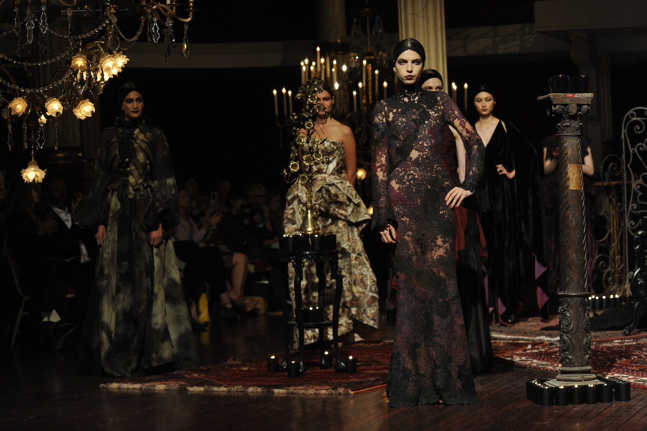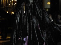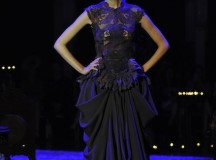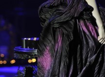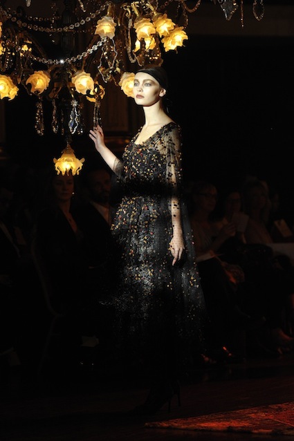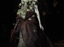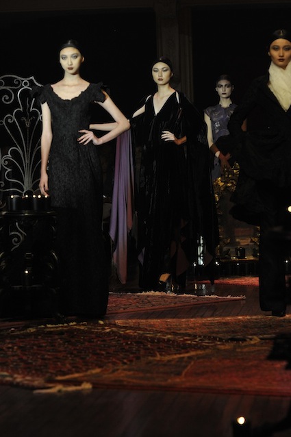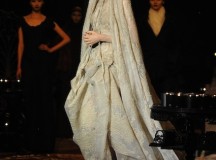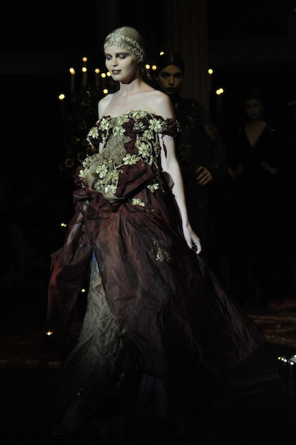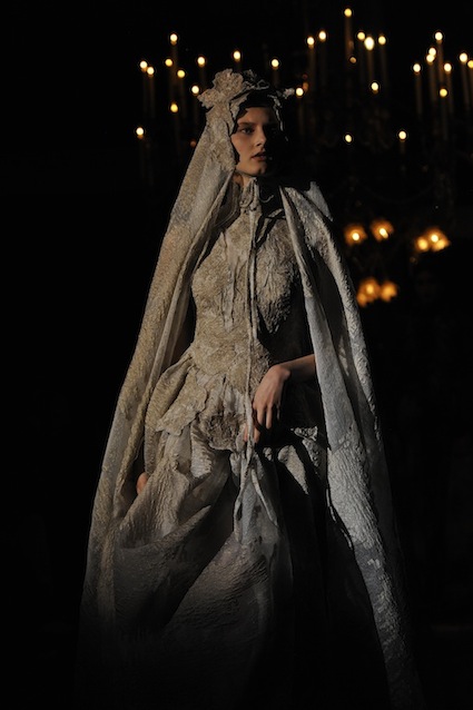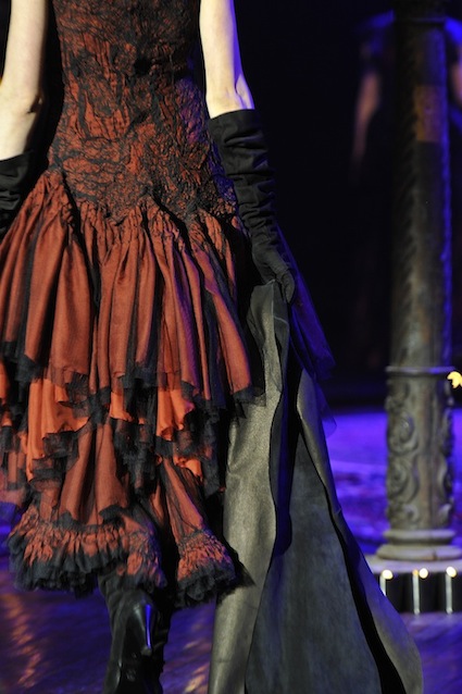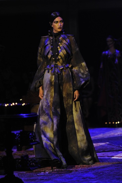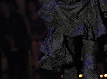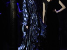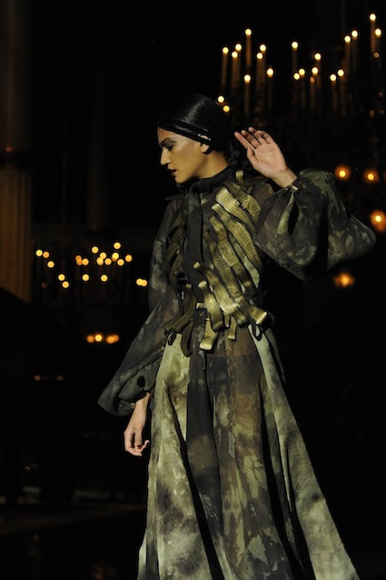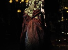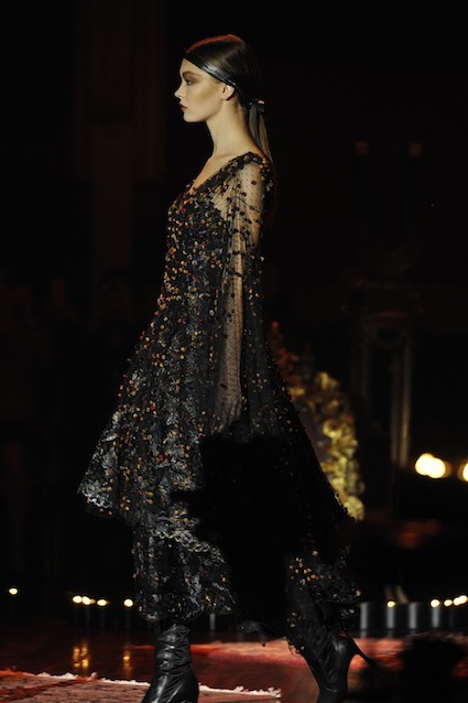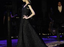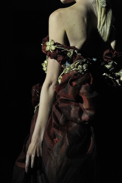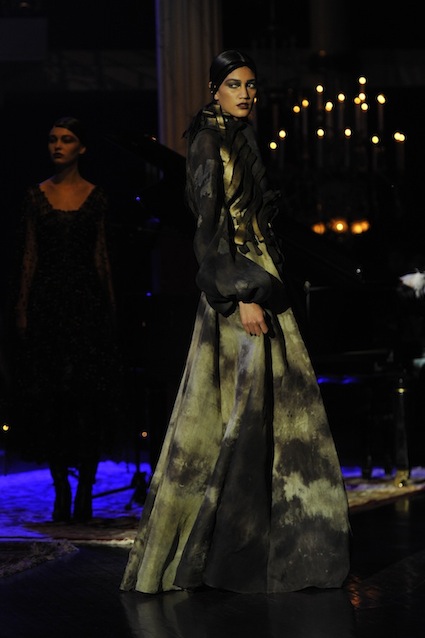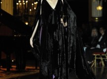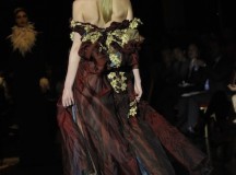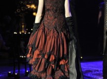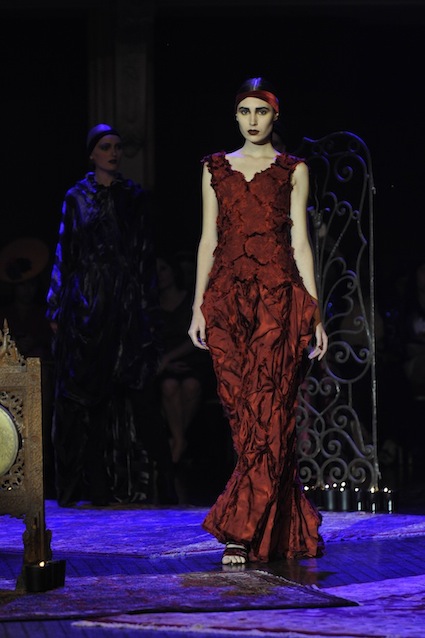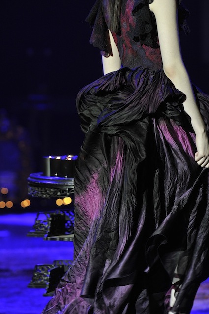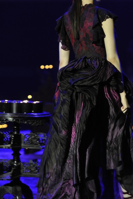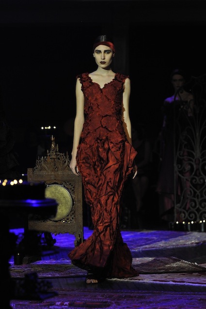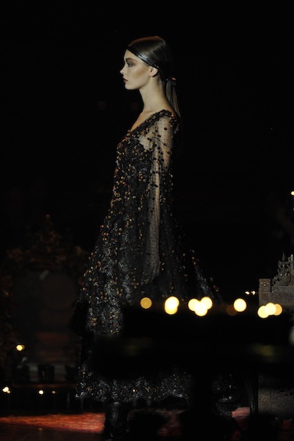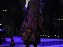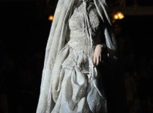 Franck Sorbier est un artiste avant d’être un couturier, chaque défilé donne lieu à une représentation, un voyage dans un univers différent et unique où les robes prennent vie comme les personnages d’une pièce de théâtre. Pour cette collection Hiver 2014-2015, Franck Sorbier a puisé son inspiration dans la poésie française et a choisi sa muse : Emilie Simon. C’est donc un voyage nocturne au coeur de la littérature française auquel nous assistons. Les robes sont nommées après les poèmes d’Arthur Rimbaud, Paul Verlaine, Paul Valery, Alfred de Musset.Les tons sont ocres, roux, mordorés, aubergines, grenats, prunes, violets, noir.