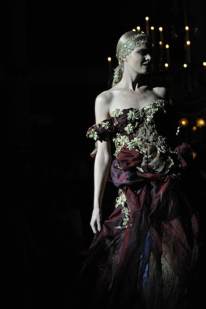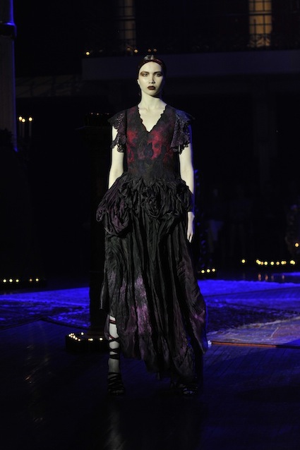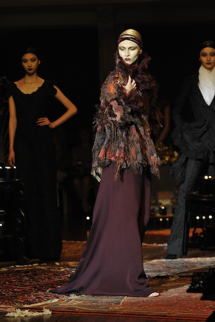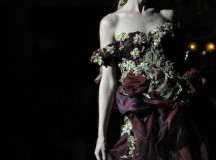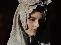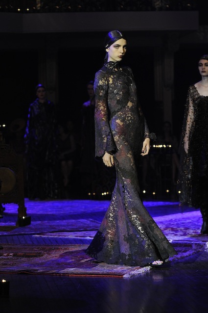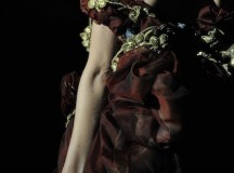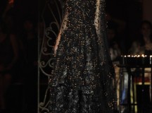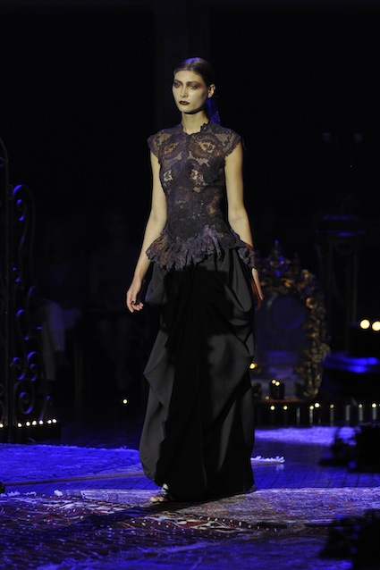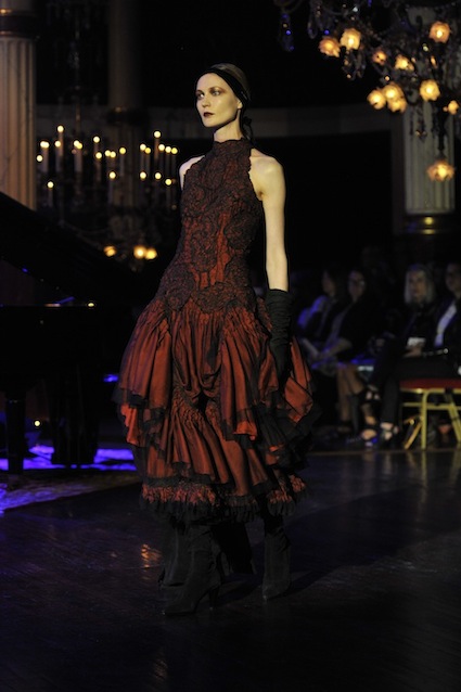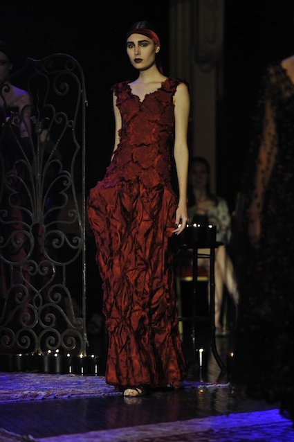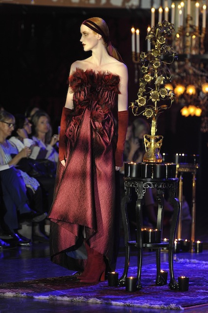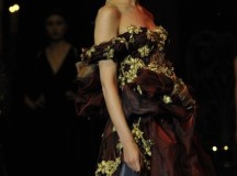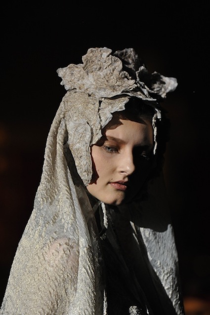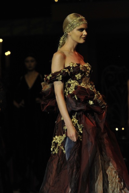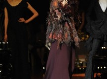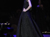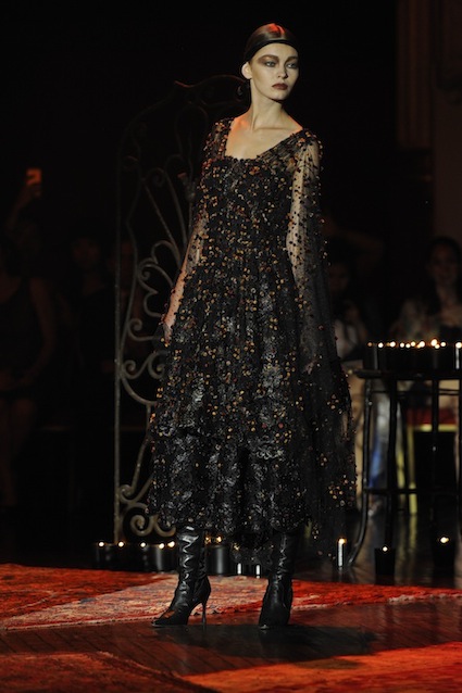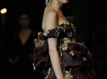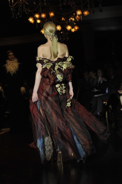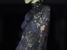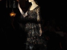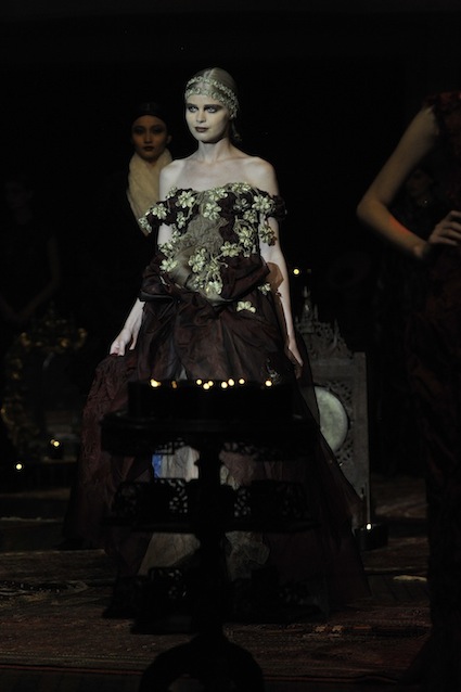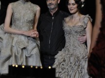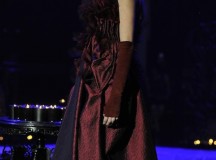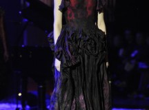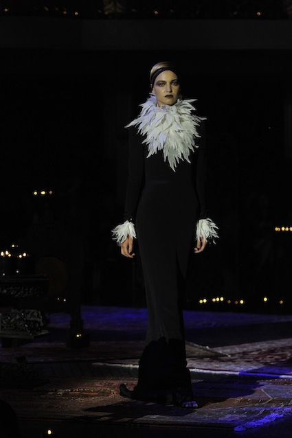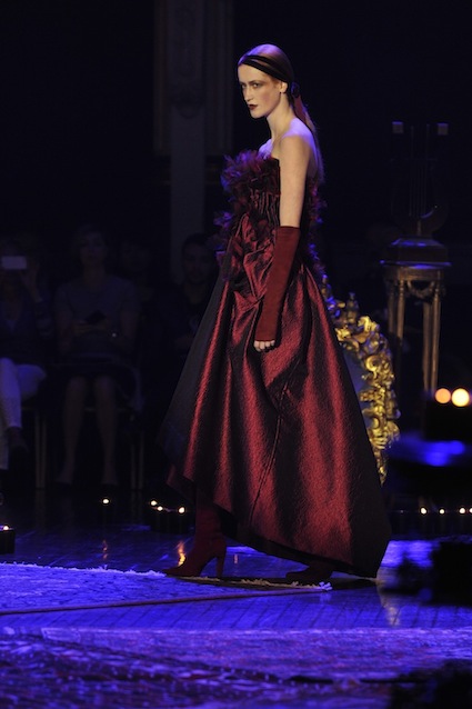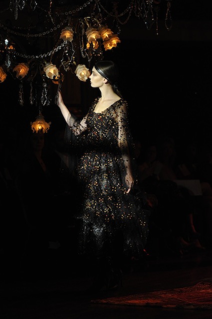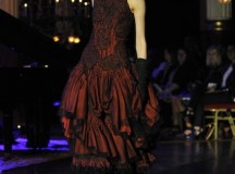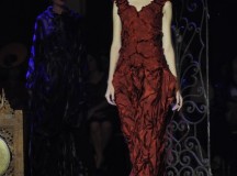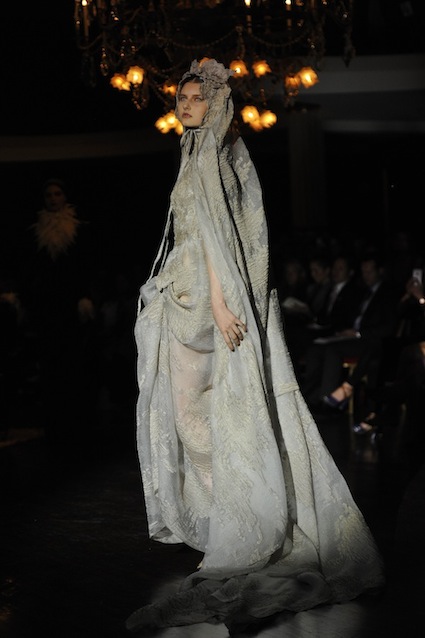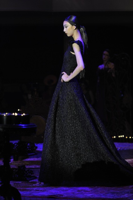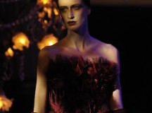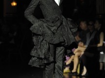 Franck Sorbier est un artiste avant d’être un couturier, chaque défilé donne lieu à une représentation, un voyage dans un univers différent et unique où les robes prennent vie comme les personnages d’une pièce de théâtre. Pour cette collection Hiver 2014-2015, Franck Sorbier a puisé son inspiration dans la poésie française et a choisi sa muse : Emilie Simon. C’est donc un voyage nocturne au coeur de la littérature française auquel nous assistons. Les robes sont nommées après les poèmes d’Arthur Rimbaud, Paul Verlaine, Paul Valery, Alfred de Musset.Les tons sont ocres, roux, mordorés, aubergines, grenats, prunes, violets, noir.
