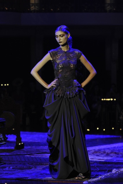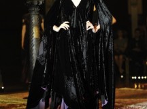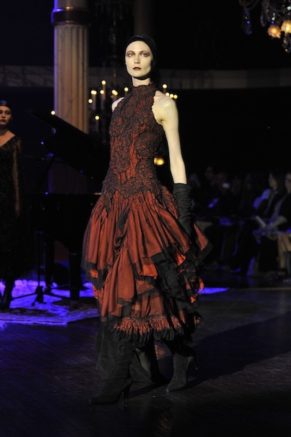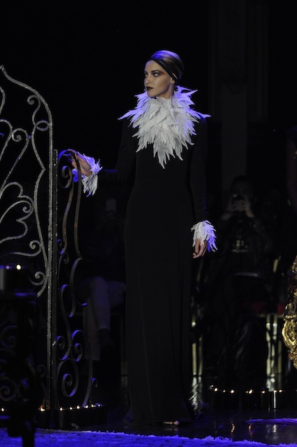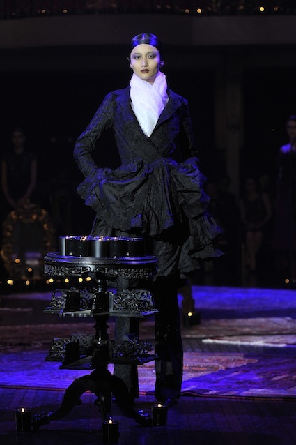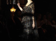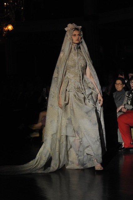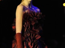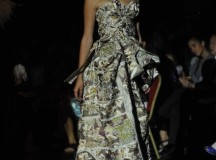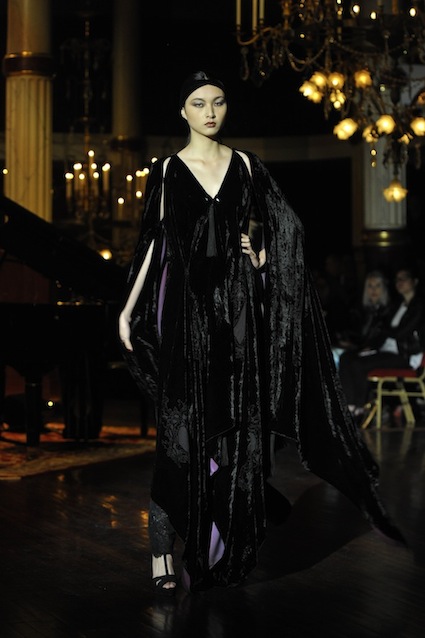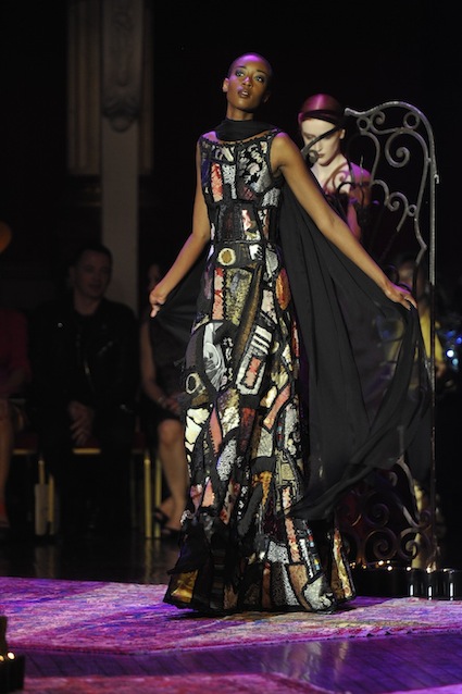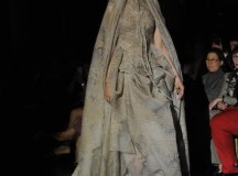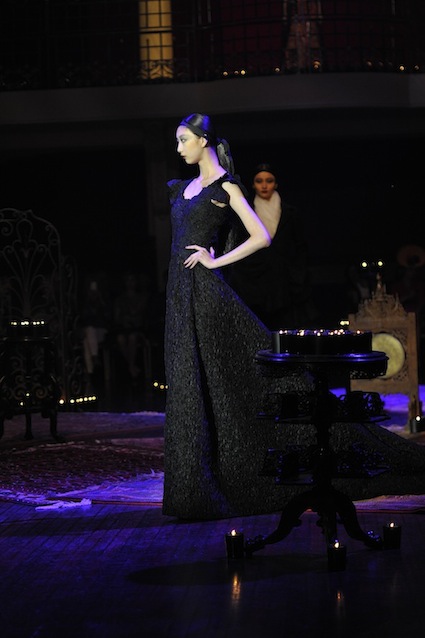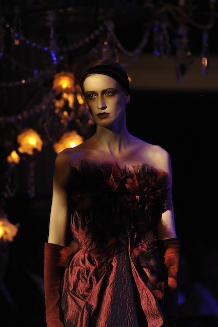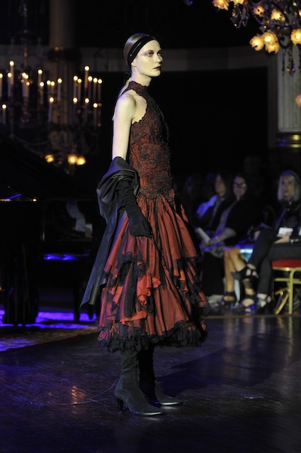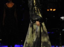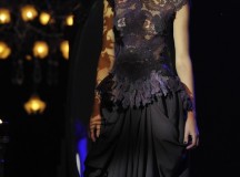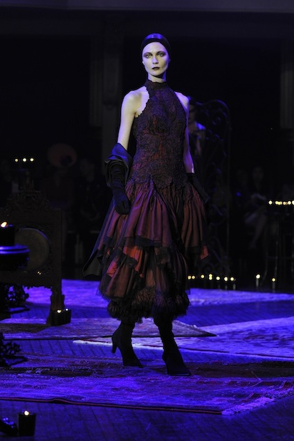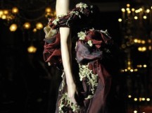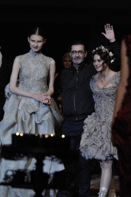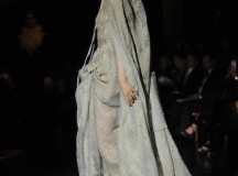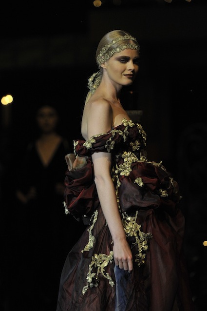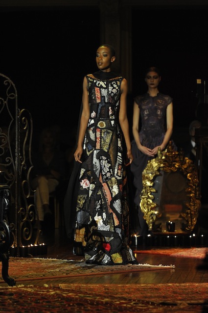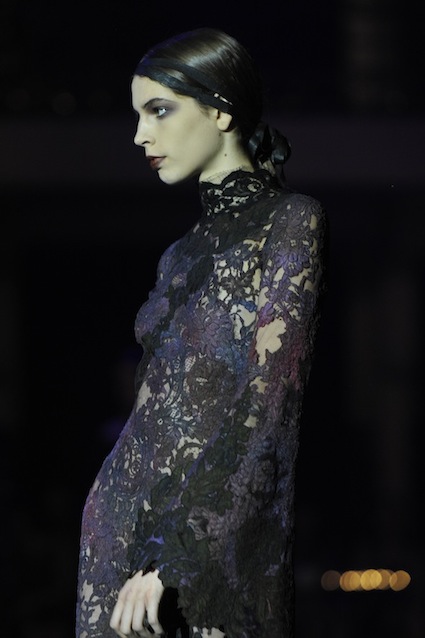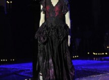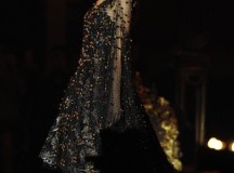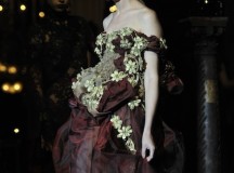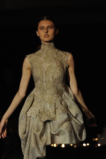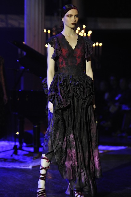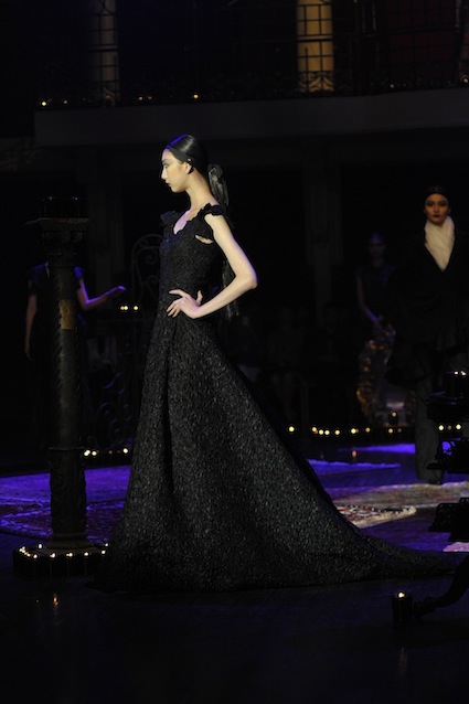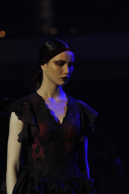 Franck Sorbier est un artiste avant d’être un couturier, chaque défilé donne lieu à une représentation, un voyage dans un univers différent et unique où les robes prennent vie comme les personnages d’une pièce de théâtre. Pour cette collection Hiver 2014-2015, Franck Sorbier a puisé son inspiration dans la poésie française et a choisi sa muse : Emilie Simon. C’est donc un voyage nocturne au coeur de la littérature française auquel nous assistons. Les robes sont nommées après les poèmes d’Arthur Rimbaud, Paul Verlaine, Paul Valery, Alfred de Musset.Les tons sont ocres, roux, mordorés, aubergines, grenats, prunes, violets, noir.