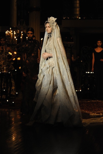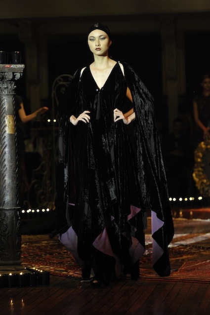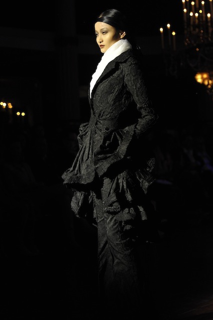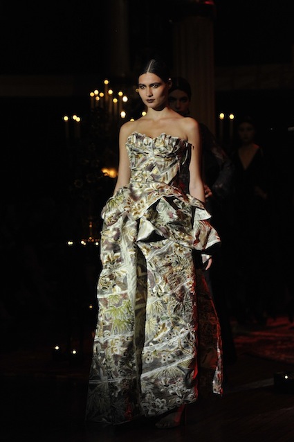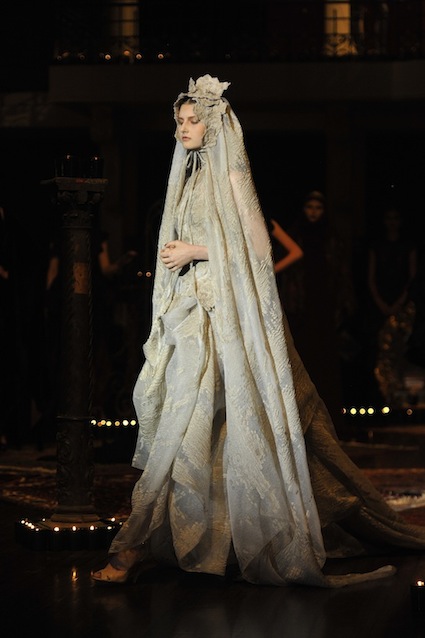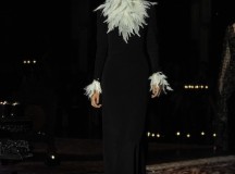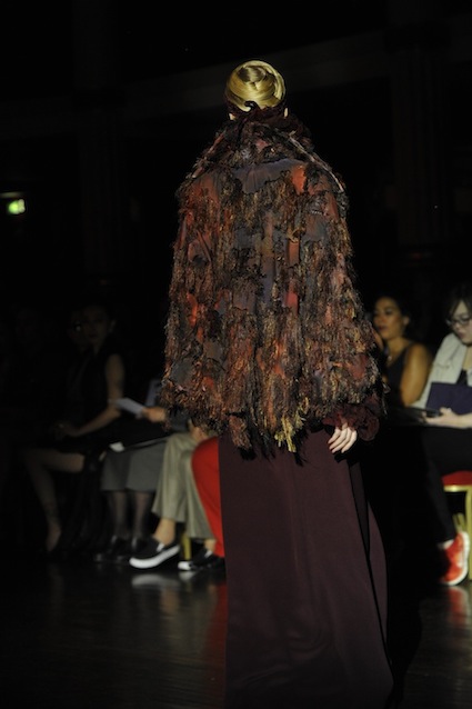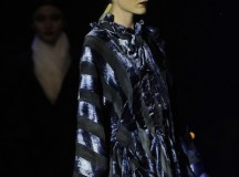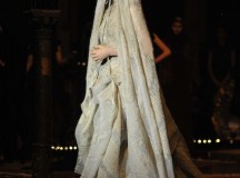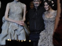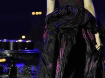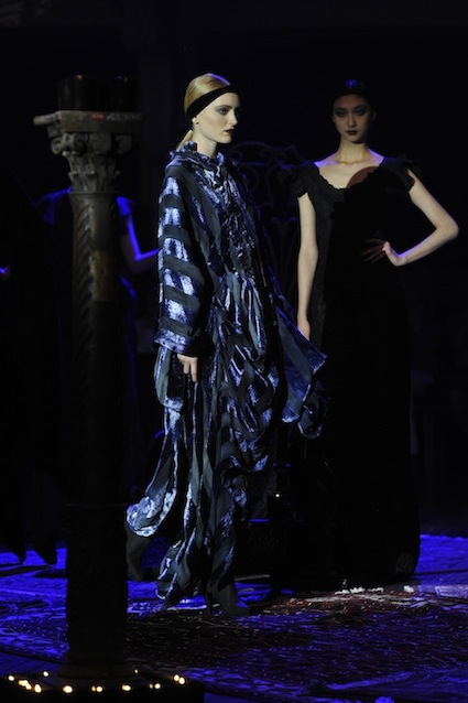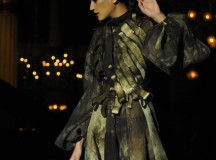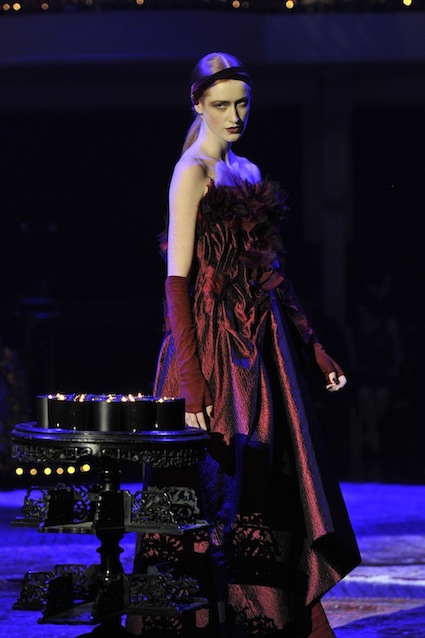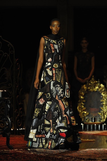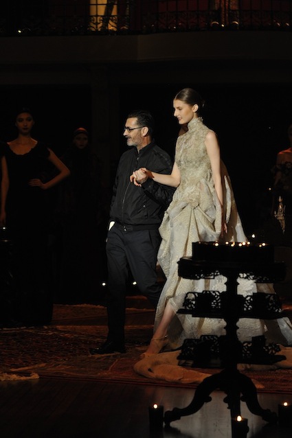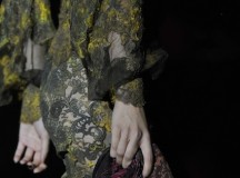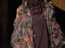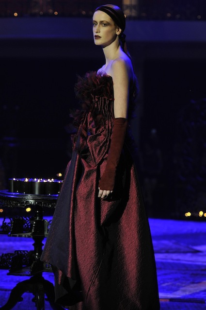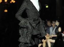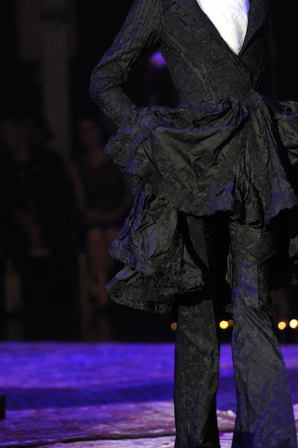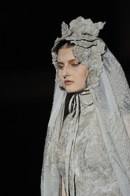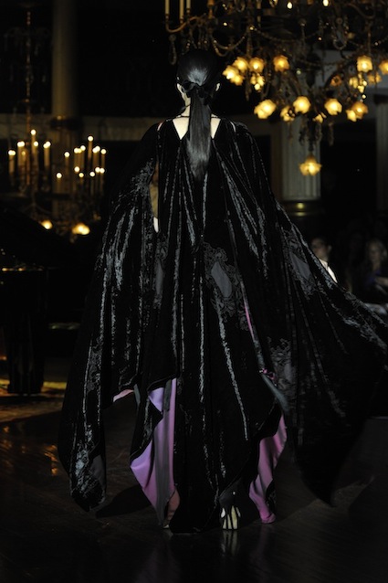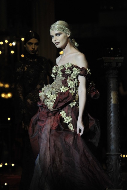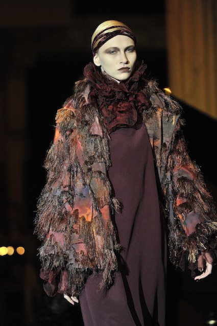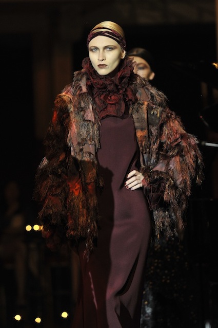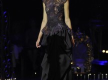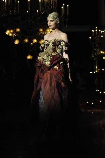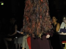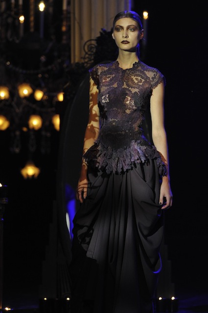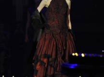 Franck Sorbier est un artiste avant d’être un couturier, chaque défilé donne lieu à une représentation, un voyage dans un univers différent et unique où les robes prennent vie comme les personnages d’une pièce de théâtre. Pour cette collection Hiver 2014-2015, Franck Sorbier a puisé son inspiration dans la poésie française et a choisi sa muse : Emilie Simon. C’est donc un voyage nocturne au coeur de la littérature française auquel nous assistons. Les robes sont nommées après les poèmes d’Arthur Rimbaud, Paul Verlaine, Paul Valery, Alfred de Musset.Les tons sont ocres, roux, mordorés, aubergines, grenats, prunes, violets, noir.