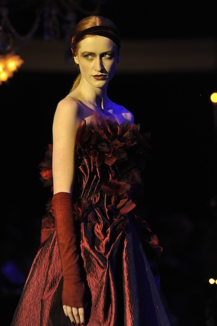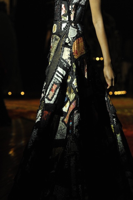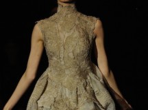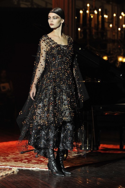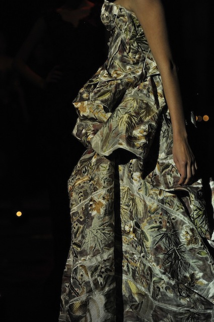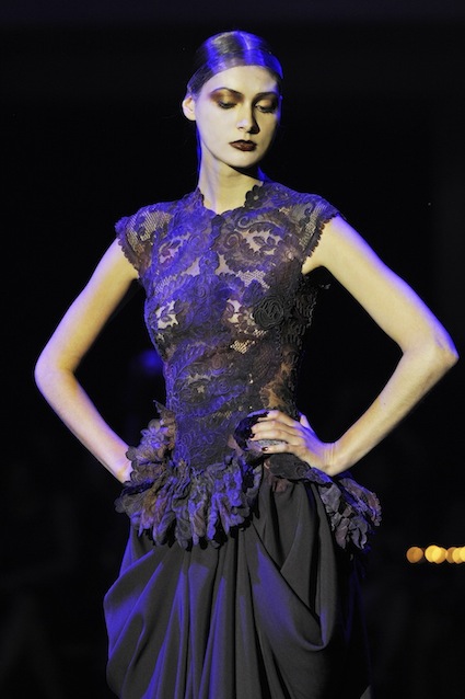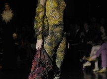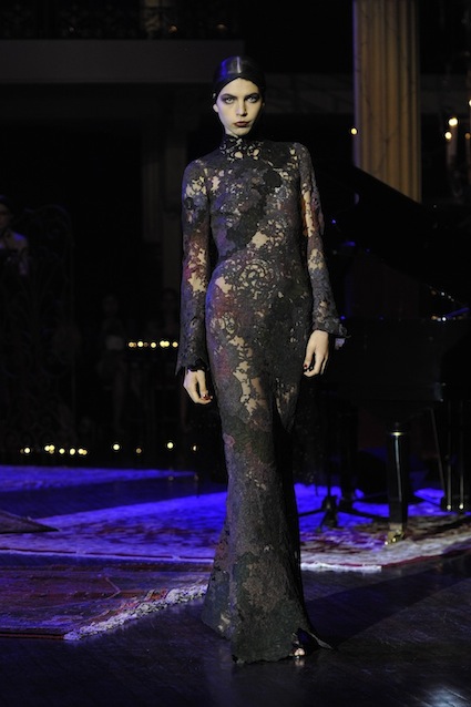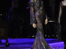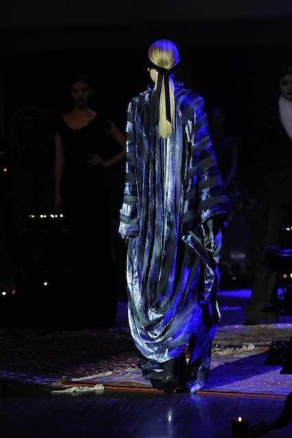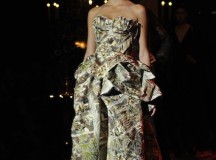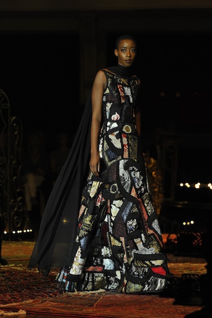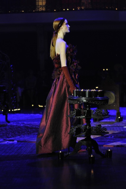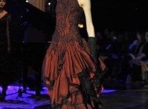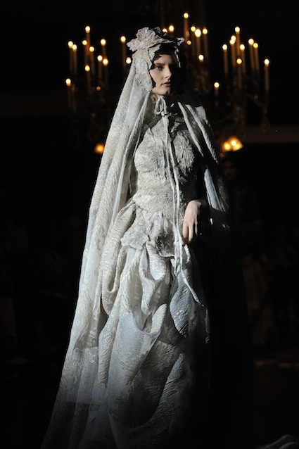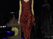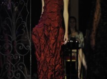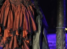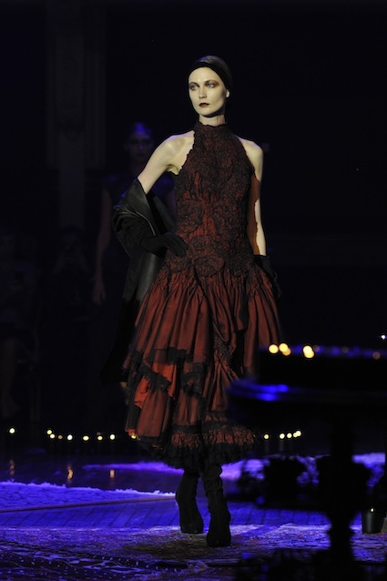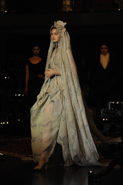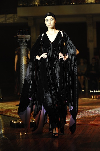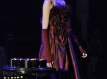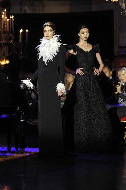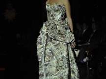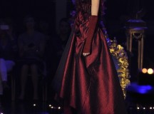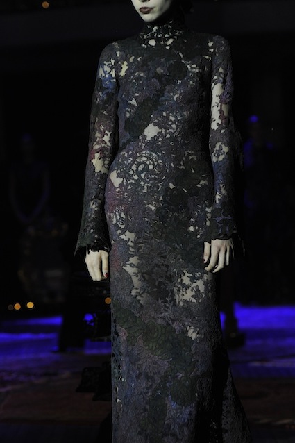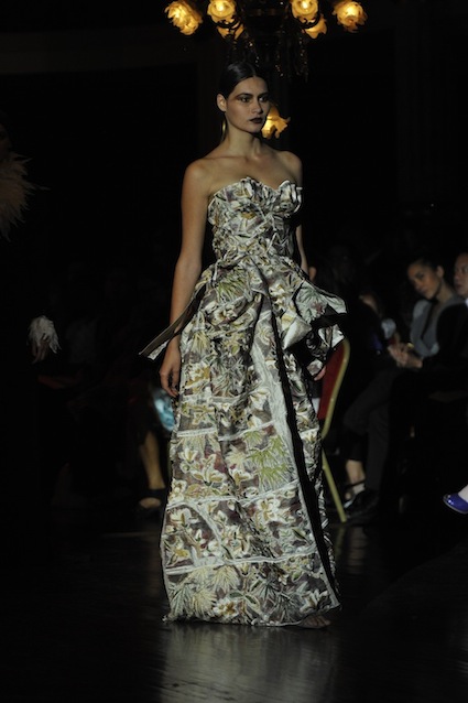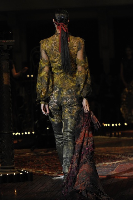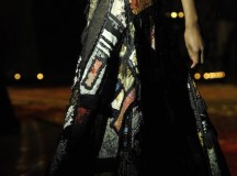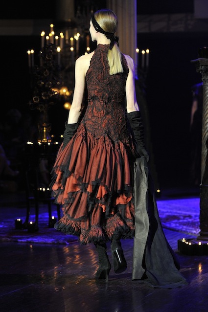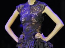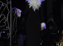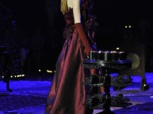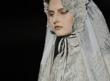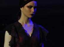 Franck Sorbier est un artiste avant d’être un couturier, chaque défilé donne lieu à une représentation, un voyage dans un univers différent et unique où les robes prennent vie comme les personnages d’une pièce de théâtre. Pour cette collection Hiver 2014-2015, Franck Sorbier a puisé son inspiration dans la poésie française et a choisi sa muse : Emilie Simon. C’est donc un voyage nocturne au coeur de la littérature française auquel nous assistons. Les robes sont nommées après les poèmes d’Arthur Rimbaud, Paul Verlaine, Paul Valery, Alfred de Musset.Les tons sont ocres, roux, mordorés, aubergines, grenats, prunes, violets, noir.