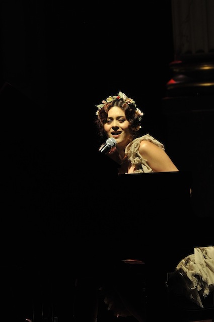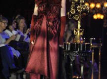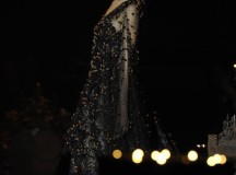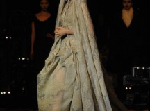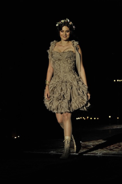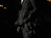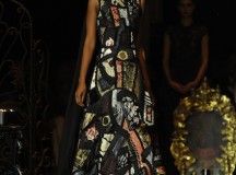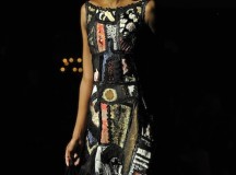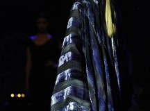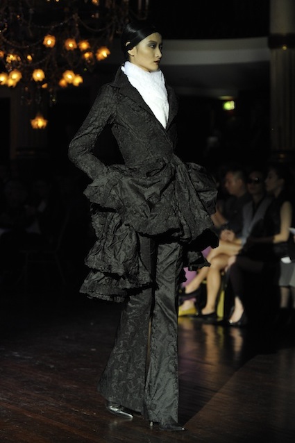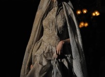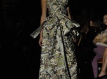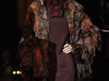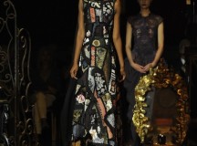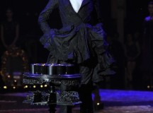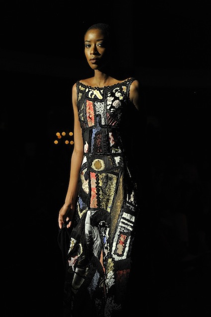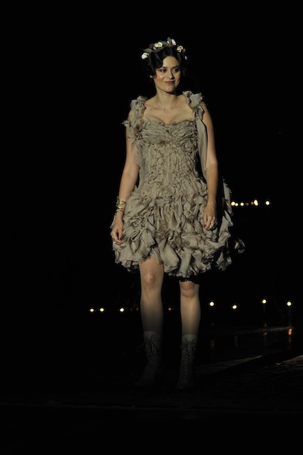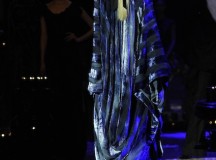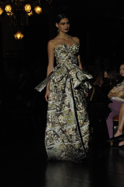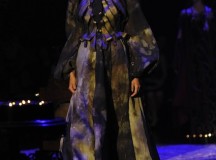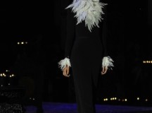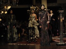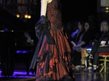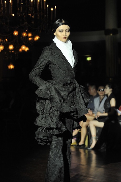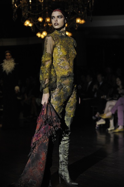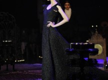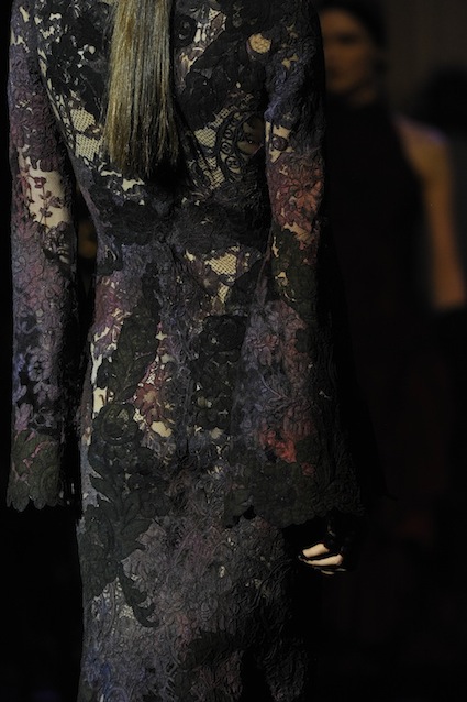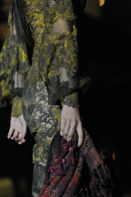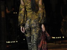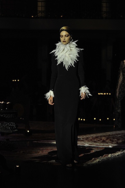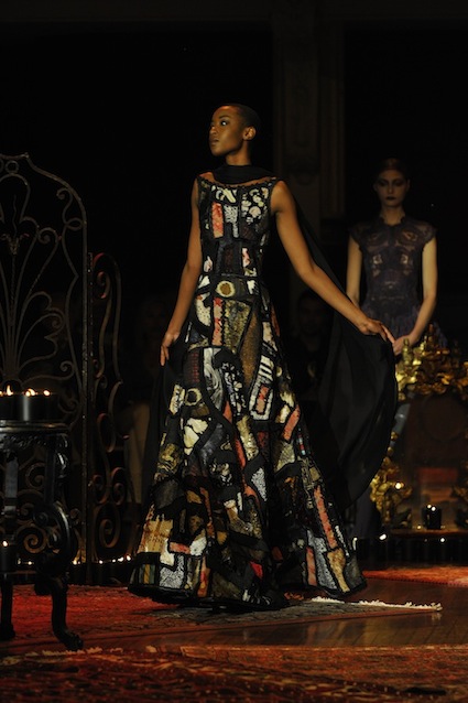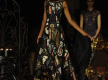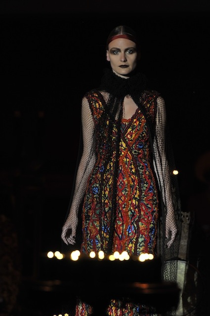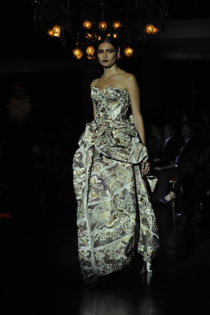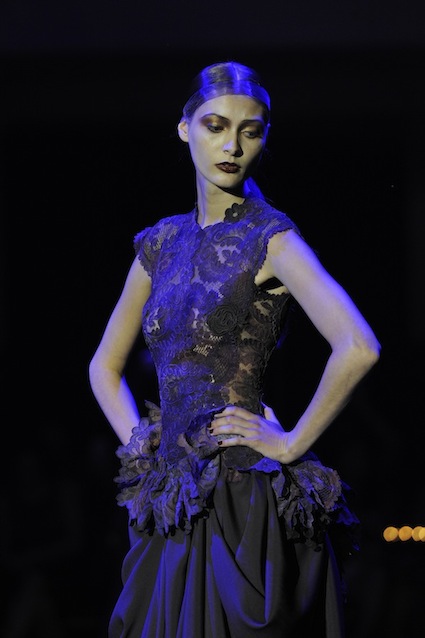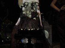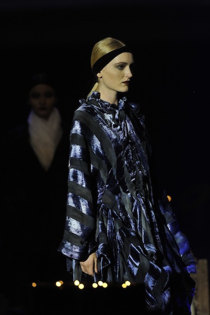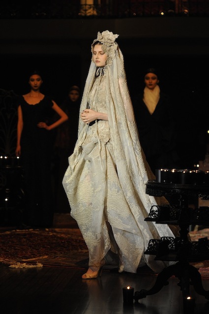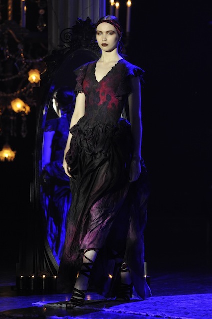 Franck Sorbier est un artiste avant d’être un couturier, chaque défilé donne lieu à une représentation, un voyage dans un univers différent et unique où les robes prennent vie comme les personnages d’une pièce de théâtre. Pour cette collection Hiver 2014-2015, Franck Sorbier a puisé son inspiration dans la poésie française et a choisi sa muse : Emilie Simon. C’est donc un voyage nocturne au coeur de la littérature française auquel nous assistons. Les robes sont nommées après les poèmes d’Arthur Rimbaud, Paul Verlaine, Paul Valery, Alfred de Musset.Les tons sont ocres, roux, mordorés, aubergines, grenats, prunes, violets, noir.