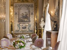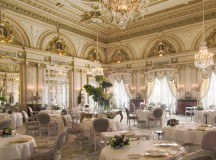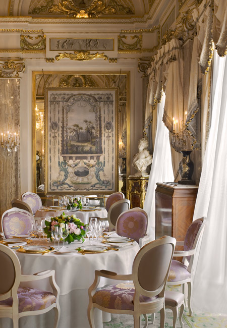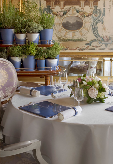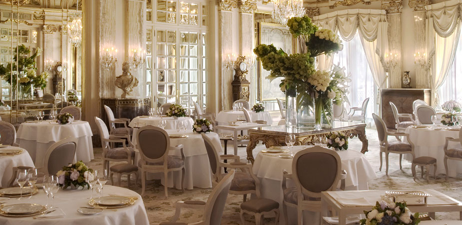 La salle de restaurant de style Versailles grand siècle et ses fastueux ornements vous transporte dans un monde de raffinement extrême, où tout est orchestré à la perfection, jusqu’aux arts de la table qui évoluent au fil du repas. Chaque client mobilise à lui seul une cinquantaine de pièces de service ! Mille et une attentions délicates prodiguées par le personnel de salle viennent compléter ce moment de grâce.