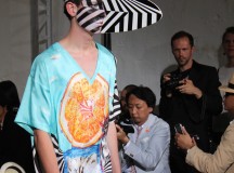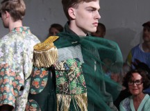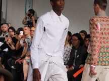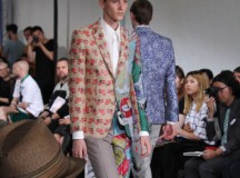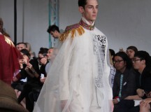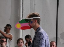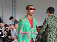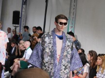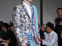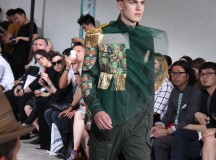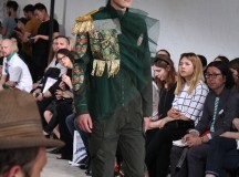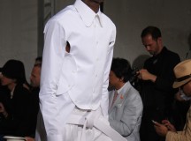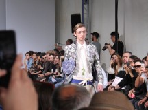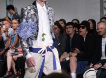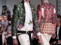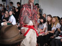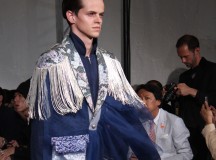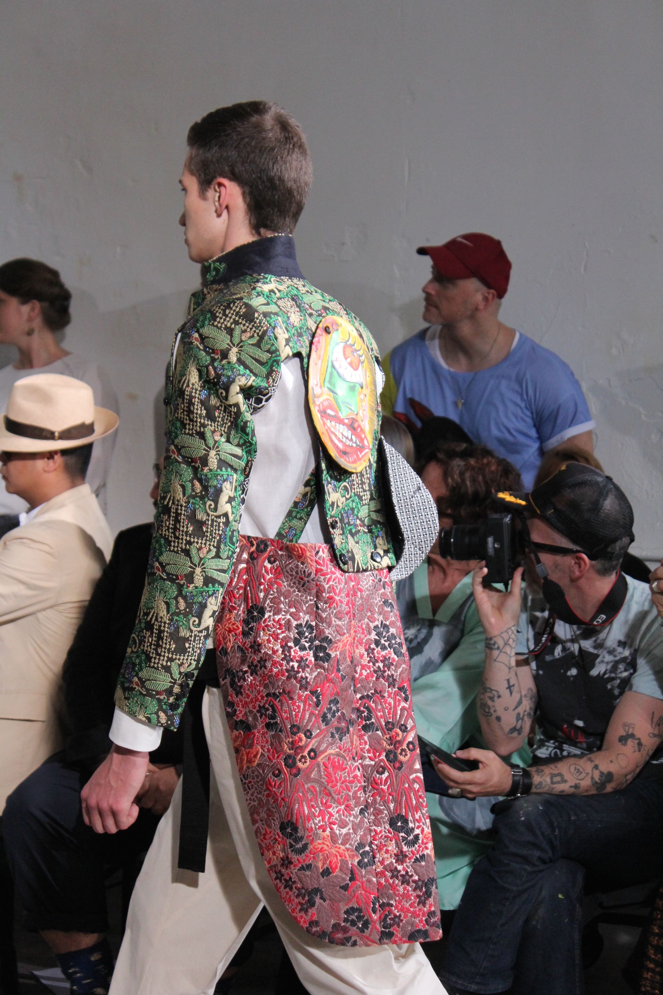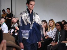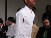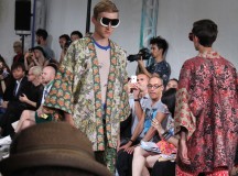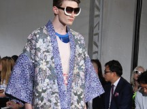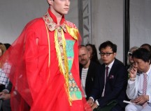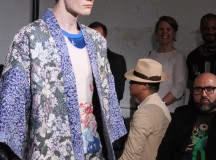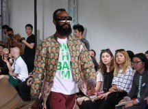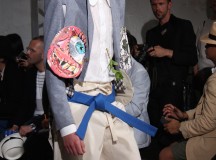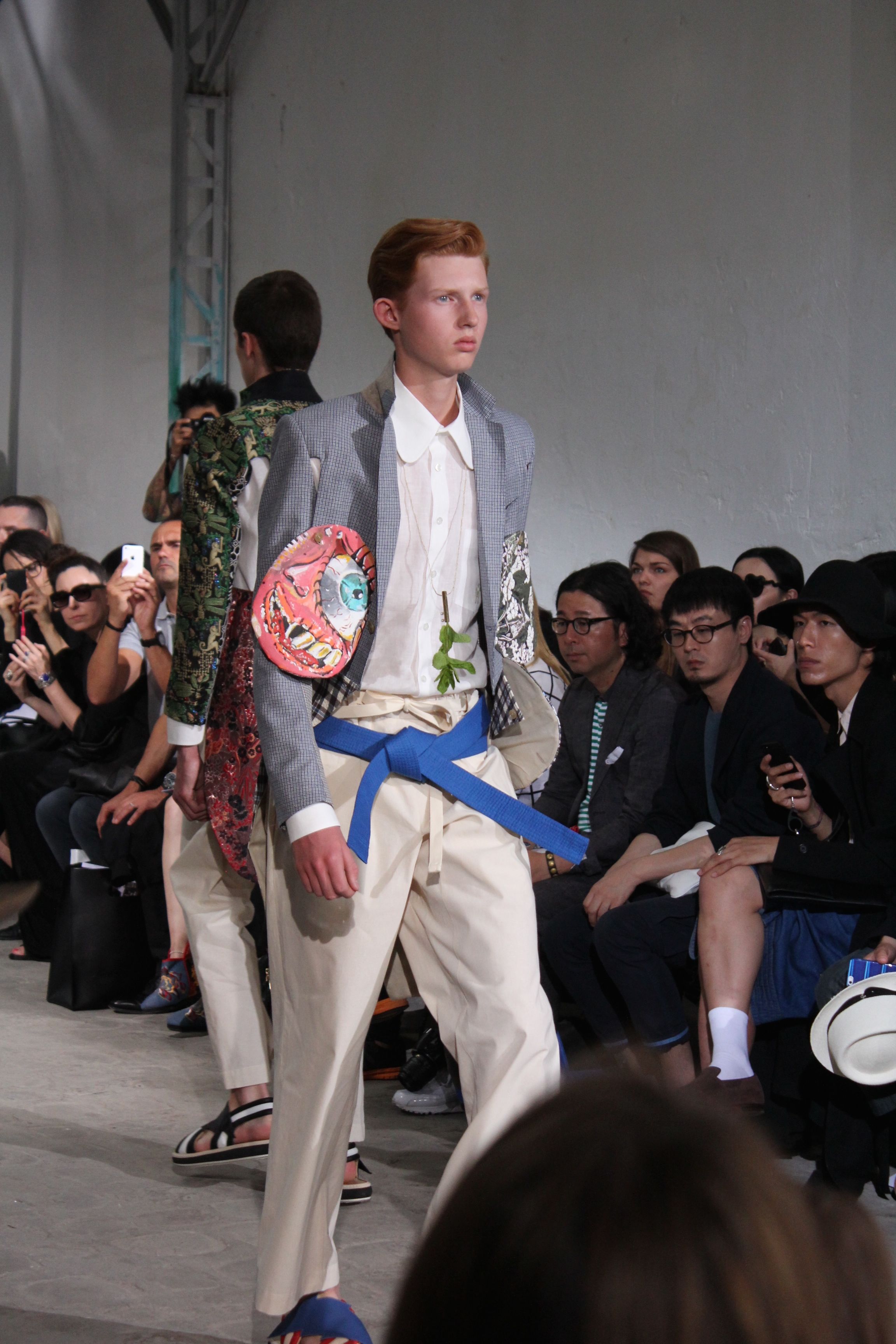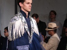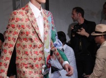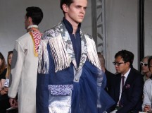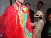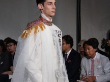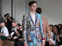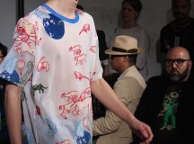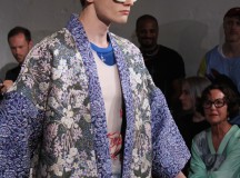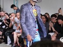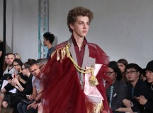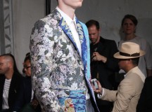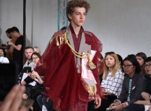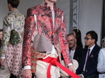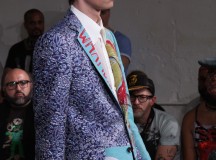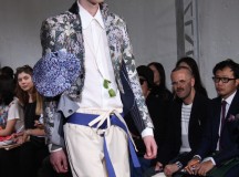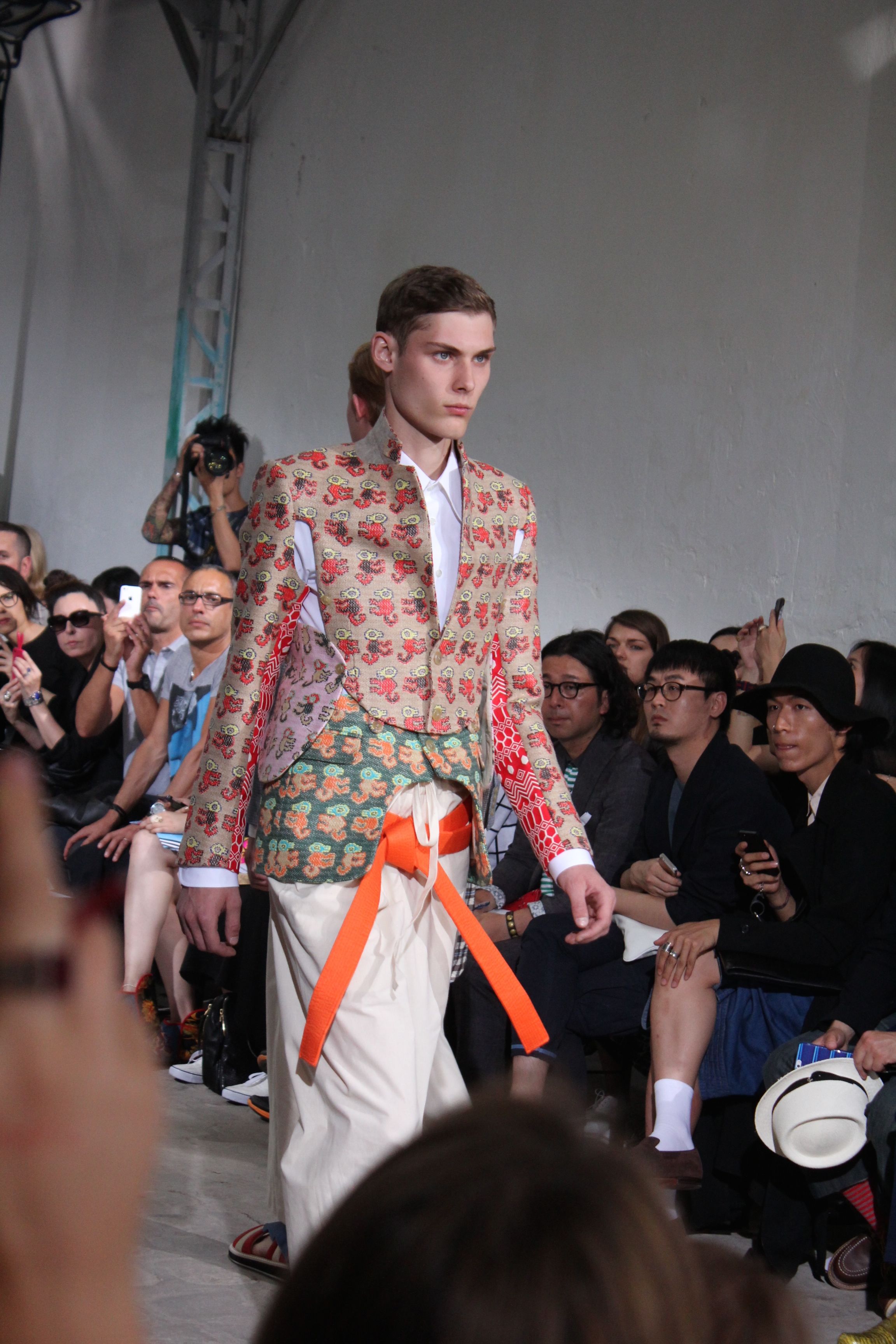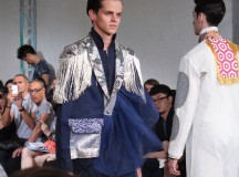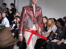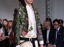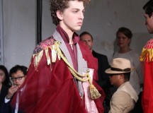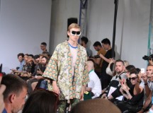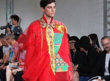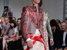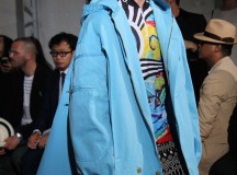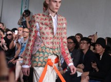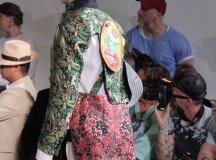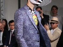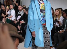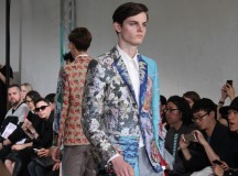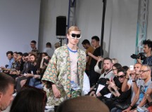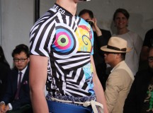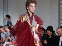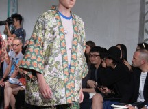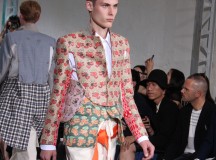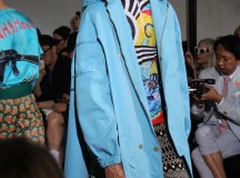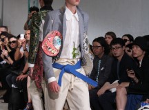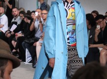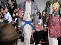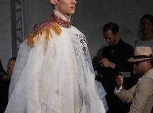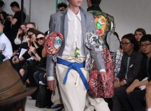 Romantisme et allure conquérante chez Walter Van Beirendonck…Chaque collection de Walter Van Beirendonck est construite au-delà du vêtement. Le créateur anversois profite du défilé pour divulguer des messages sur le monde qui l’entoure, se reflétant sur directement sur son vestiaire. Le dandy romantique prend des allures de conquérant. Les vestes et queues de pie sont construites pour se décomposer grâce à des boutons pression. Les ceintures comme les vestes kimonos et les pantalons amples sont inspirés du monde du judo. Le surfeur tel qu’il est vu par Walter, arrive en fuseau ou combinaison graphique et colorée. On retrouve les essentiels du créateur comme les combinaisons de travailleurs ou les tee-shirts amples. Le travail sur les matières – des brocards aux cotons épais – reste le point de départ, jusqu’à ses peintures imprimées réalisées par l’artiste Scooter Laforge.