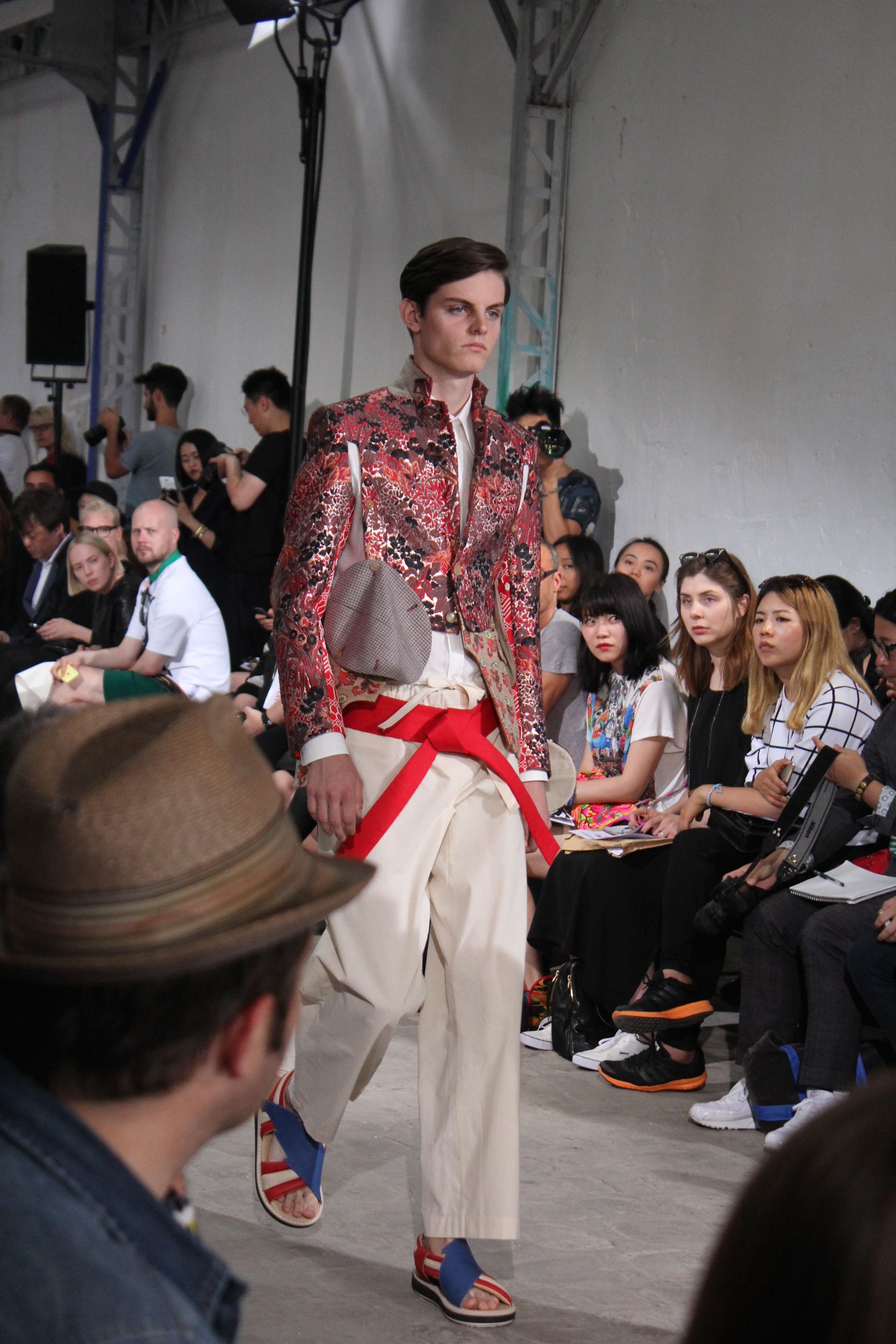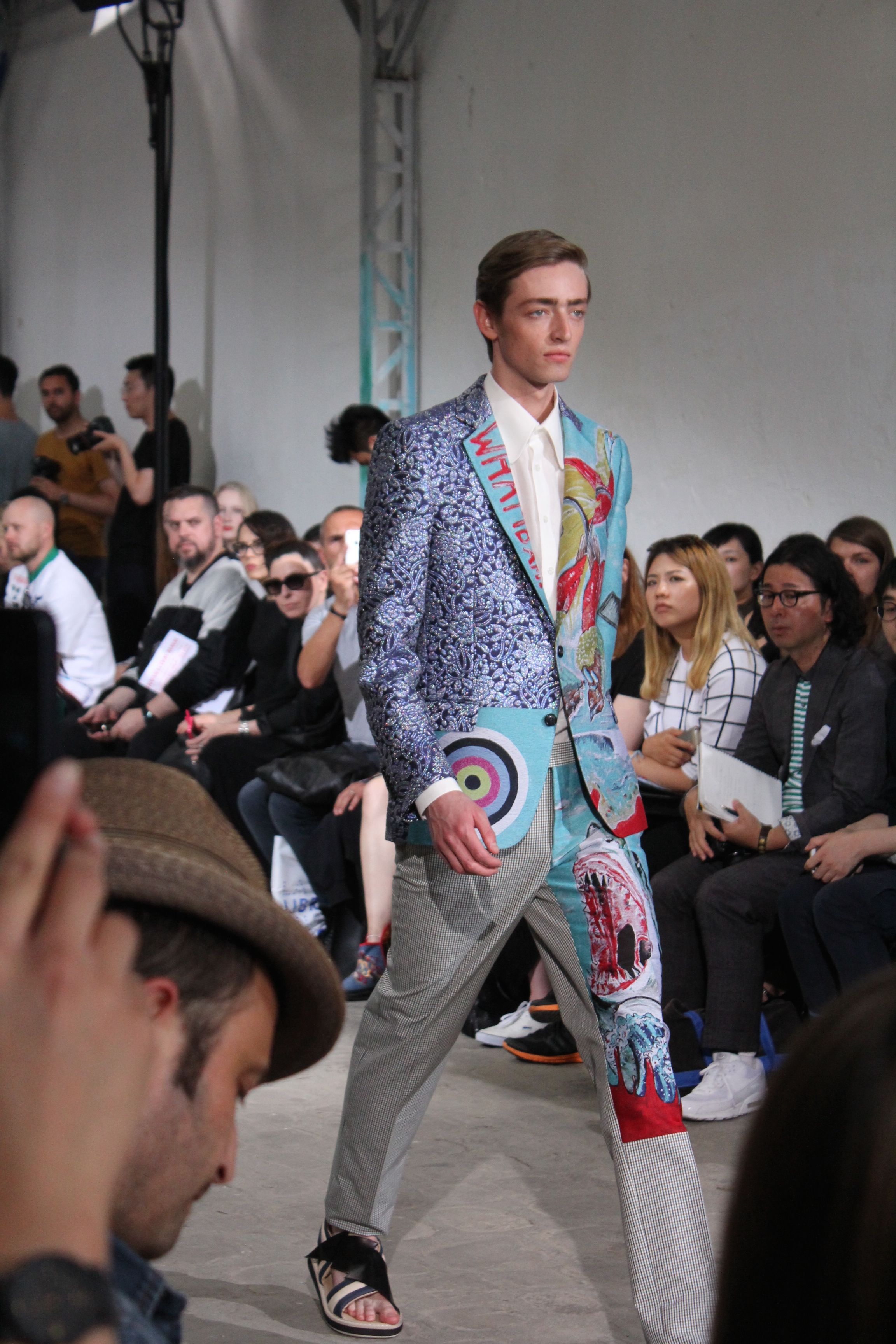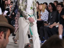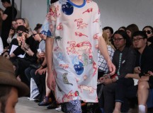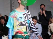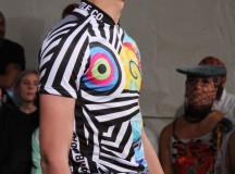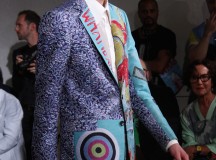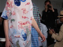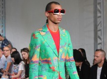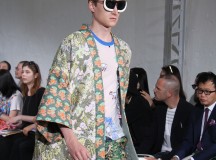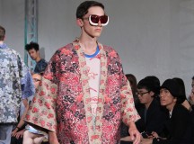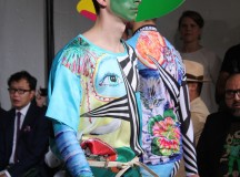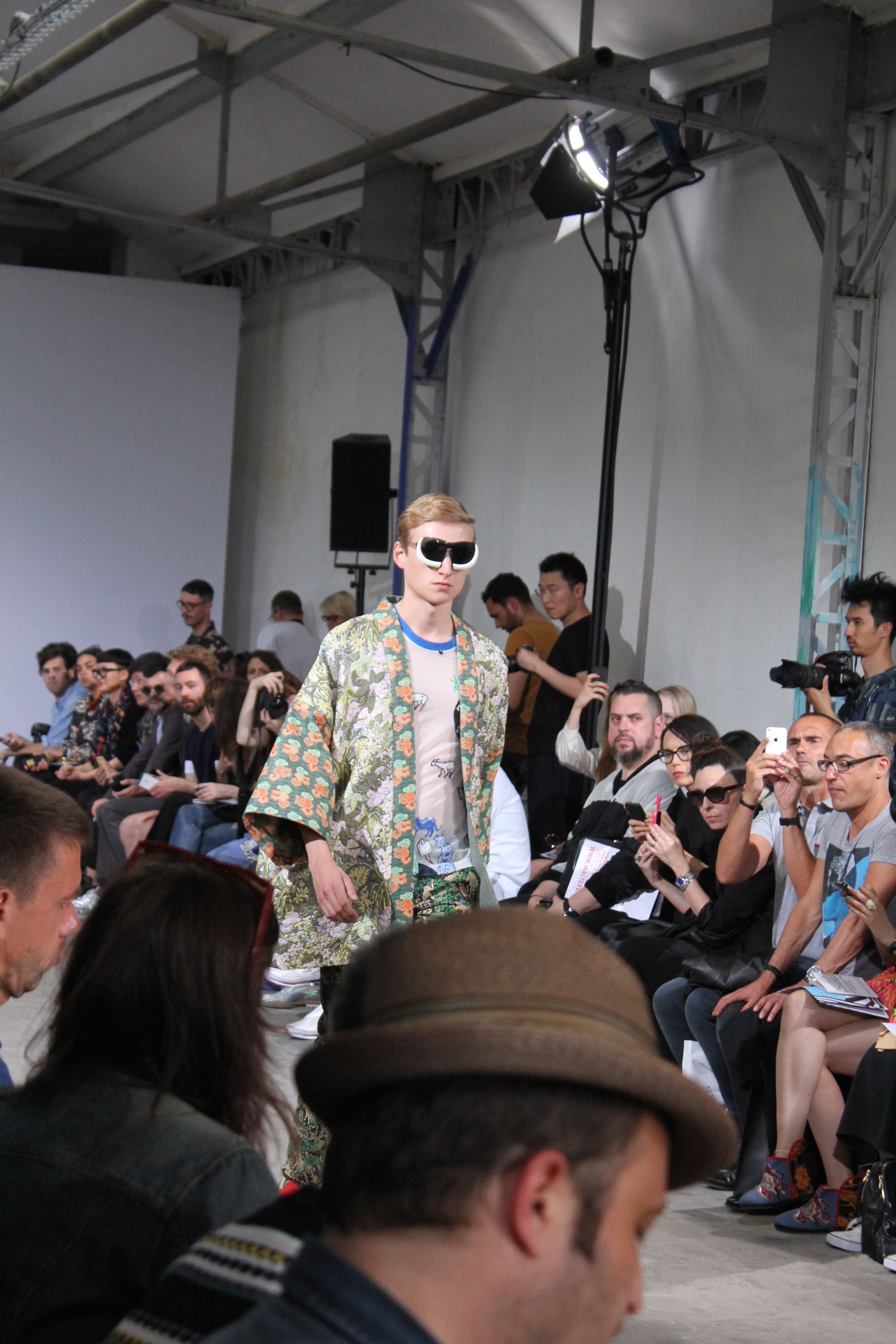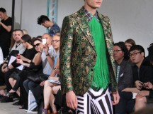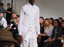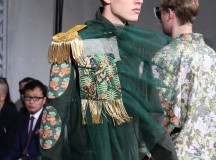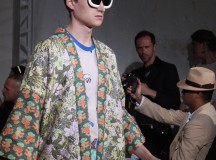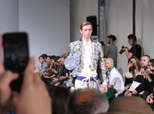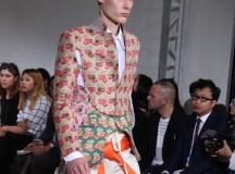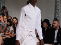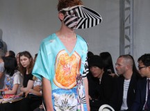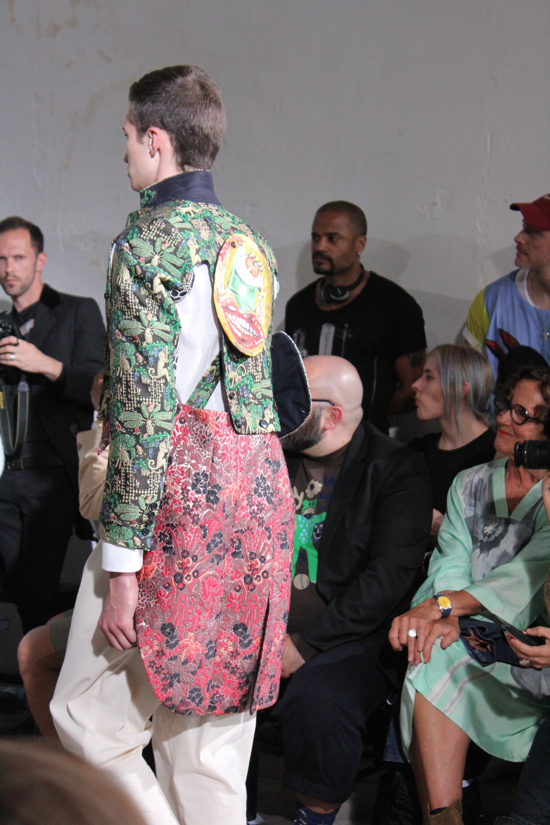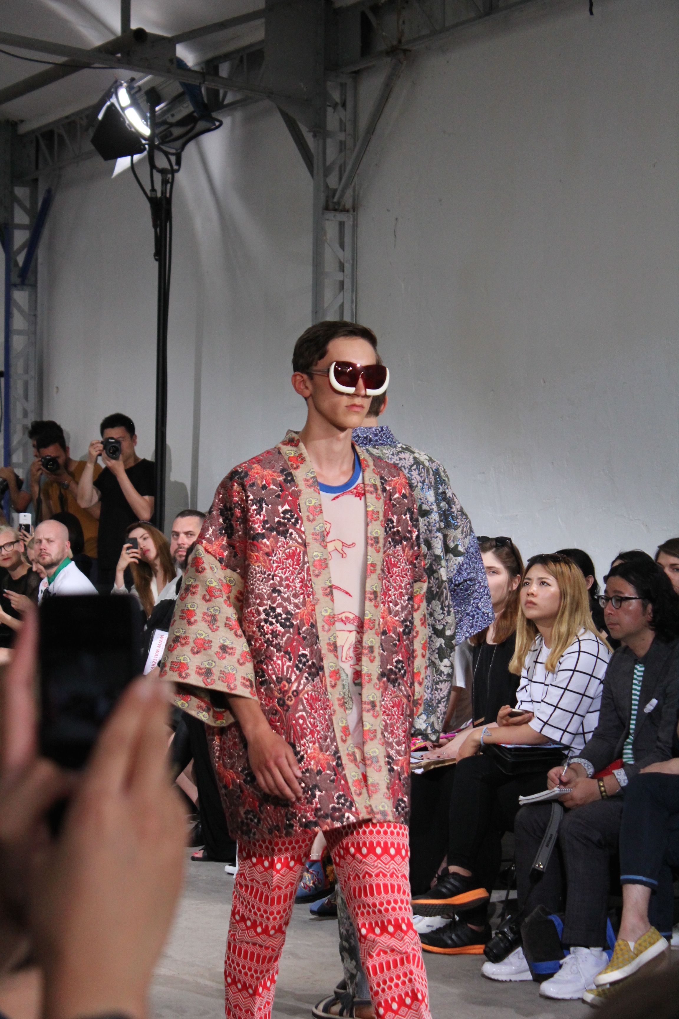 Romantisme et allure conquérante chez Walter Van Beirendonck…Chaque collection de Walter Van Beirendonck est construite au-delà du vêtement. Le créateur anversois profite du défilé pour divulguer des messages sur le monde qui l’entoure, se reflétant sur directement sur son vestiaire. Le dandy romantique prend des allures de conquérant. Les vestes et queues de pie sont construites pour se décomposer grâce à des boutons pression. Les ceintures comme les vestes kimonos et les pantalons amples sont inspirés du monde du judo. Le surfeur tel qu’il est vu par Walter, arrive en fuseau ou combinaison graphique et colorée. On retrouve les essentiels du créateur comme les combinaisons de travailleurs ou les tee-shirts amples. Le travail sur les matières – des brocards aux cotons épais – reste le point de départ, jusqu’à ses peintures imprimées réalisées par l’artiste Scooter Laforge.