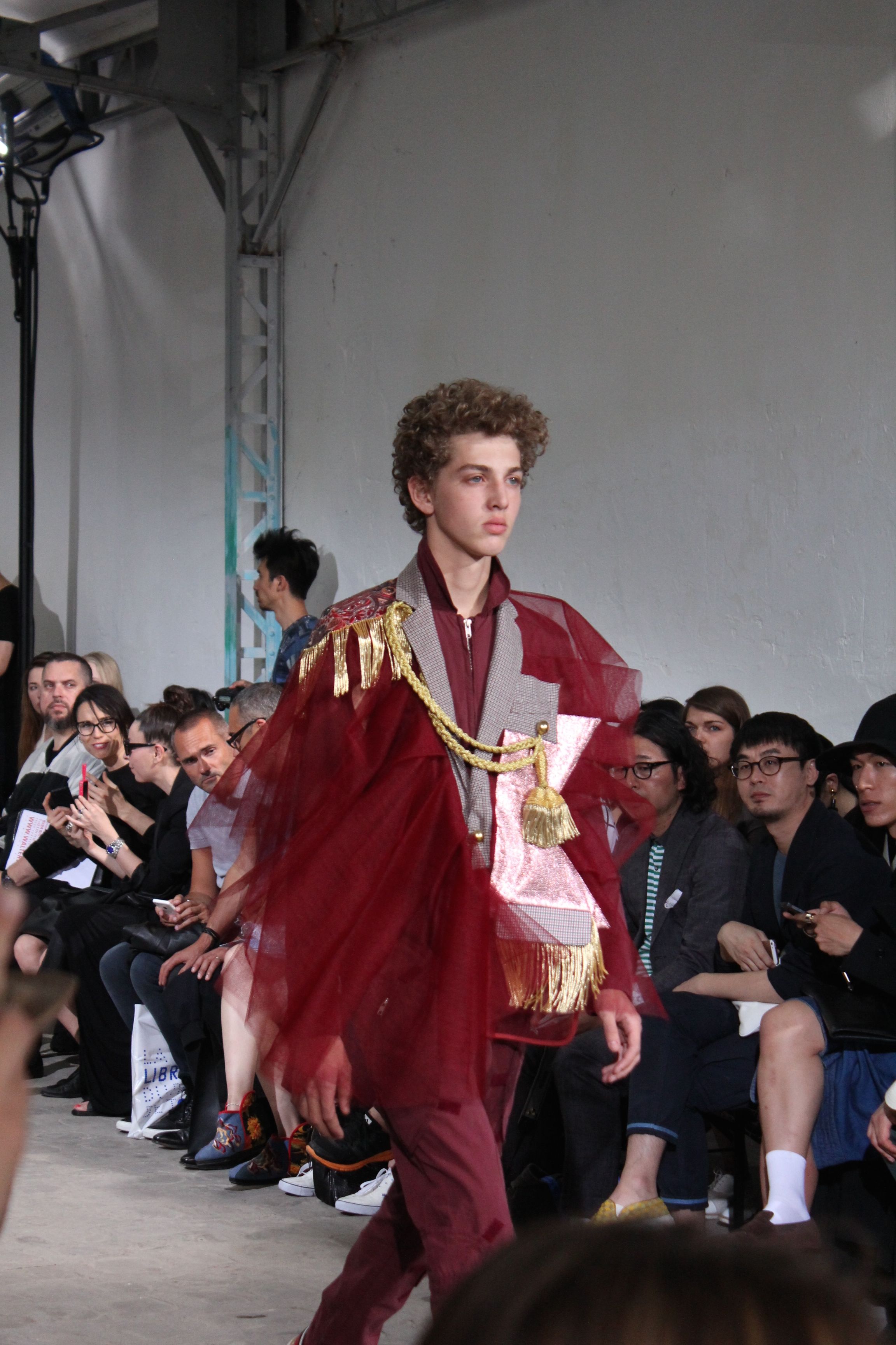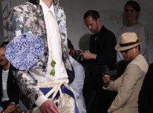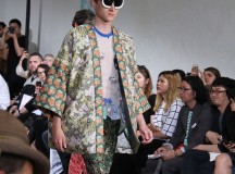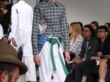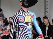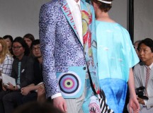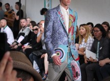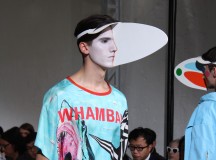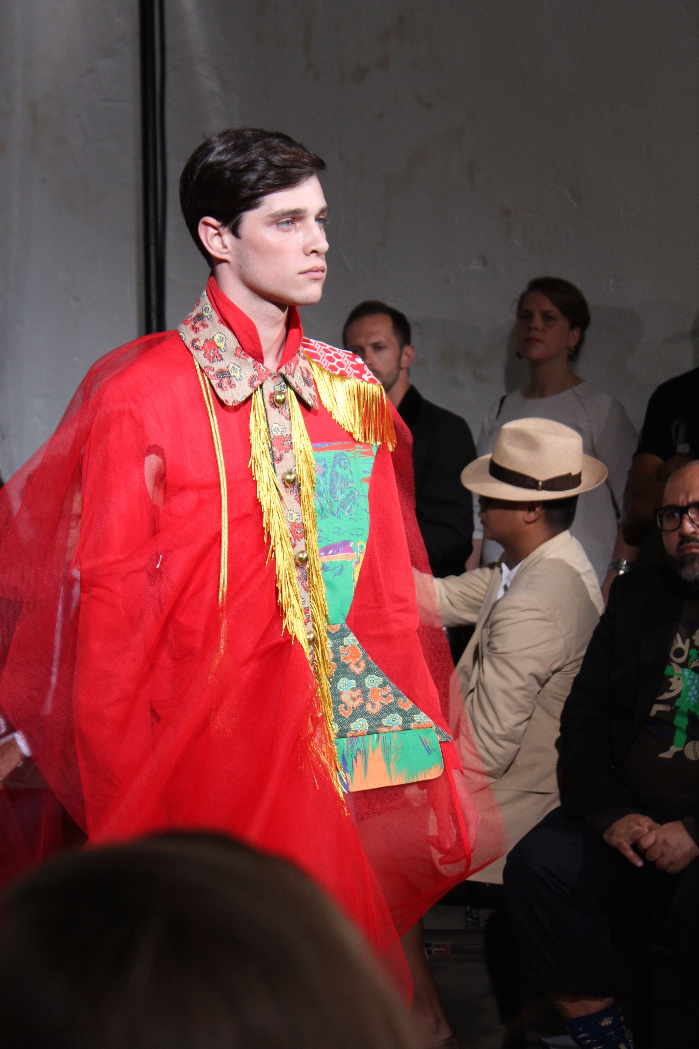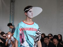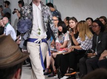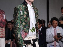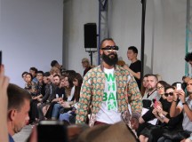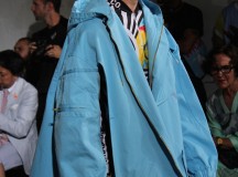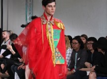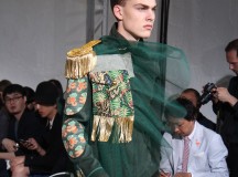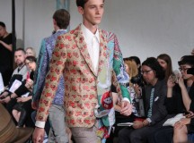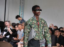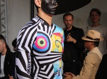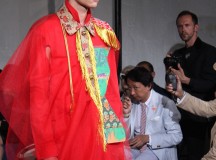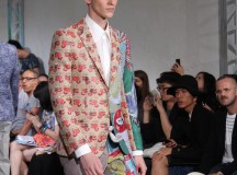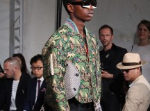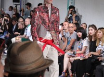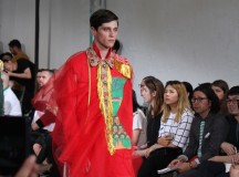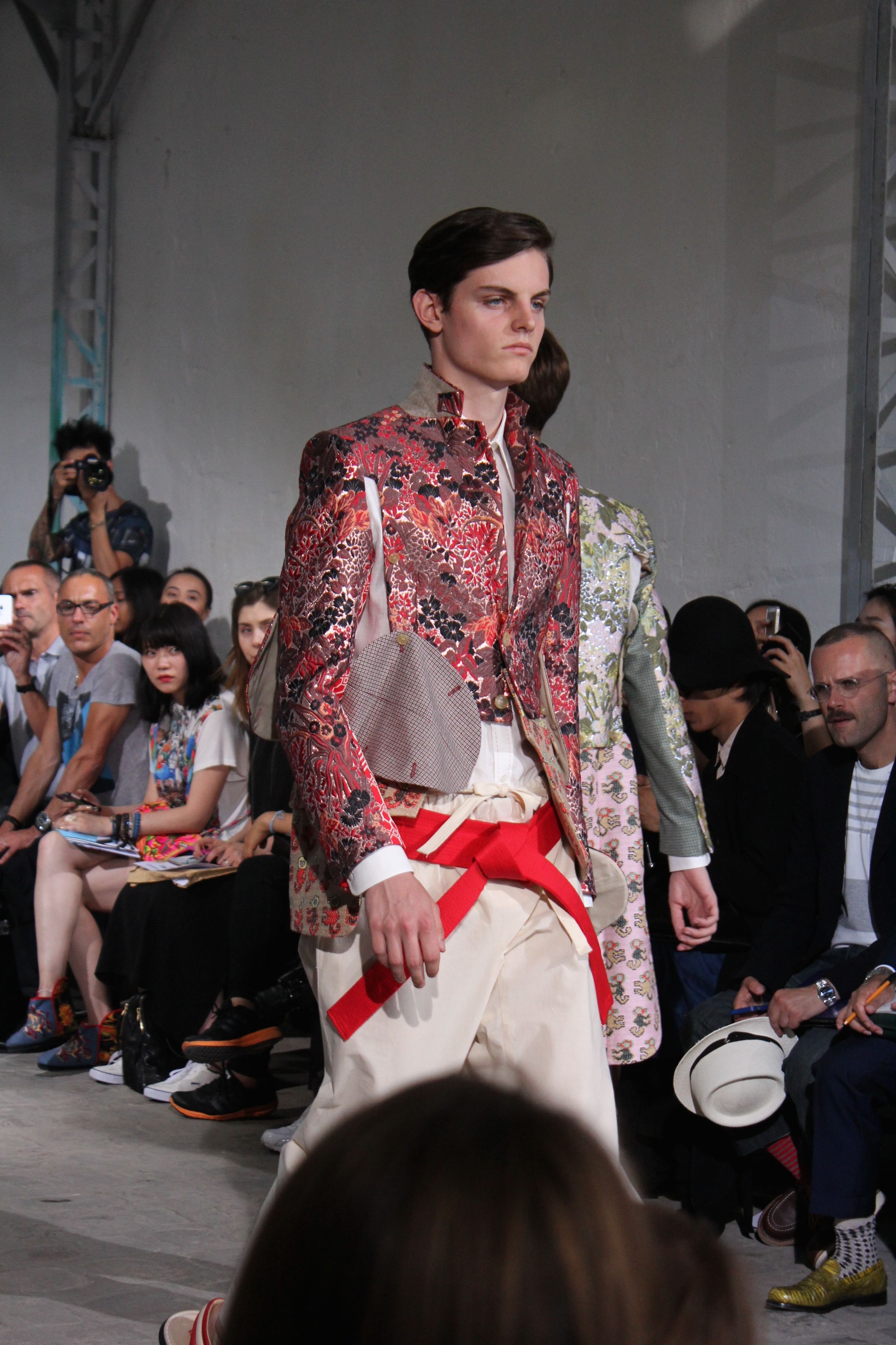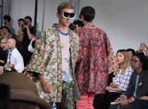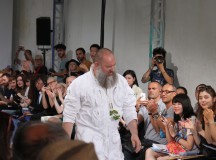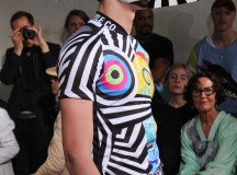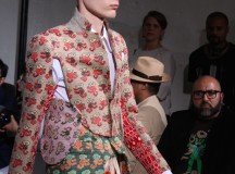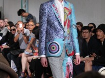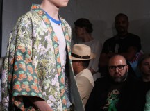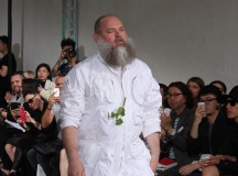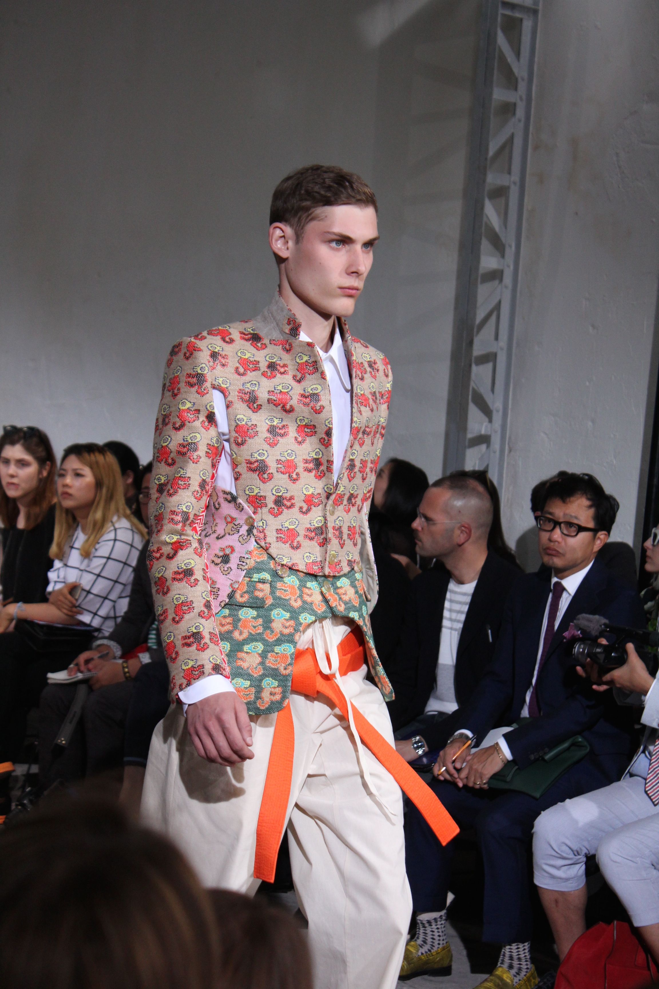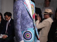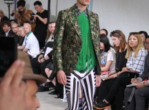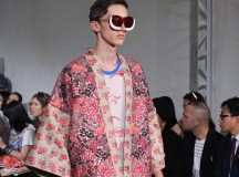 Romantisme et allure conquérante chez Walter Van Beirendonck…Chaque collection de Walter Van Beirendonck est construite au-delà du vêtement. Le créateur anversois profite du défilé pour divulguer des messages sur le monde qui l’entoure, se reflétant sur directement sur son vestiaire. Le dandy romantique prend des allures de conquérant. Les vestes et queues de pie sont construites pour se décomposer grâce à des boutons pression. Les ceintures comme les vestes kimonos et les pantalons amples sont inspirés du monde du judo. Le surfeur tel qu’il est vu par Walter, arrive en fuseau ou combinaison graphique et colorée. On retrouve les essentiels du créateur comme les combinaisons de travailleurs ou les tee-shirts amples. Le travail sur les matières – des brocards aux cotons épais – reste le point de départ, jusqu’à ses peintures imprimées réalisées par l’artiste Scooter Laforge.