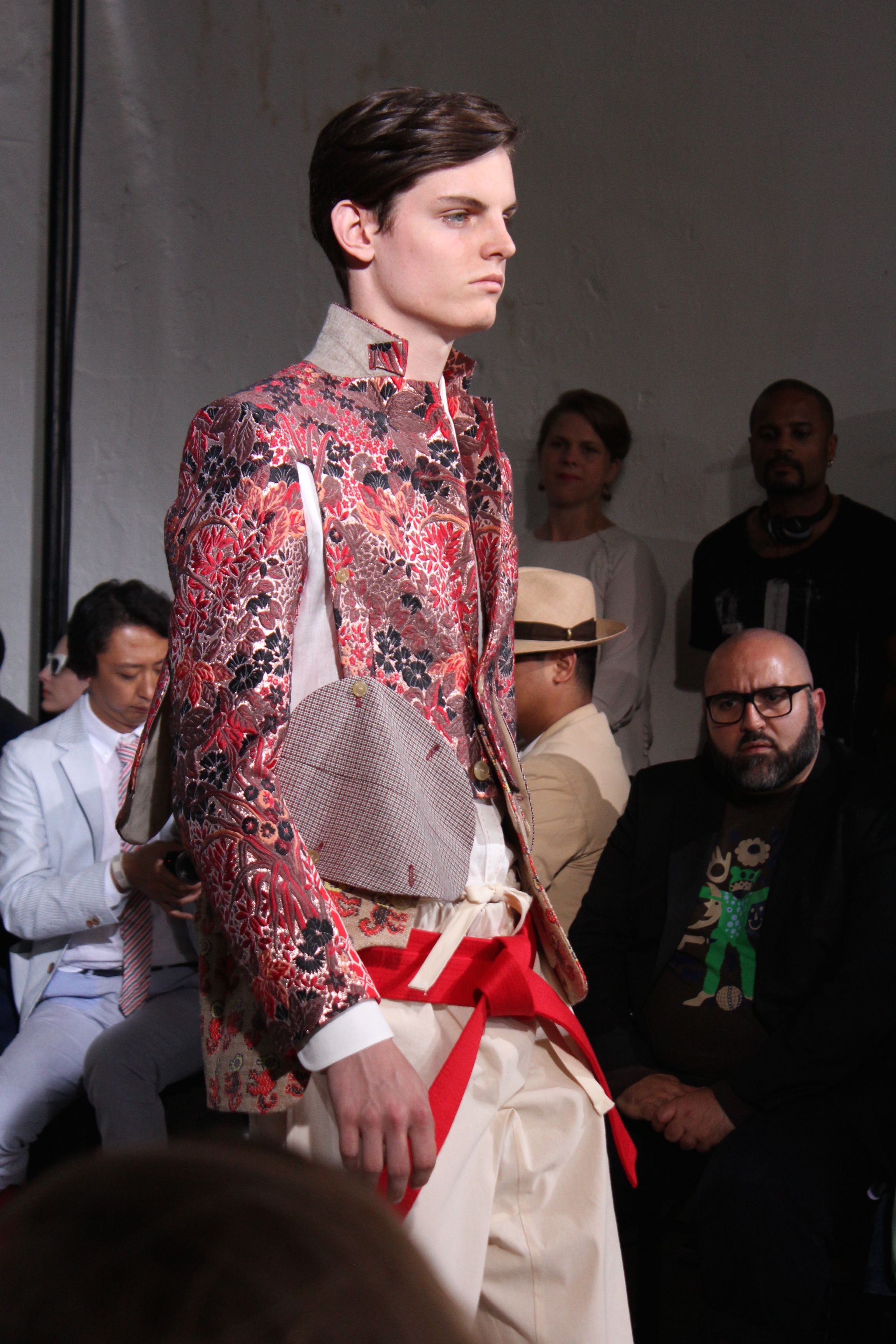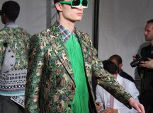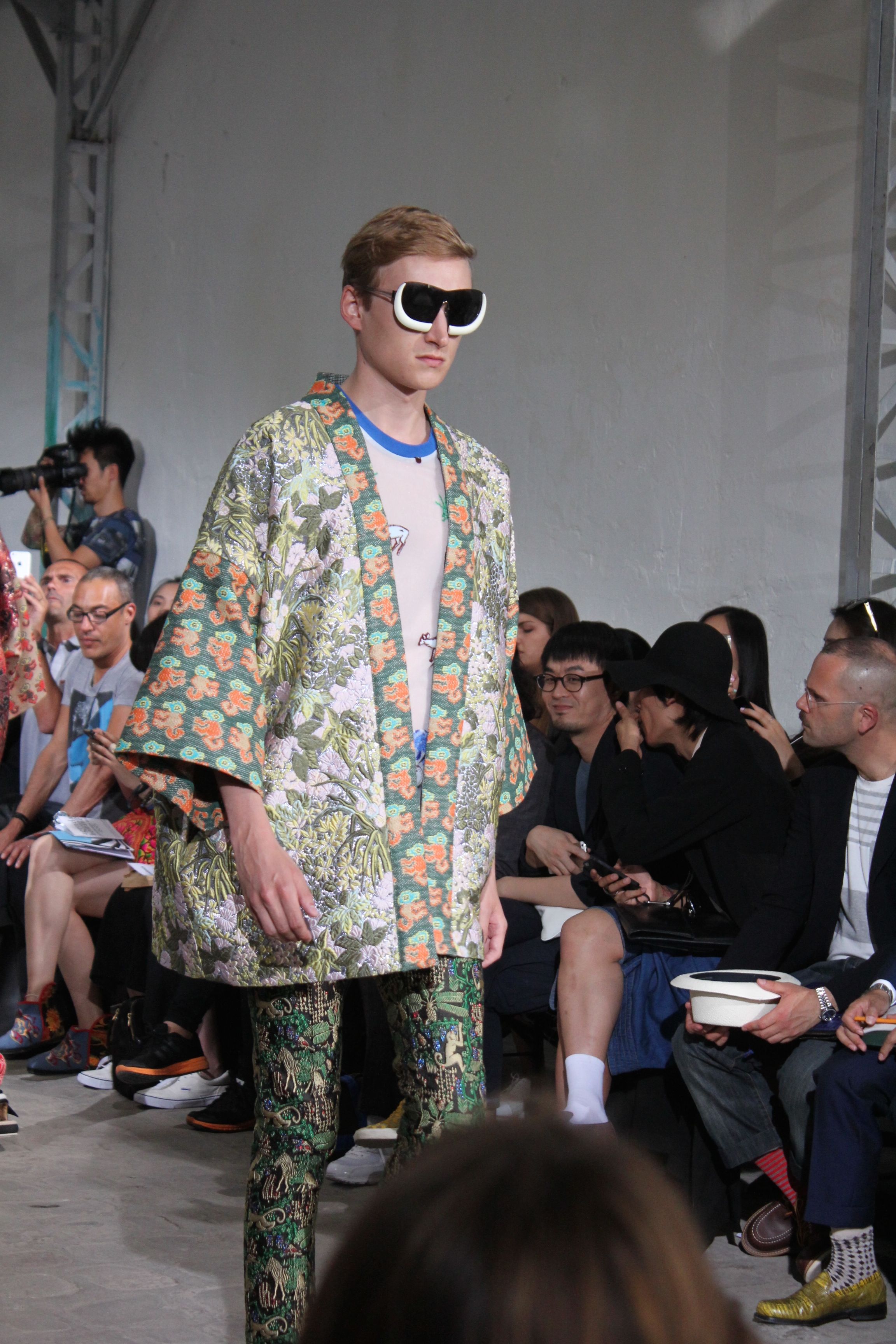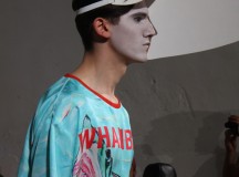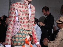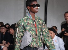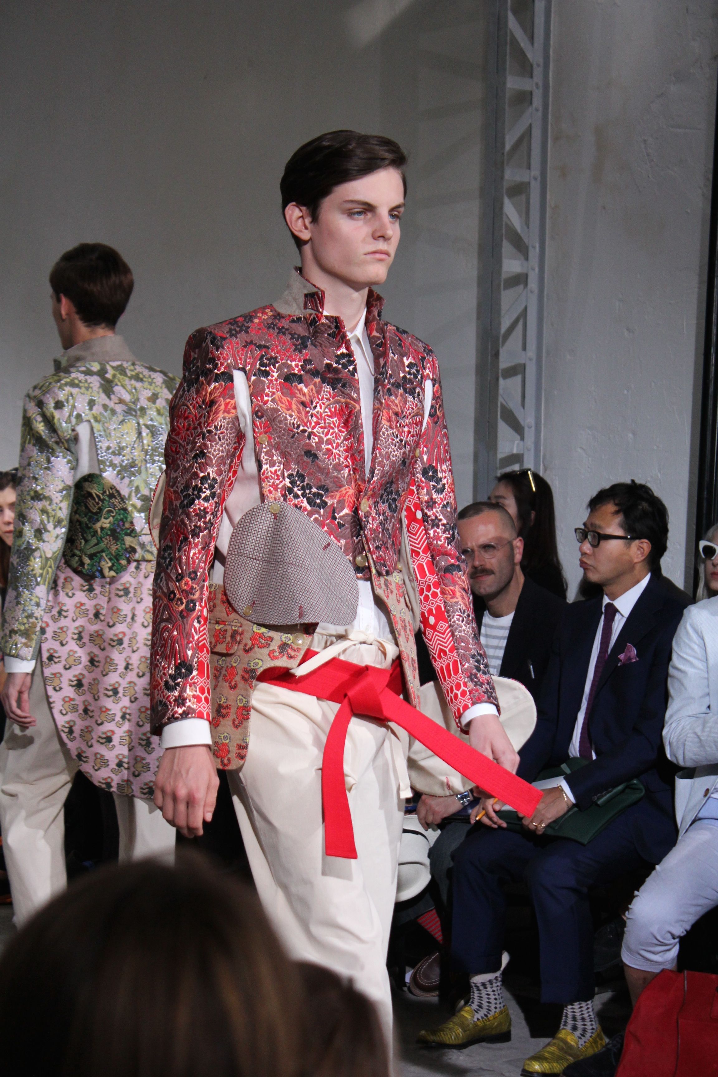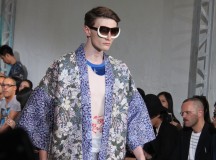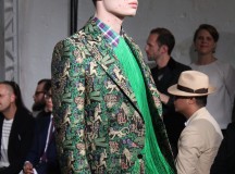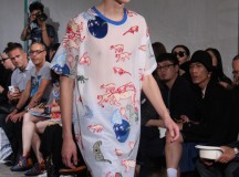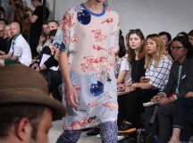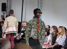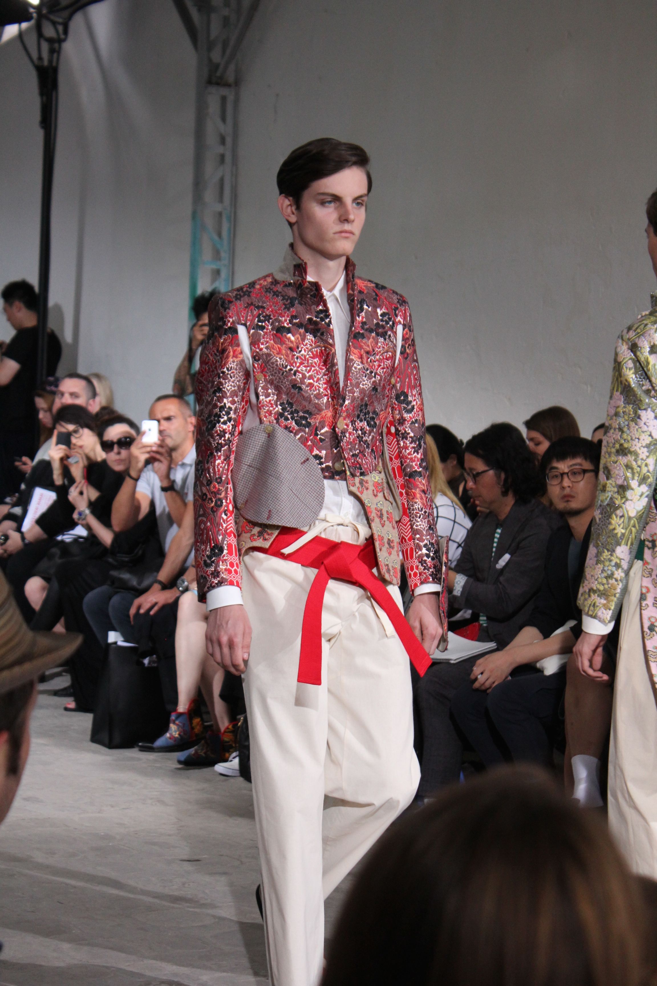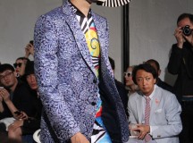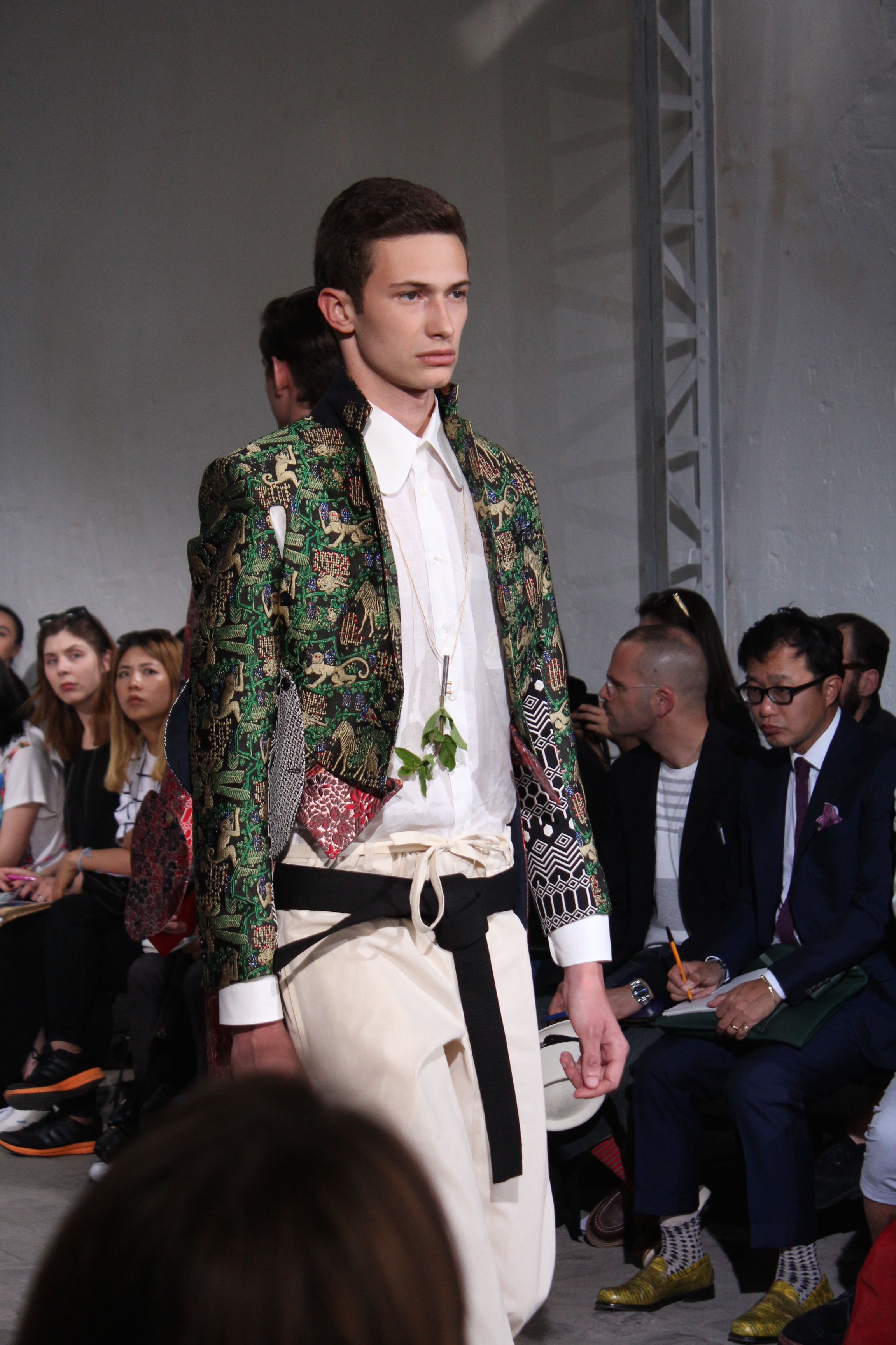 Romantisme et allure conquérante chez Walter Van Beirendonck…Chaque collection de Walter Van Beirendonck est construite au-delà du vêtement. Le créateur anversois profite du défilé pour divulguer des messages sur le monde qui l’entoure, se reflétant sur directement sur son vestiaire. Le dandy romantique prend des allures de conquérant. Les vestes et queues de pie sont construites pour se décomposer grâce à des boutons pression. Les ceintures comme les vestes kimonos et les pantalons amples sont inspirés du monde du judo. Le surfeur tel qu’il est vu par Walter, arrive en fuseau ou combinaison graphique et colorée. On retrouve les essentiels du créateur comme les combinaisons de travailleurs ou les tee-shirts amples. Le travail sur les matières – des brocards aux cotons épais – reste le point de départ, jusqu’à ses peintures imprimées réalisées par l’artiste Scooter Laforge.