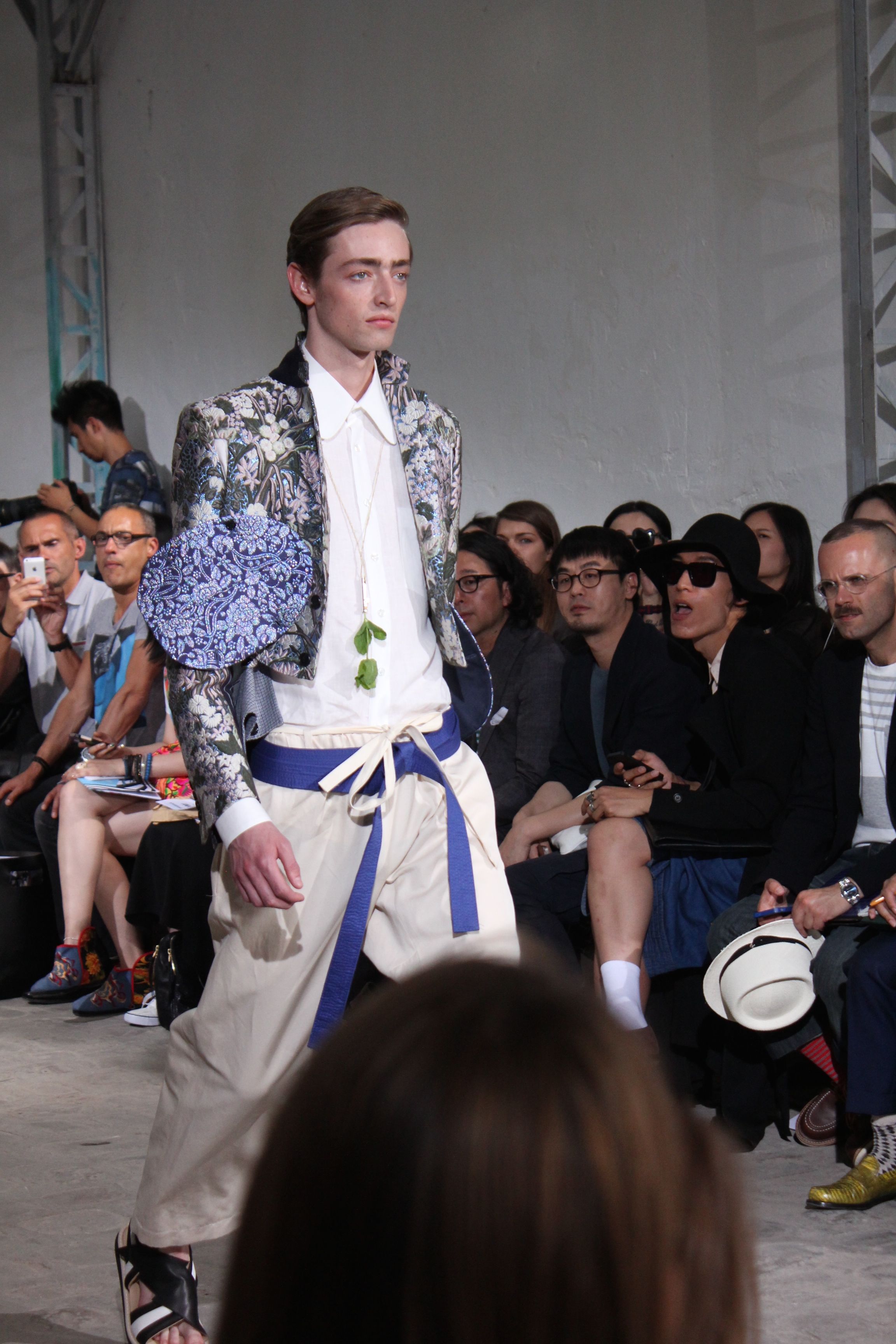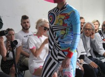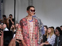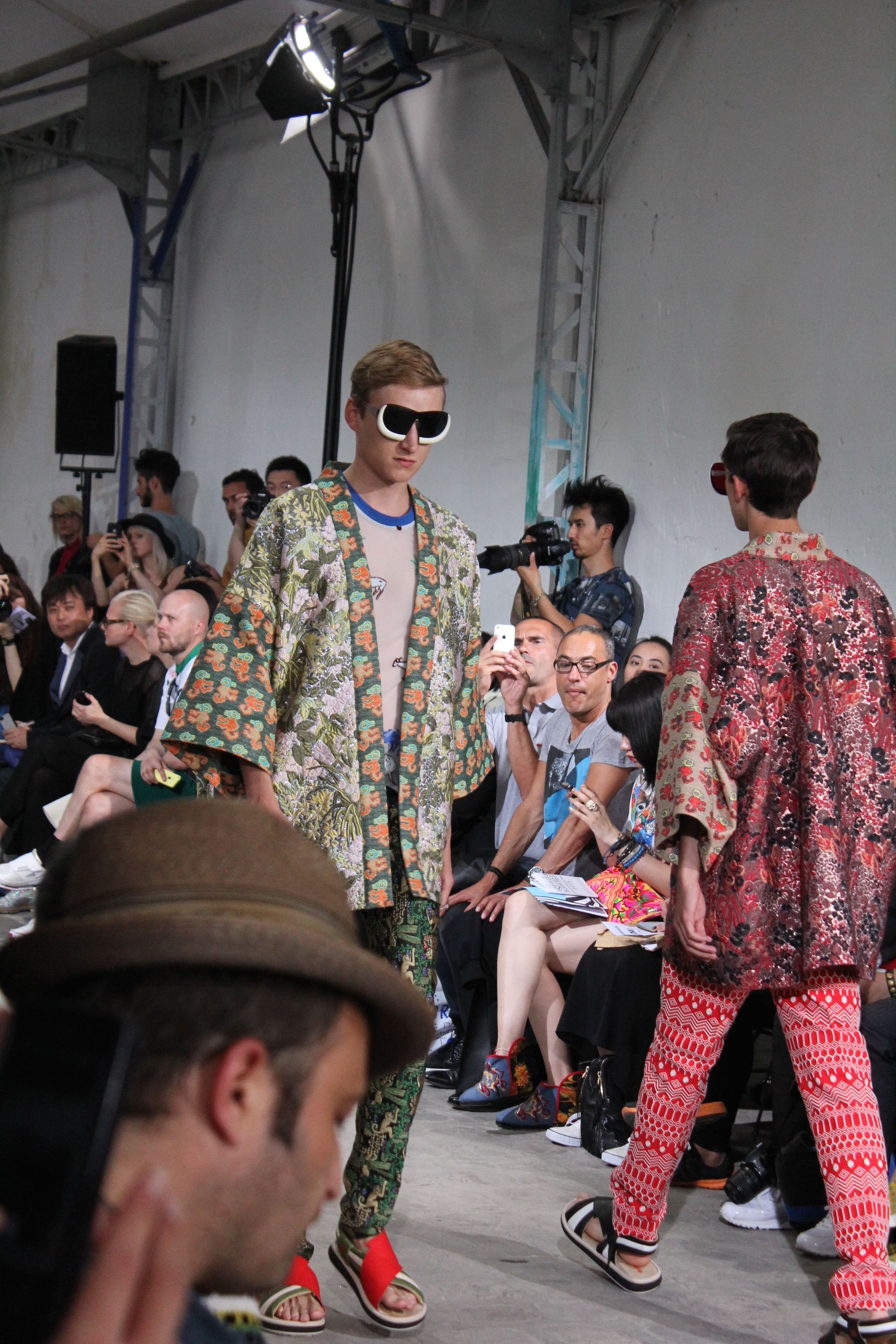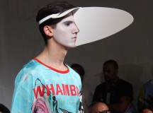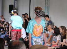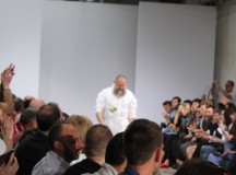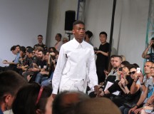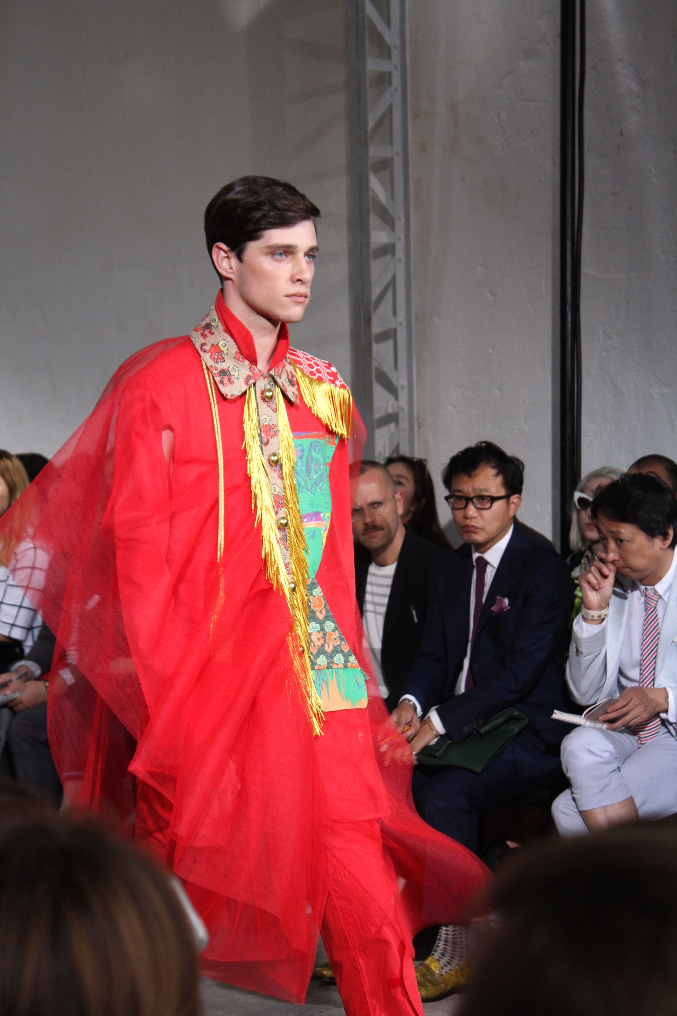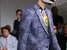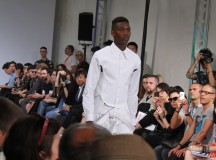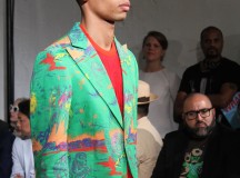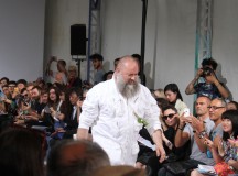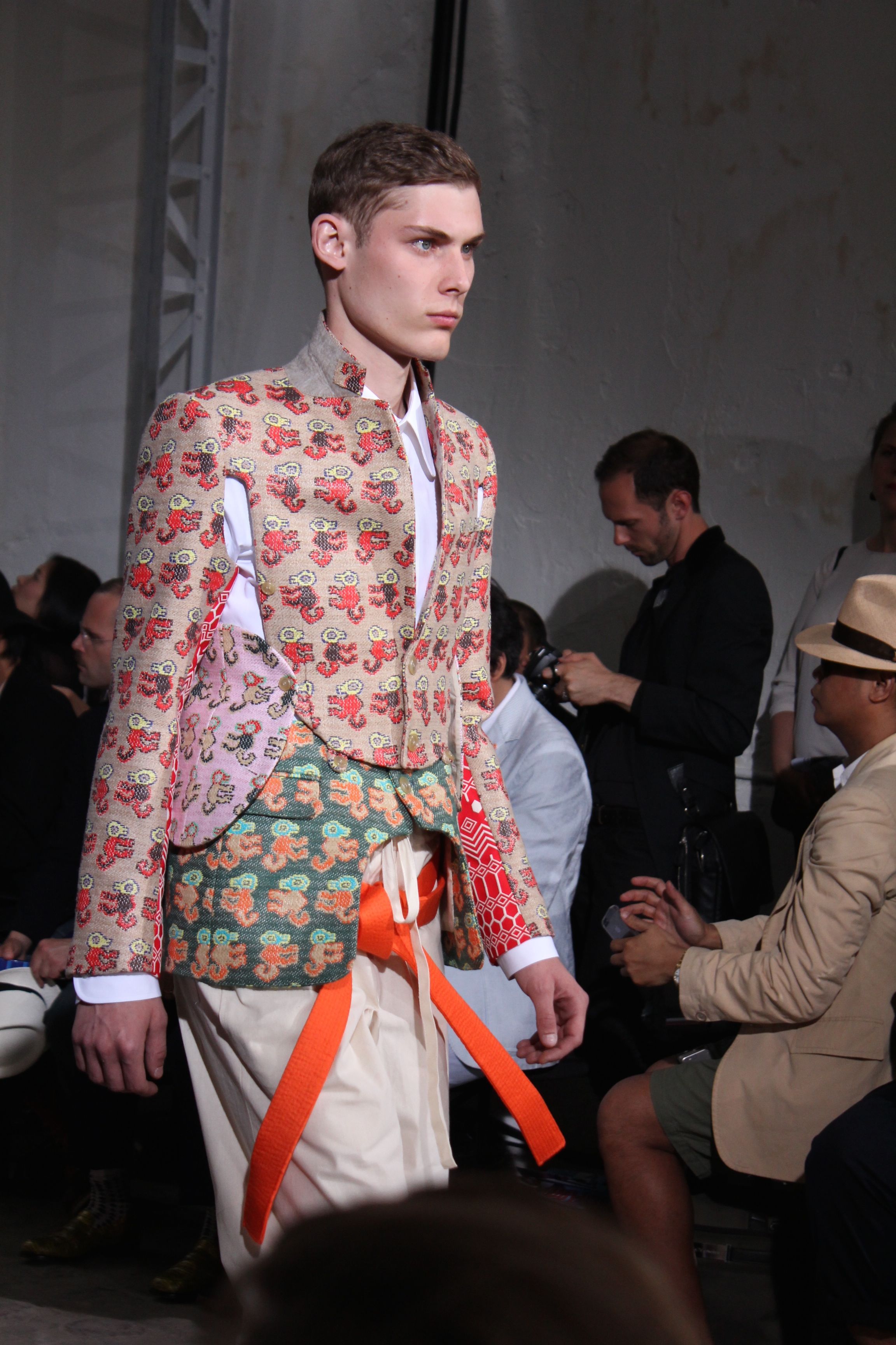 Romantisme et allure conquérante chez Walter Van Beirendonck…Chaque collection de Walter Van Beirendonck est construite au-delà du vêtement. Le créateur anversois profite du défilé pour divulguer des messages sur le monde qui l’entoure, se reflétant sur directement sur son vestiaire. Le dandy romantique prend des allures de conquérant. Les vestes et queues de pie sont construites pour se décomposer grâce à des boutons pression. Les ceintures comme les vestes kimonos et les pantalons amples sont inspirés du monde du judo. Le surfeur tel qu’il est vu par Walter, arrive en fuseau ou combinaison graphique et colorée. On retrouve les essentiels du créateur comme les combinaisons de travailleurs ou les tee-shirts amples. Le travail sur les matières – des brocards aux cotons épais – reste le point de départ, jusqu’à ses peintures imprimées réalisées par l’artiste Scooter Laforge.