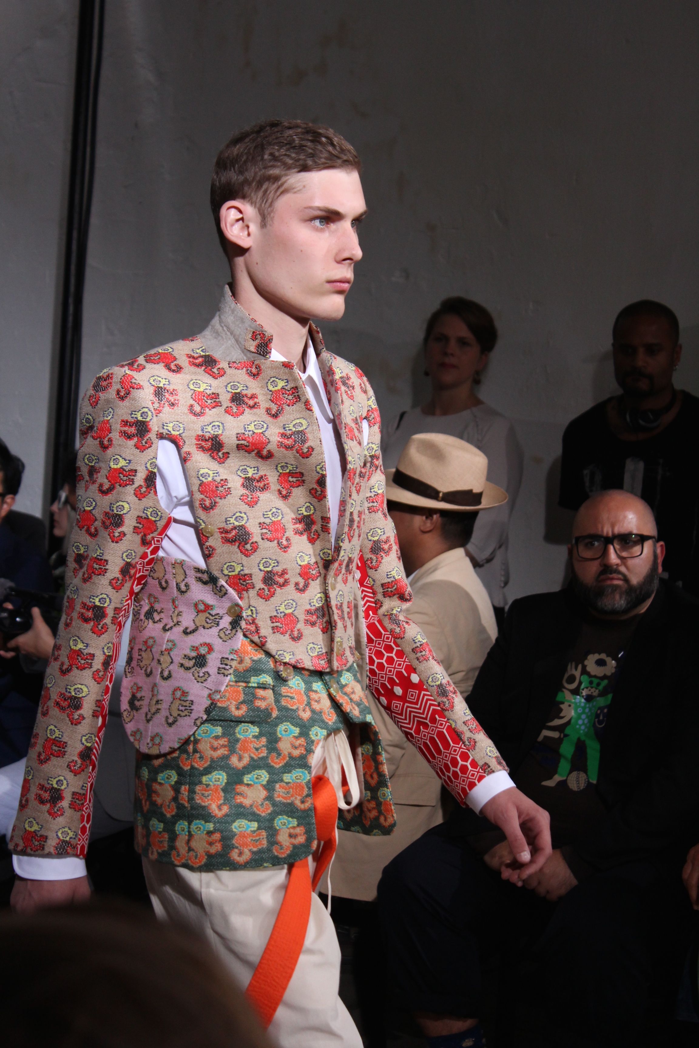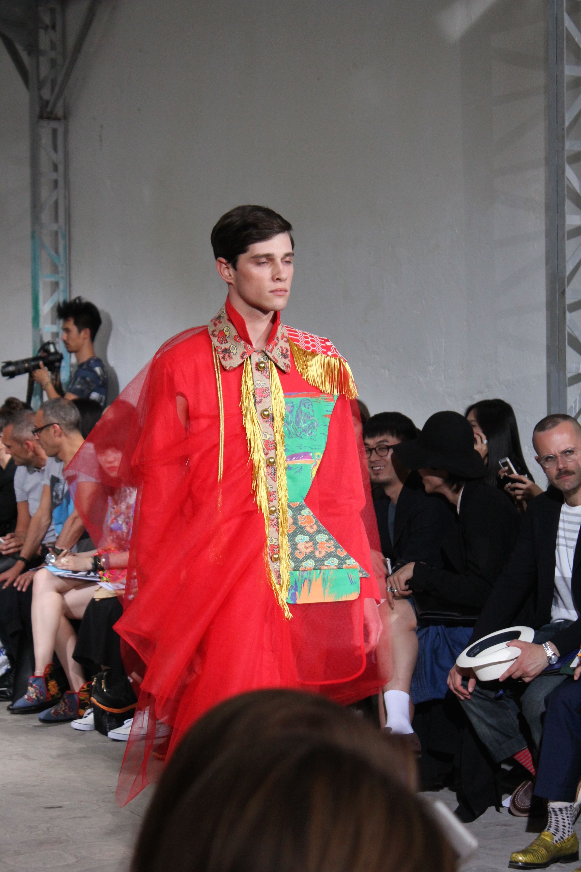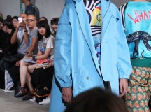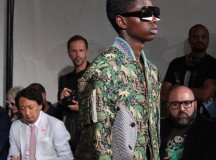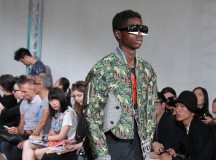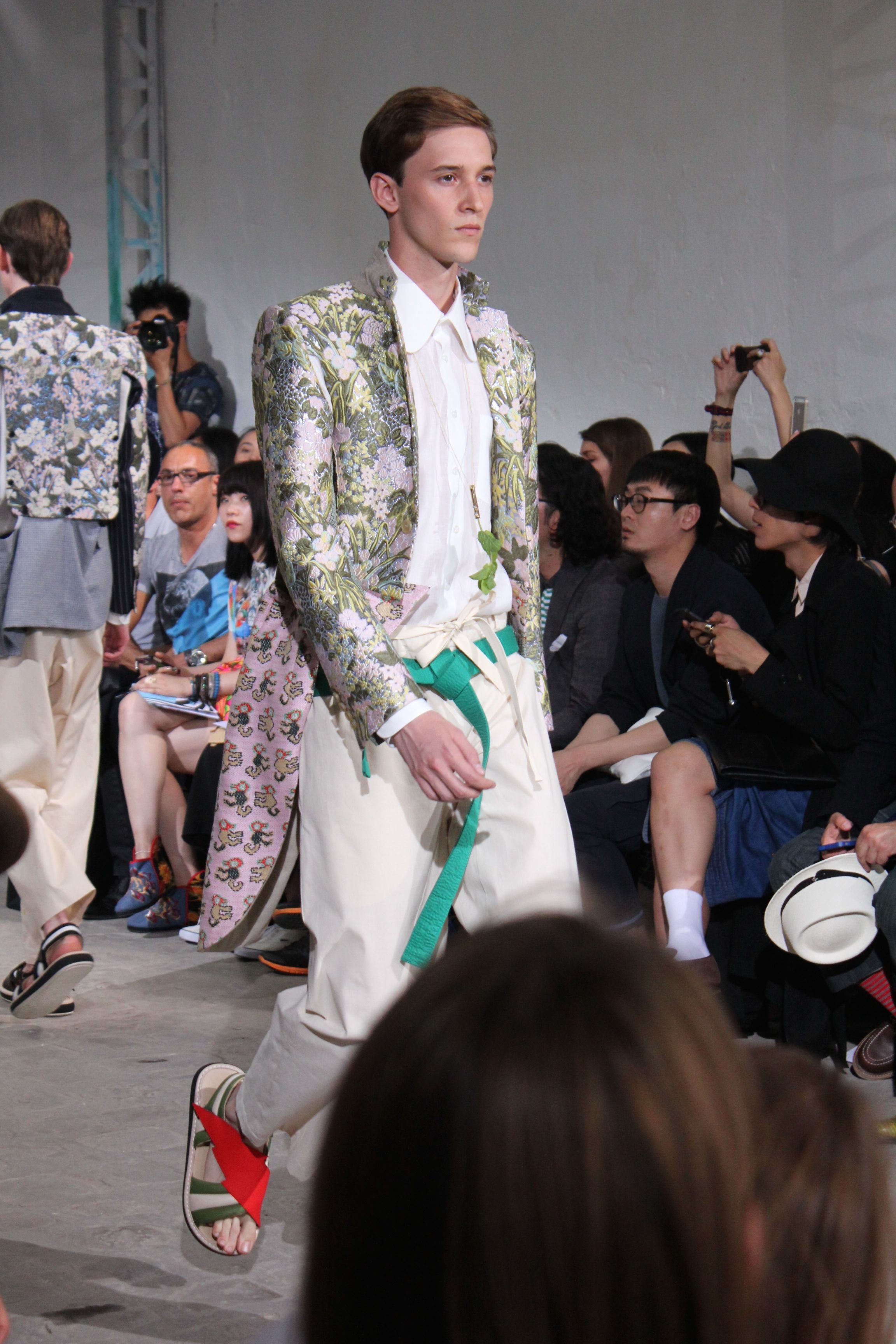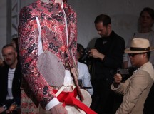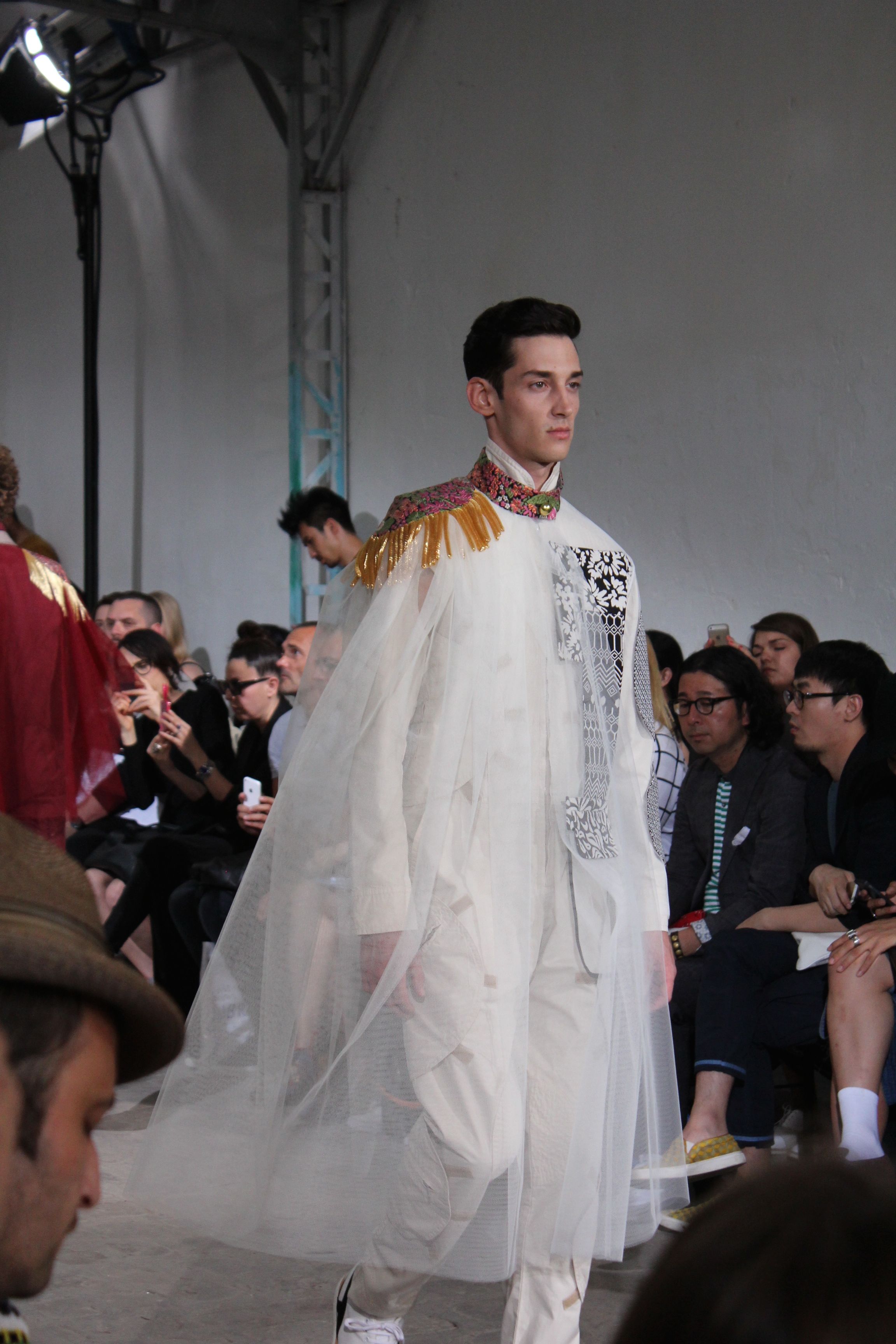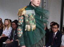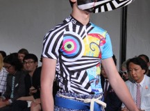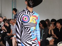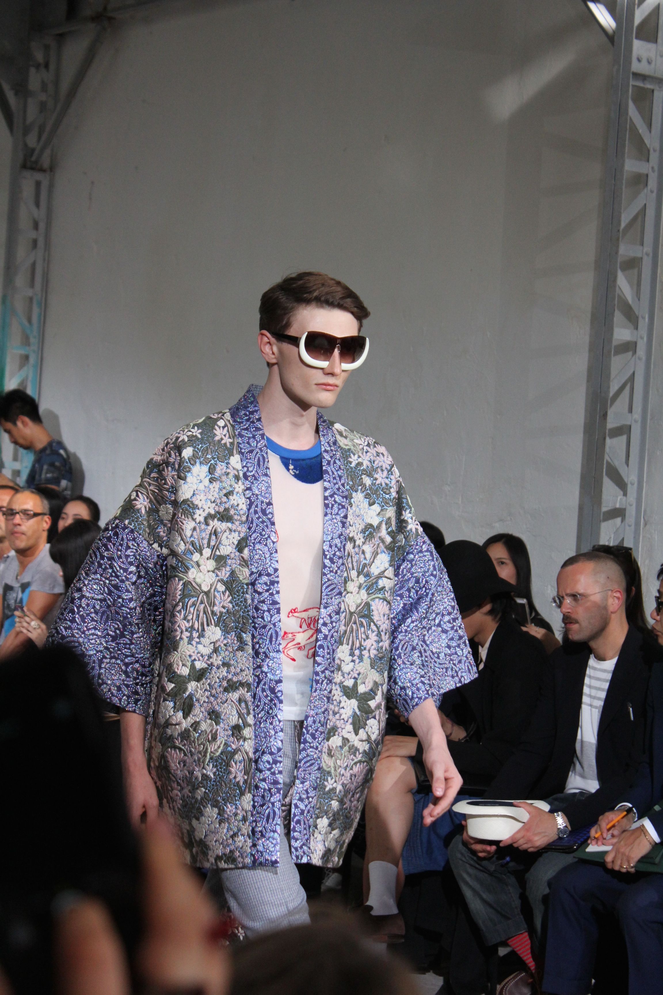 Romantisme et allure conquérante chez Walter Van Beirendonck…Chaque collection de Walter Van Beirendonck est construite au-delà du vêtement. Le créateur anversois profite du défilé pour divulguer des messages sur le monde qui l’entoure, se reflétant sur directement sur son vestiaire. Le dandy romantique prend des allures de conquérant. Les vestes et queues de pie sont construites pour se décomposer grâce à des boutons pression. Les ceintures comme les vestes kimonos et les pantalons amples sont inspirés du monde du judo. Le surfeur tel qu’il est vu par Walter, arrive en fuseau ou combinaison graphique et colorée. On retrouve les essentiels du créateur comme les combinaisons de travailleurs ou les tee-shirts amples. Le travail sur les matières – des brocards aux cotons épais – reste le point de départ, jusqu’à ses peintures imprimées réalisées par l’artiste Scooter Laforge.