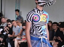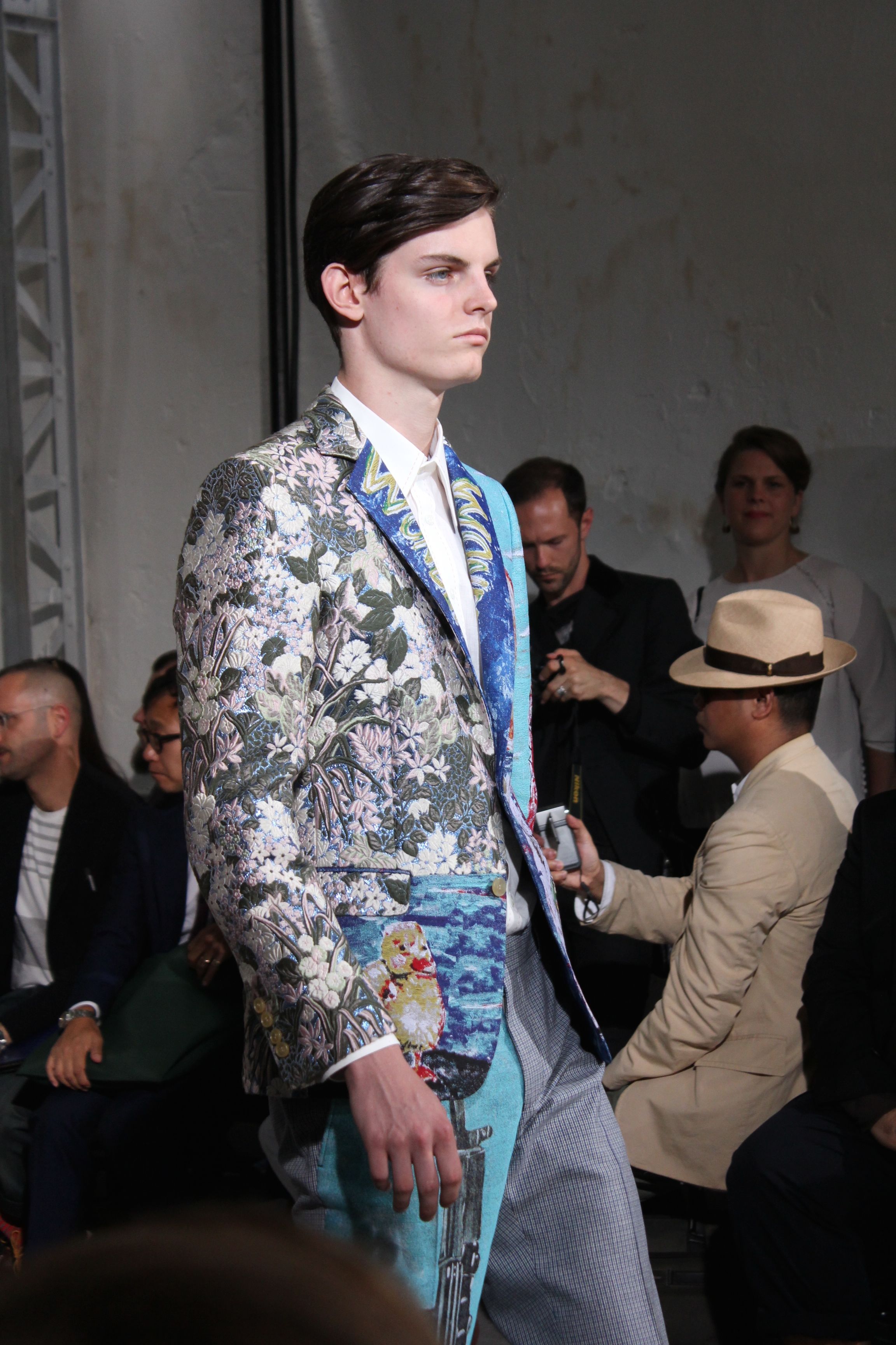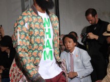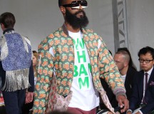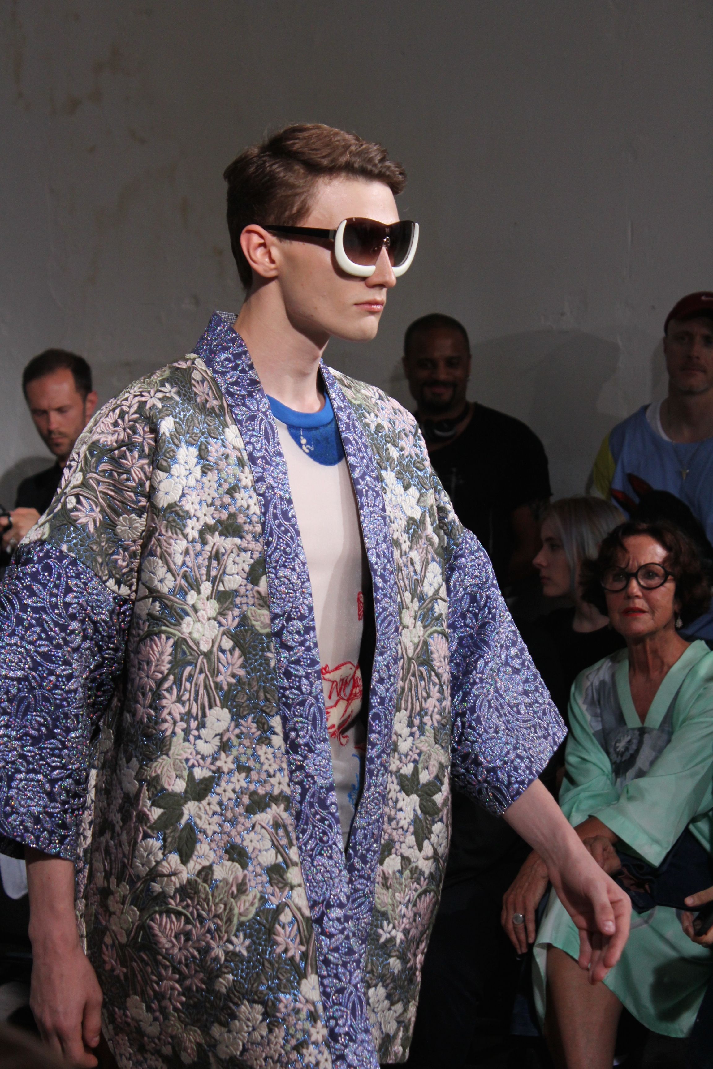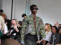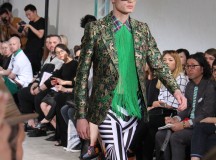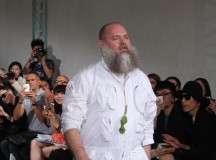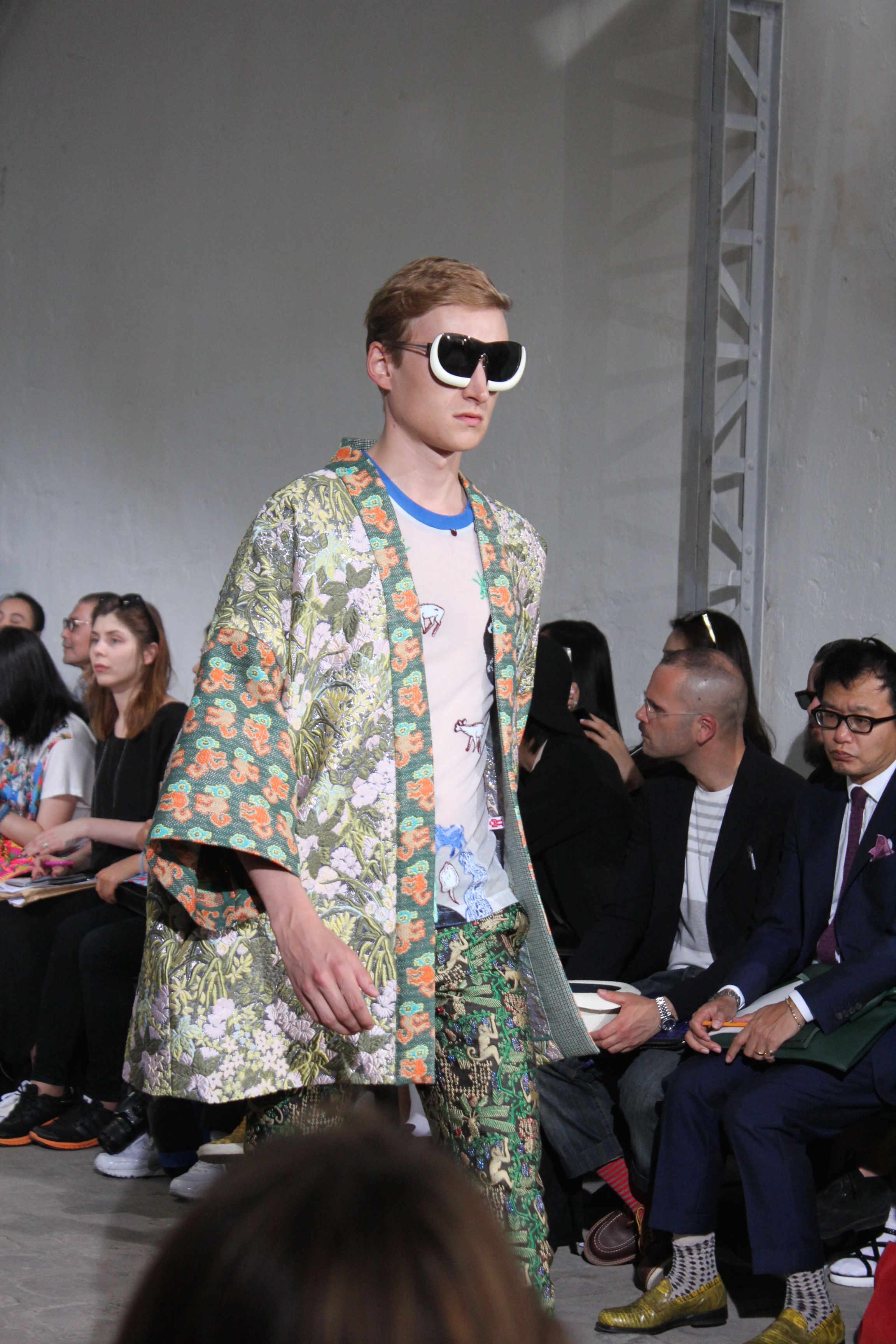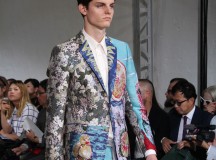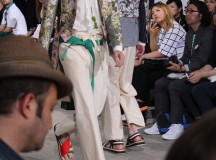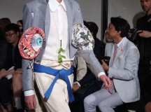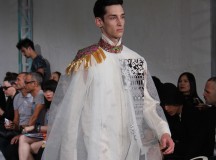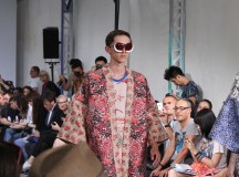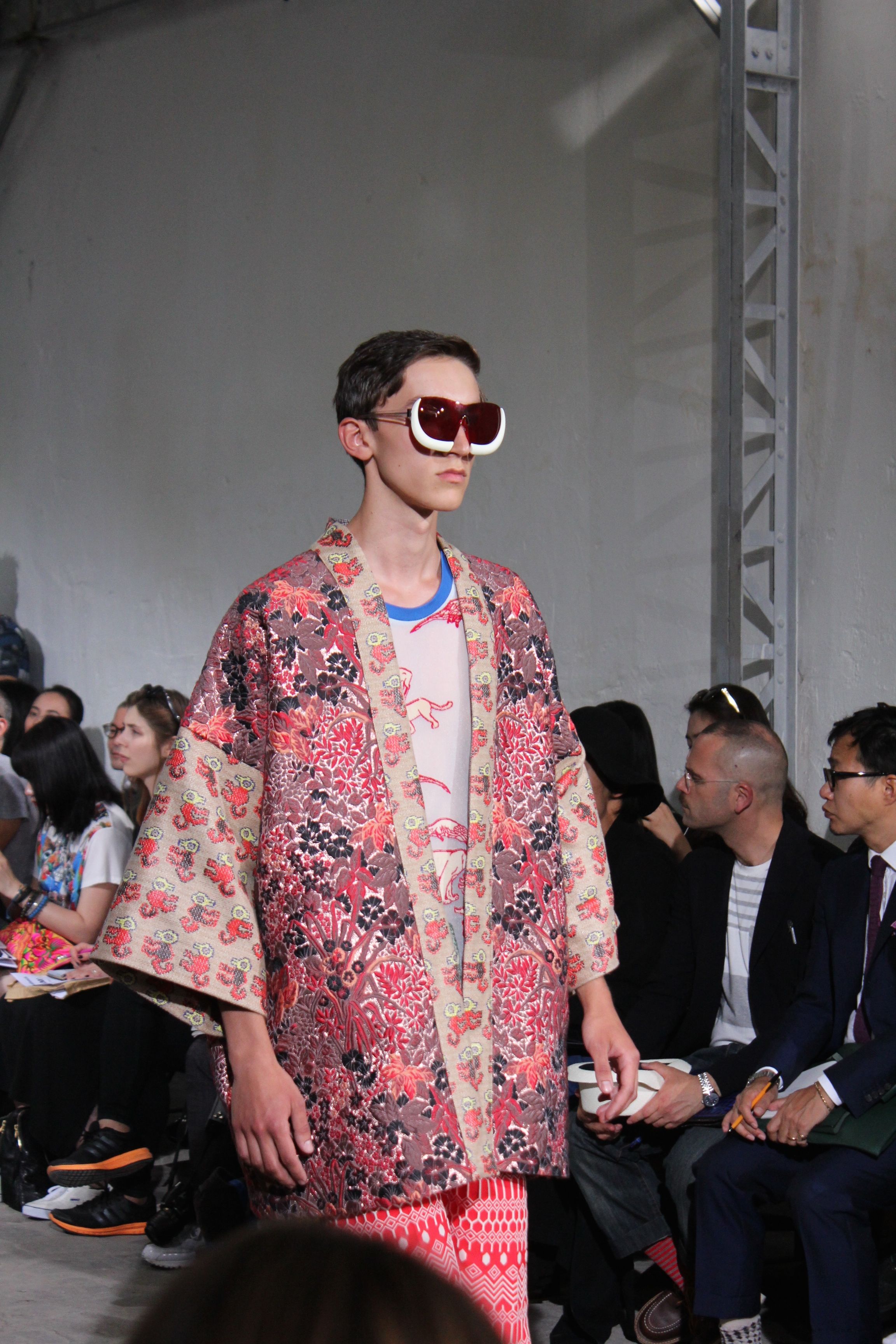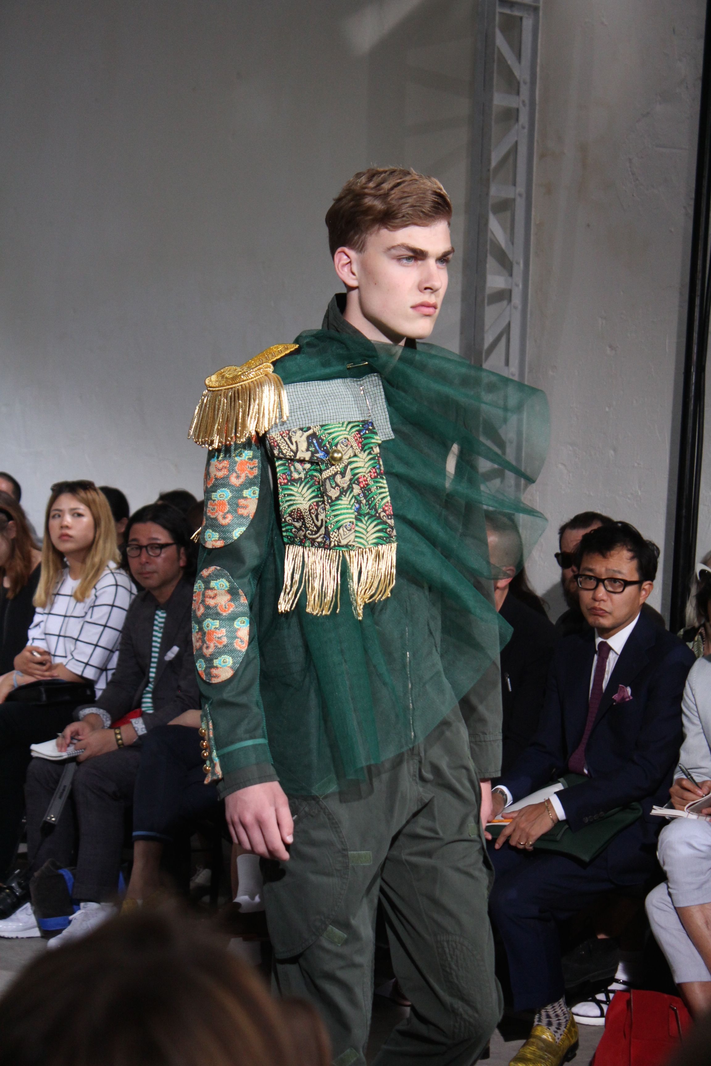 Romantisme et allure conquérante chez Walter Van Beirendonck…Chaque collection de Walter Van Beirendonck est construite au-delà du vêtement. Le créateur anversois profite du défilé pour divulguer des messages sur le monde qui l’entoure, se reflétant sur directement sur son vestiaire. Le dandy romantique prend des allures de conquérant. Les vestes et queues de pie sont construites pour se décomposer grâce à des boutons pression. Les ceintures comme les vestes kimonos et les pantalons amples sont inspirés du monde du judo. Le surfeur tel qu’il est vu par Walter, arrive en fuseau ou combinaison graphique et colorée. On retrouve les essentiels du créateur comme les combinaisons de travailleurs ou les tee-shirts amples. Le travail sur les matières – des brocards aux cotons épais – reste le point de départ, jusqu’à ses peintures imprimées réalisées par l’artiste Scooter Laforge.