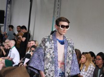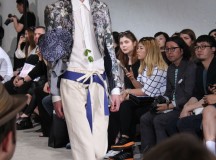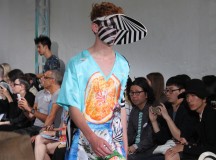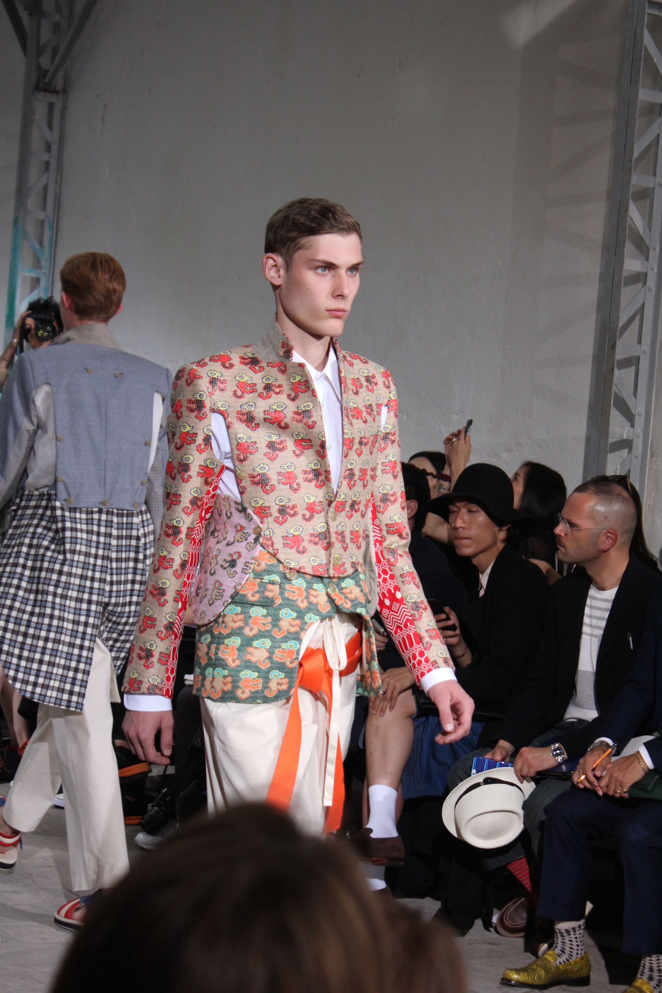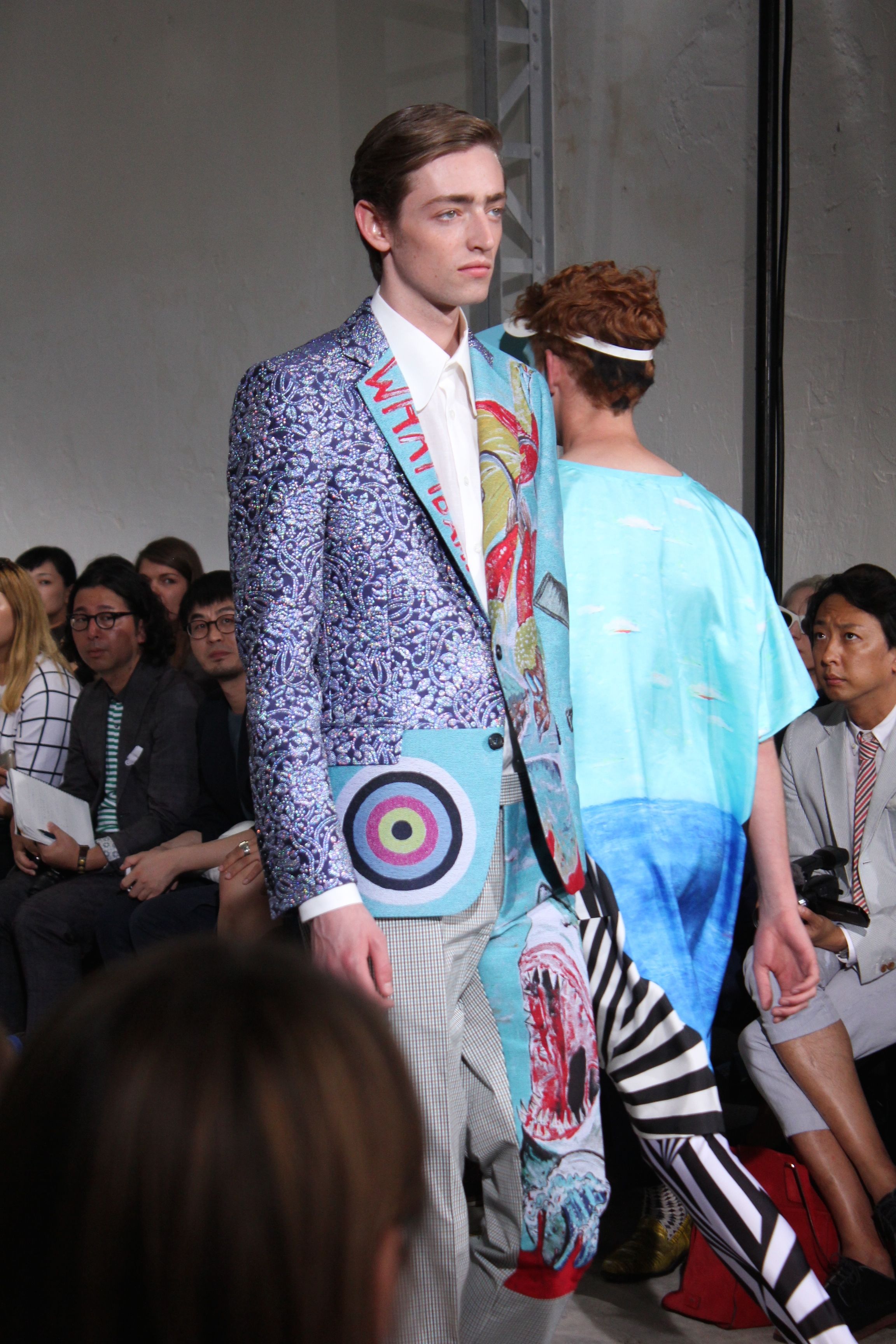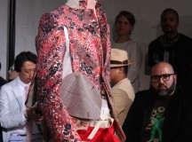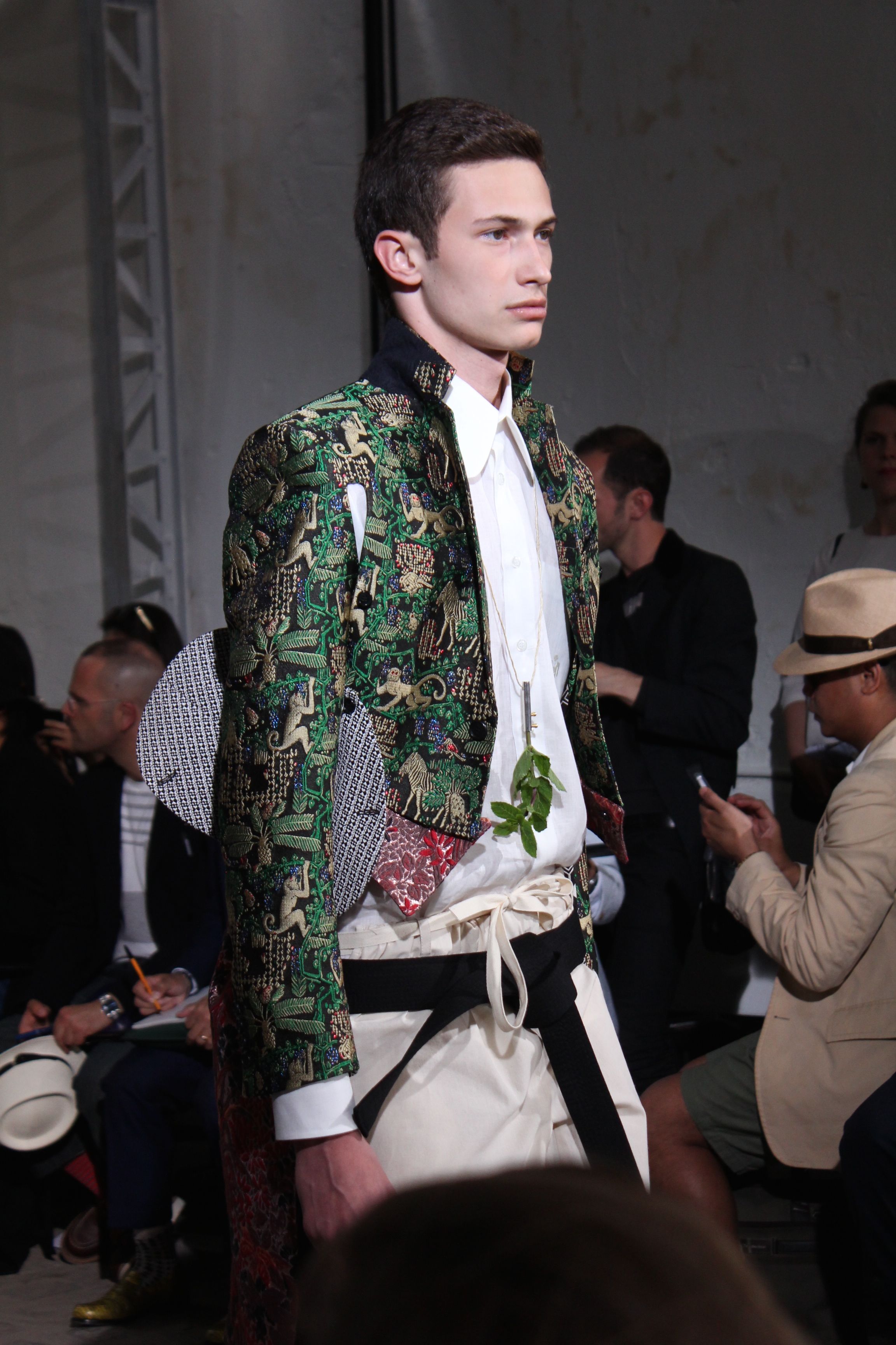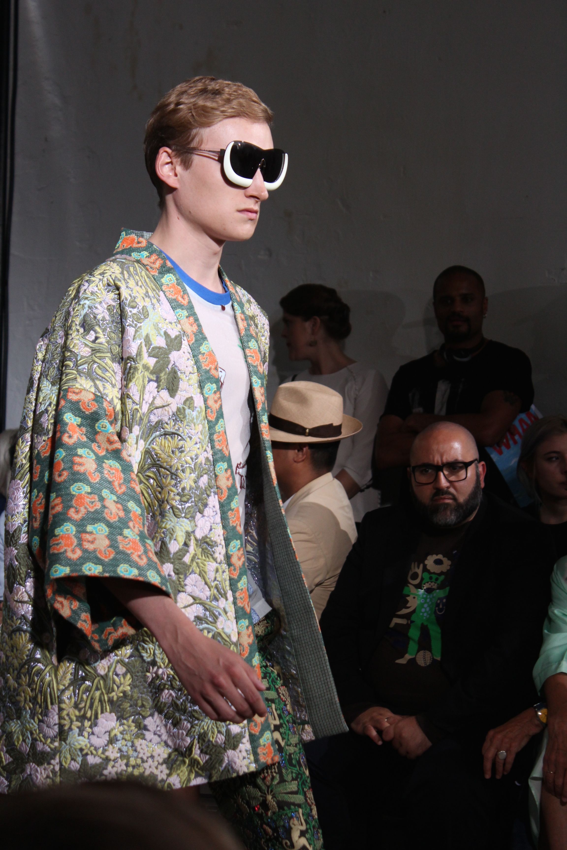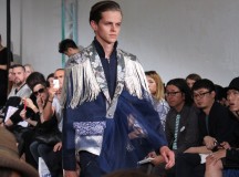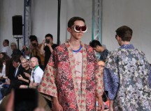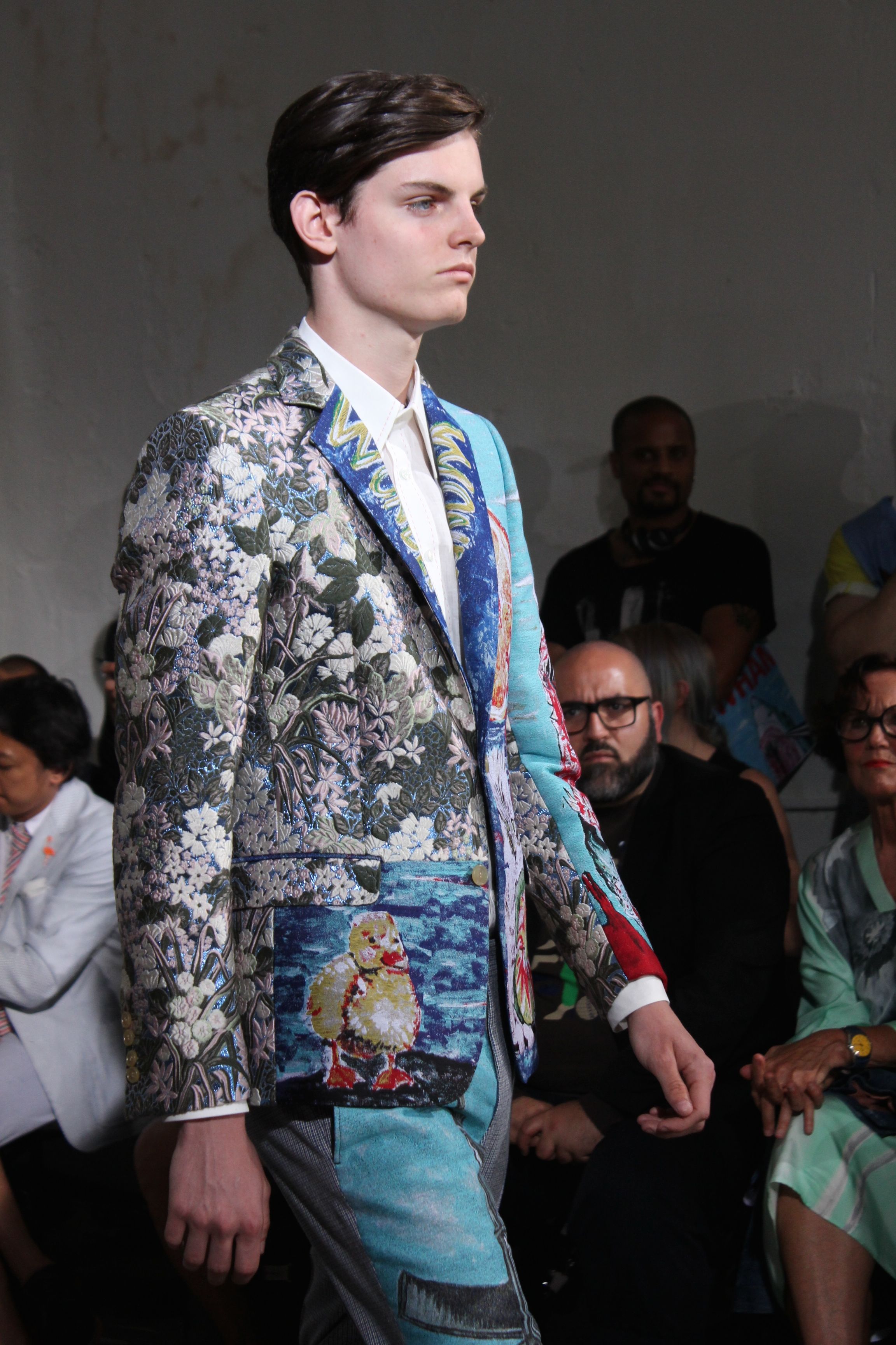 Romantisme et allure conquérante chez Walter Van Beirendonck…Chaque collection de Walter Van Beirendonck est construite au-delà du vêtement. Le créateur anversois profite du défilé pour divulguer des messages sur le monde qui l’entoure, se reflétant sur directement sur son vestiaire. Le dandy romantique prend des allures de conquérant. Les vestes et queues de pie sont construites pour se décomposer grâce à des boutons pression. Les ceintures comme les vestes kimonos et les pantalons amples sont inspirés du monde du judo. Le surfeur tel qu’il est vu par Walter, arrive en fuseau ou combinaison graphique et colorée. On retrouve les essentiels du créateur comme les combinaisons de travailleurs ou les tee-shirts amples. Le travail sur les matières – des brocards aux cotons épais – reste le point de départ, jusqu’à ses peintures imprimées réalisées par l’artiste Scooter Laforge.