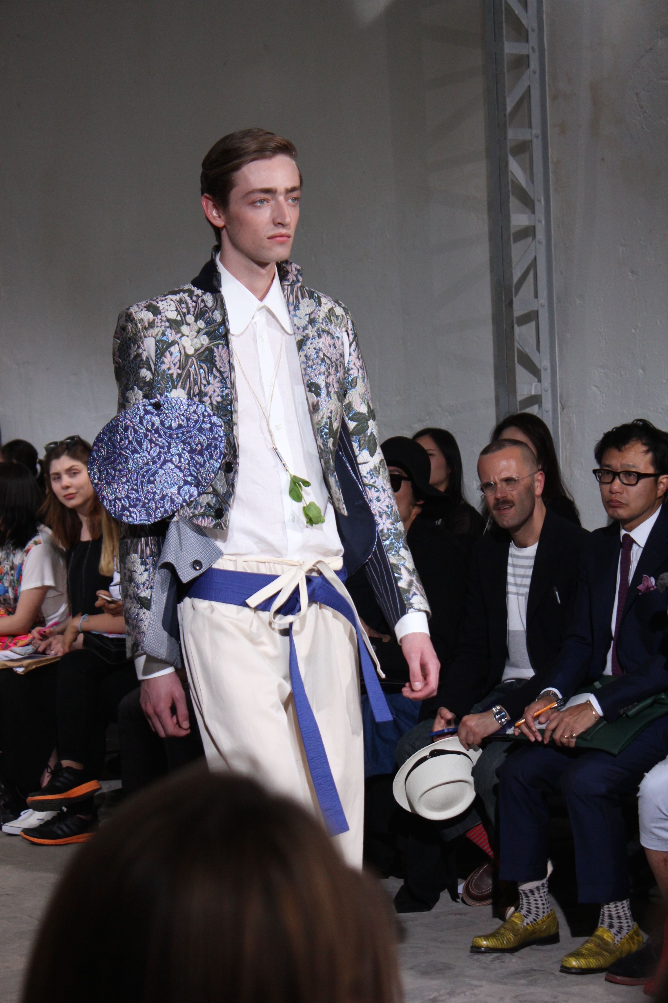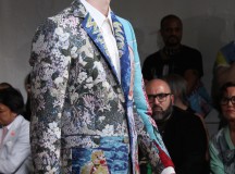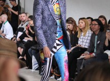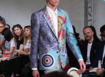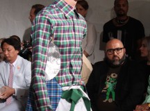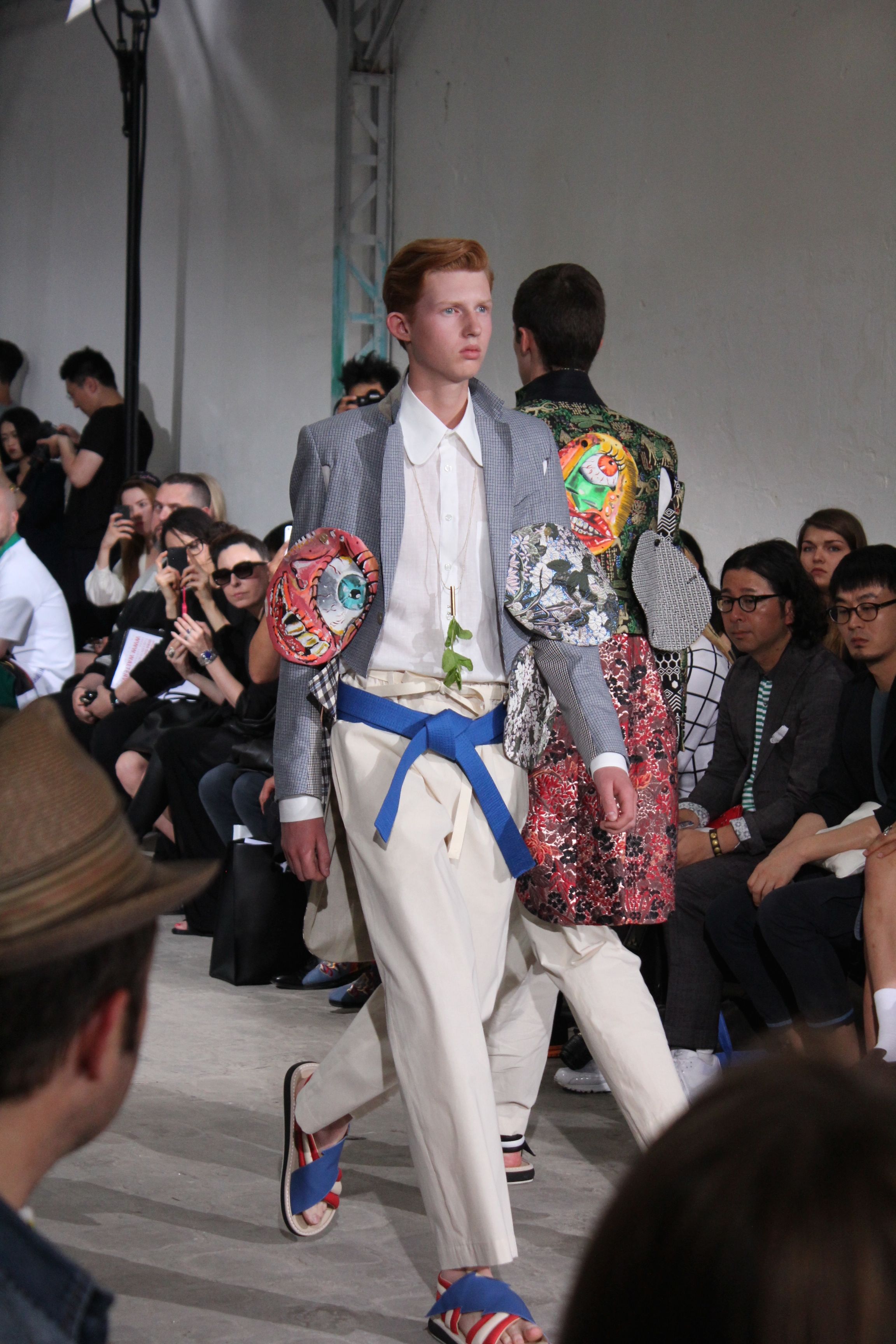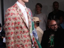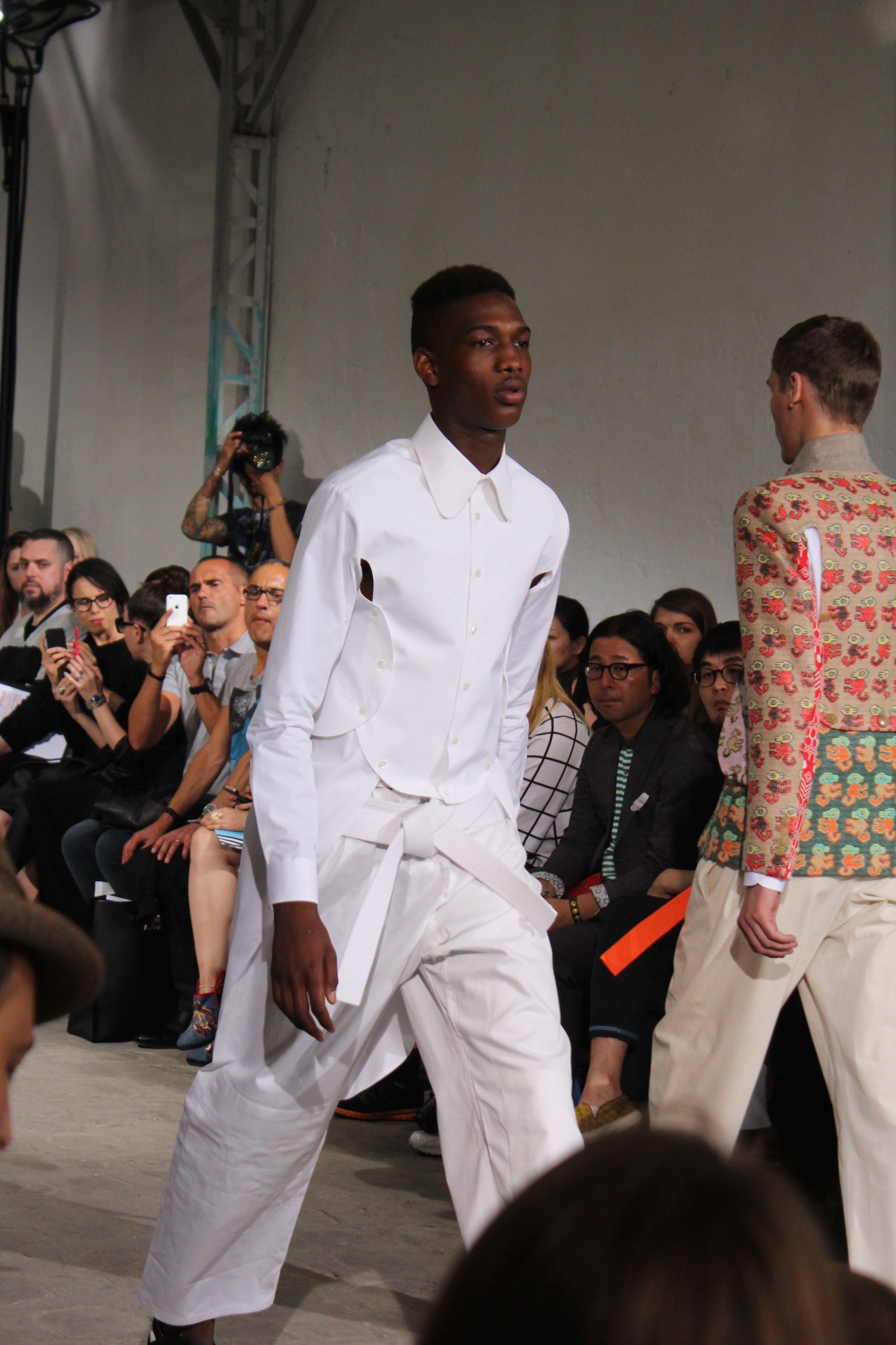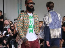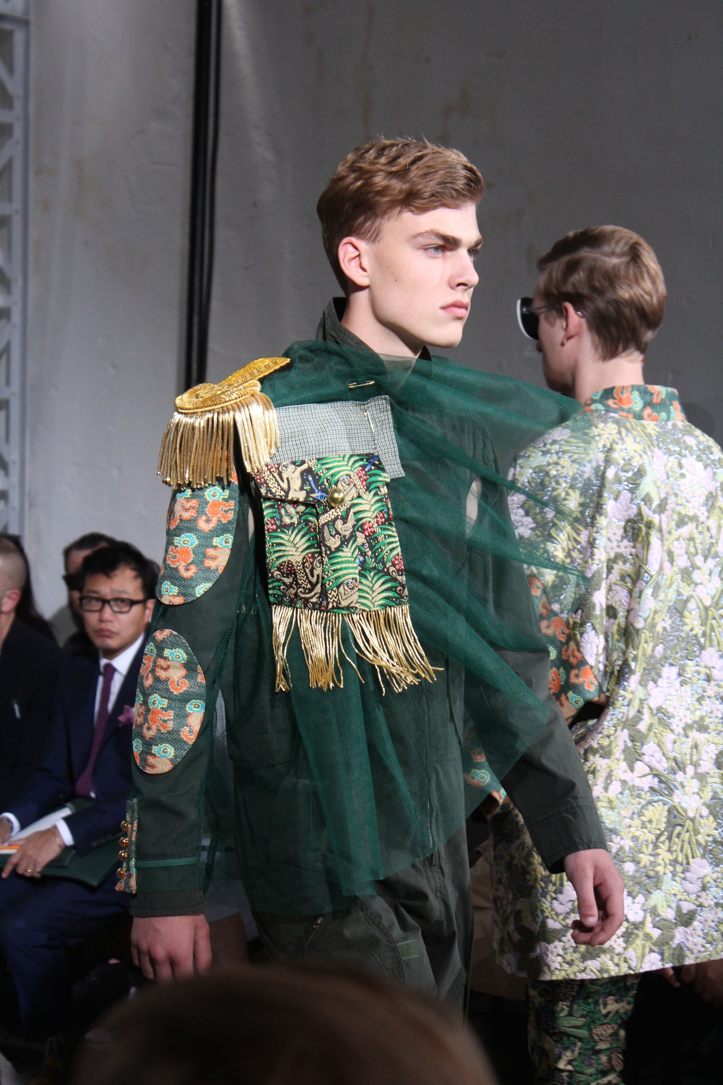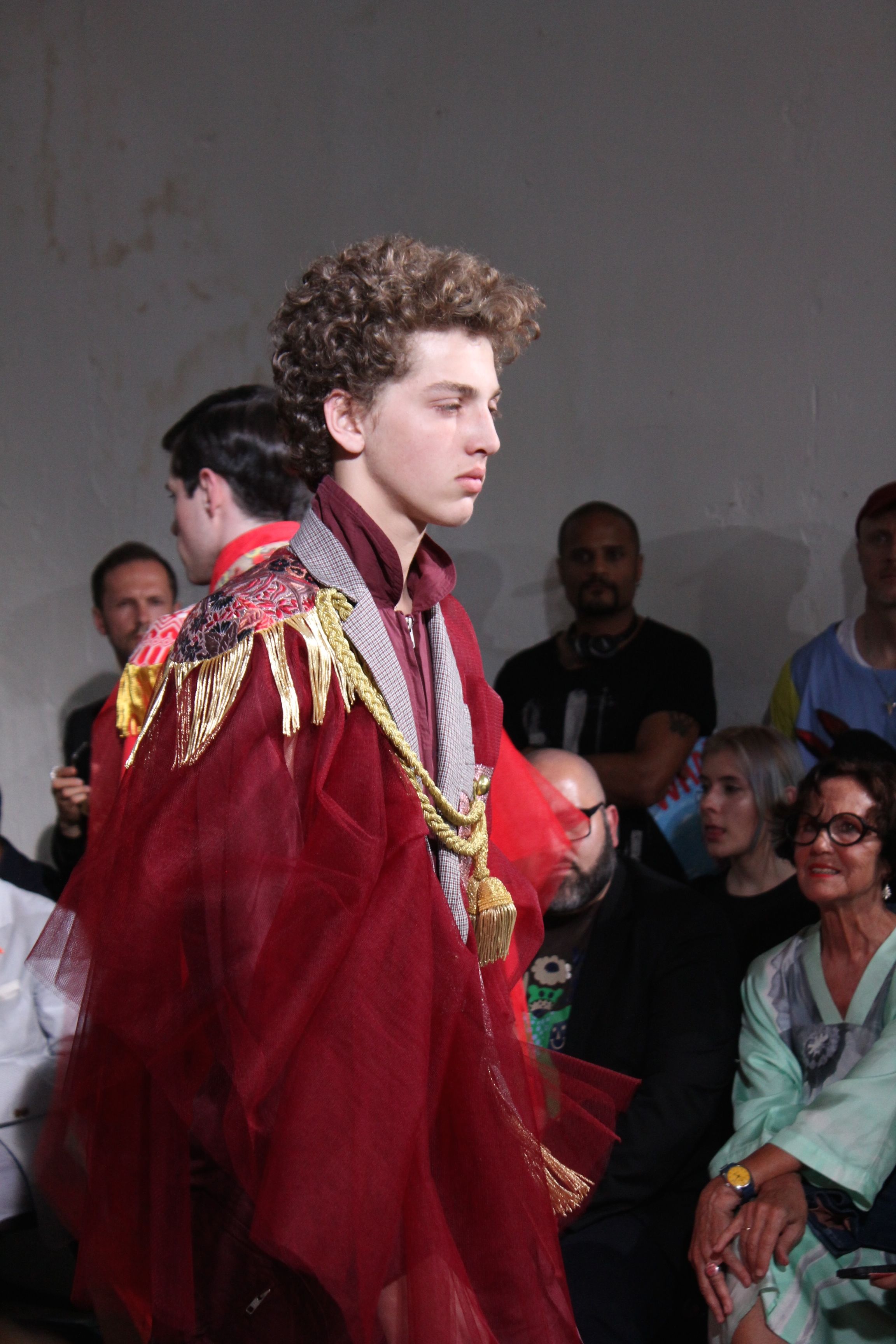 Romantisme et allure conquérante chez Walter Van Beirendonck…Chaque collection de Walter Van Beirendonck est construite au-delà du vêtement. Le créateur anversois profite du défilé pour divulguer des messages sur le monde qui l’entoure, se reflétant sur directement sur son vestiaire. Le dandy romantique prend des allures de conquérant. Les vestes et queues de pie sont construites pour se décomposer grâce à des boutons pression. Les ceintures comme les vestes kimonos et les pantalons amples sont inspirés du monde du judo. Le surfeur tel qu’il est vu par Walter, arrive en fuseau ou combinaison graphique et colorée. On retrouve les essentiels du créateur comme les combinaisons de travailleurs ou les tee-shirts amples. Le travail sur les matières – des brocards aux cotons épais – reste le point de départ, jusqu’à ses peintures imprimées réalisées par l’artiste Scooter Laforge.