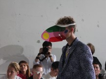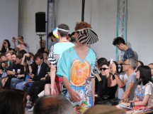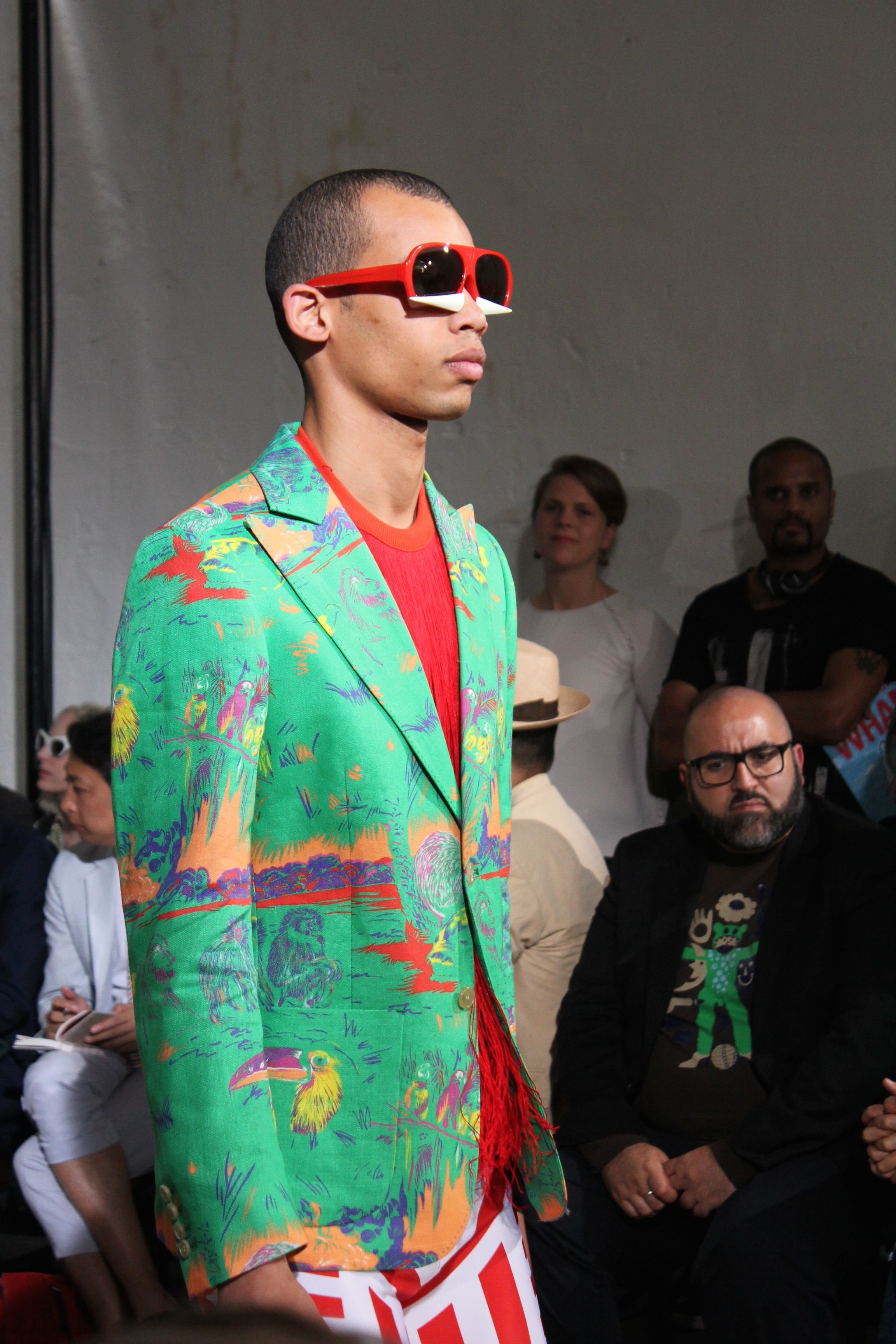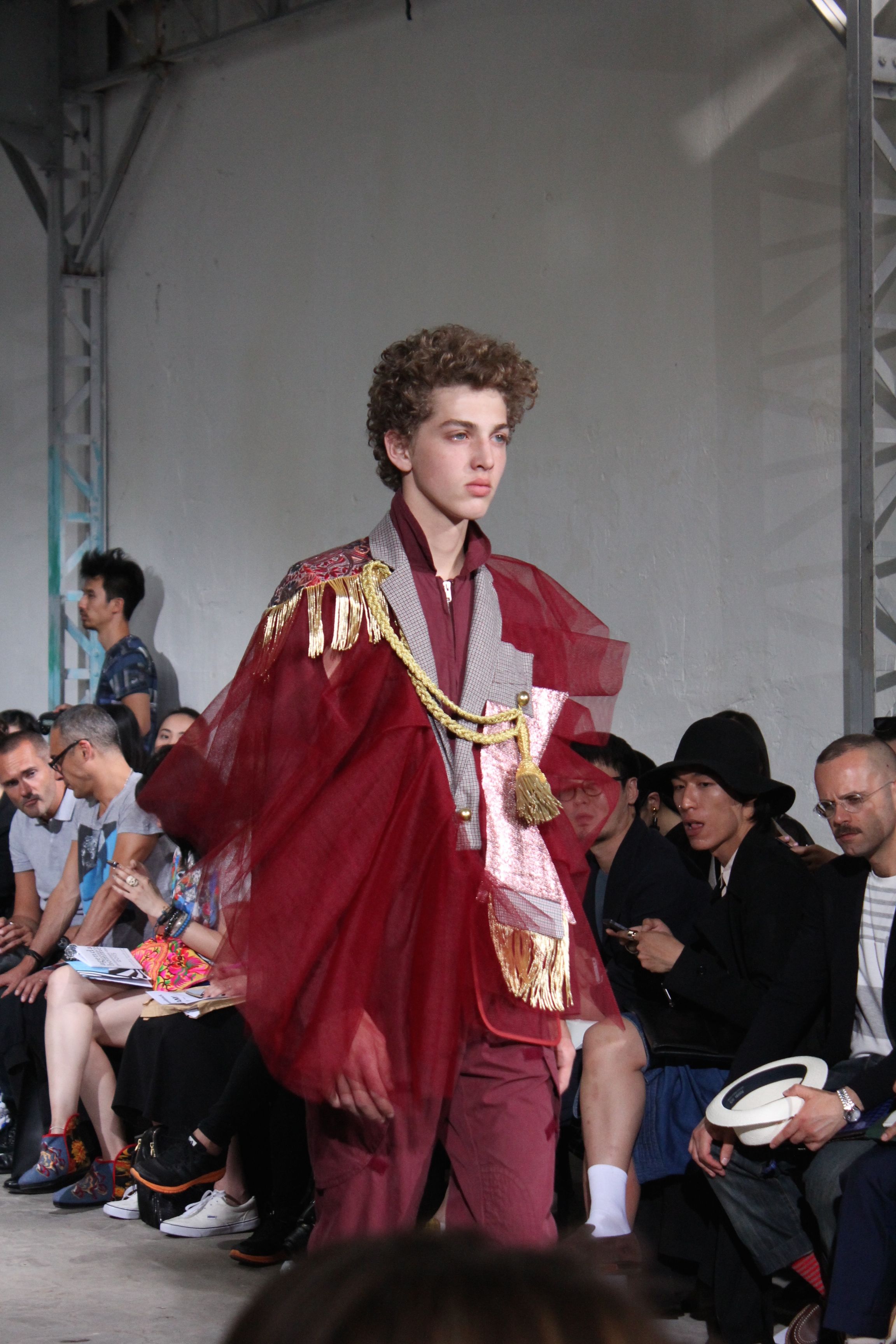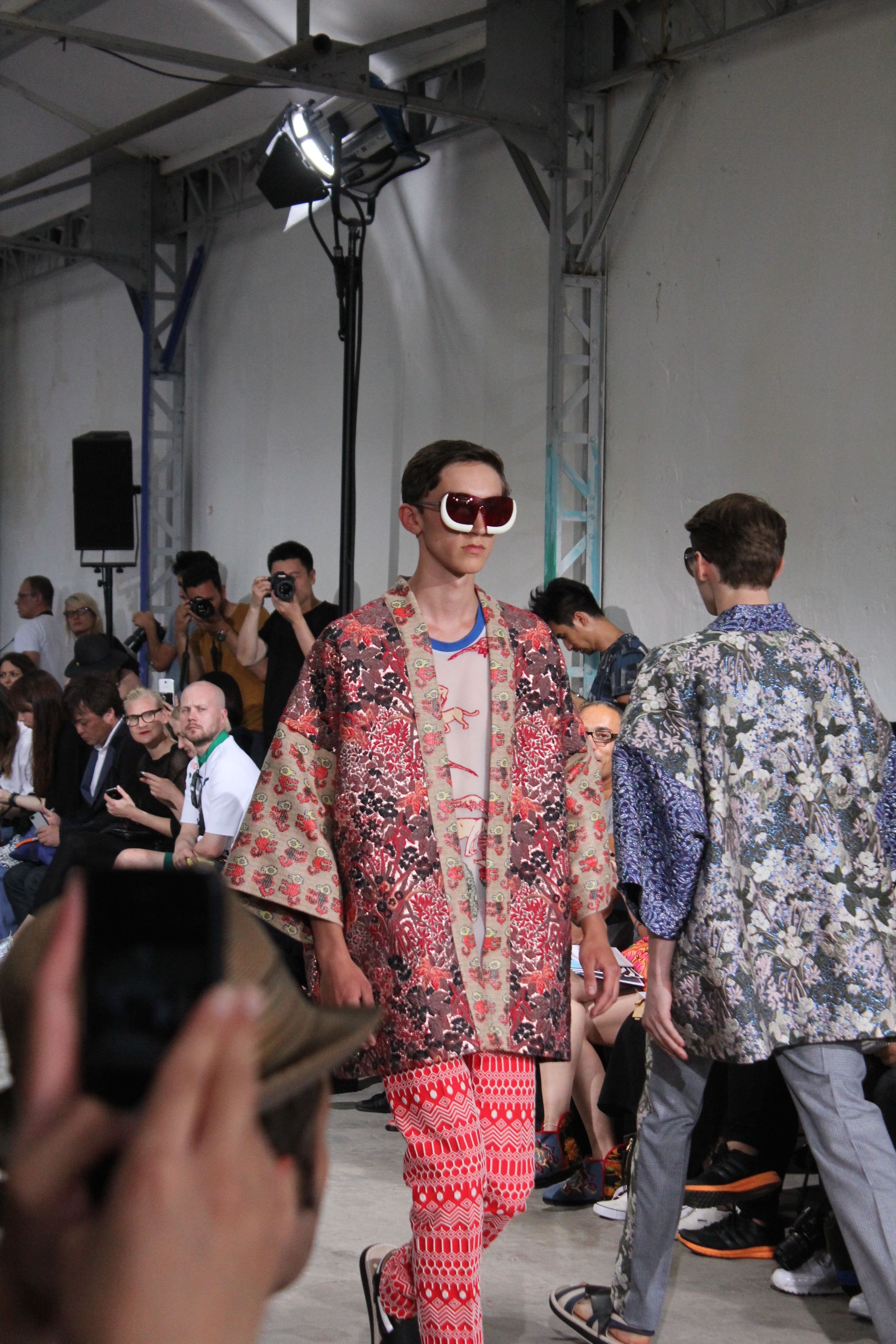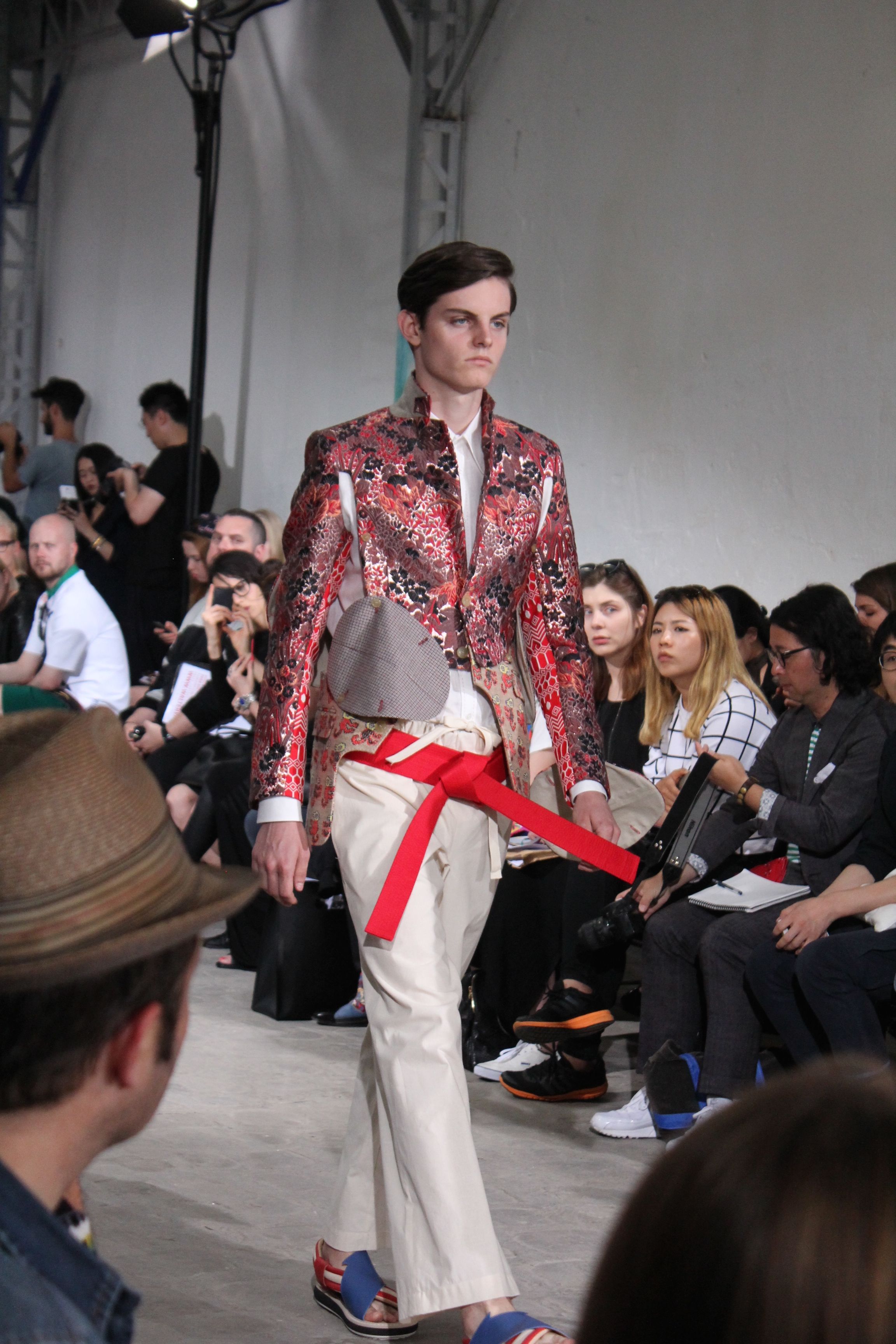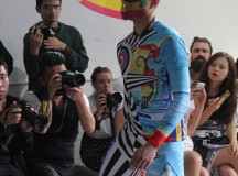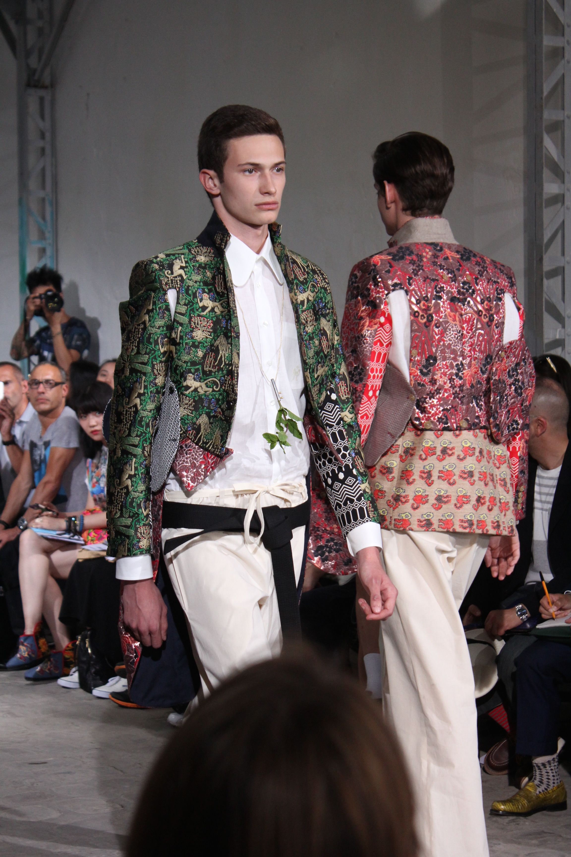 Romantisme et allure conquérante chez Walter Van Beirendonck…Chaque collection de Walter Van Beirendonck est construite au-delà du vêtement. Le créateur anversois profite du défilé pour divulguer des messages sur le monde qui l’entoure, se reflétant sur directement sur son vestiaire. Le dandy romantique prend des allures de conquérant. Les vestes et queues de pie sont construites pour se décomposer grâce à des boutons pression. Les ceintures comme les vestes kimonos et les pantalons amples sont inspirés du monde du judo. Le surfeur tel qu’il est vu par Walter, arrive en fuseau ou combinaison graphique et colorée. On retrouve les essentiels du créateur comme les combinaisons de travailleurs ou les tee-shirts amples. Le travail sur les matières – des brocards aux cotons épais – reste le point de départ, jusqu’à ses peintures imprimées réalisées par l’artiste Scooter Laforge.
