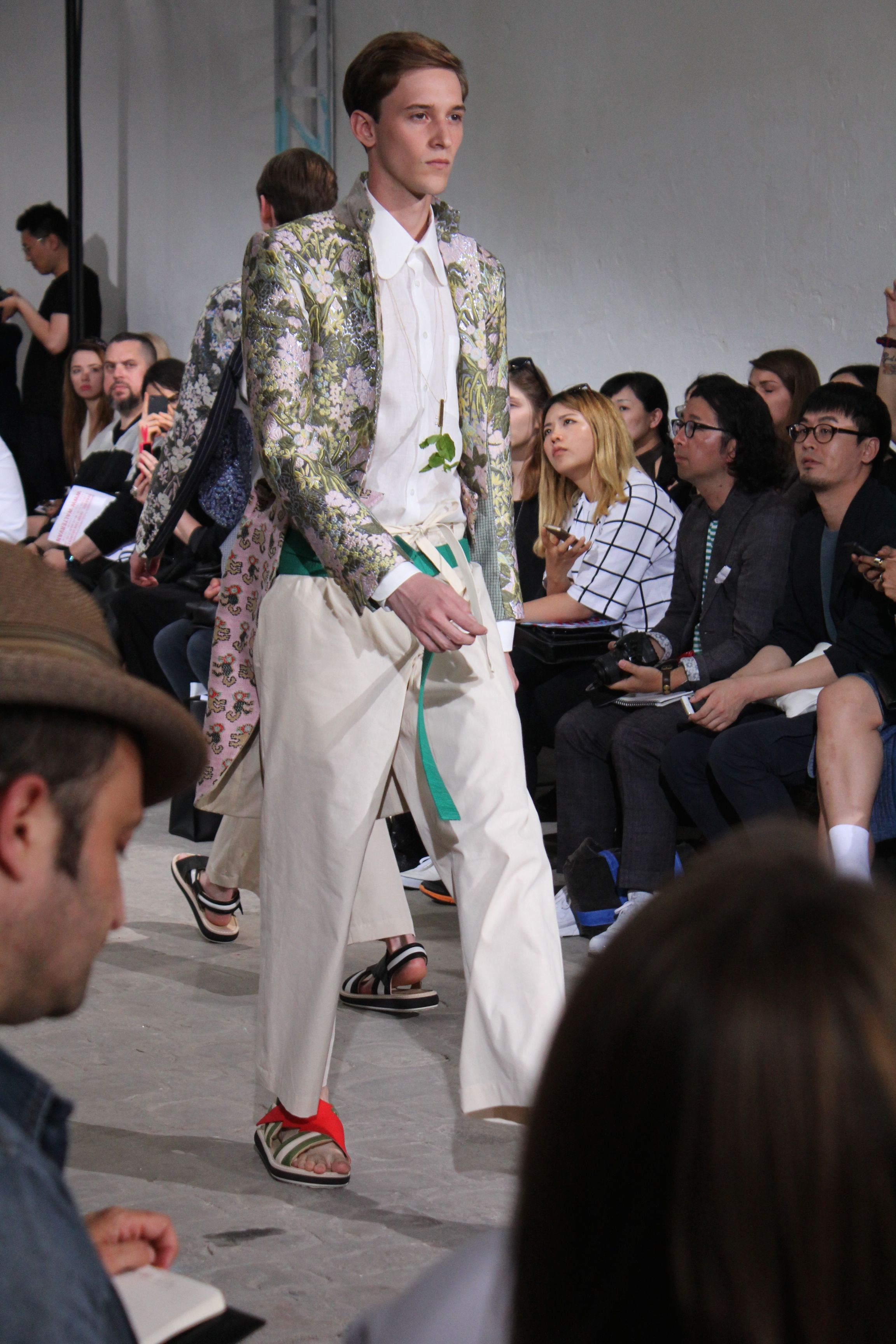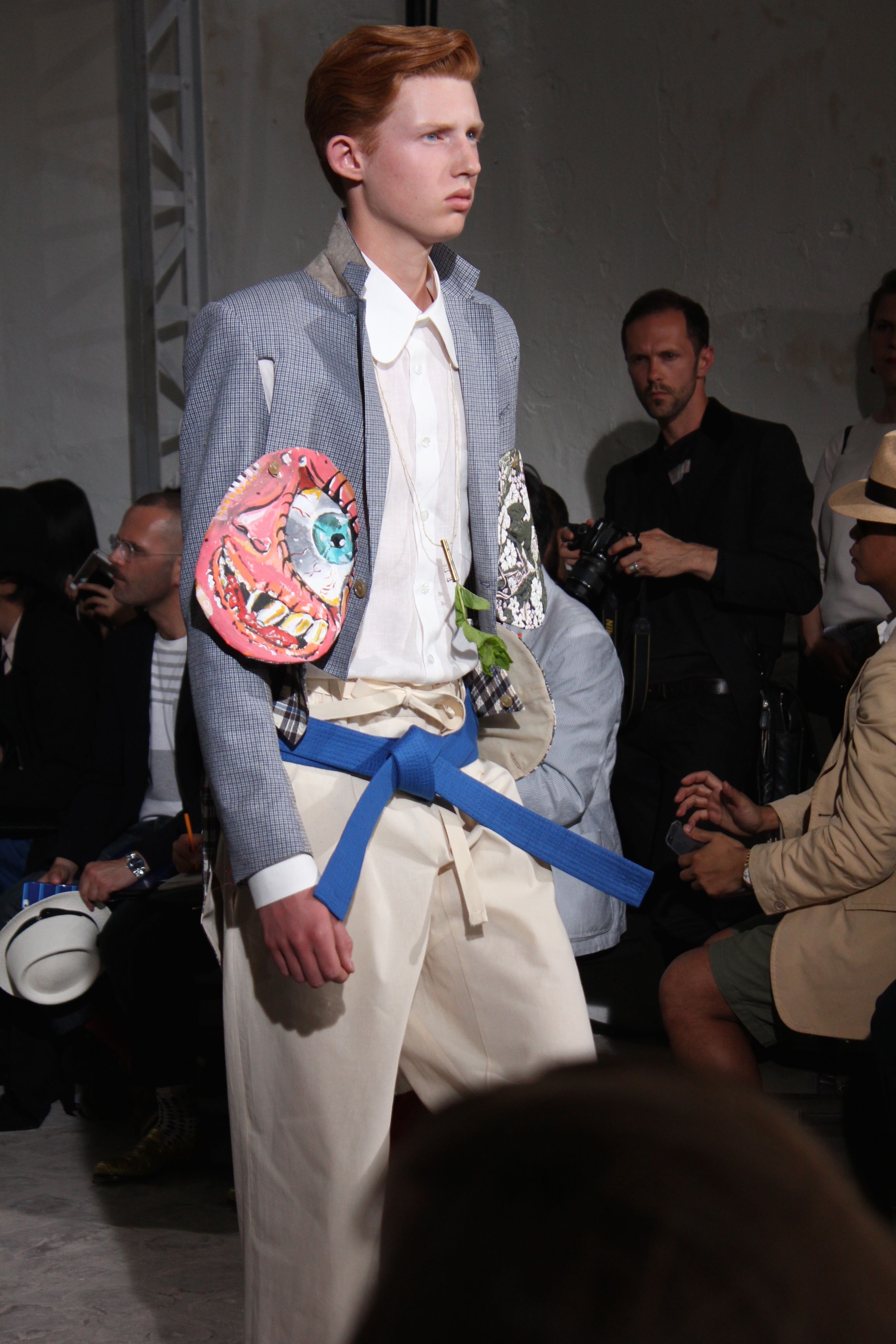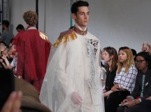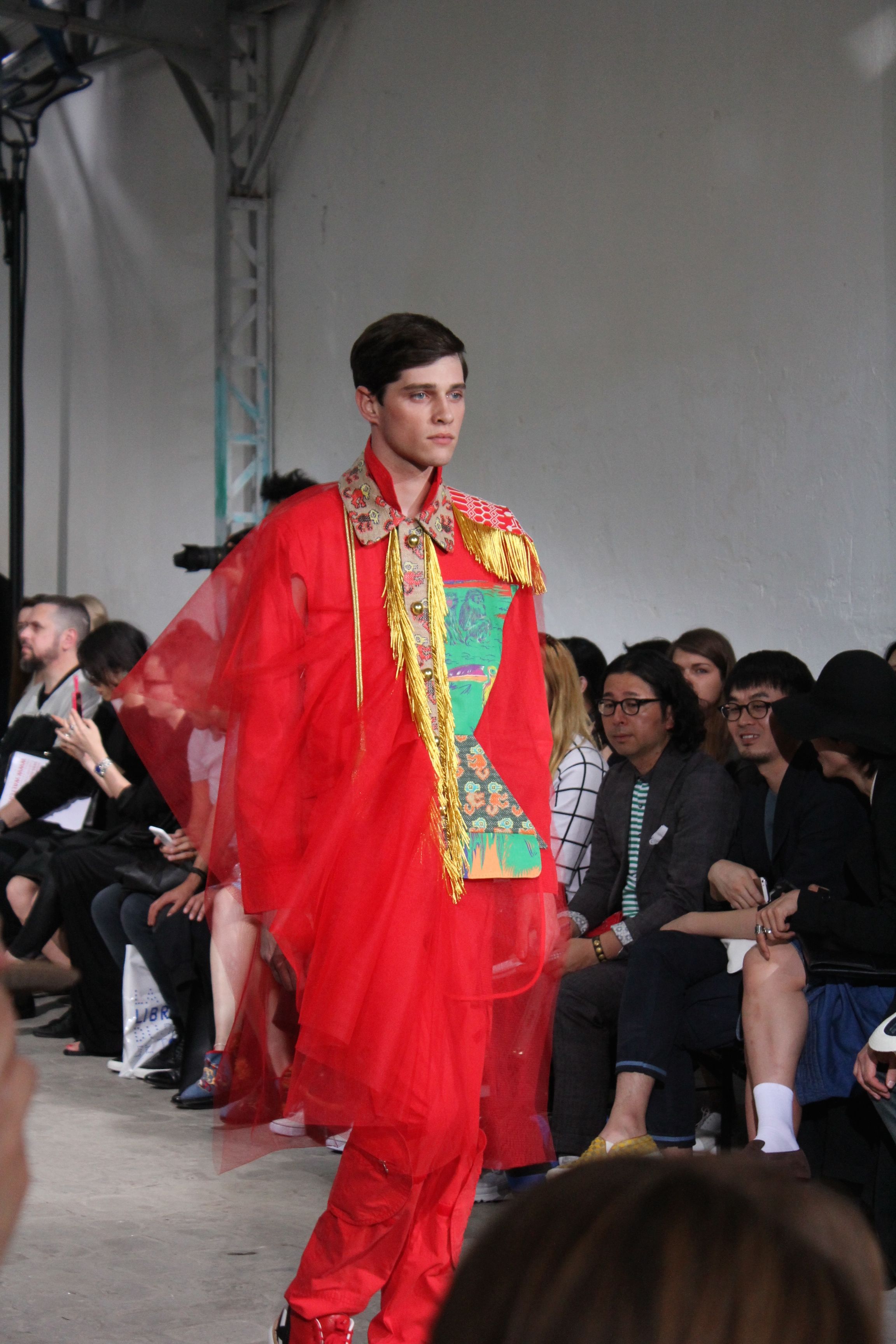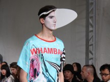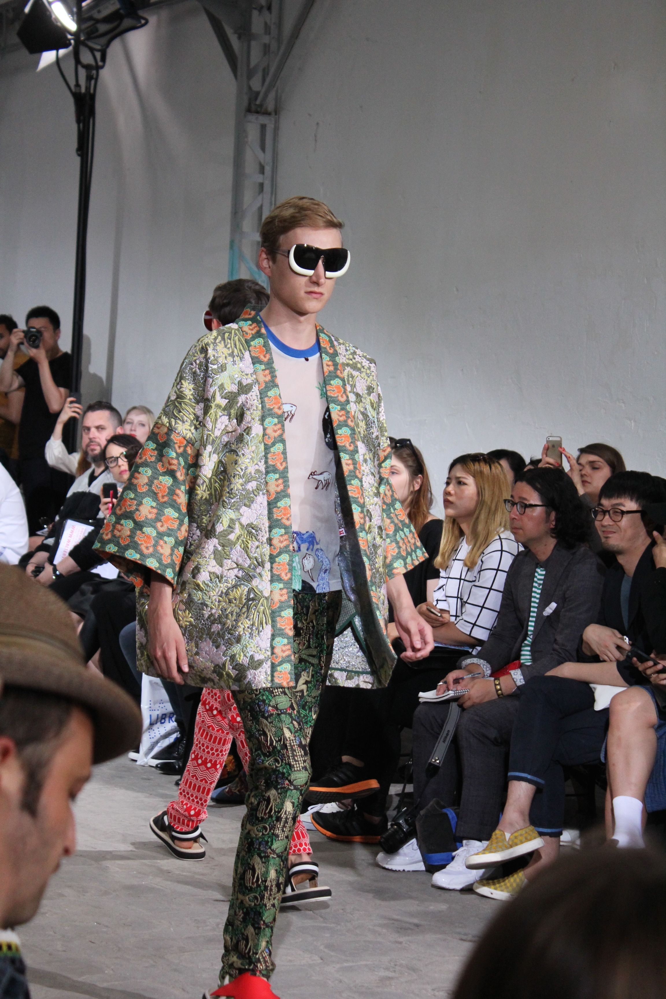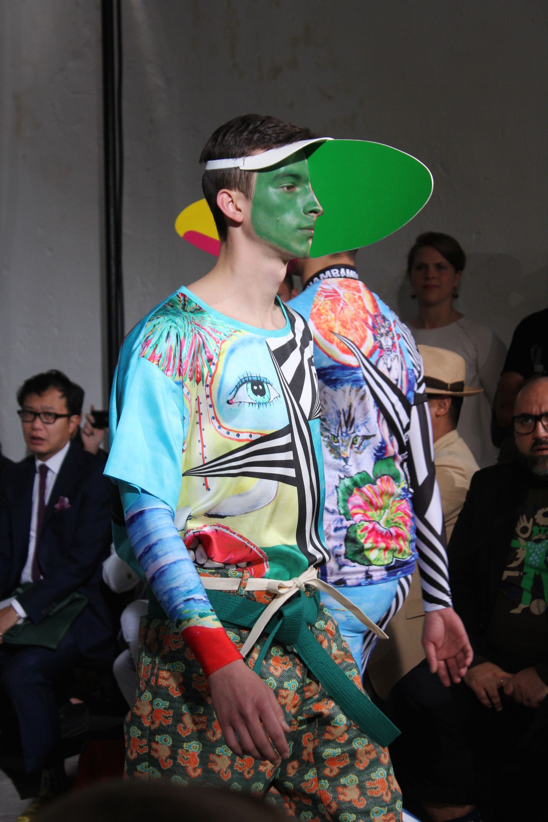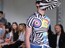 Romantisme et allure conquérante chez Walter Van Beirendonck…Chaque collection de Walter Van Beirendonck est construite au-delà du vêtement. Le créateur anversois profite du défilé pour divulguer des messages sur le monde qui l’entoure, se reflétant sur directement sur son vestiaire. Le dandy romantique prend des allures de conquérant. Les vestes et queues de pie sont construites pour se décomposer grâce à des boutons pression. Les ceintures comme les vestes kimonos et les pantalons amples sont inspirés du monde du judo. Le surfeur tel qu’il est vu par Walter, arrive en fuseau ou combinaison graphique et colorée. On retrouve les essentiels du créateur comme les combinaisons de travailleurs ou les tee-shirts amples. Le travail sur les matières – des brocards aux cotons épais – reste le point de départ, jusqu’à ses peintures imprimées réalisées par l’artiste Scooter Laforge.