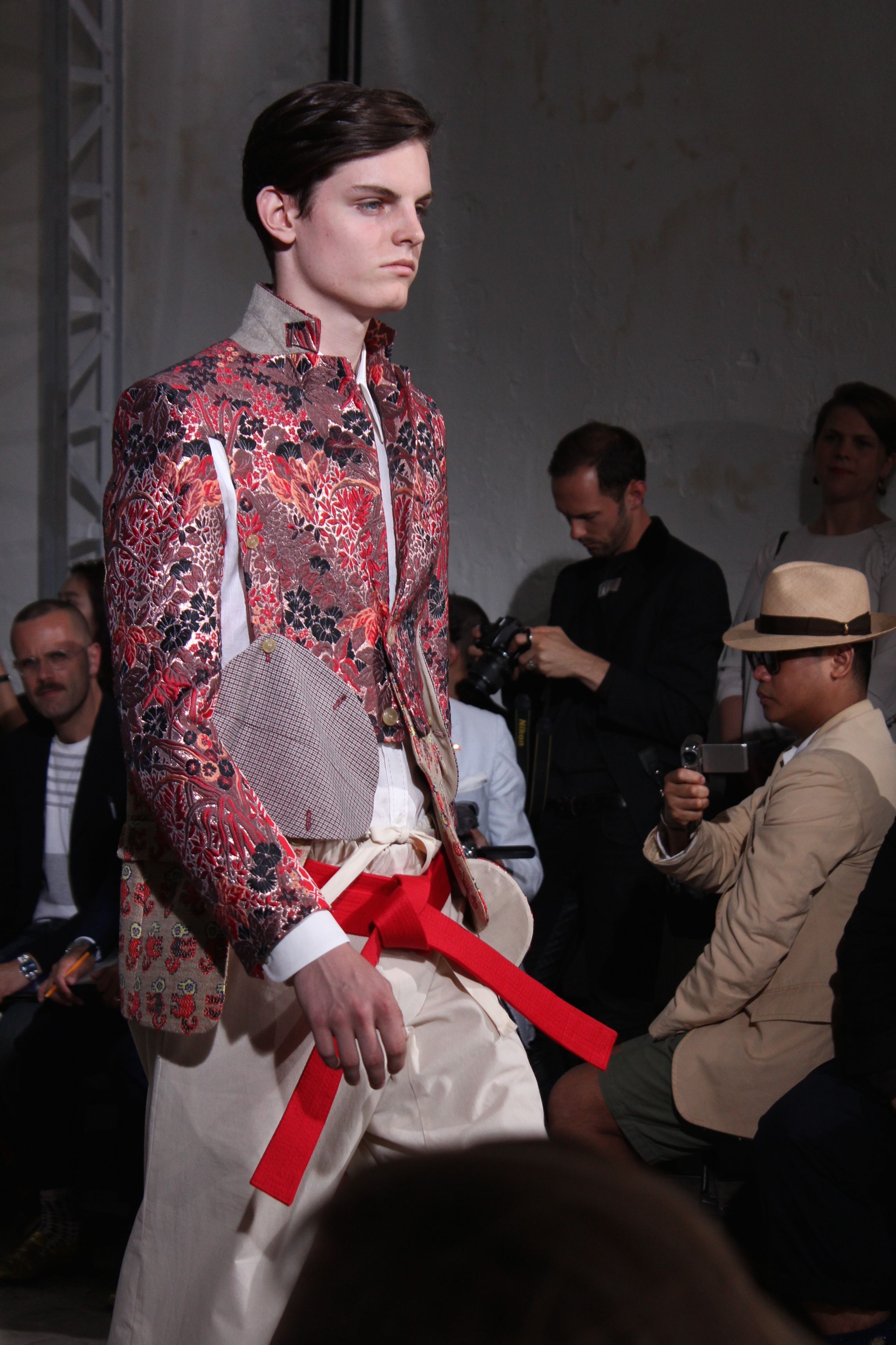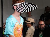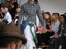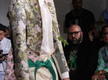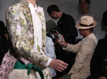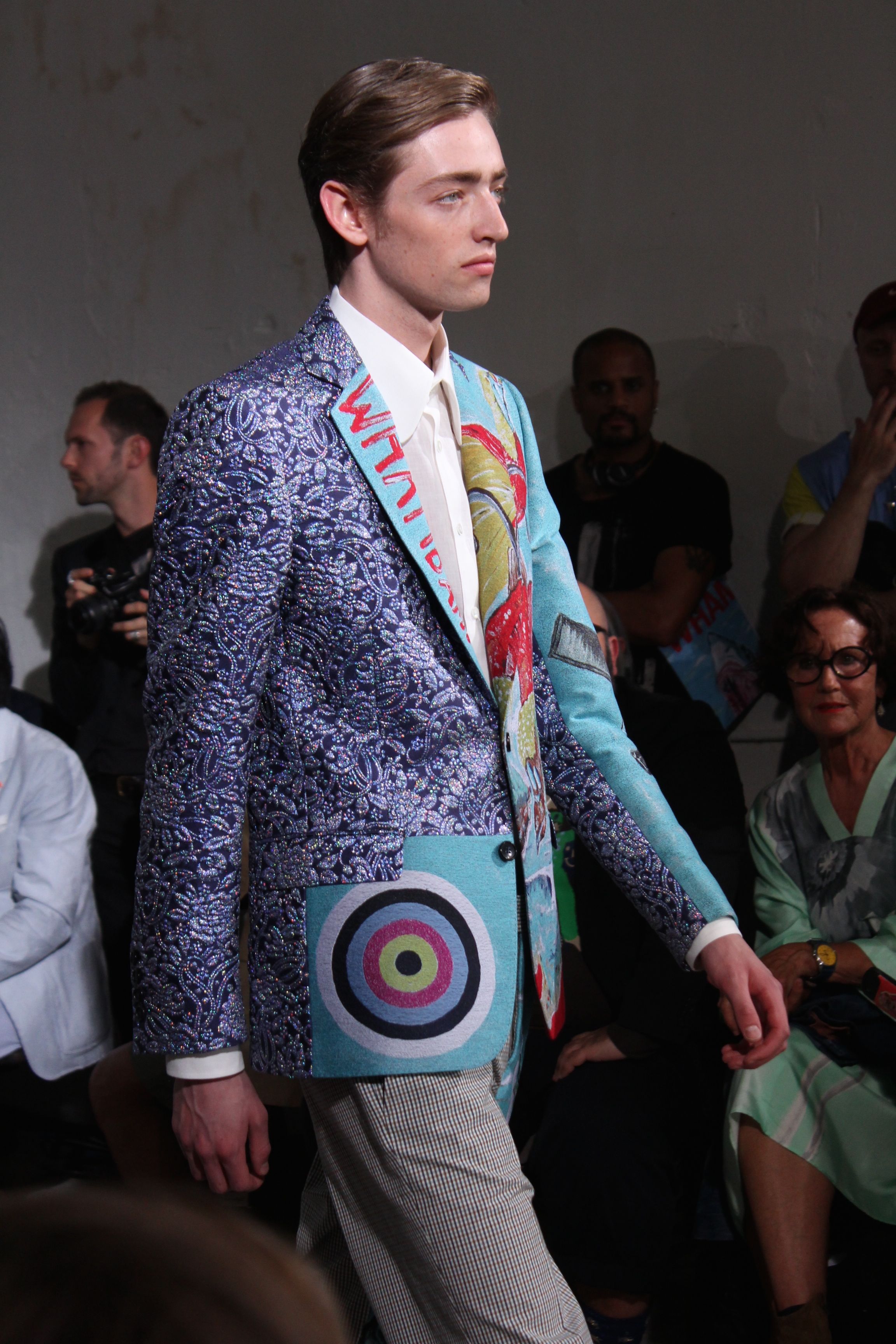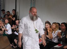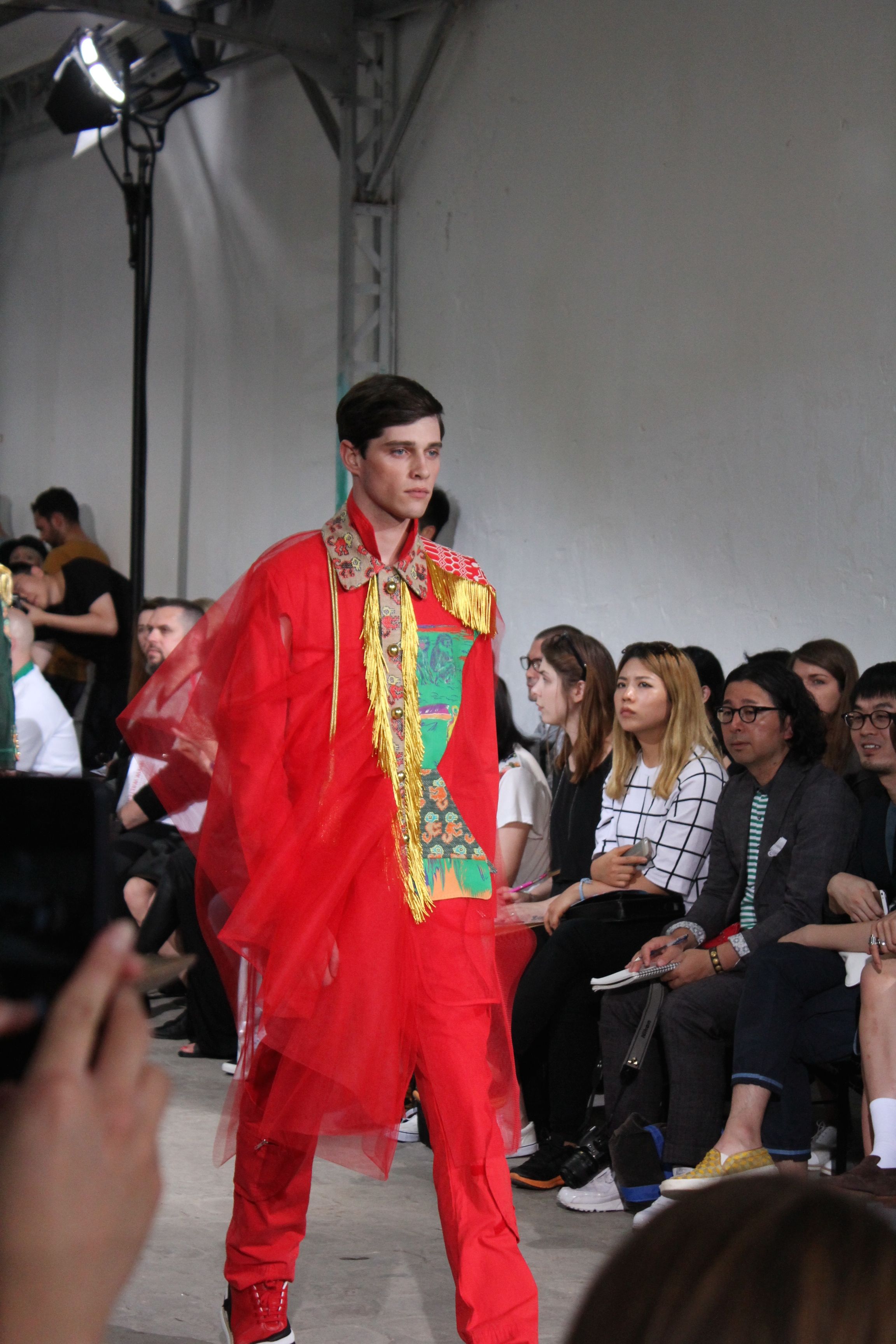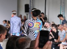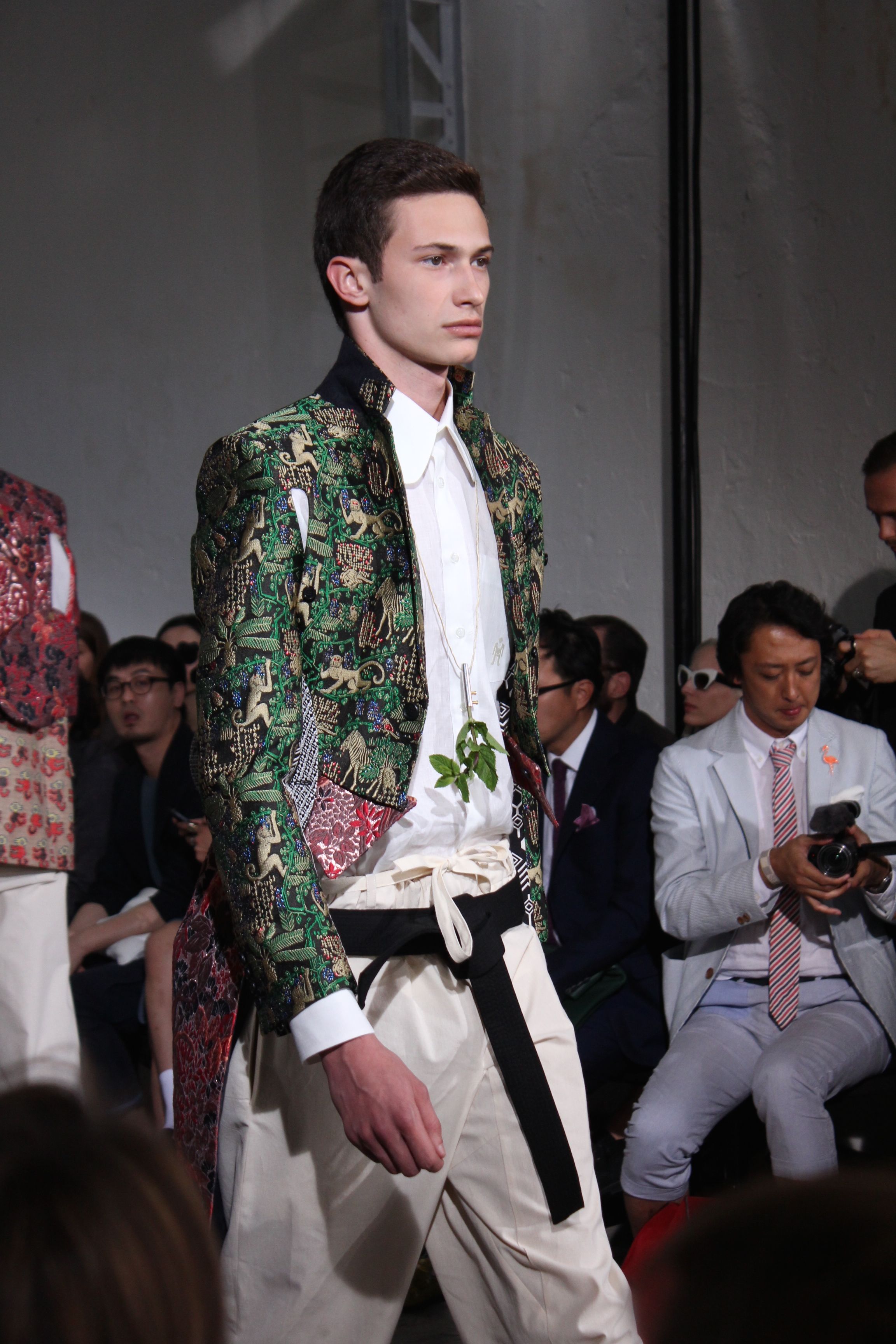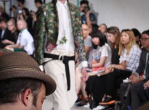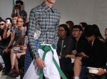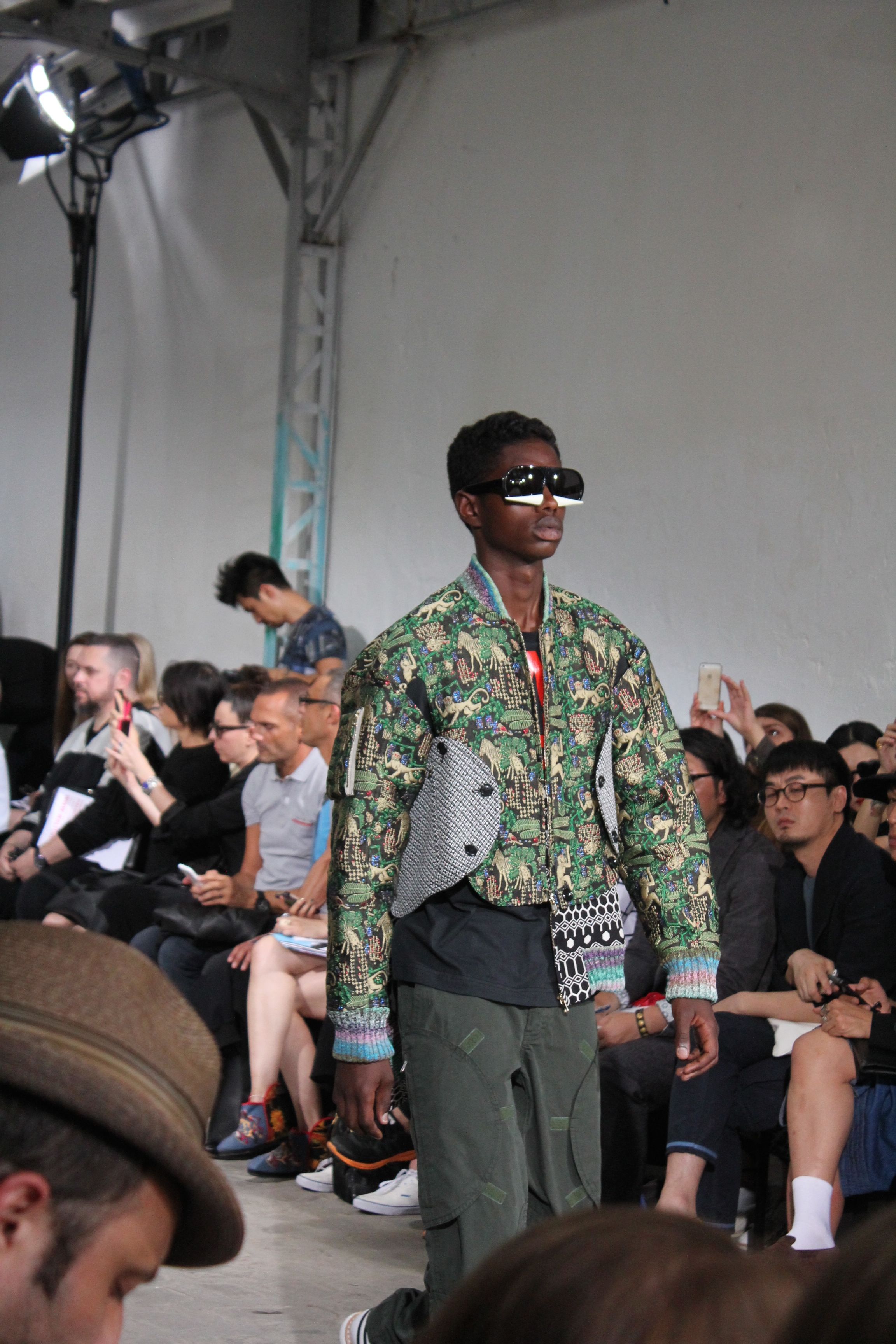 Romantisme et allure conquérante chez Walter Van Beirendonck…Chaque collection de Walter Van Beirendonck est construite au-delà du vêtement. Le créateur anversois profite du défilé pour divulguer des messages sur le monde qui l’entoure, se reflétant sur directement sur son vestiaire. Le dandy romantique prend des allures de conquérant. Les vestes et queues de pie sont construites pour se décomposer grâce à des boutons pression. Les ceintures comme les vestes kimonos et les pantalons amples sont inspirés du monde du judo. Le surfeur tel qu’il est vu par Walter, arrive en fuseau ou combinaison graphique et colorée. On retrouve les essentiels du créateur comme les combinaisons de travailleurs ou les tee-shirts amples. Le travail sur les matières – des brocards aux cotons épais – reste le point de départ, jusqu’à ses peintures imprimées réalisées par l’artiste Scooter Laforge.