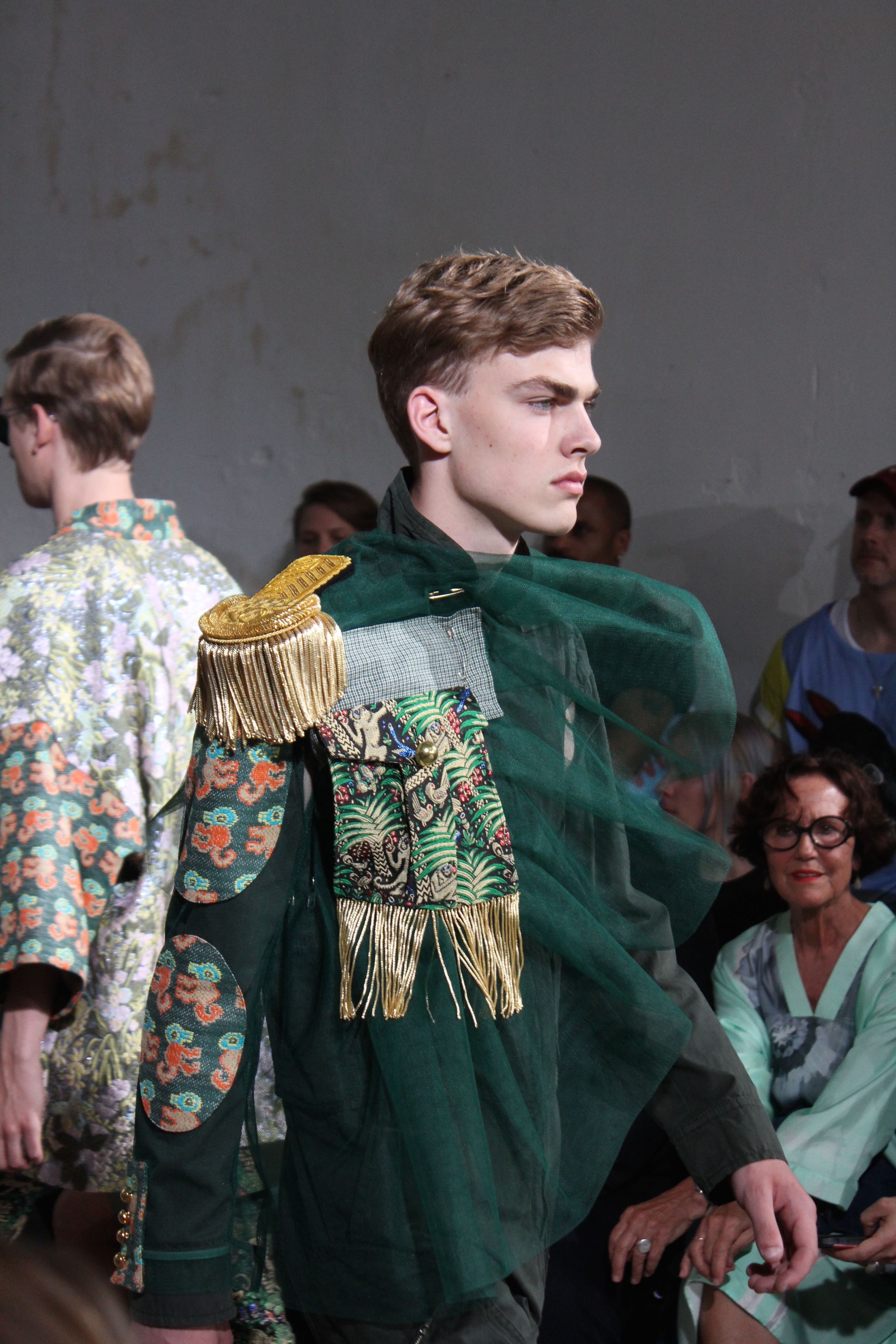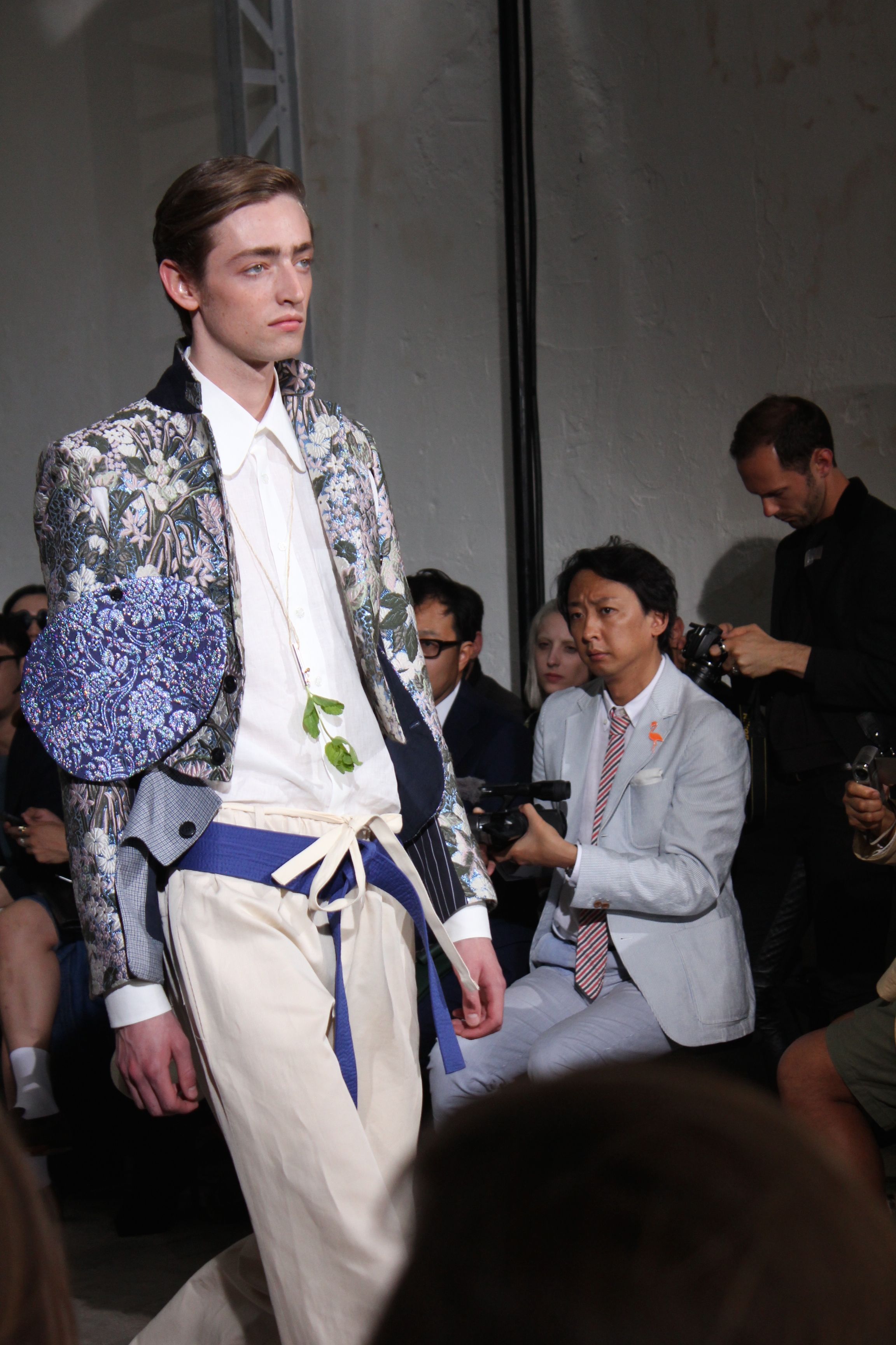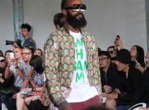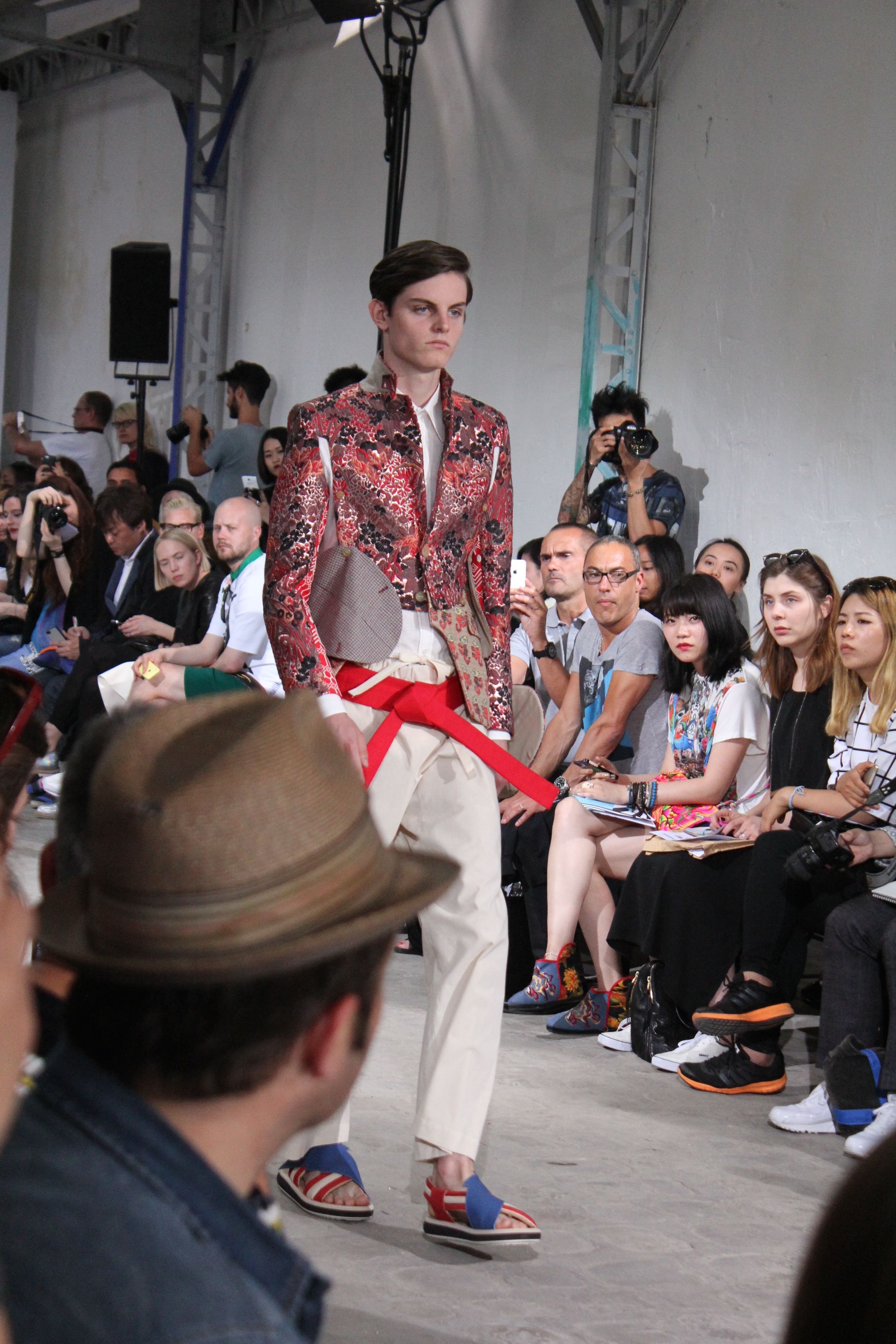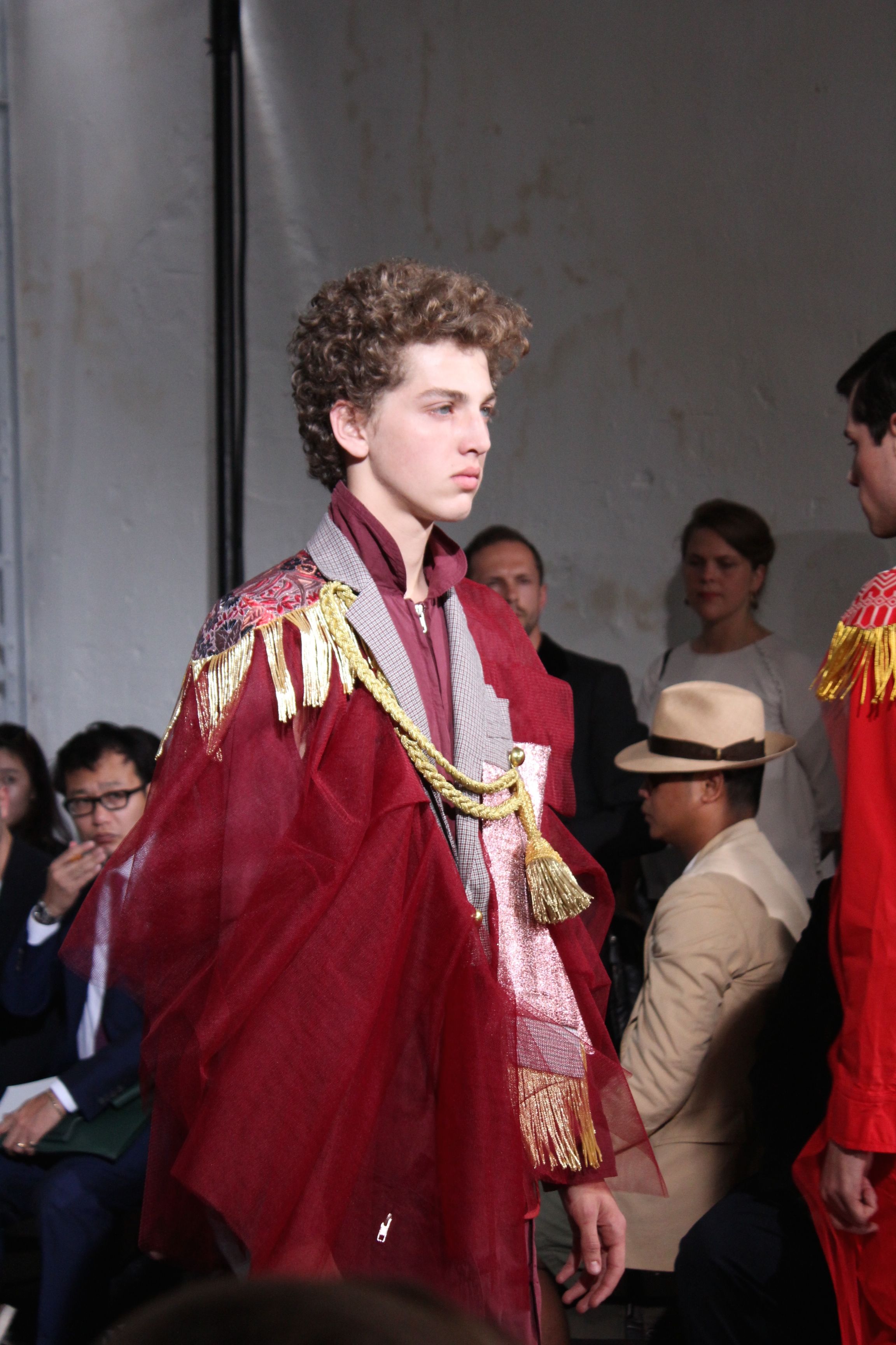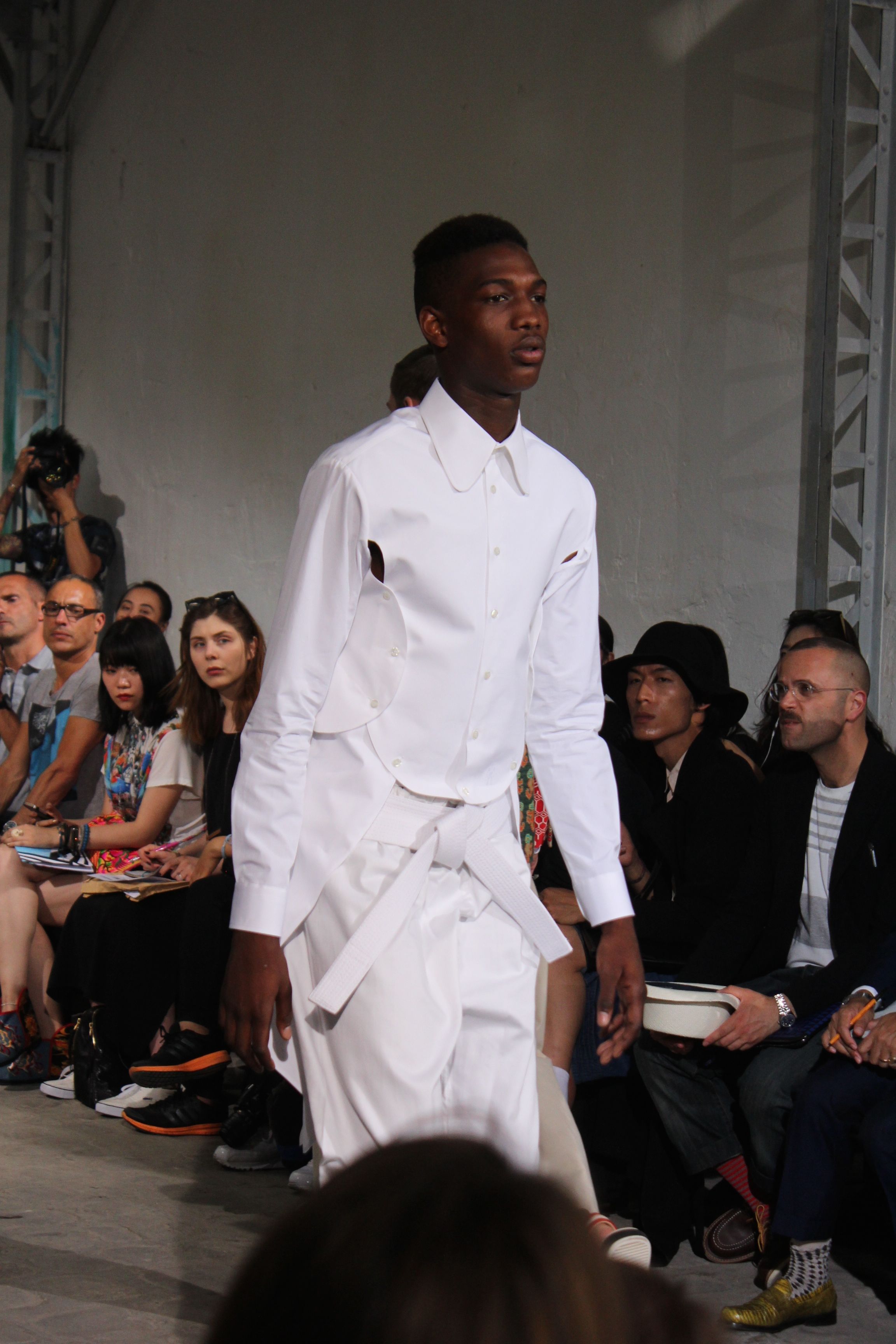 Romantisme et allure conquérante chez Walter Van Beirendonck…Chaque collection de Walter Van Beirendonck est construite au-delà du vêtement. Le créateur anversois profite du défilé pour divulguer des messages sur le monde qui l’entoure, se reflétant sur directement sur son vestiaire. Le dandy romantique prend des allures de conquérant. Les vestes et queues de pie sont construites pour se décomposer grâce à des boutons pression. Les ceintures comme les vestes kimonos et les pantalons amples sont inspirés du monde du judo. Le surfeur tel qu’il est vu par Walter, arrive en fuseau ou combinaison graphique et colorée. On retrouve les essentiels du créateur comme les combinaisons de travailleurs ou les tee-shirts amples. Le travail sur les matières – des brocards aux cotons épais – reste le point de départ, jusqu’à ses peintures imprimées réalisées par l’artiste Scooter Laforge.