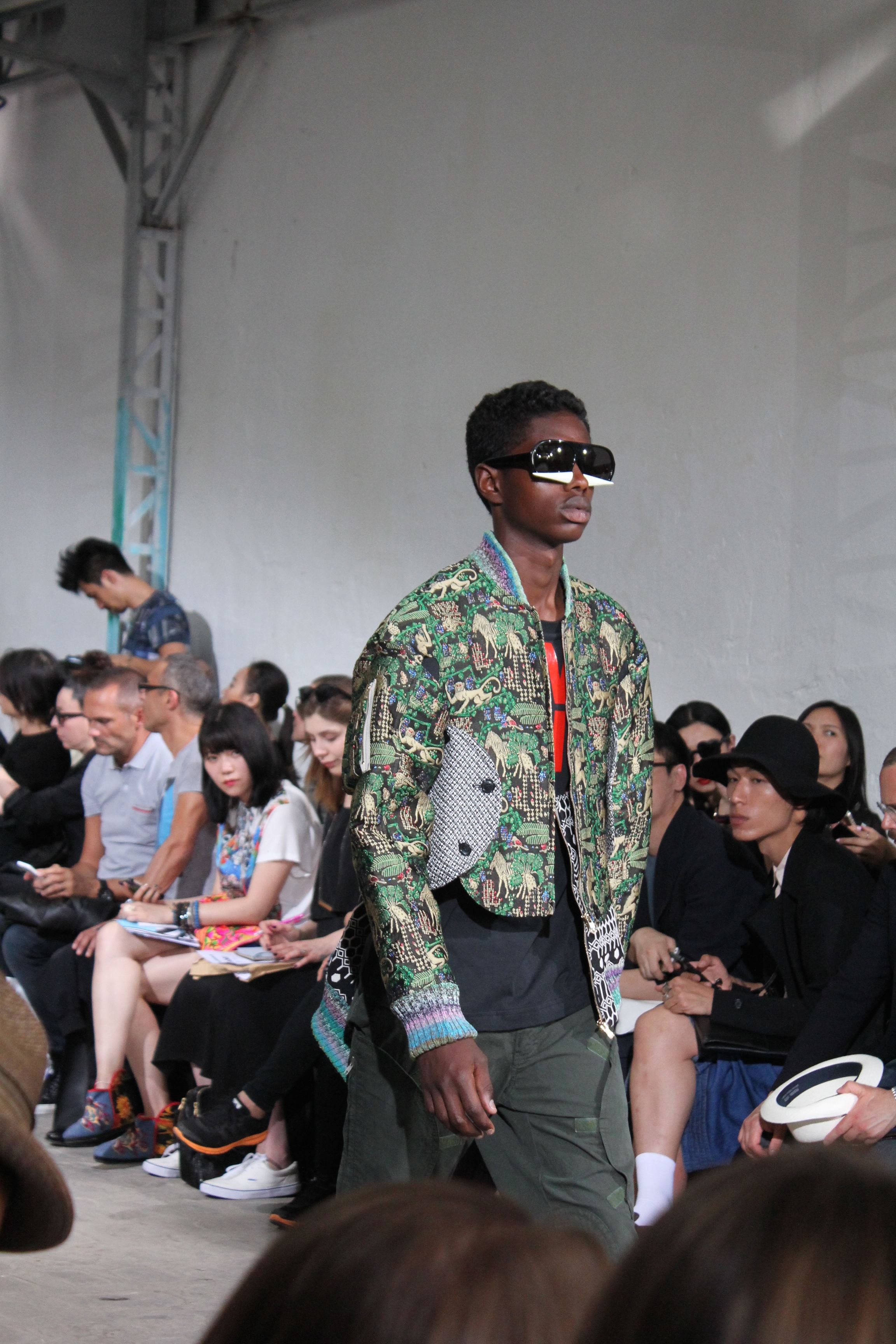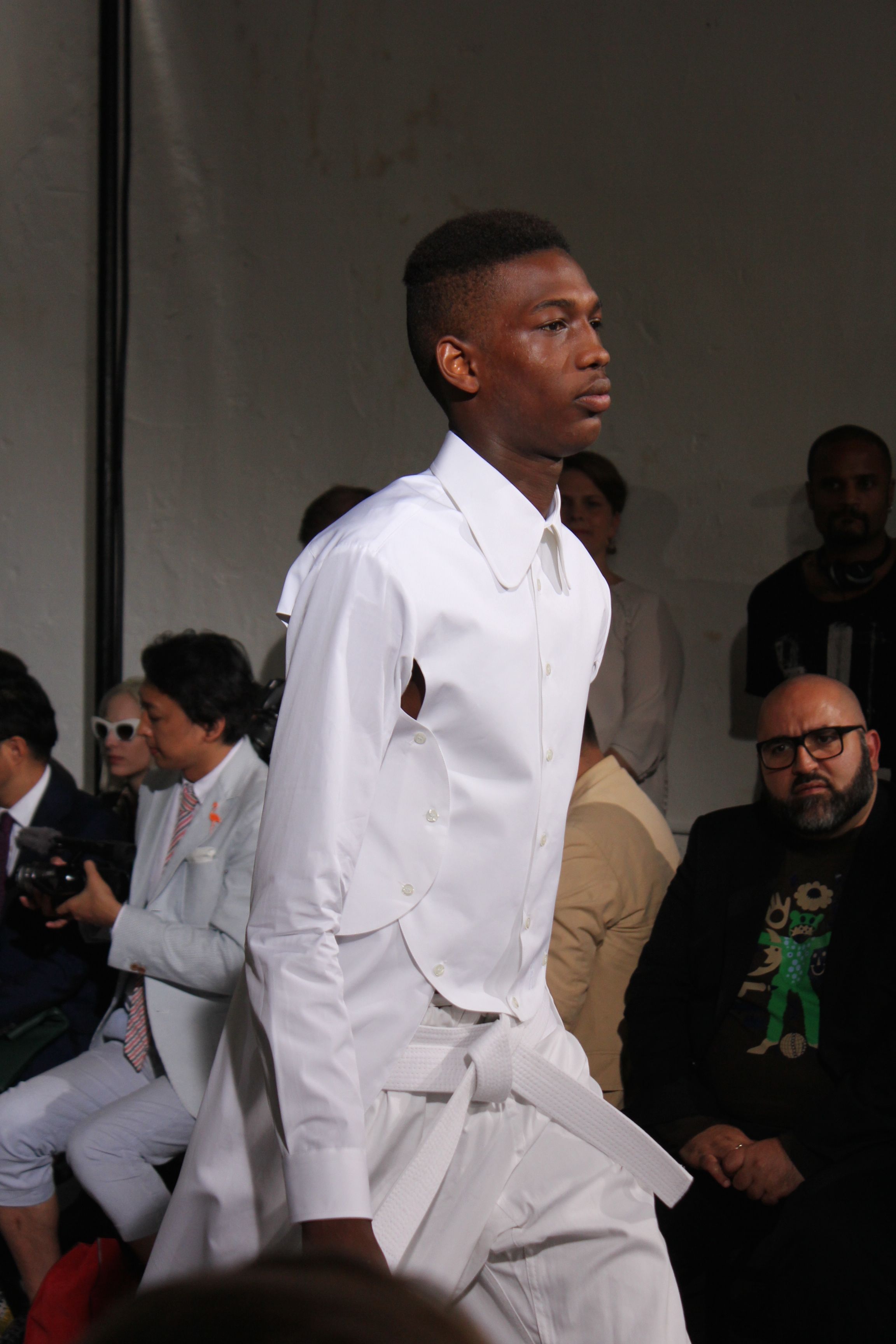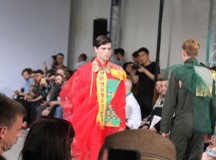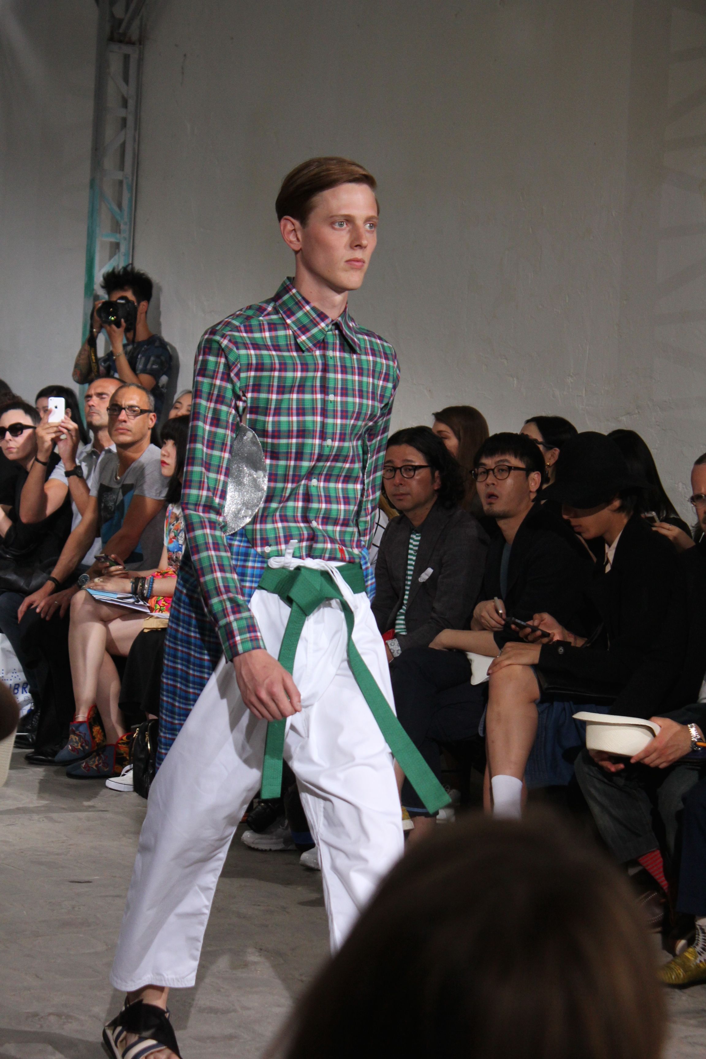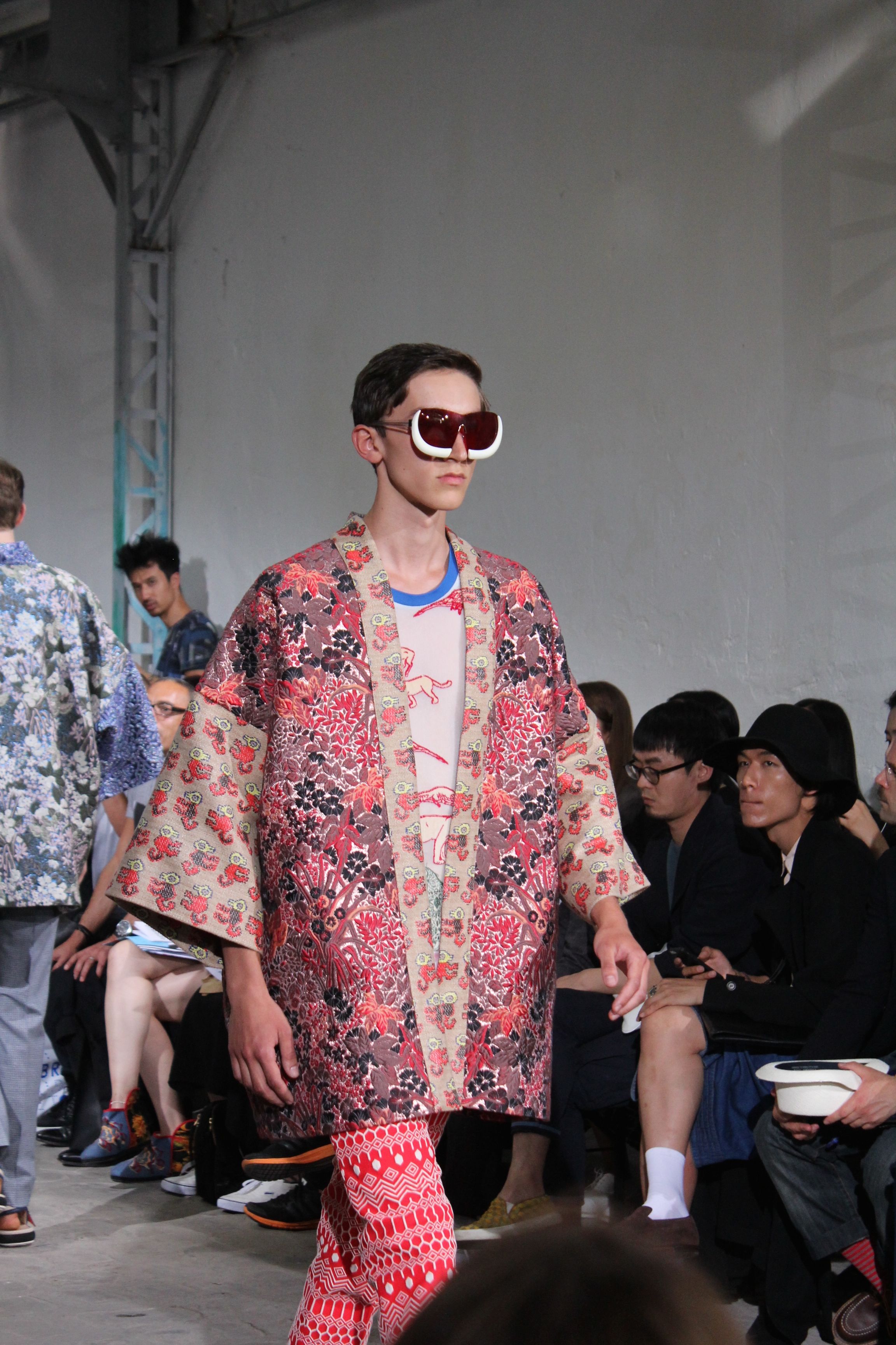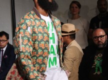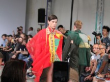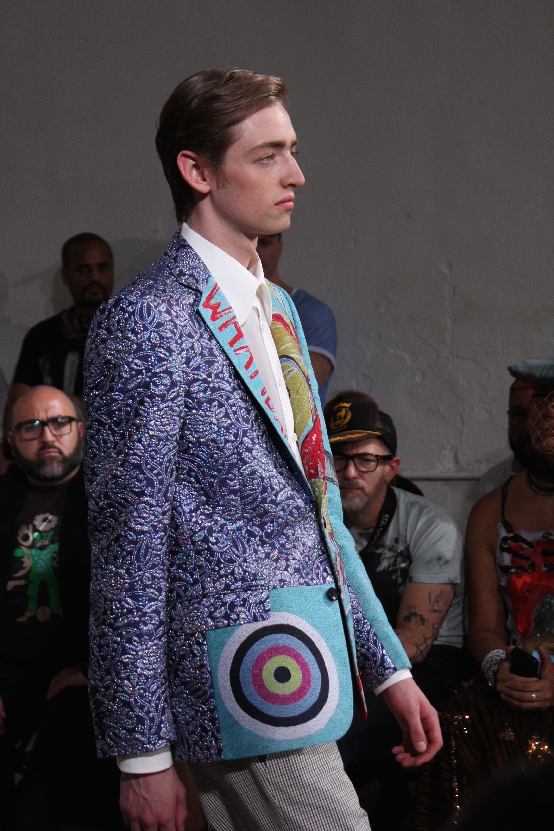 Romantisme et allure conquérante chez Walter Van Beirendonck…Chaque collection de Walter Van Beirendonck est construite au-delà du vêtement. Le créateur anversois profite du défilé pour divulguer des messages sur le monde qui l’entoure, se reflétant sur directement sur son vestiaire. Le dandy romantique prend des allures de conquérant. Les vestes et queues de pie sont construites pour se décomposer grâce à des boutons pression. Les ceintures comme les vestes kimonos et les pantalons amples sont inspirés du monde du judo. Le surfeur tel qu’il est vu par Walter, arrive en fuseau ou combinaison graphique et colorée. On retrouve les essentiels du créateur comme les combinaisons de travailleurs ou les tee-shirts amples. Le travail sur les matières – des brocards aux cotons épais – reste le point de départ, jusqu’à ses peintures imprimées réalisées par l’artiste Scooter Laforge.