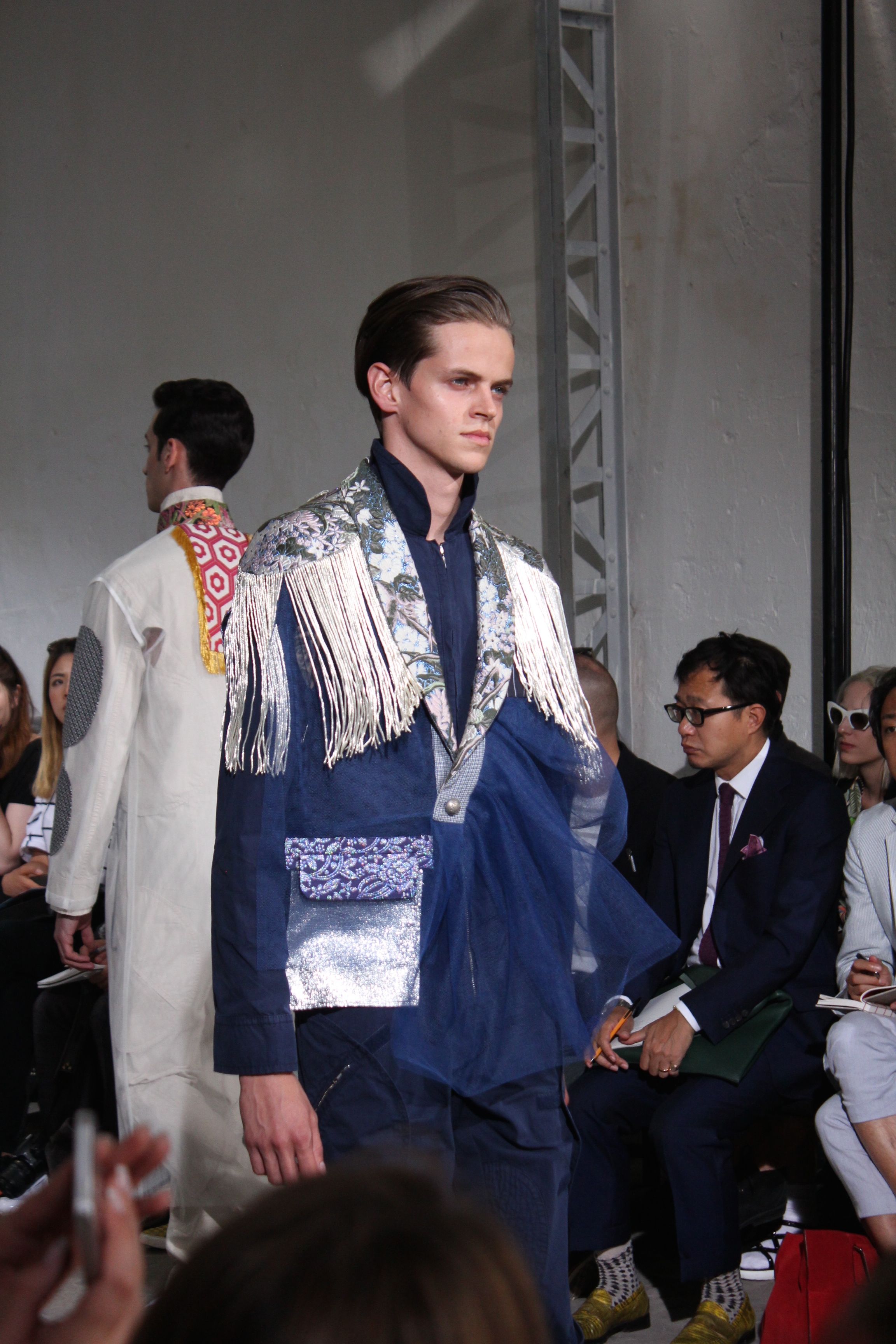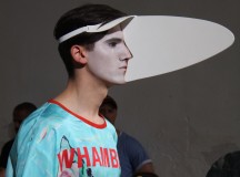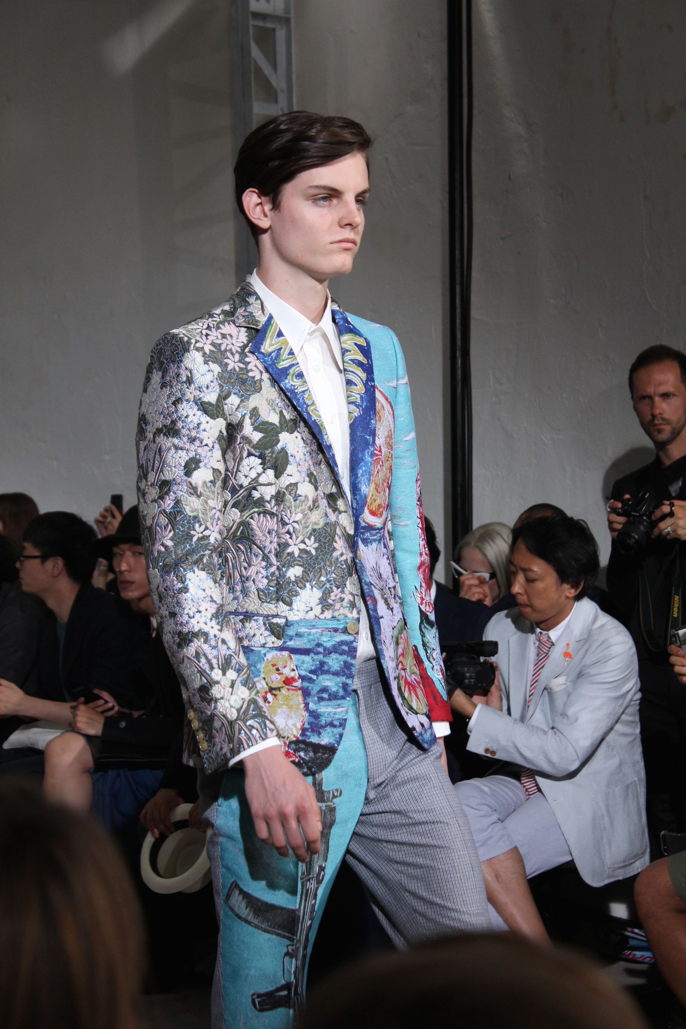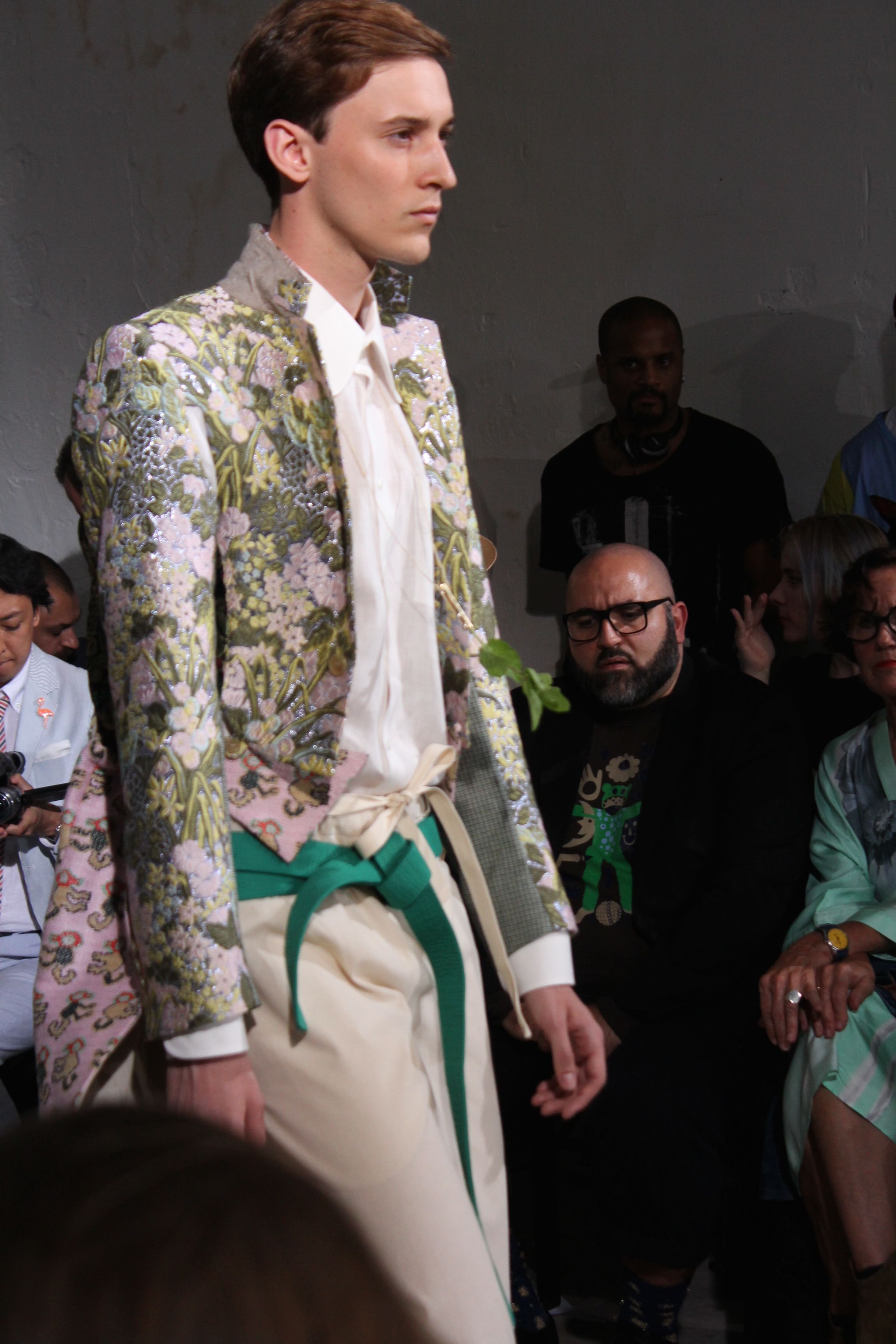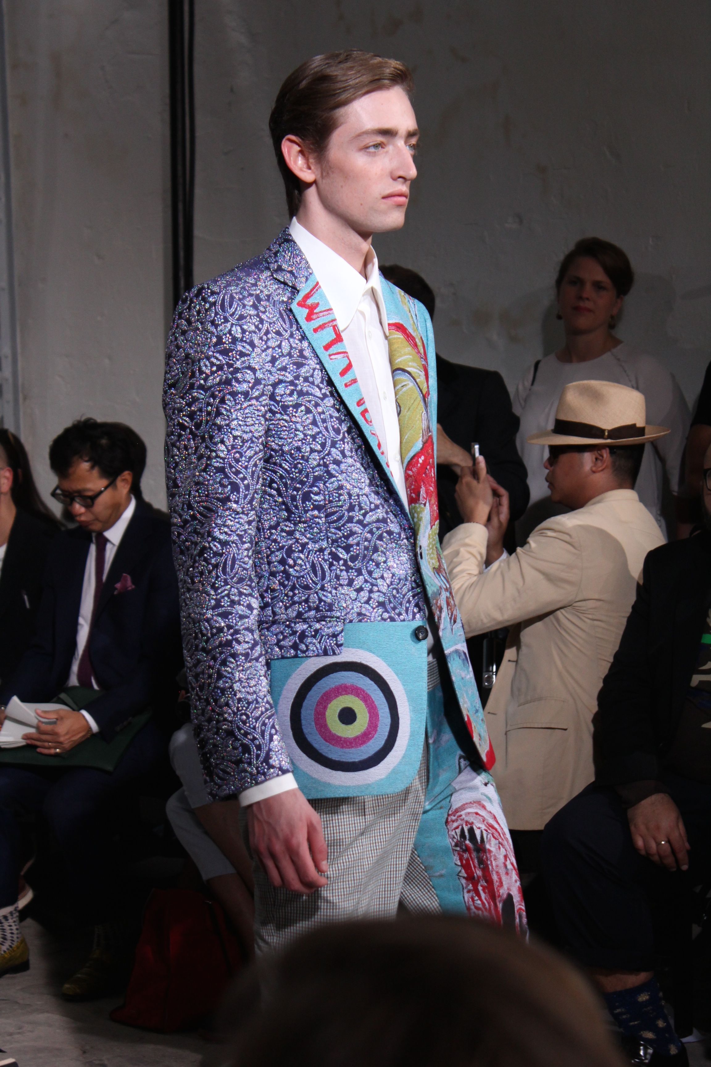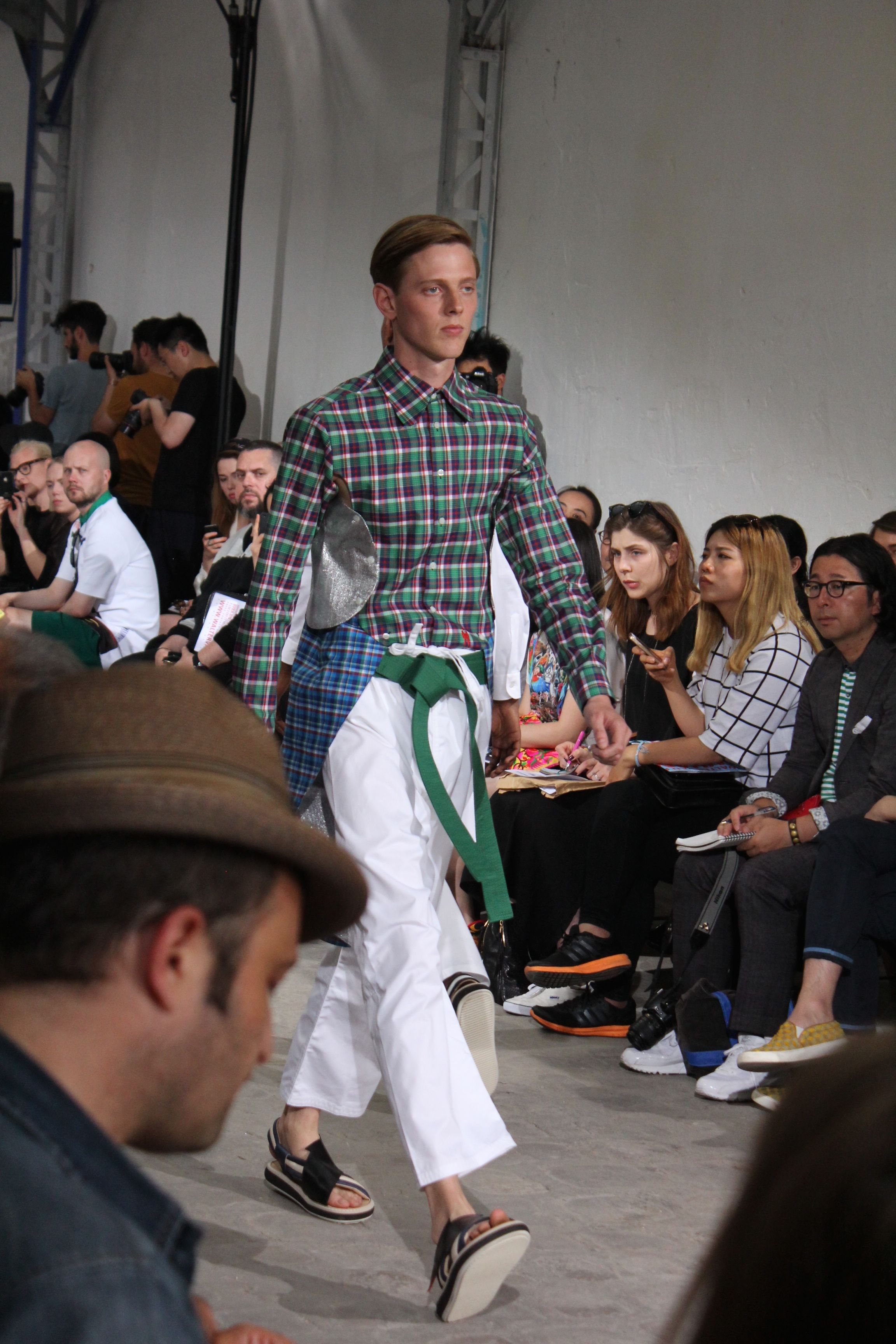 Romantisme et allure conquérante chez Walter Van Beirendonck…Chaque collection de Walter Van Beirendonck est construite au-delà du vêtement. Le créateur anversois profite du défilé pour divulguer des messages sur le monde qui l’entoure, se reflétant sur directement sur son vestiaire. Le dandy romantique prend des allures de conquérant. Les vestes et queues de pie sont construites pour se décomposer grâce à des boutons pression. Les ceintures comme les vestes kimonos et les pantalons amples sont inspirés du monde du judo. Le surfeur tel qu’il est vu par Walter, arrive en fuseau ou combinaison graphique et colorée. On retrouve les essentiels du créateur comme les combinaisons de travailleurs ou les tee-shirts amples. Le travail sur les matières – des brocards aux cotons épais – reste le point de départ, jusqu’à ses peintures imprimées réalisées par l’artiste Scooter Laforge.