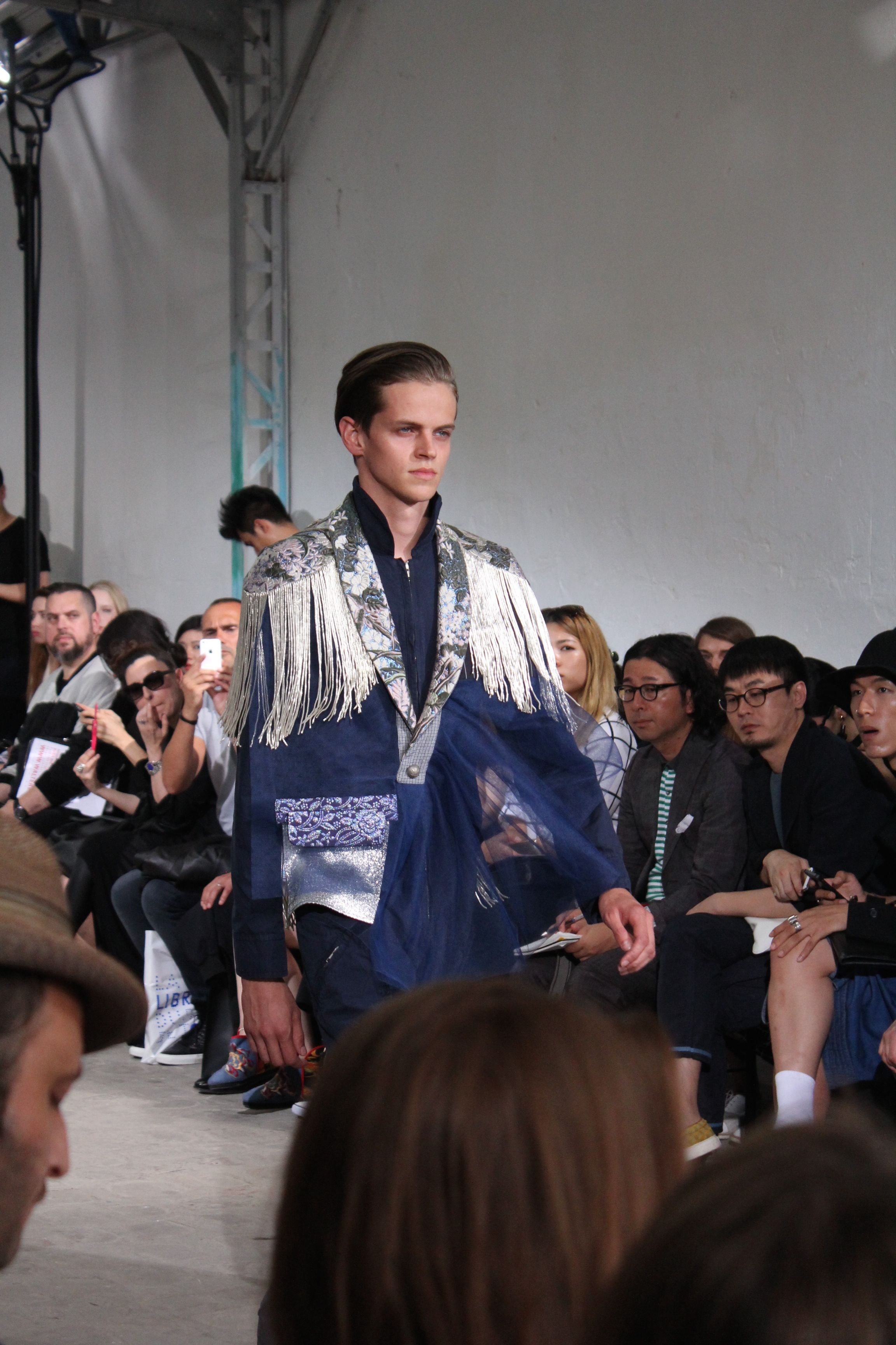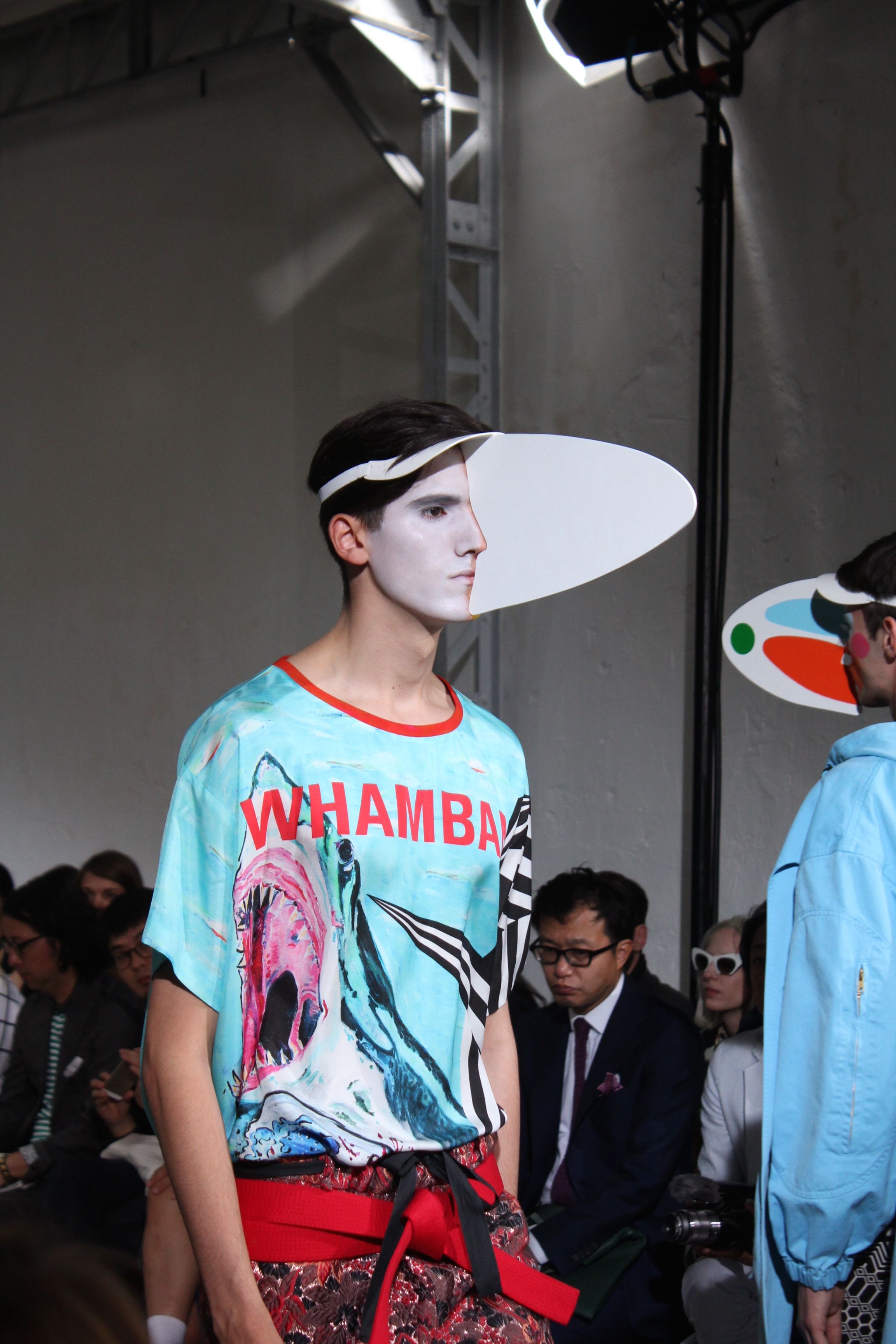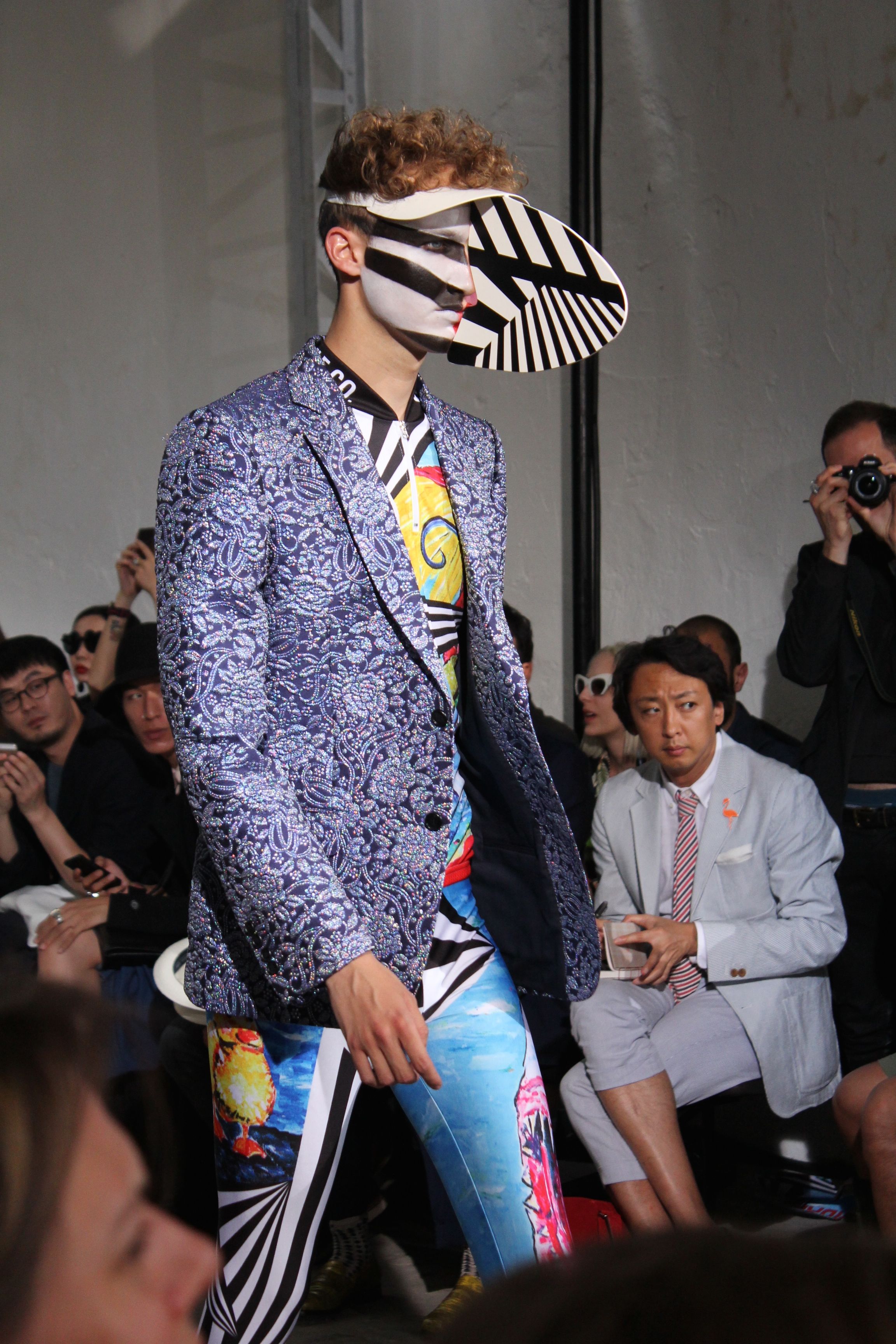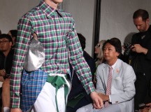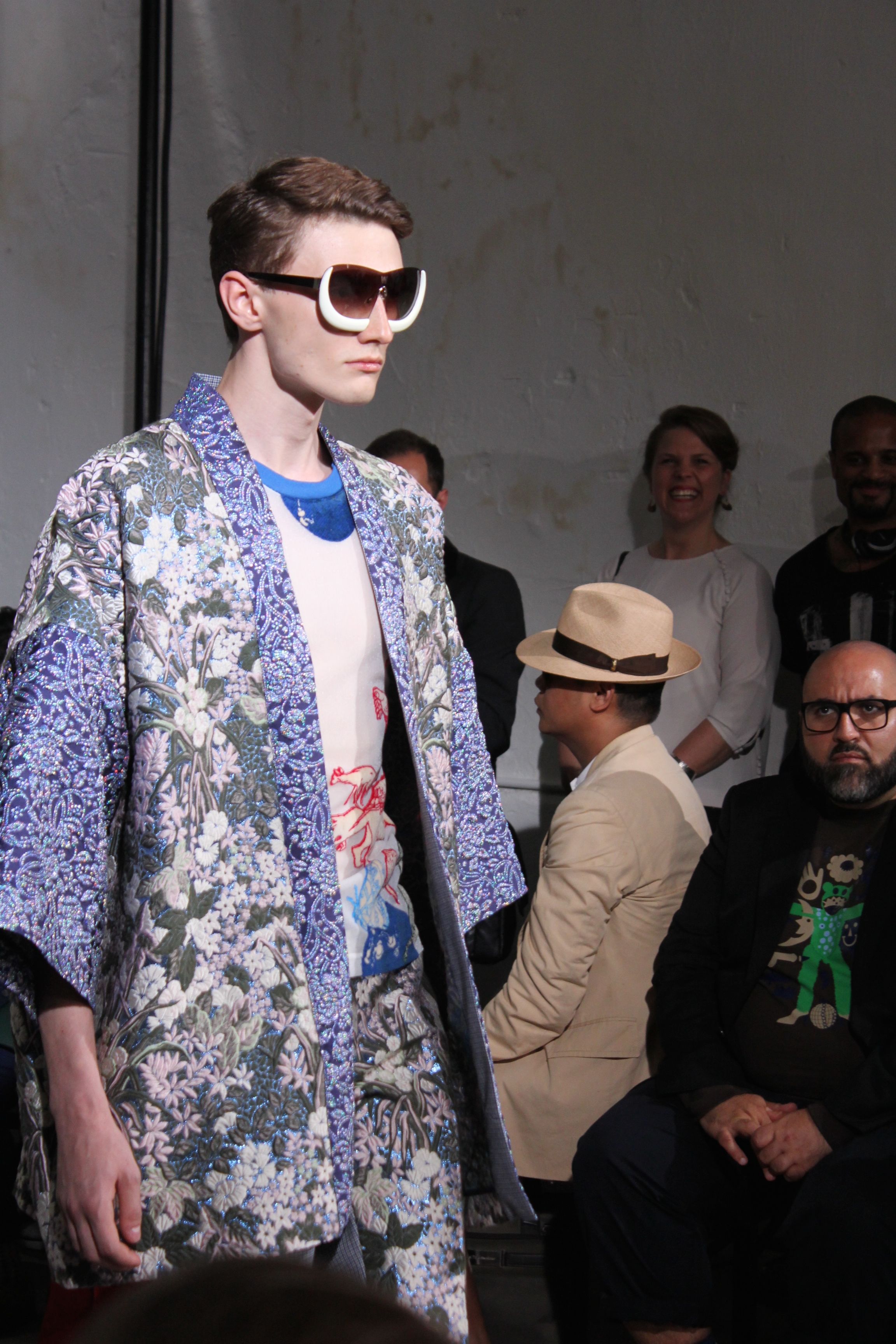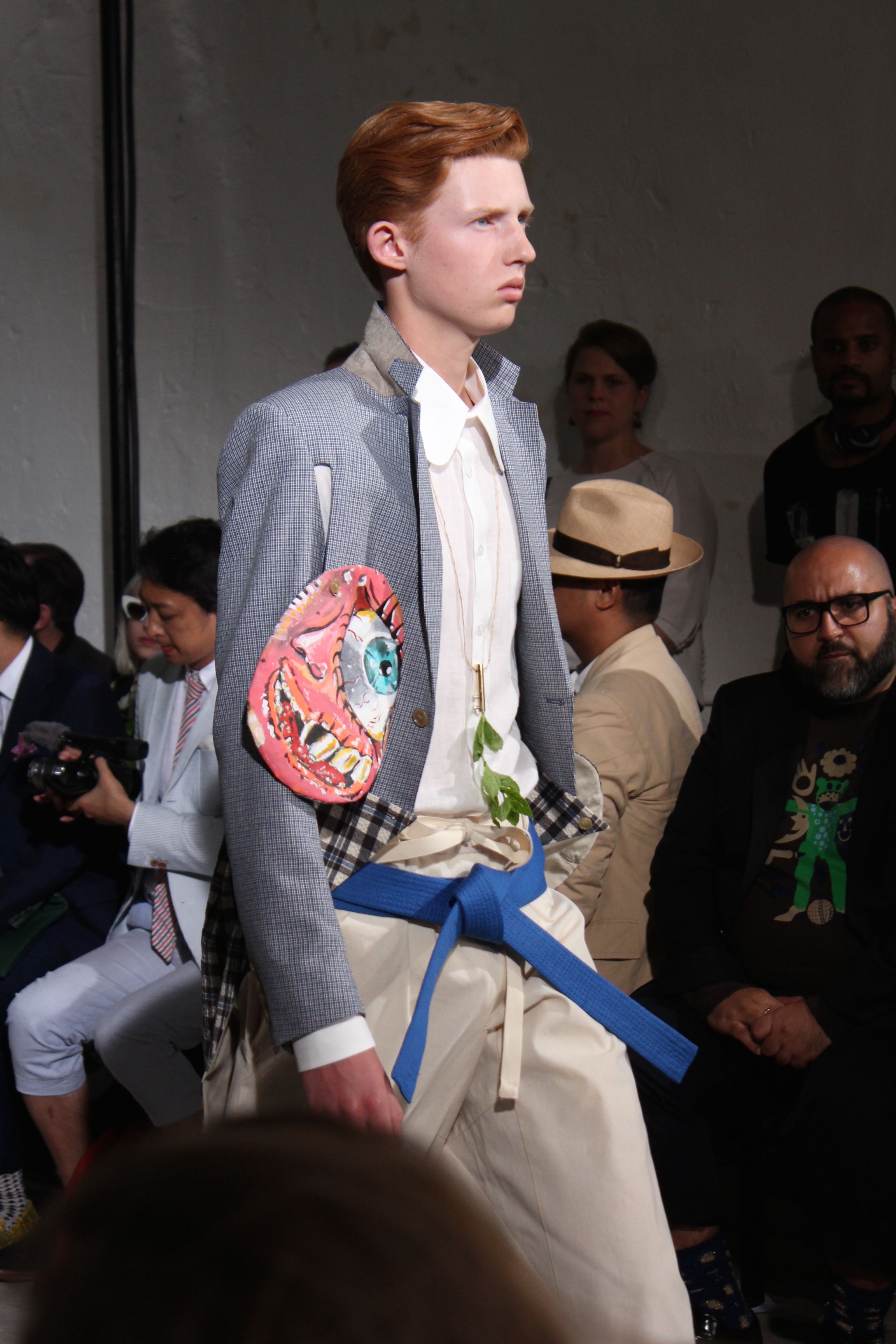 Romantisme et allure conquérante chez Walter Van Beirendonck…Chaque collection de Walter Van Beirendonck est construite au-delà du vêtement. Le créateur anversois profite du défilé pour divulguer des messages sur le monde qui l’entoure, se reflétant sur directement sur son vestiaire. Le dandy romantique prend des allures de conquérant. Les vestes et queues de pie sont construites pour se décomposer grâce à des boutons pression. Les ceintures comme les vestes kimonos et les pantalons amples sont inspirés du monde du judo. Le surfeur tel qu’il est vu par Walter, arrive en fuseau ou combinaison graphique et colorée. On retrouve les essentiels du créateur comme les combinaisons de travailleurs ou les tee-shirts amples. Le travail sur les matières – des brocards aux cotons épais – reste le point de départ, jusqu’à ses peintures imprimées réalisées par l’artiste Scooter Laforge.
