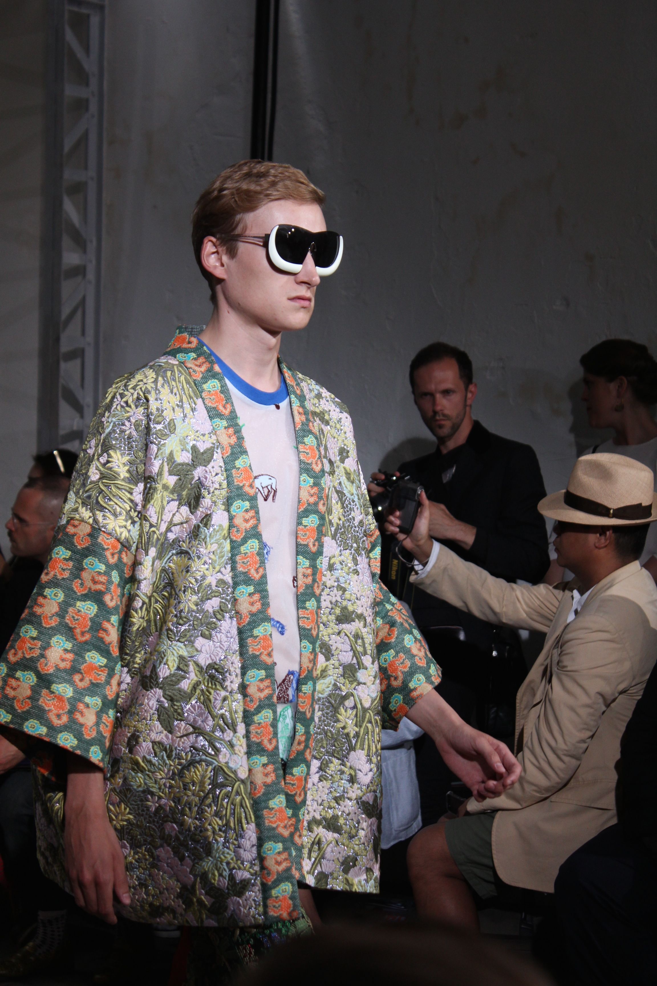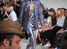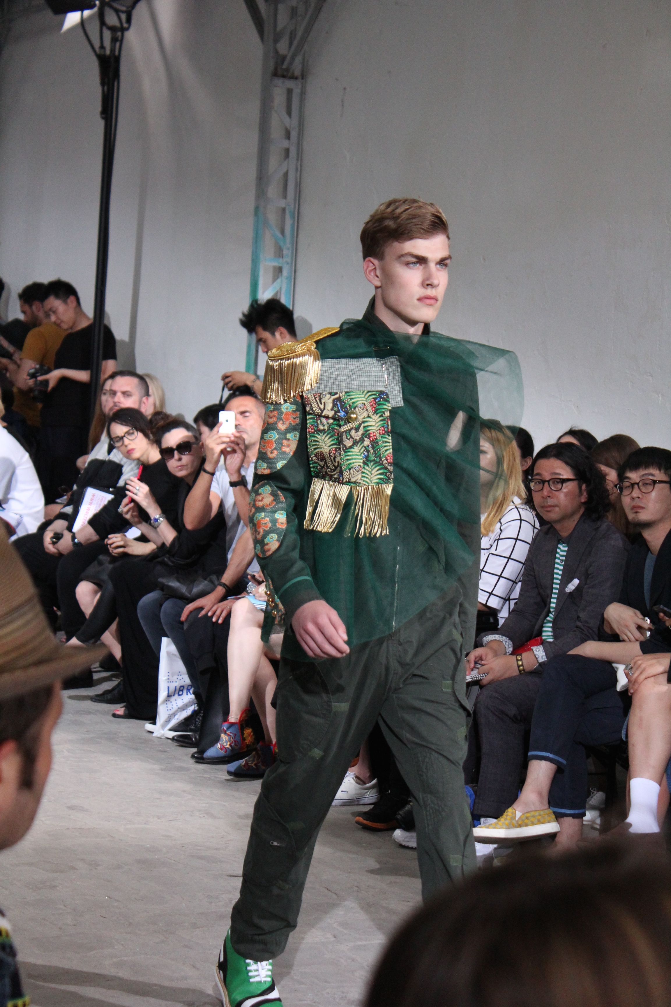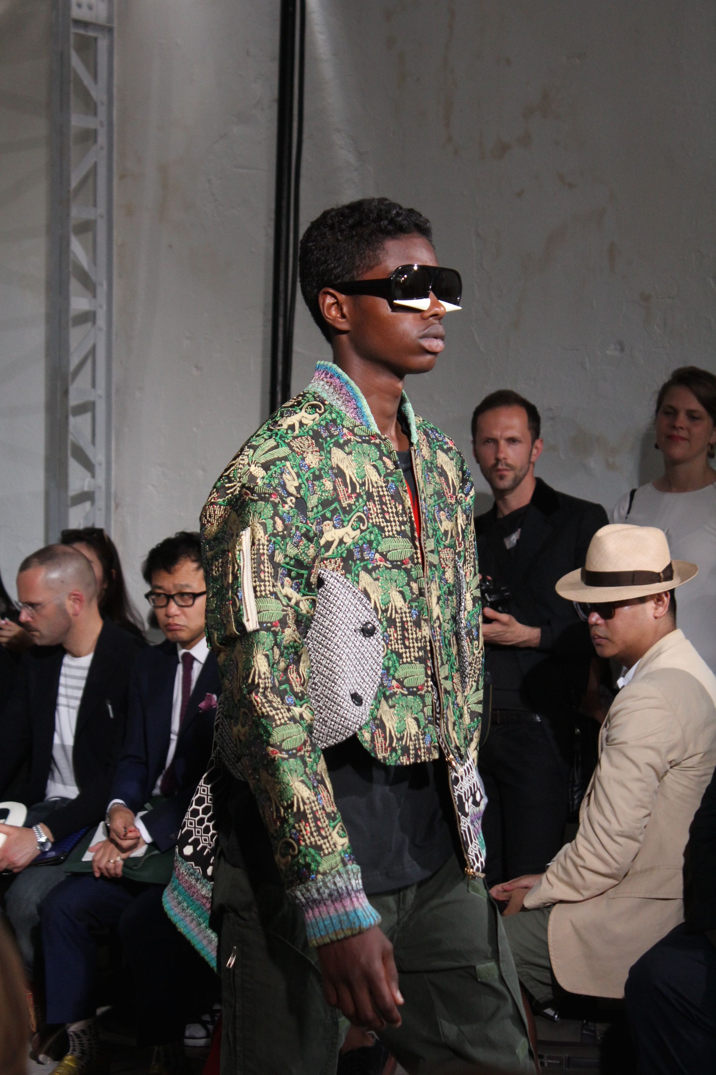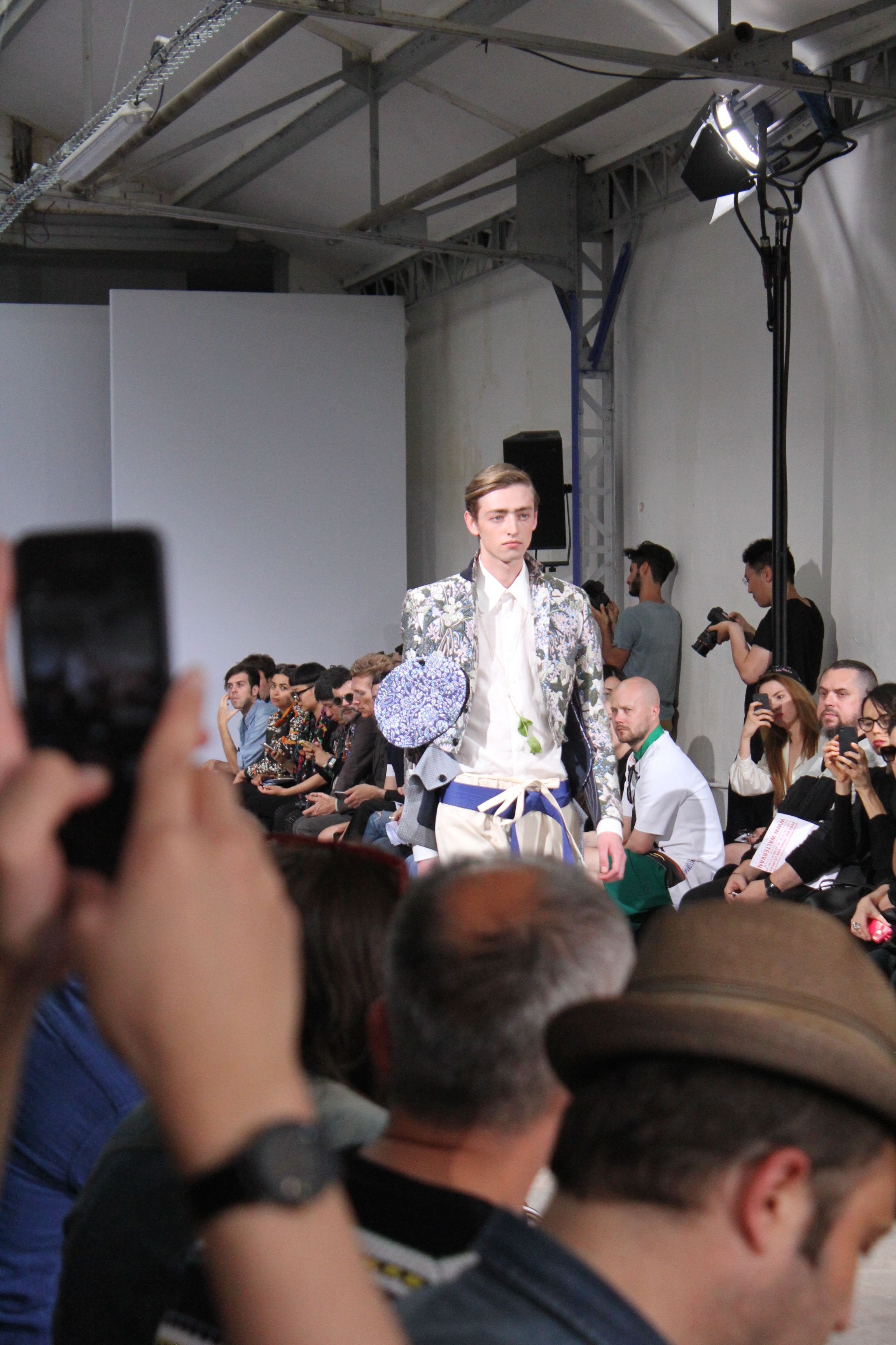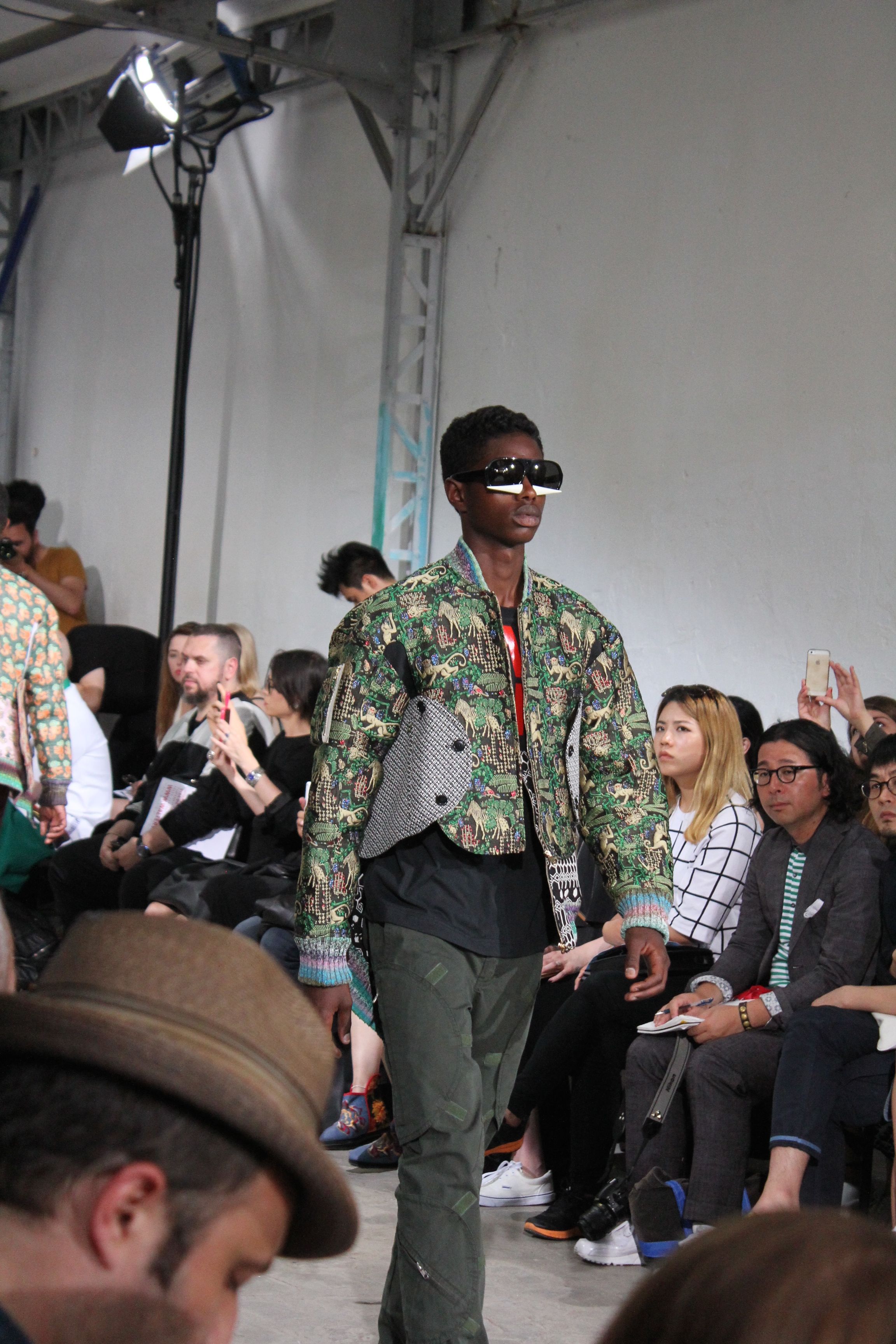 Romantisme et allure conquérante chez Walter Van Beirendonck…Chaque collection de Walter Van Beirendonck est construite au-delà du vêtement. Le créateur anversois profite du défilé pour divulguer des messages sur le monde qui l’entoure, se reflétant sur directement sur son vestiaire. Le dandy romantique prend des allures de conquérant. Les vestes et queues de pie sont construites pour se décomposer grâce à des boutons pression. Les ceintures comme les vestes kimonos et les pantalons amples sont inspirés du monde du judo. Le surfeur tel qu’il est vu par Walter, arrive en fuseau ou combinaison graphique et colorée. On retrouve les essentiels du créateur comme les combinaisons de travailleurs ou les tee-shirts amples. Le travail sur les matières – des brocards aux cotons épais – reste le point de départ, jusqu’à ses peintures imprimées réalisées par l’artiste Scooter Laforge.