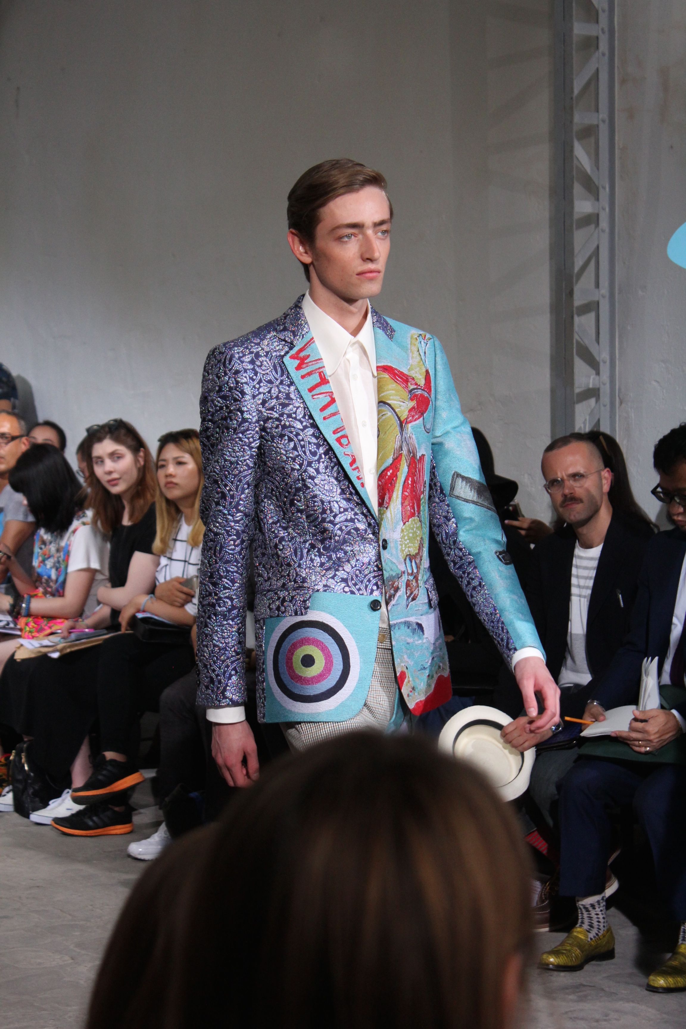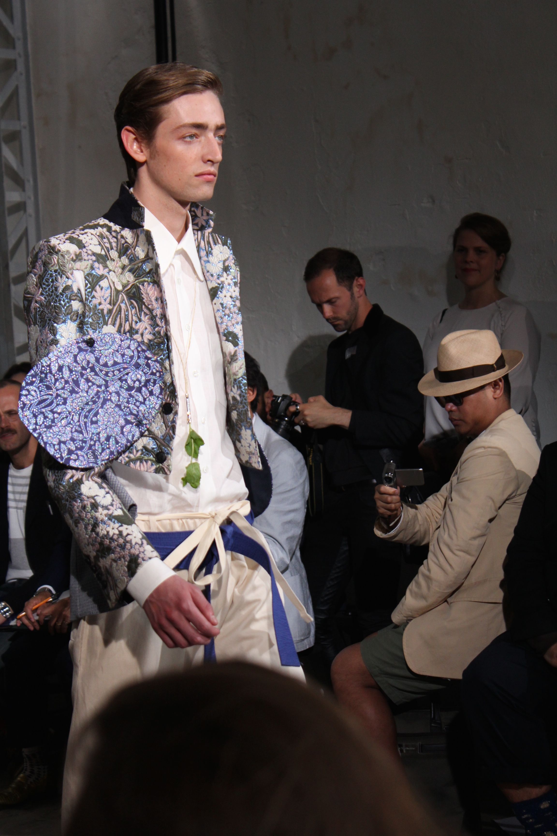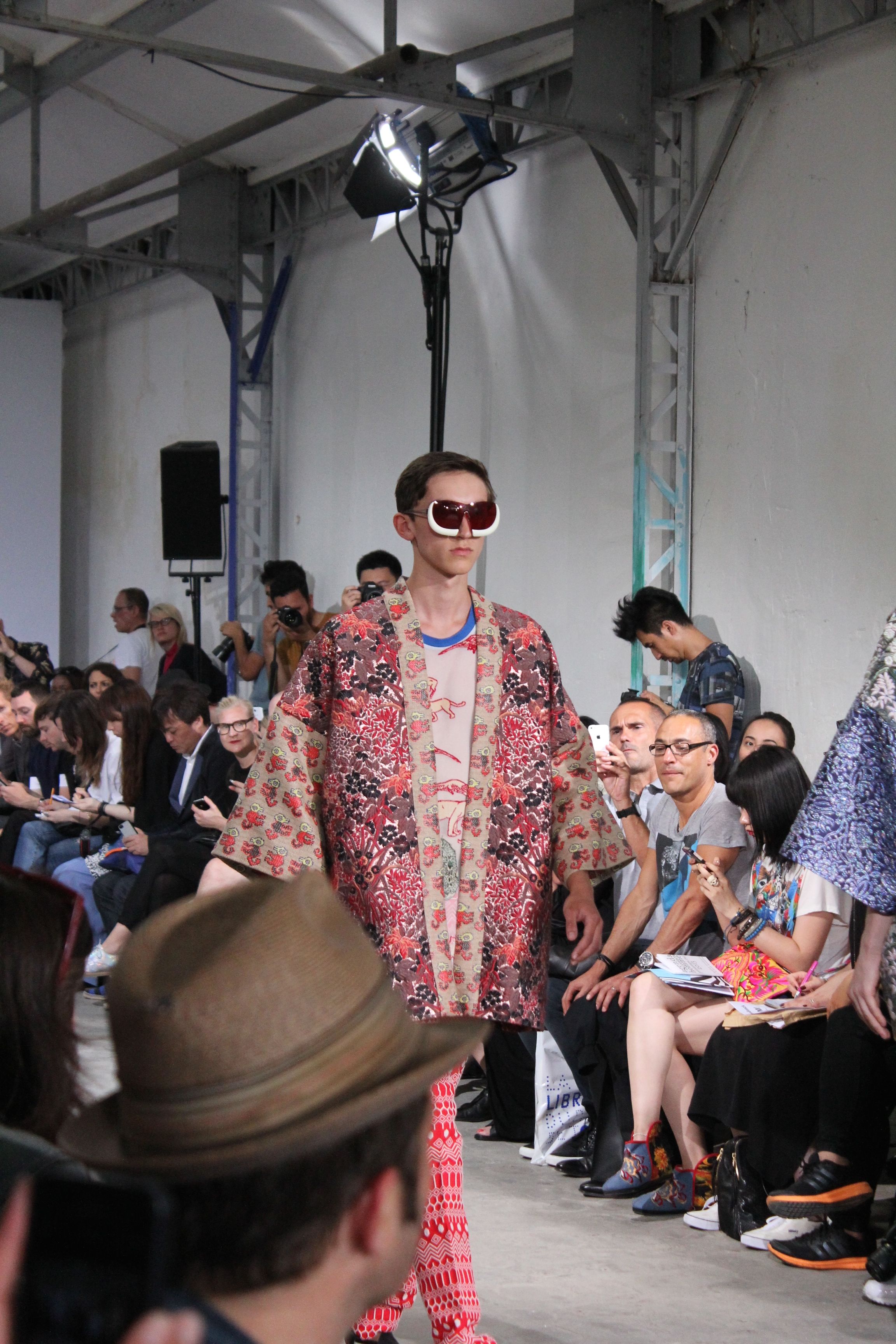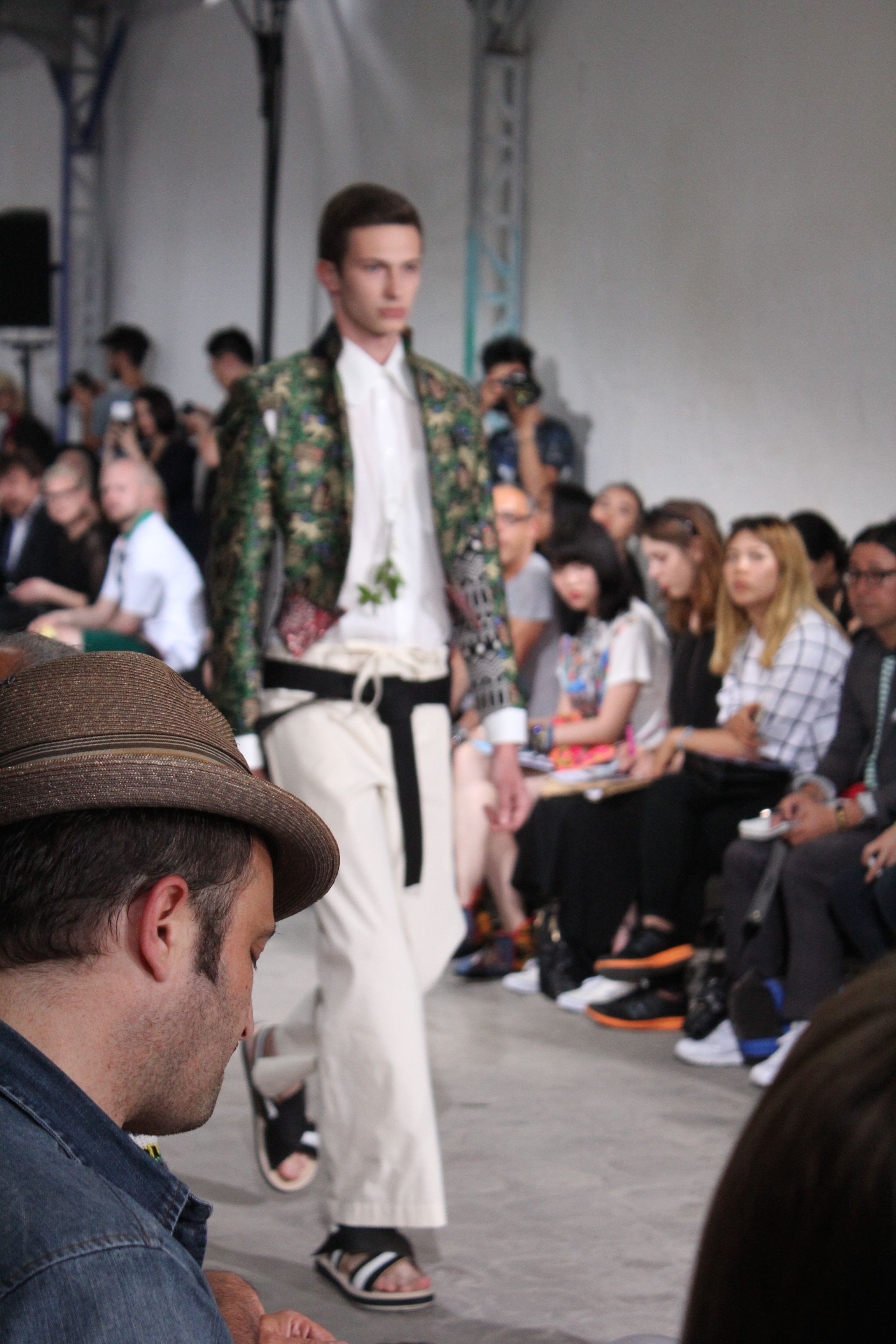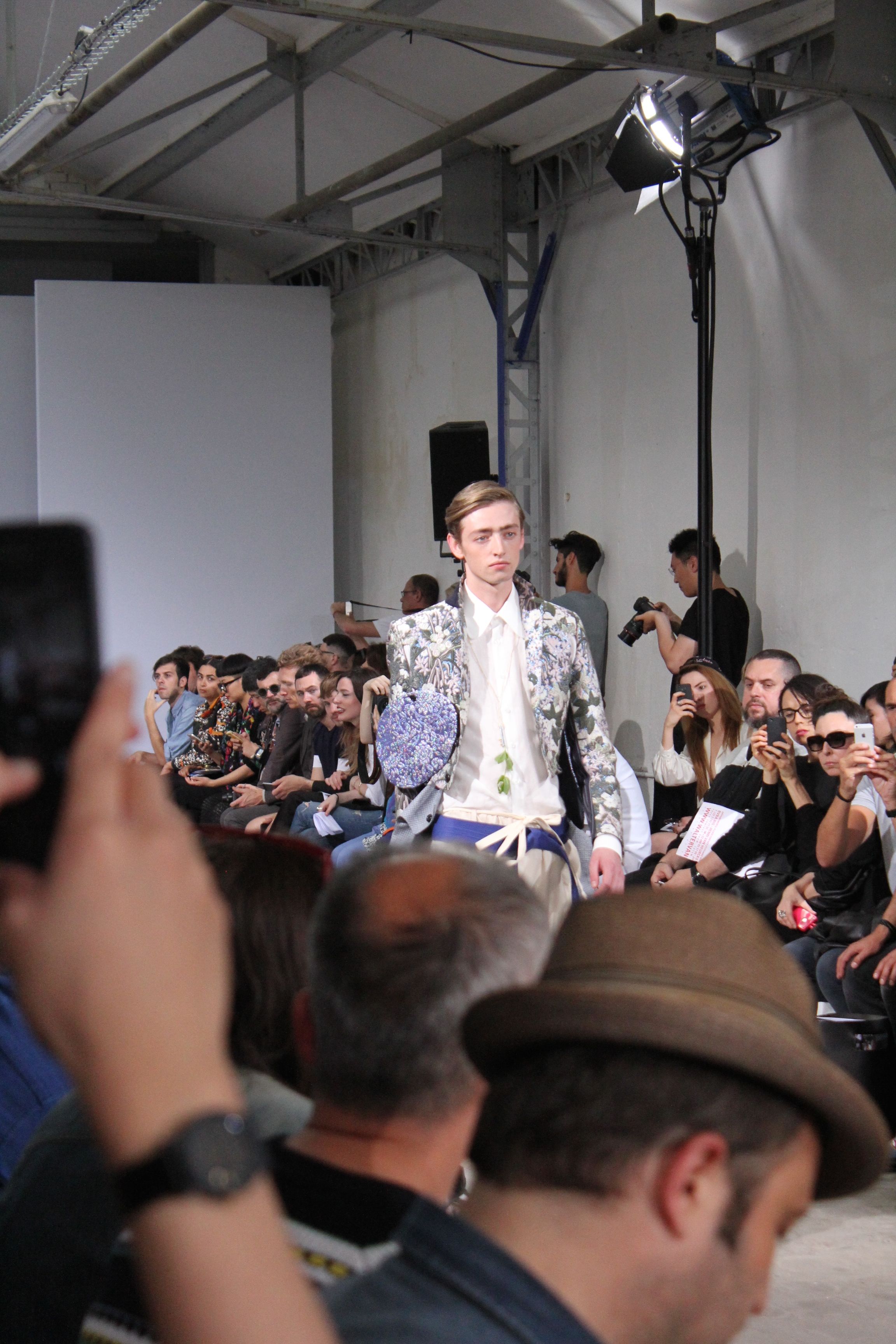 Romantisme et allure conquérante chez Walter Van Beirendonck…Chaque collection de Walter Van Beirendonck est construite au-delà du vêtement. Le créateur anversois profite du défilé pour divulguer des messages sur le monde qui l’entoure, se reflétant sur directement sur son vestiaire. Le dandy romantique prend des allures de conquérant. Les vestes et queues de pie sont construites pour se décomposer grâce à des boutons pression. Les ceintures comme les vestes kimonos et les pantalons amples sont inspirés du monde du judo. Le surfeur tel qu’il est vu par Walter, arrive en fuseau ou combinaison graphique et colorée. On retrouve les essentiels du créateur comme les combinaisons de travailleurs ou les tee-shirts amples. Le travail sur les matières – des brocards aux cotons épais – reste le point de départ, jusqu’à ses peintures imprimées réalisées par l’artiste Scooter Laforge.
