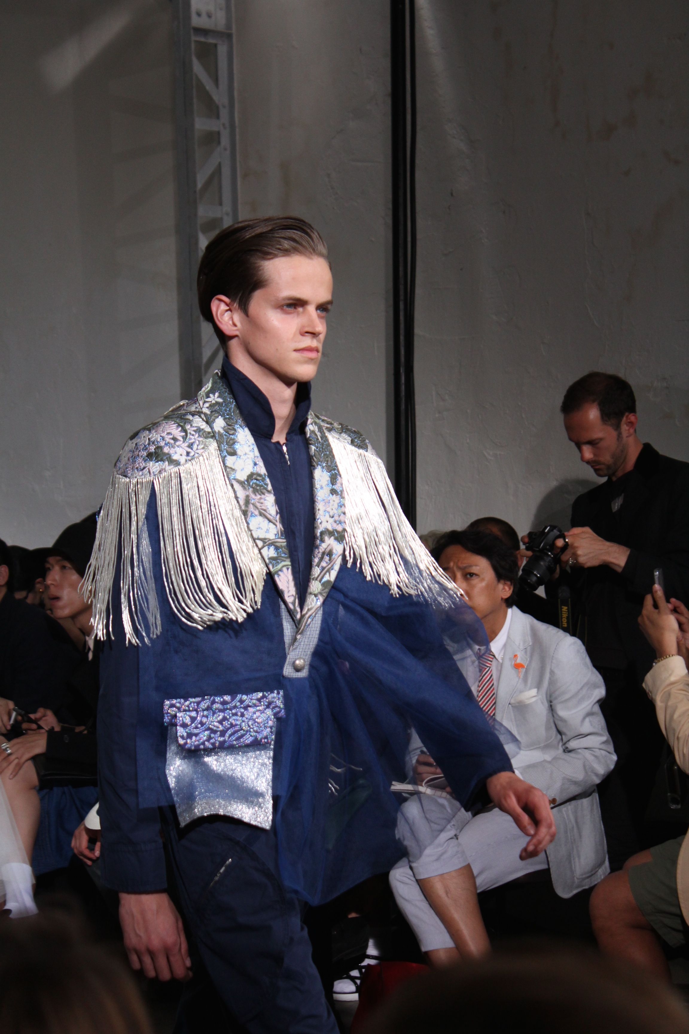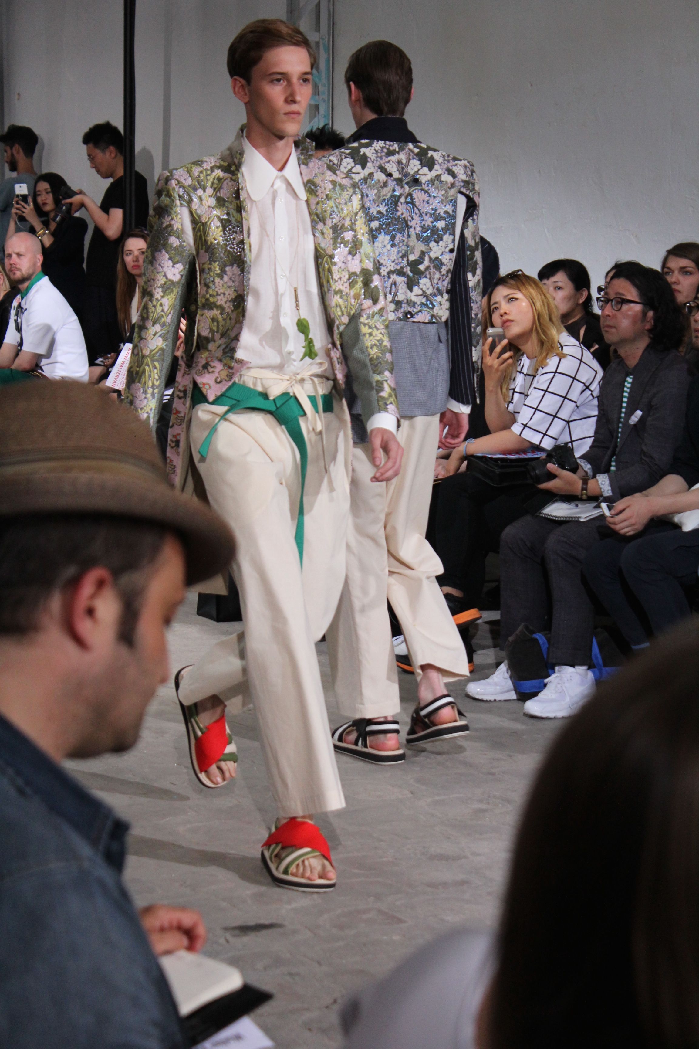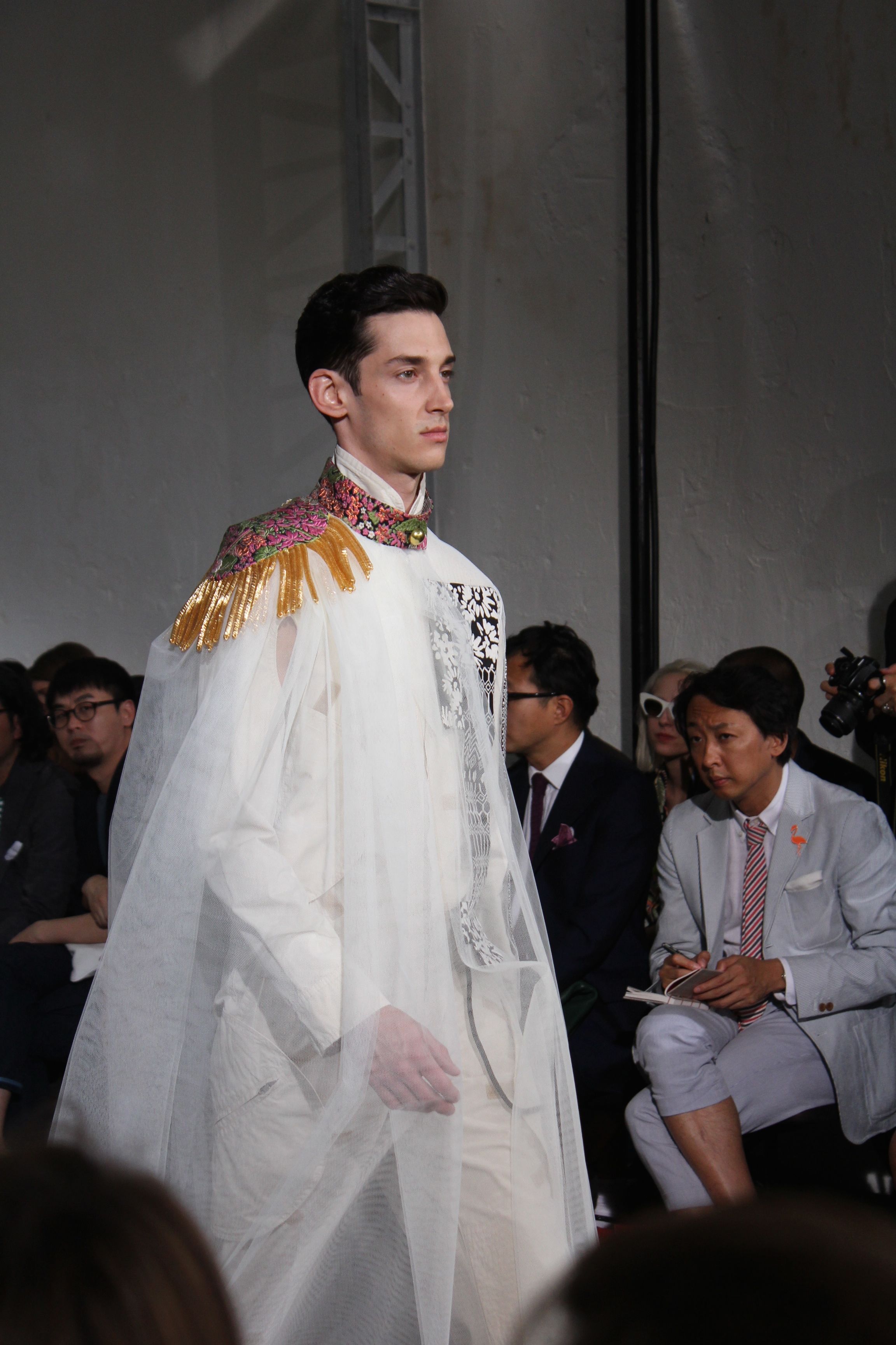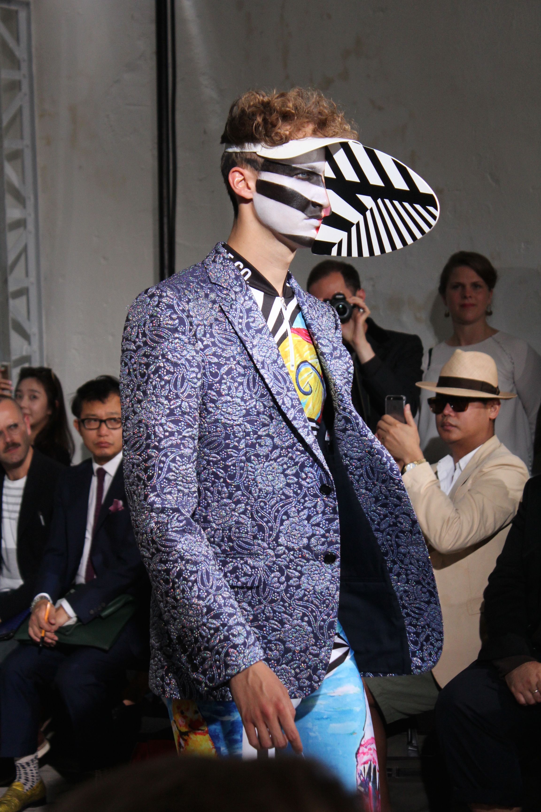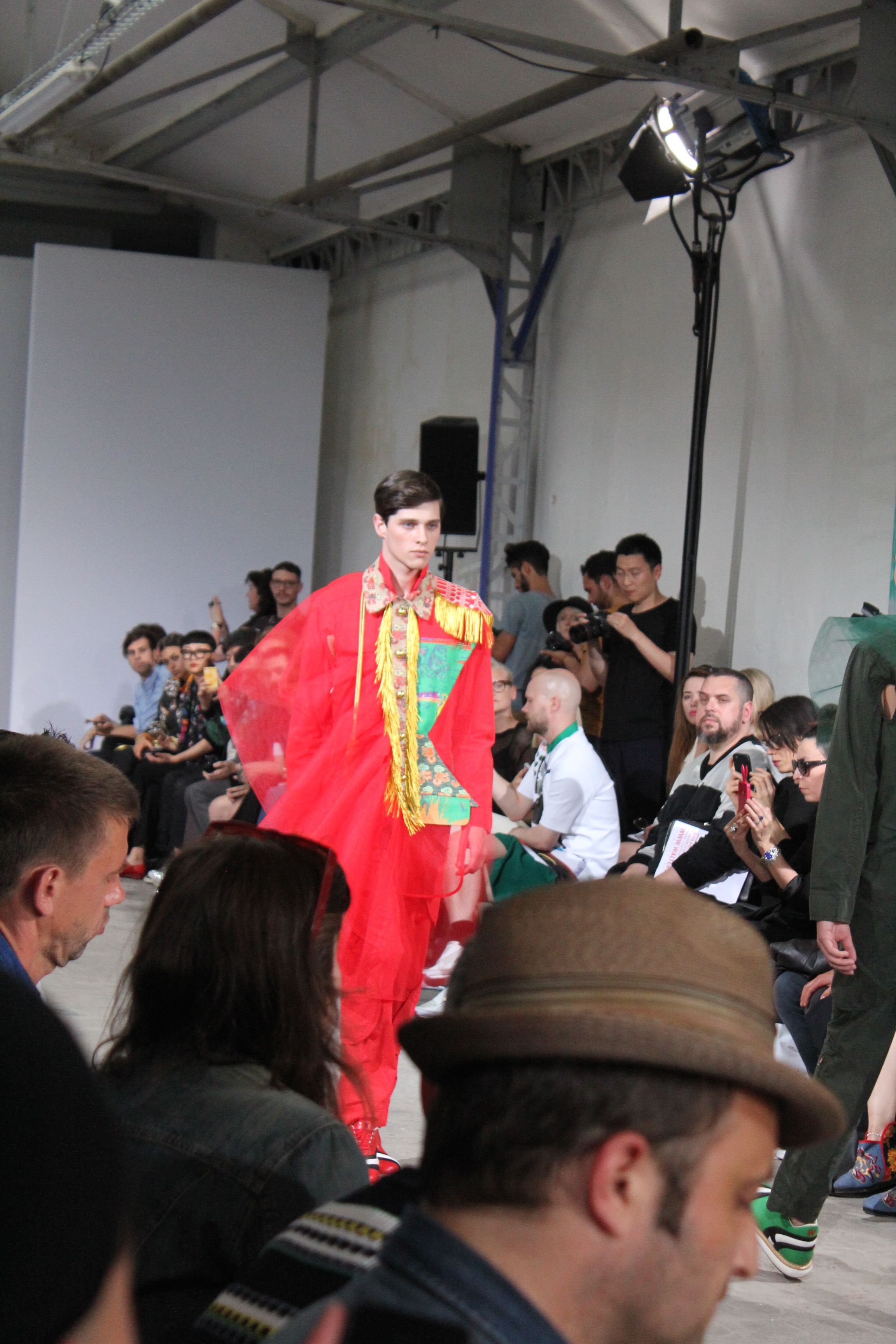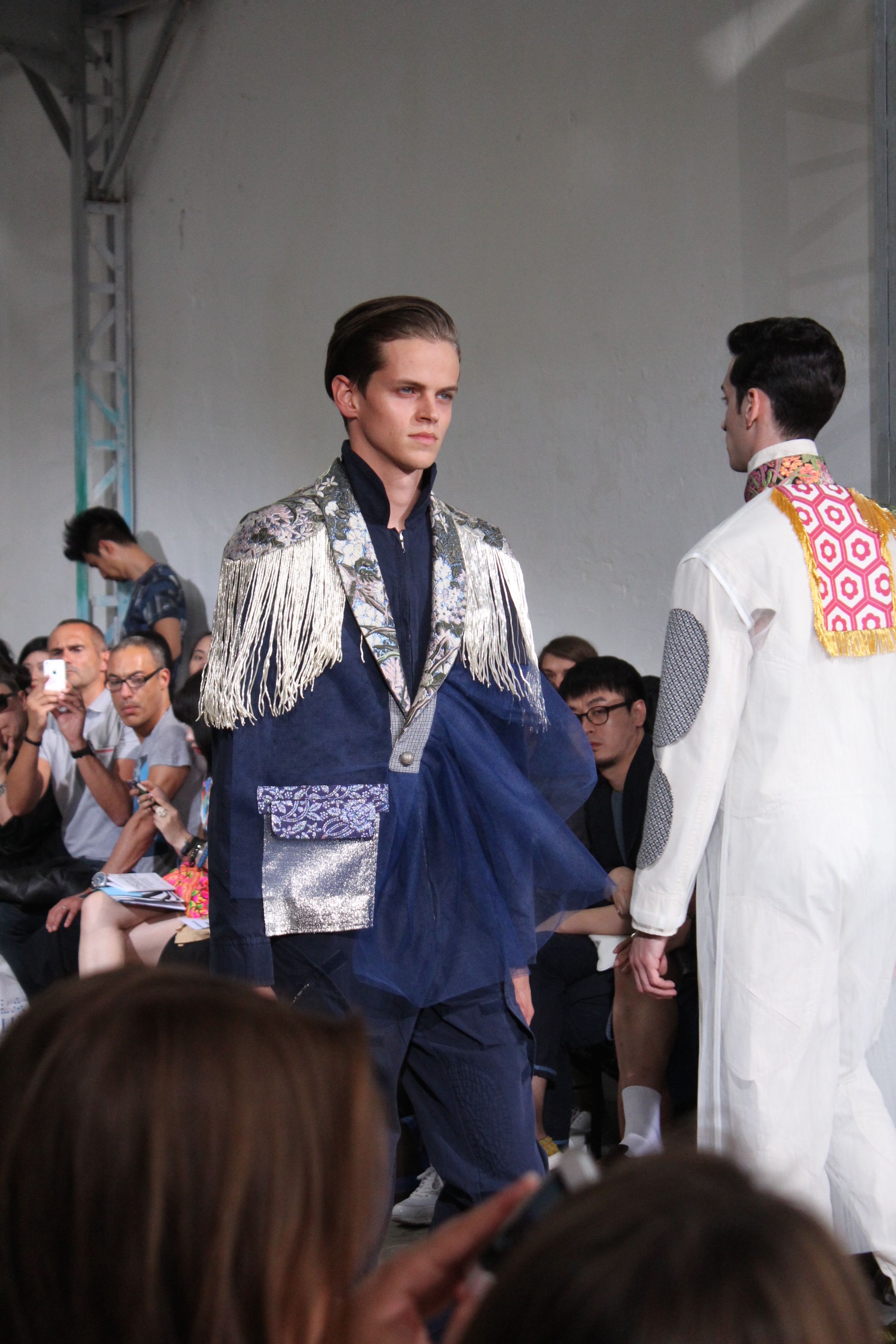 Romantisme et allure conquérante chez Walter Van Beirendonck…Chaque collection de Walter Van Beirendonck est construite au-delà du vêtement. Le créateur anversois profite du défilé pour divulguer des messages sur le monde qui l’entoure, se reflétant sur directement sur son vestiaire. Le dandy romantique prend des allures de conquérant. Les vestes et queues de pie sont construites pour se décomposer grâce à des boutons pression. Les ceintures comme les vestes kimonos et les pantalons amples sont inspirés du monde du judo. Le surfeur tel qu’il est vu par Walter, arrive en fuseau ou combinaison graphique et colorée. On retrouve les essentiels du créateur comme les combinaisons de travailleurs ou les tee-shirts amples. Le travail sur les matières – des brocards aux cotons épais – reste le point de départ, jusqu’à ses peintures imprimées réalisées par l’artiste Scooter Laforge.