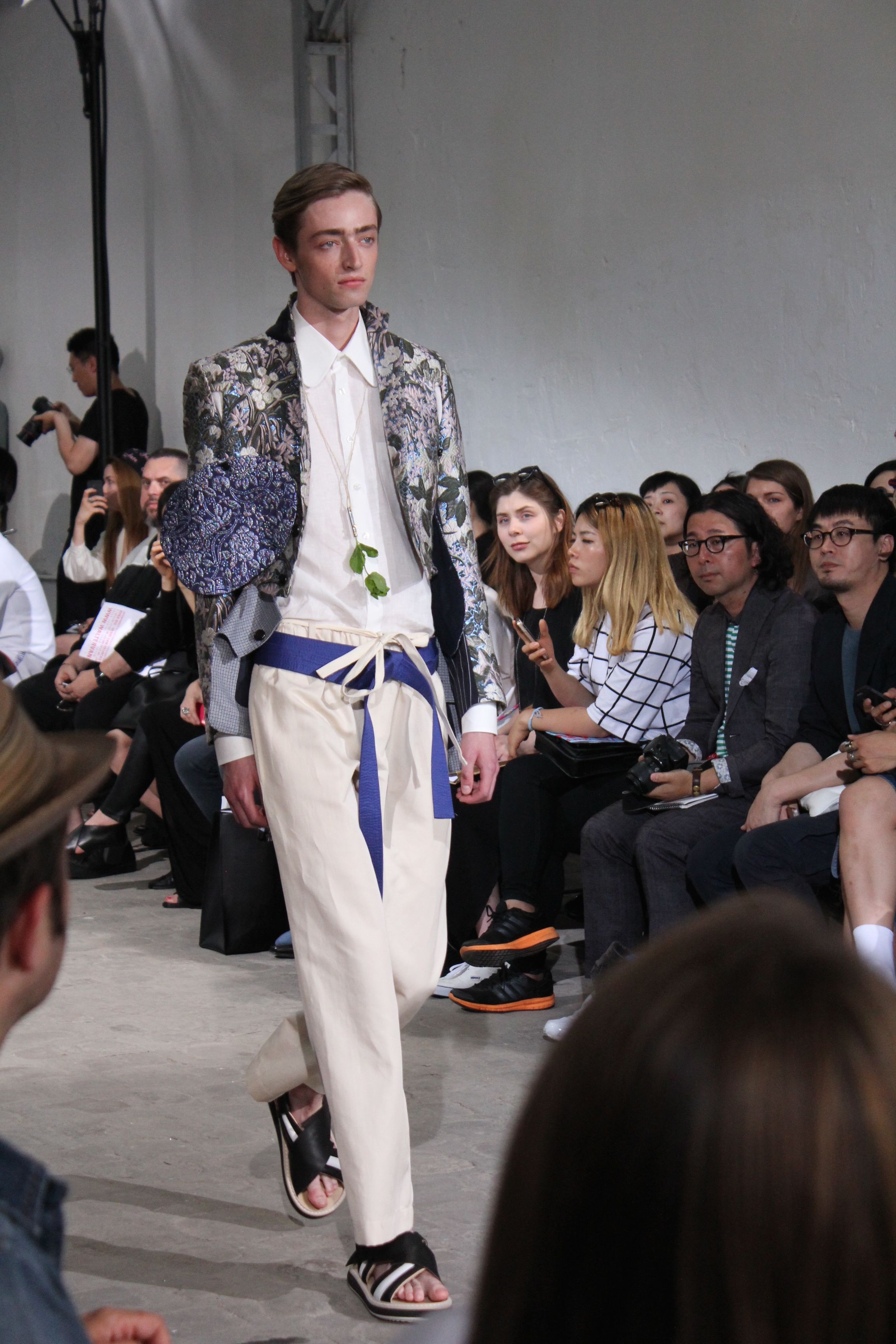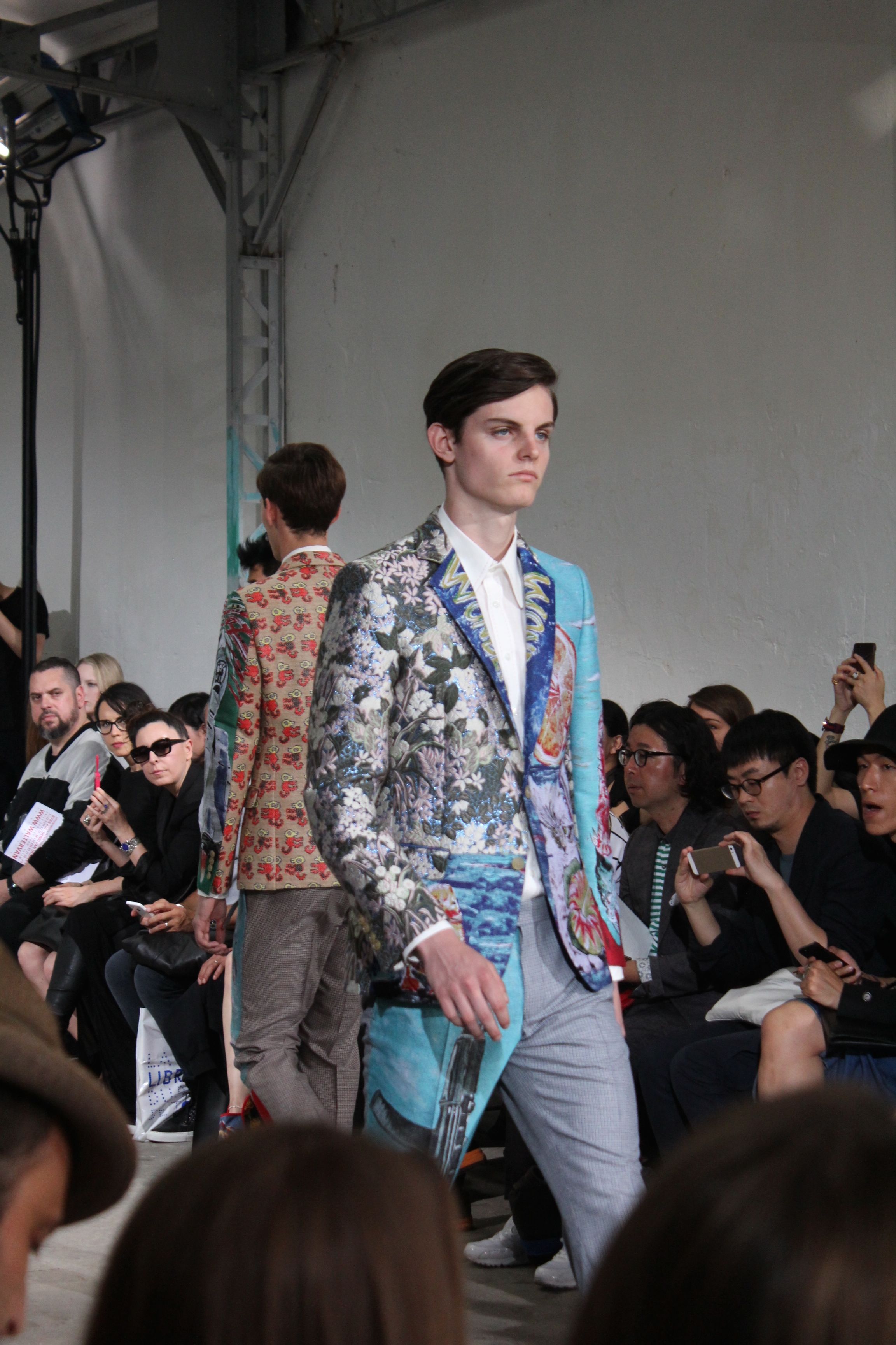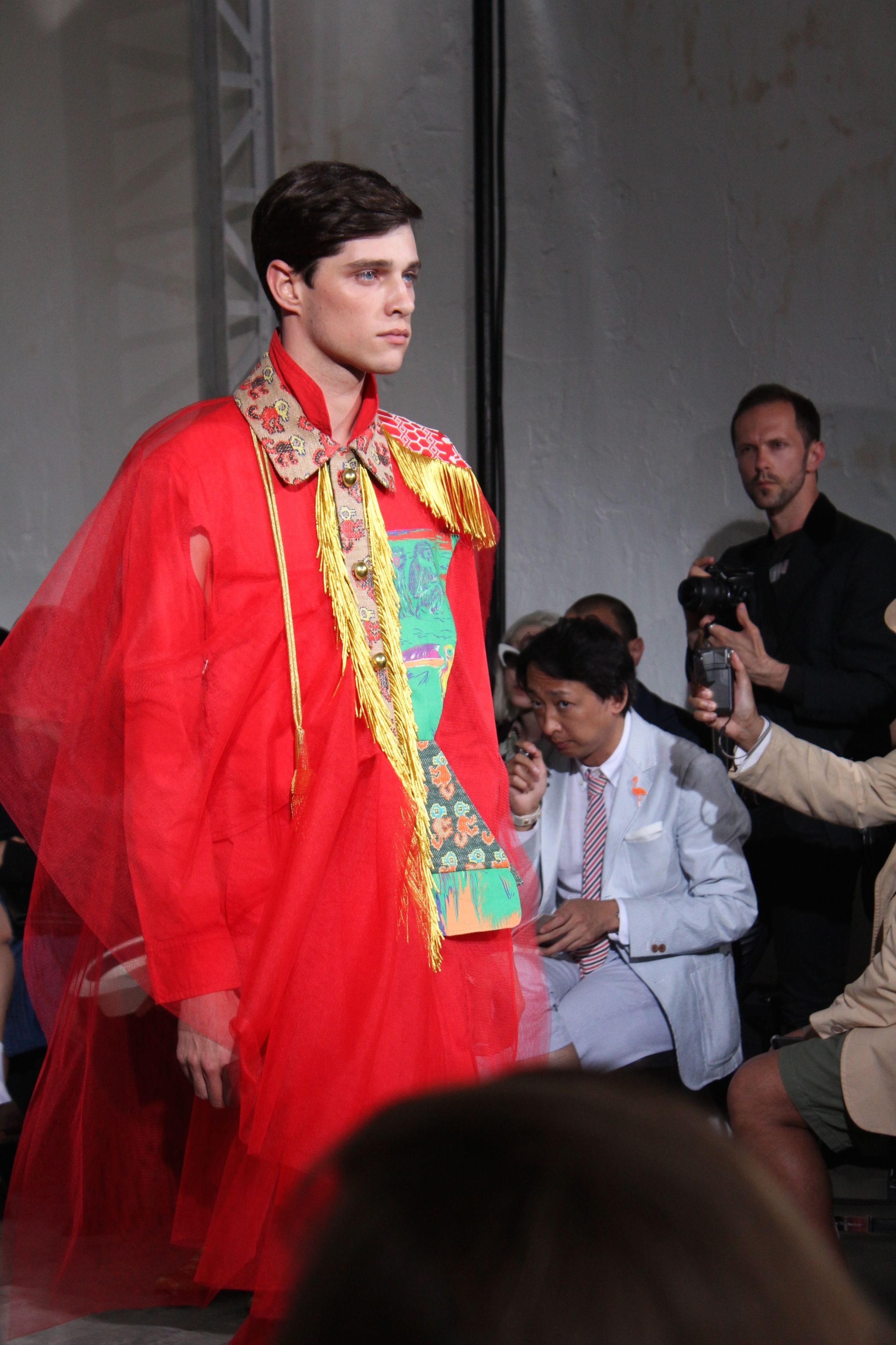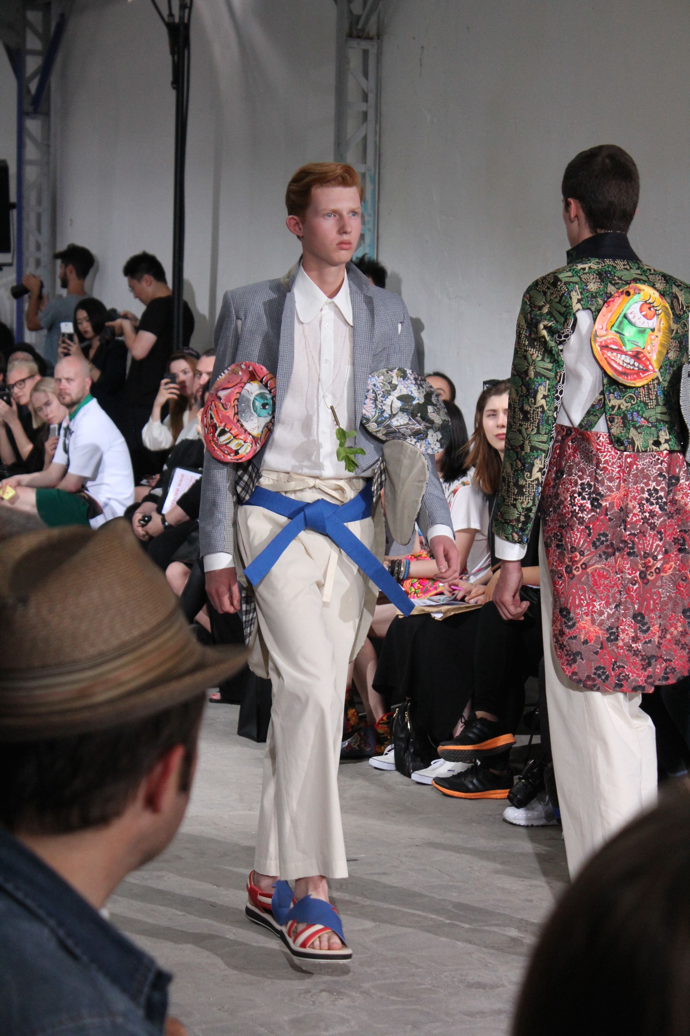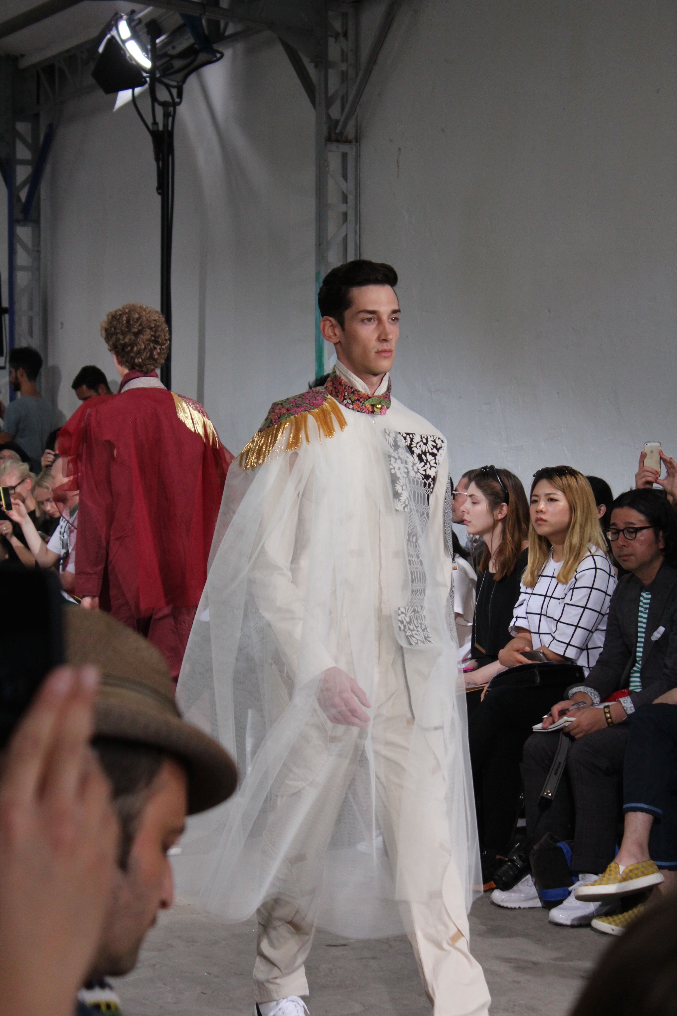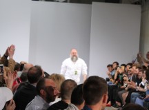 Romantisme et allure conquérante chez Walter Van Beirendonck…Chaque collection de Walter Van Beirendonck est construite au-delà du vêtement. Le créateur anversois profite du défilé pour divulguer des messages sur le monde qui l’entoure, se reflétant sur directement sur son vestiaire. Le dandy romantique prend des allures de conquérant. Les vestes et queues de pie sont construites pour se décomposer grâce à des boutons pression. Les ceintures comme les vestes kimonos et les pantalons amples sont inspirés du monde du judo. Le surfeur tel qu’il est vu par Walter, arrive en fuseau ou combinaison graphique et colorée. On retrouve les essentiels du créateur comme les combinaisons de travailleurs ou les tee-shirts amples. Le travail sur les matières – des brocards aux cotons épais – reste le point de départ, jusqu’à ses peintures imprimées réalisées par l’artiste Scooter Laforge.