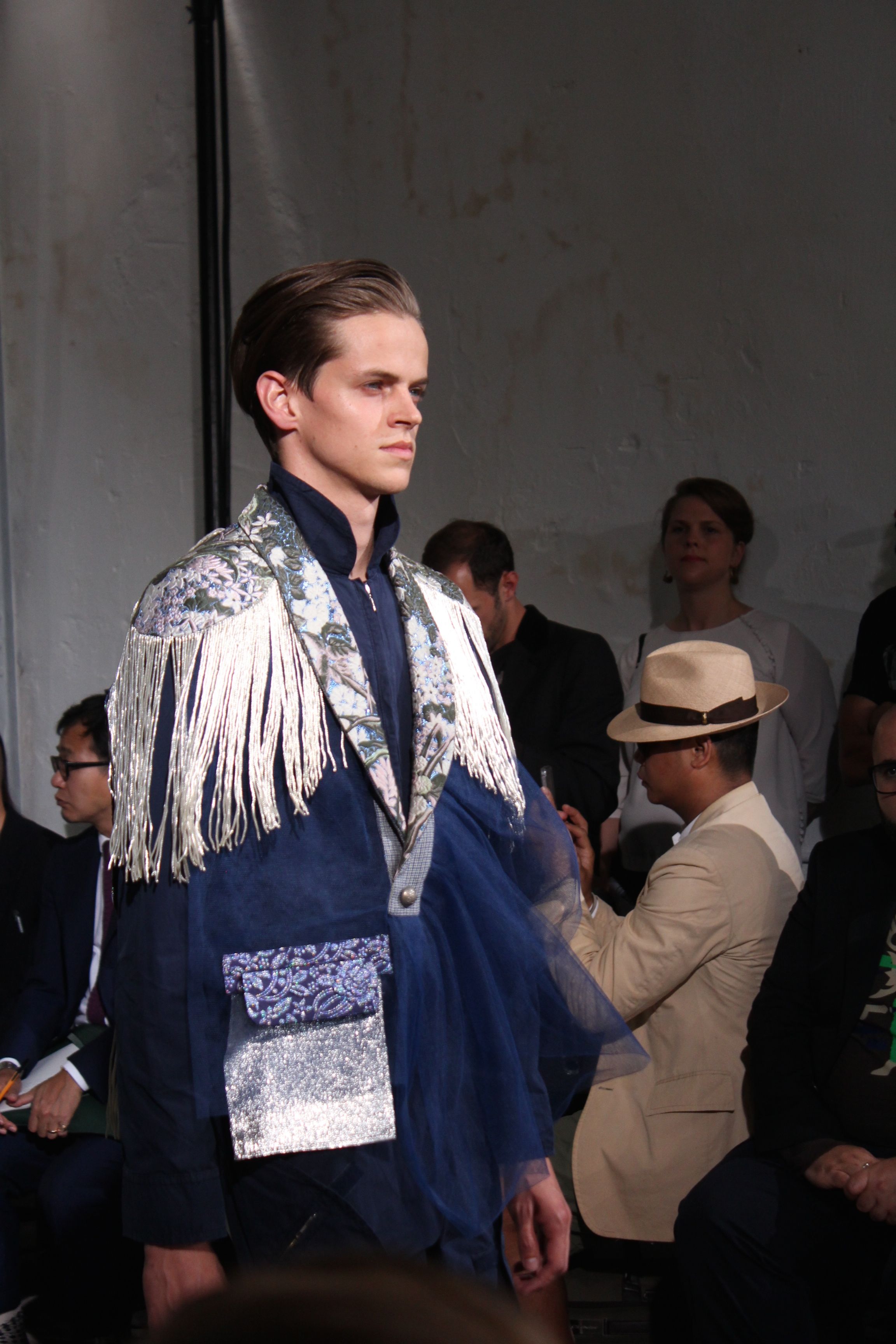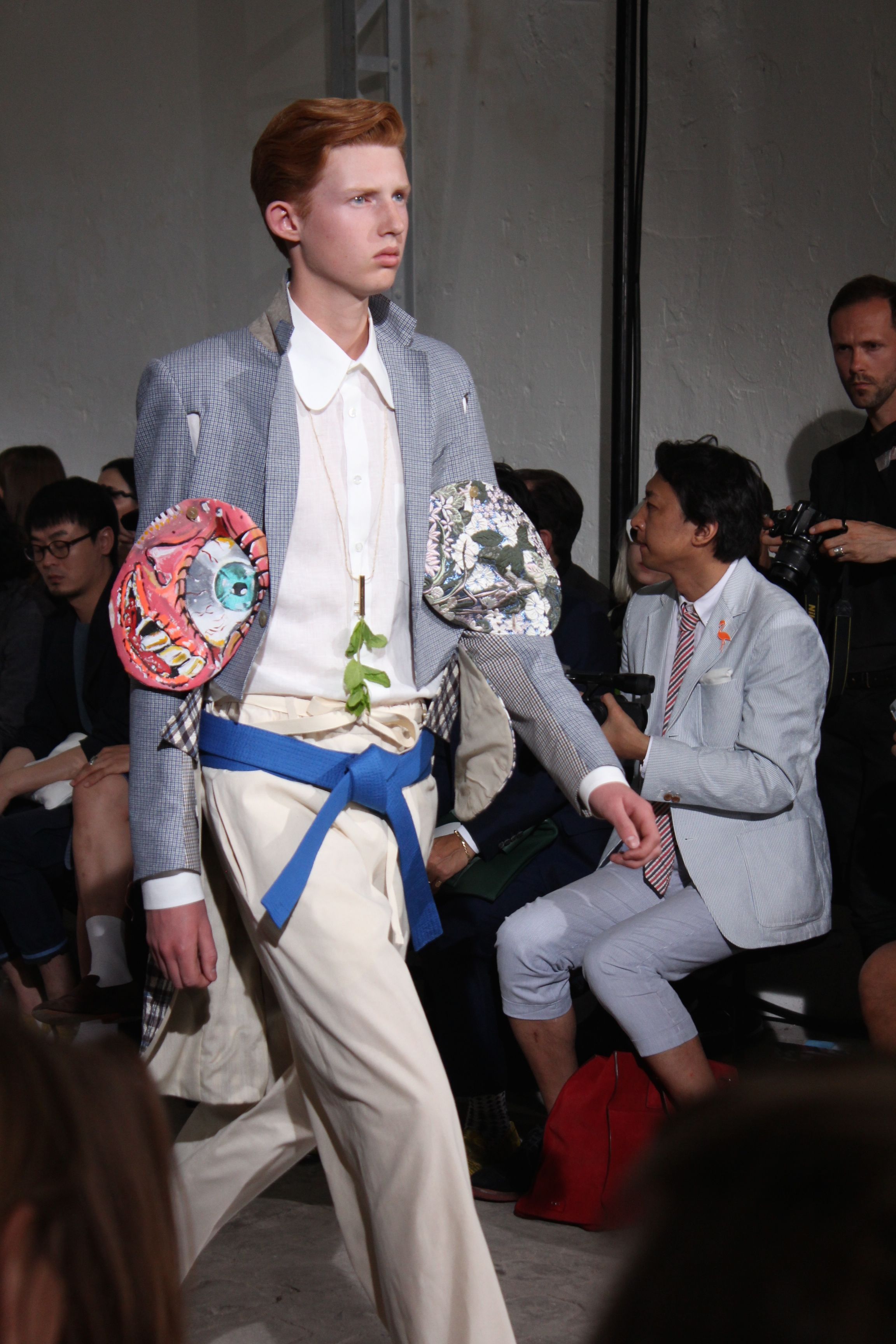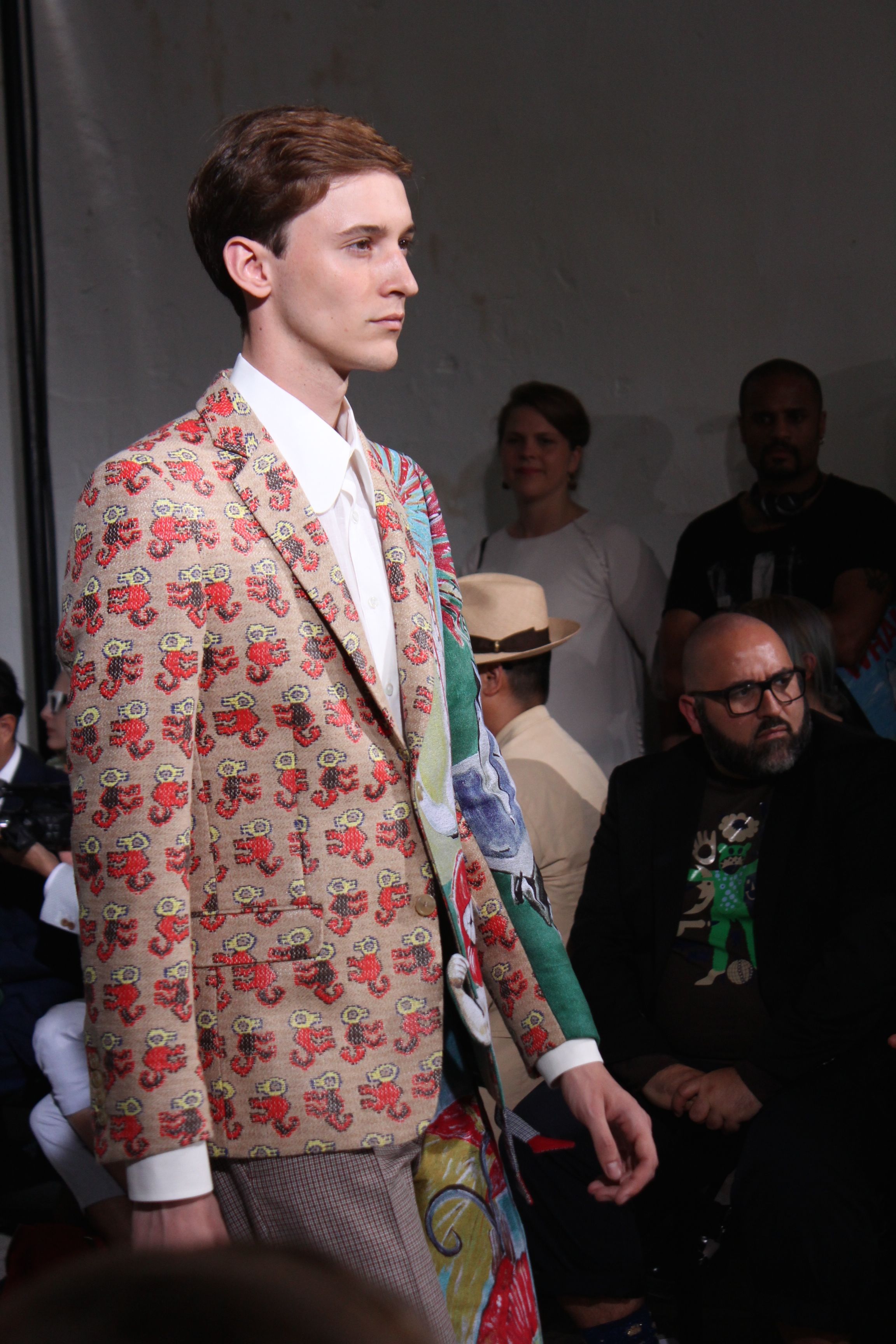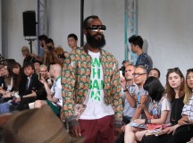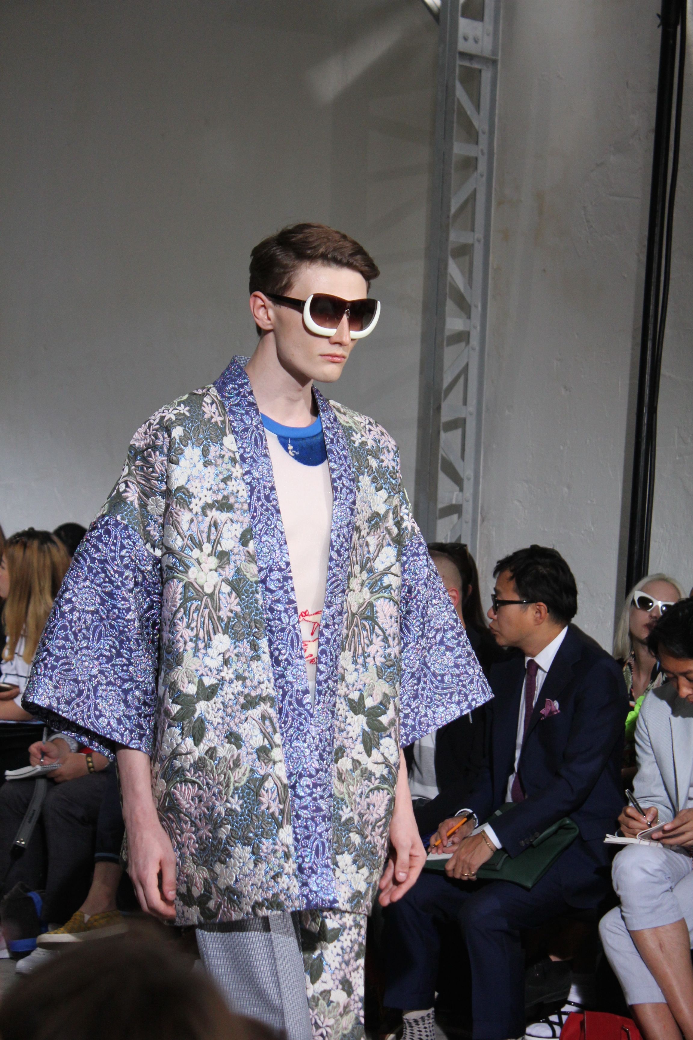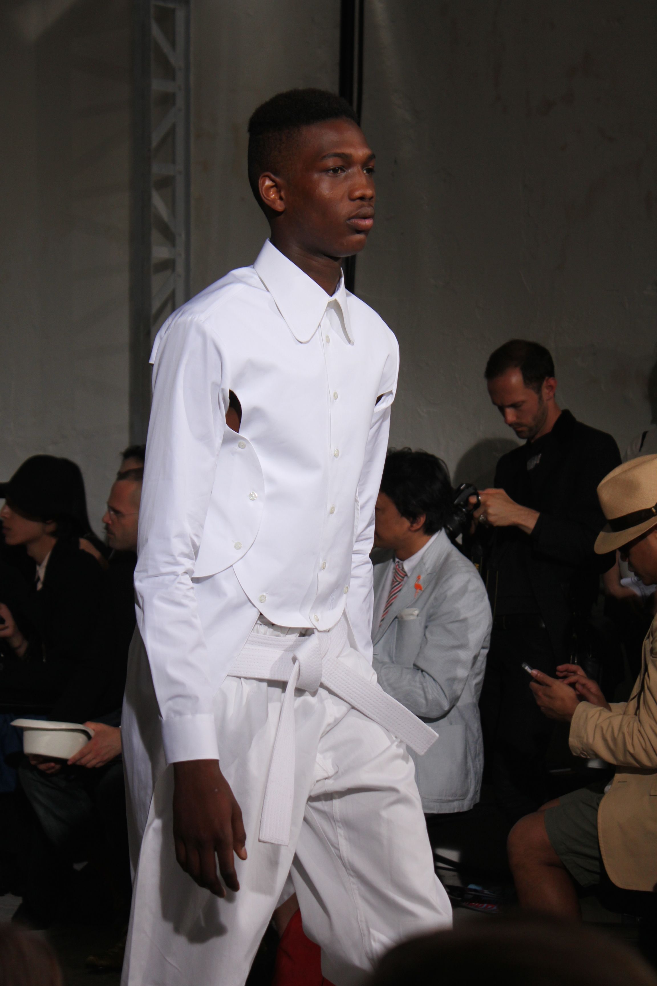 Romantisme et allure conquérante chez Walter Van Beirendonck…Chaque collection de Walter Van Beirendonck est construite au-delà du vêtement. Le créateur anversois profite du défilé pour divulguer des messages sur le monde qui l’entoure, se reflétant sur directement sur son vestiaire. Le dandy romantique prend des allures de conquérant. Les vestes et queues de pie sont construites pour se décomposer grâce à des boutons pression. Les ceintures comme les vestes kimonos et les pantalons amples sont inspirés du monde du judo. Le surfeur tel qu’il est vu par Walter, arrive en fuseau ou combinaison graphique et colorée. On retrouve les essentiels du créateur comme les combinaisons de travailleurs ou les tee-shirts amples. Le travail sur les matières – des brocards aux cotons épais – reste le point de départ, jusqu’à ses peintures imprimées réalisées par l’artiste Scooter Laforge.