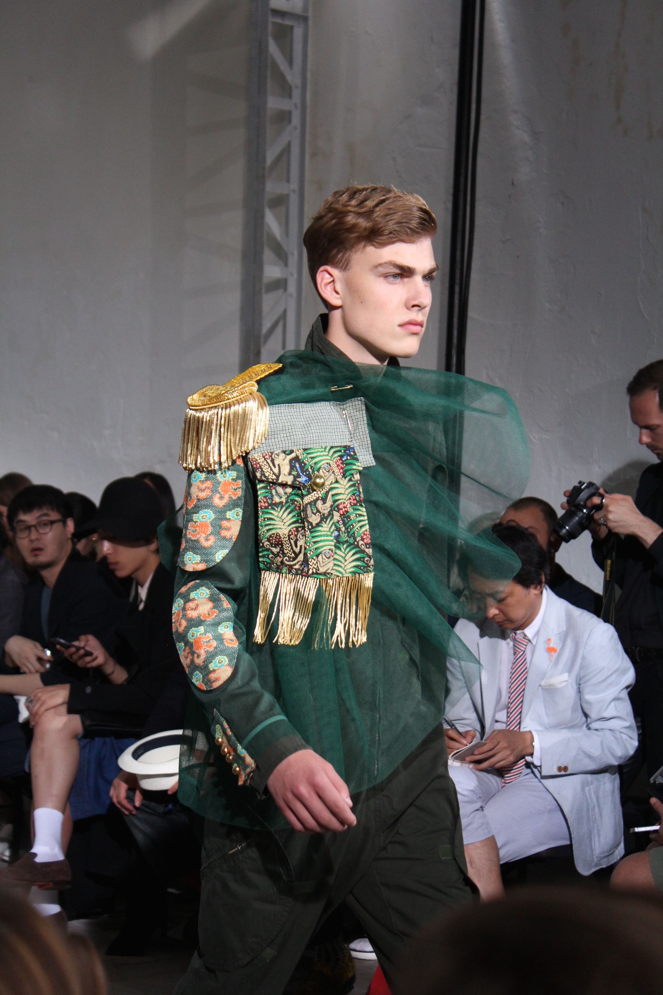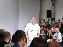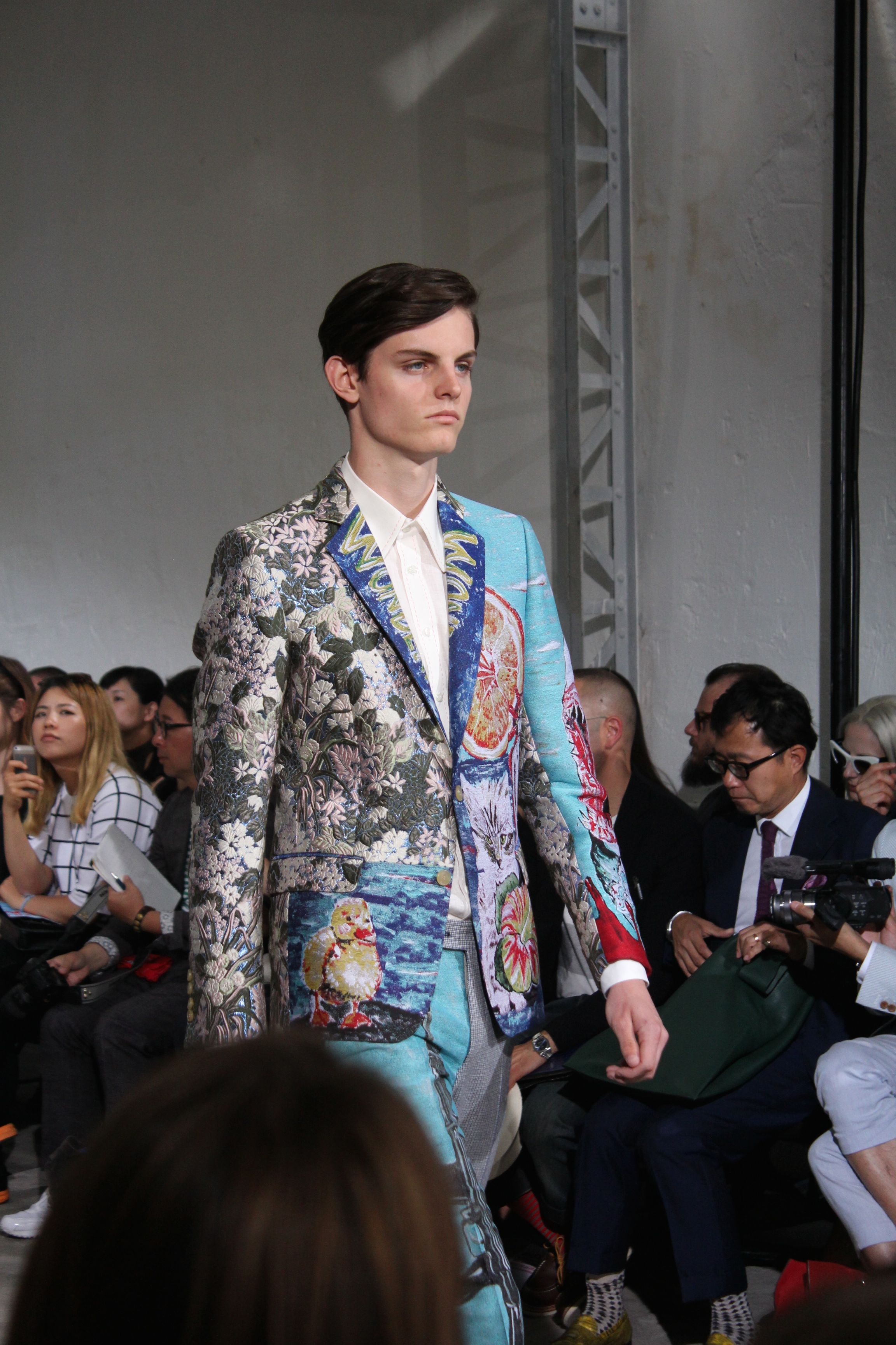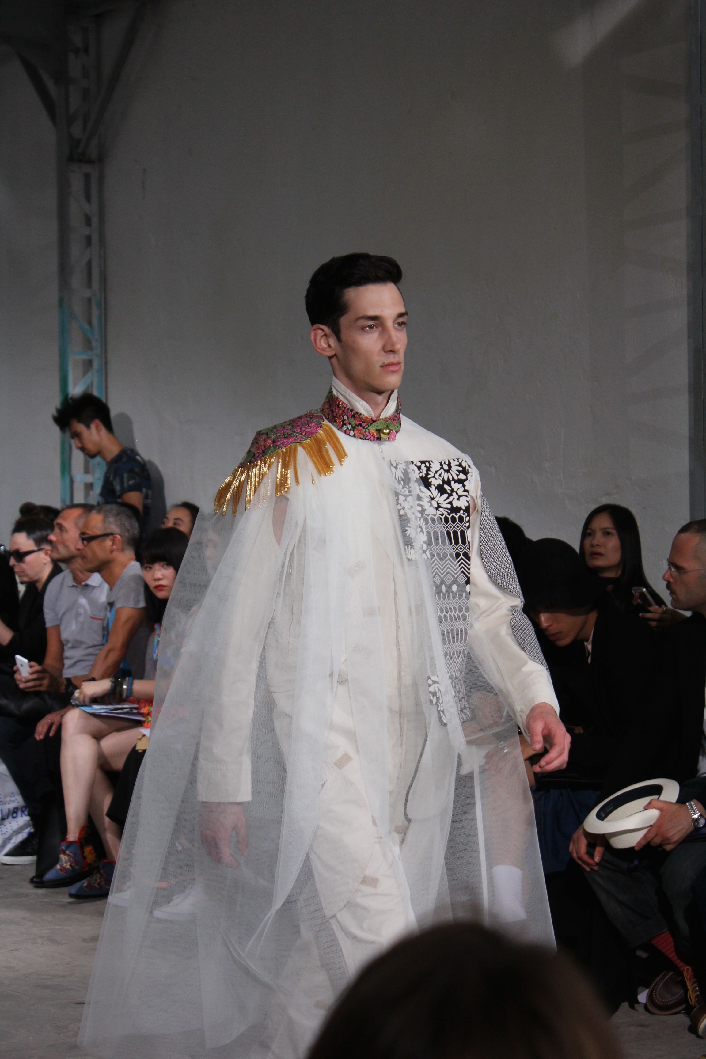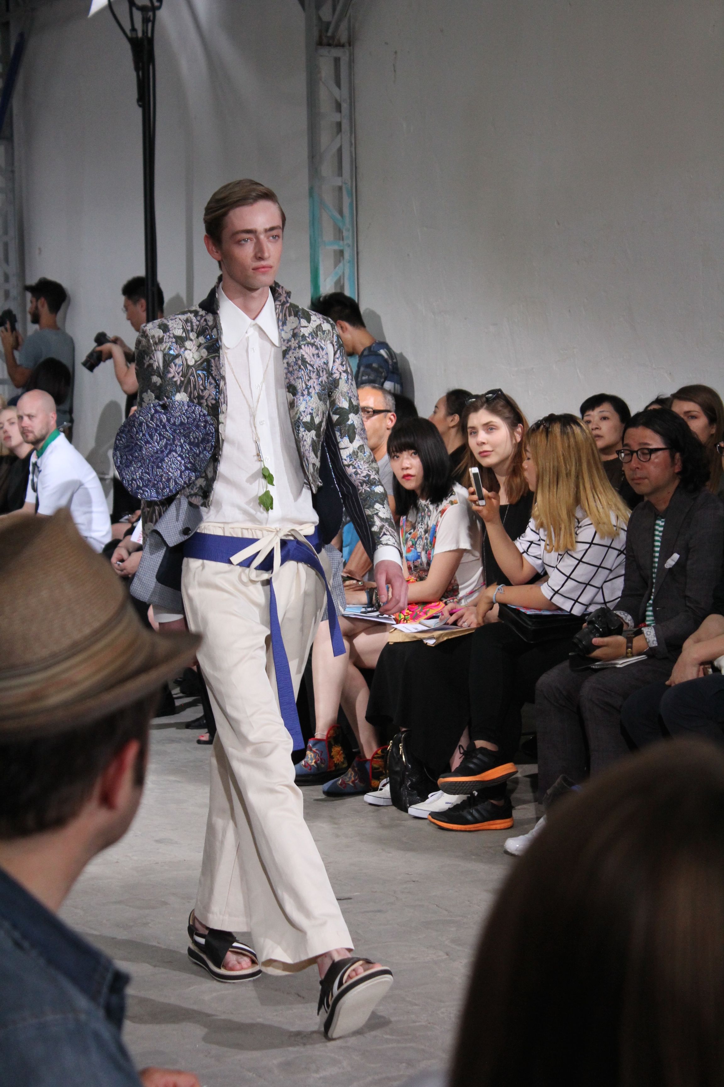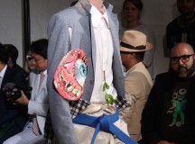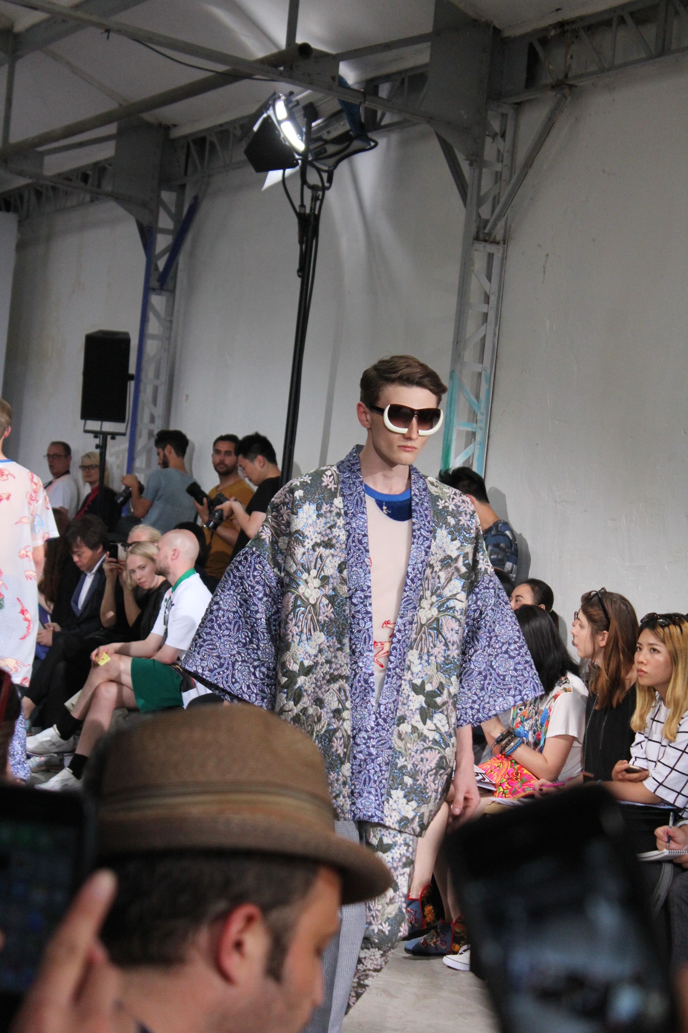 Romantisme et allure conquérante chez Walter Van Beirendonck…Chaque collection de Walter Van Beirendonck est construite au-delà du vêtement. Le créateur anversois profite du défilé pour divulguer des messages sur le monde qui l’entoure, se reflétant sur directement sur son vestiaire. Le dandy romantique prend des allures de conquérant. Les vestes et queues de pie sont construites pour se décomposer grâce à des boutons pression. Les ceintures comme les vestes kimonos et les pantalons amples sont inspirés du monde du judo. Le surfeur tel qu’il est vu par Walter, arrive en fuseau ou combinaison graphique et colorée. On retrouve les essentiels du créateur comme les combinaisons de travailleurs ou les tee-shirts amples. Le travail sur les matières – des brocards aux cotons épais – reste le point de départ, jusqu’à ses peintures imprimées réalisées par l’artiste Scooter Laforge.