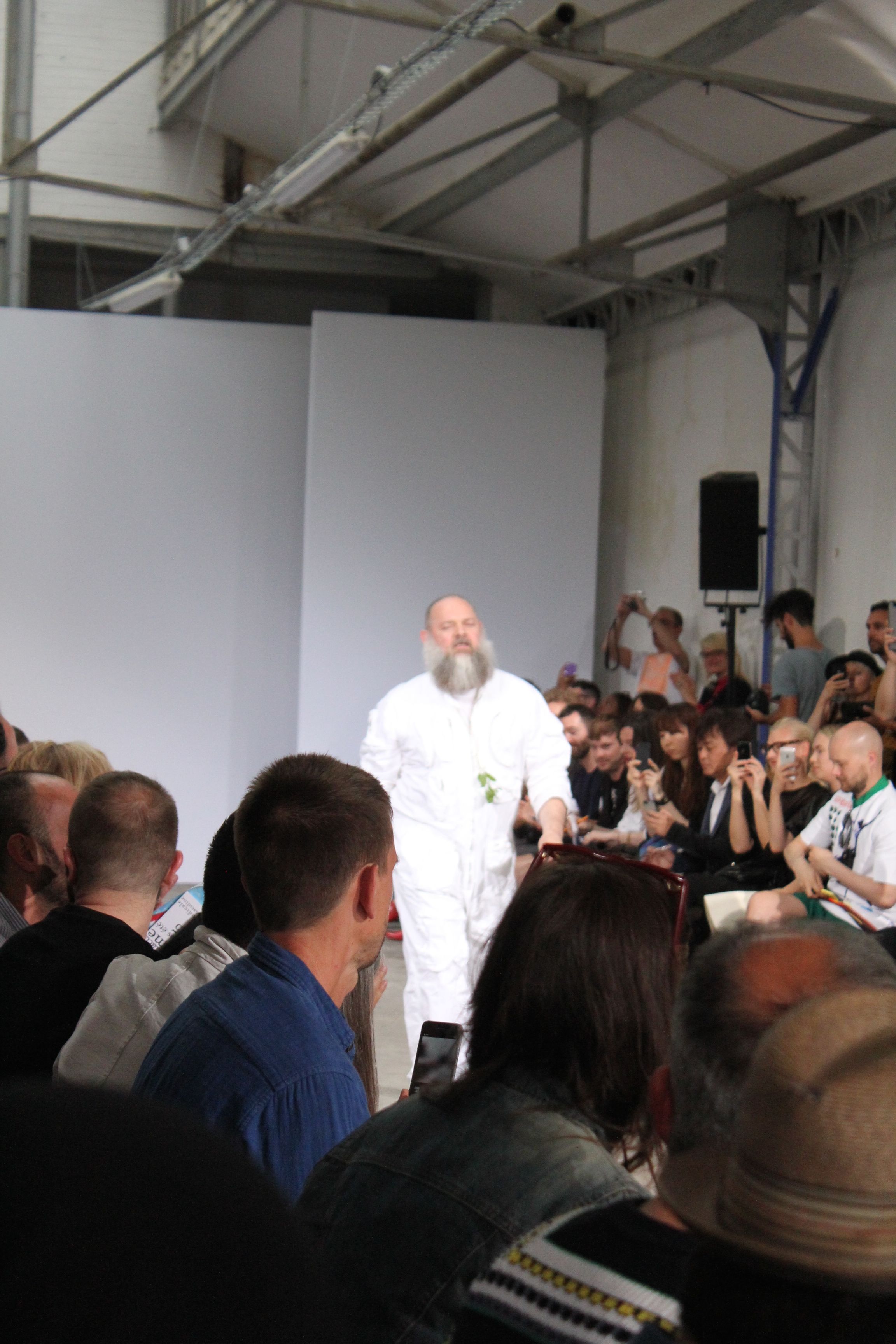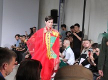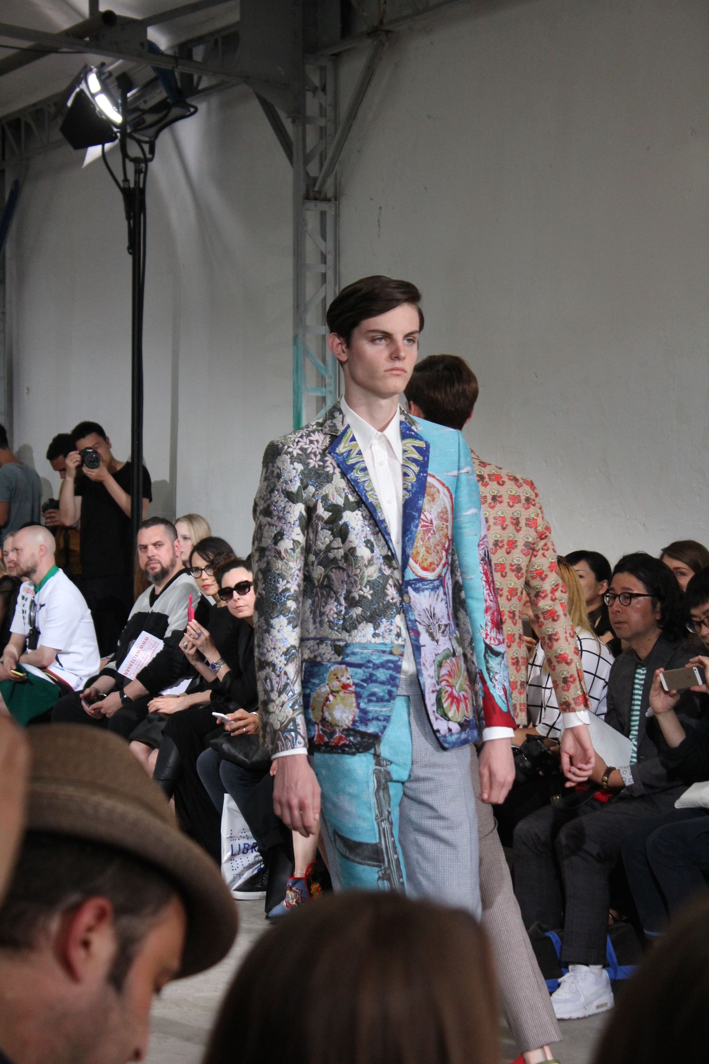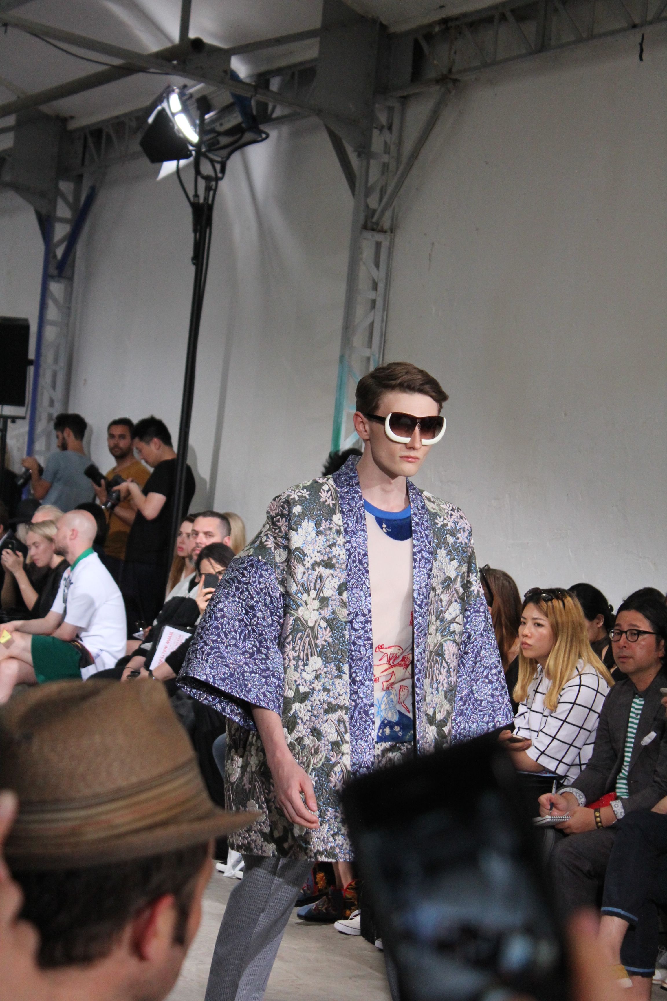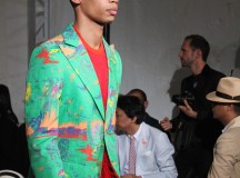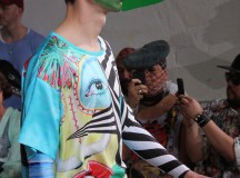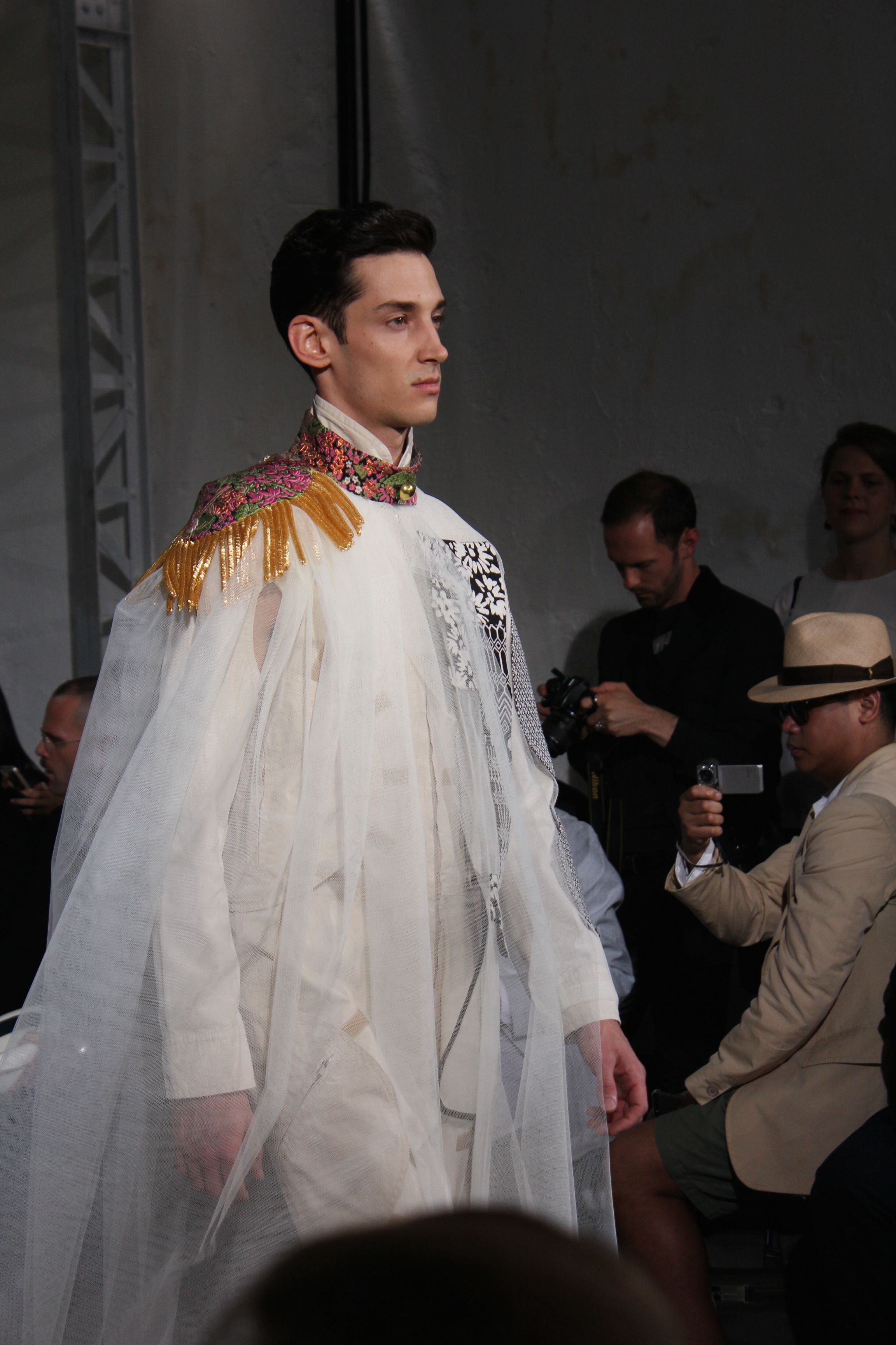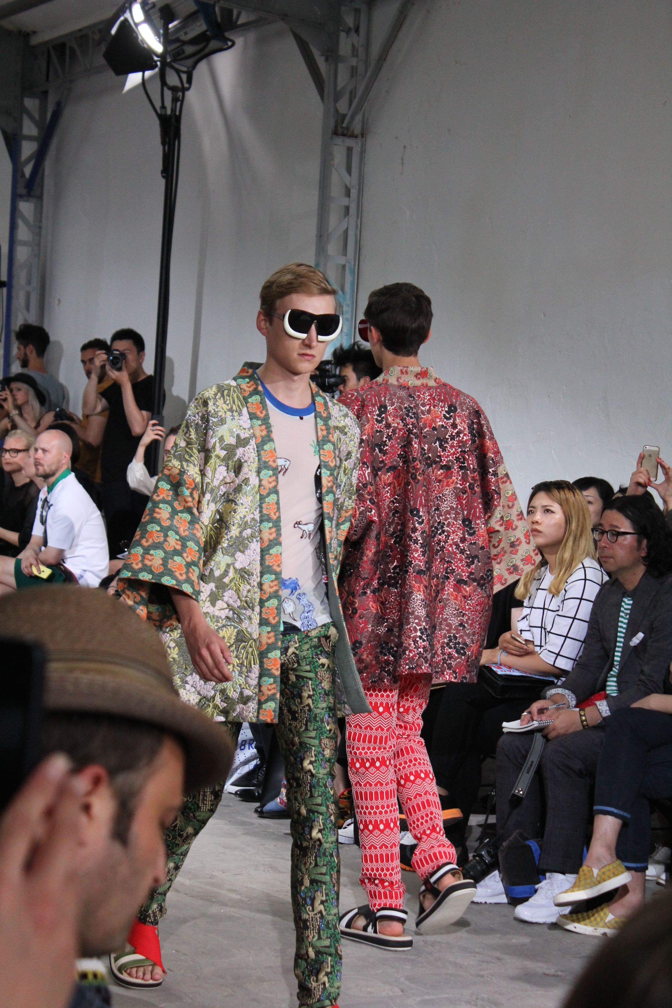 Romantisme et allure conquérante chez Walter Van Beirendonck…Chaque collection de Walter Van Beirendonck est construite au-delà du vêtement. Le créateur anversois profite du défilé pour divulguer des messages sur le monde qui l’entoure, se reflétant sur directement sur son vestiaire. Le dandy romantique prend des allures de conquérant. Les vestes et queues de pie sont construites pour se décomposer grâce à des boutons pression. Les ceintures comme les vestes kimonos et les pantalons amples sont inspirés du monde du judo. Le surfeur tel qu’il est vu par Walter, arrive en fuseau ou combinaison graphique et colorée. On retrouve les essentiels du créateur comme les combinaisons de travailleurs ou les tee-shirts amples. Le travail sur les matières – des brocards aux cotons épais – reste le point de départ, jusqu’à ses peintures imprimées réalisées par l’artiste Scooter Laforge.