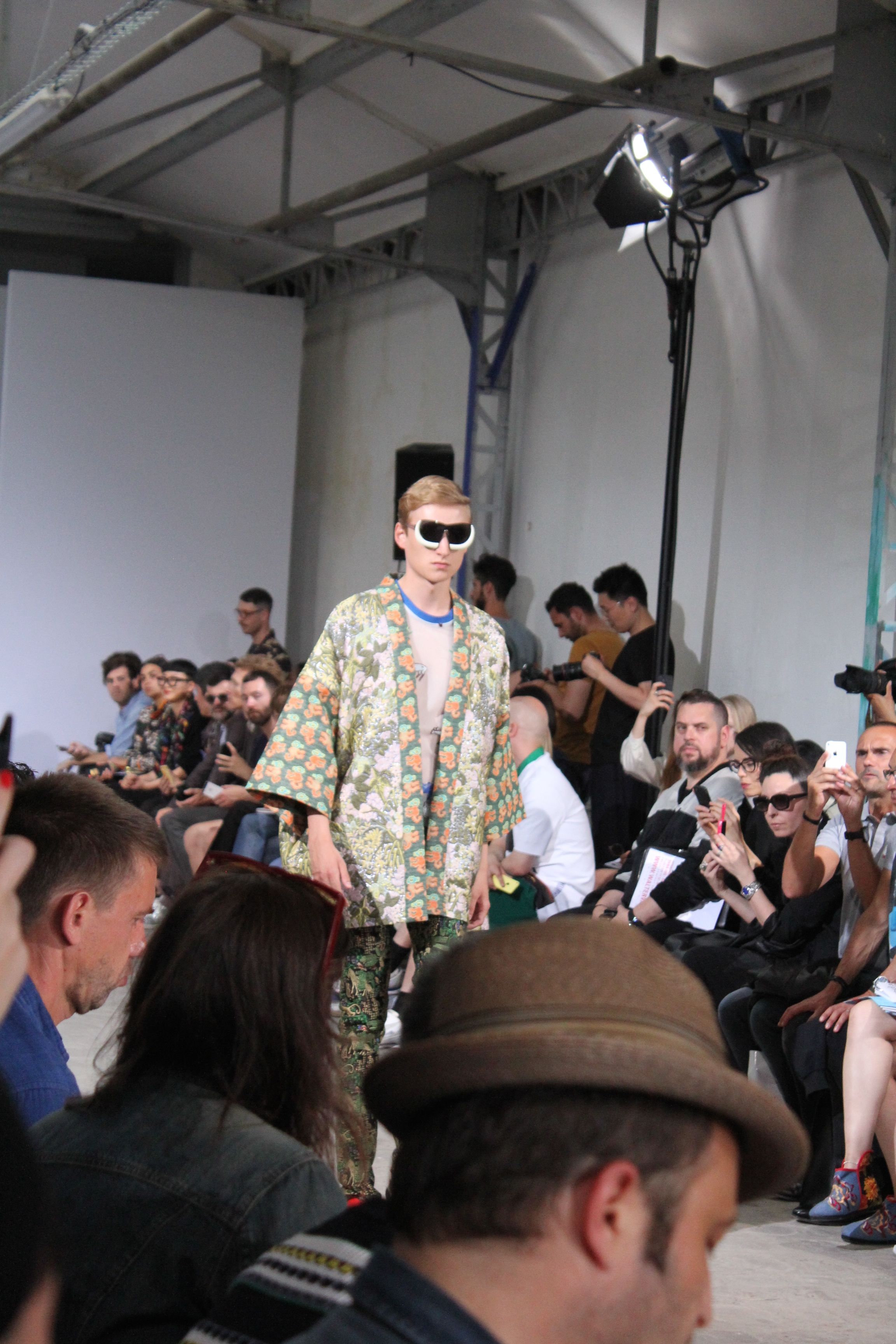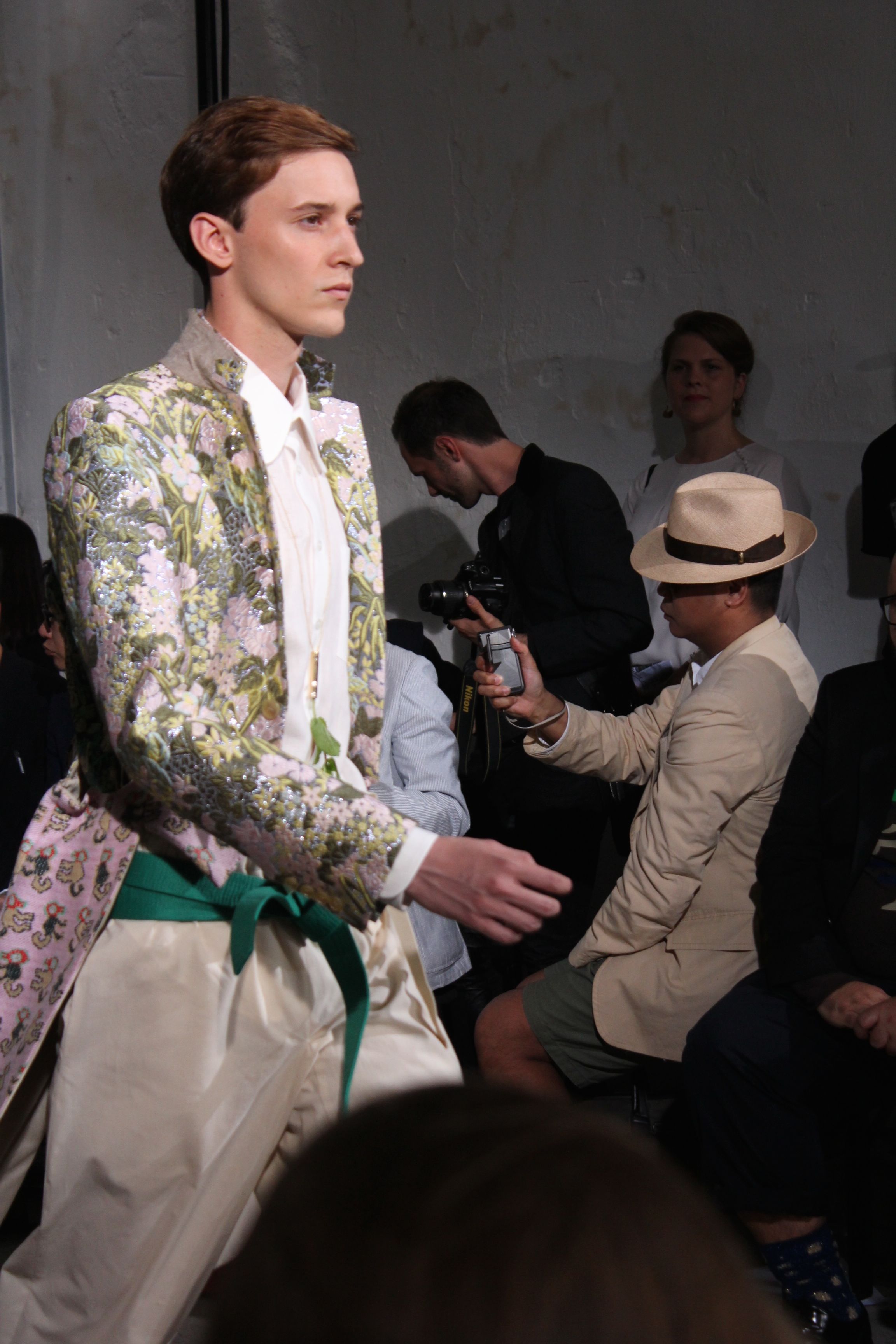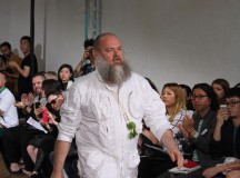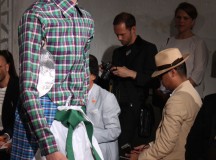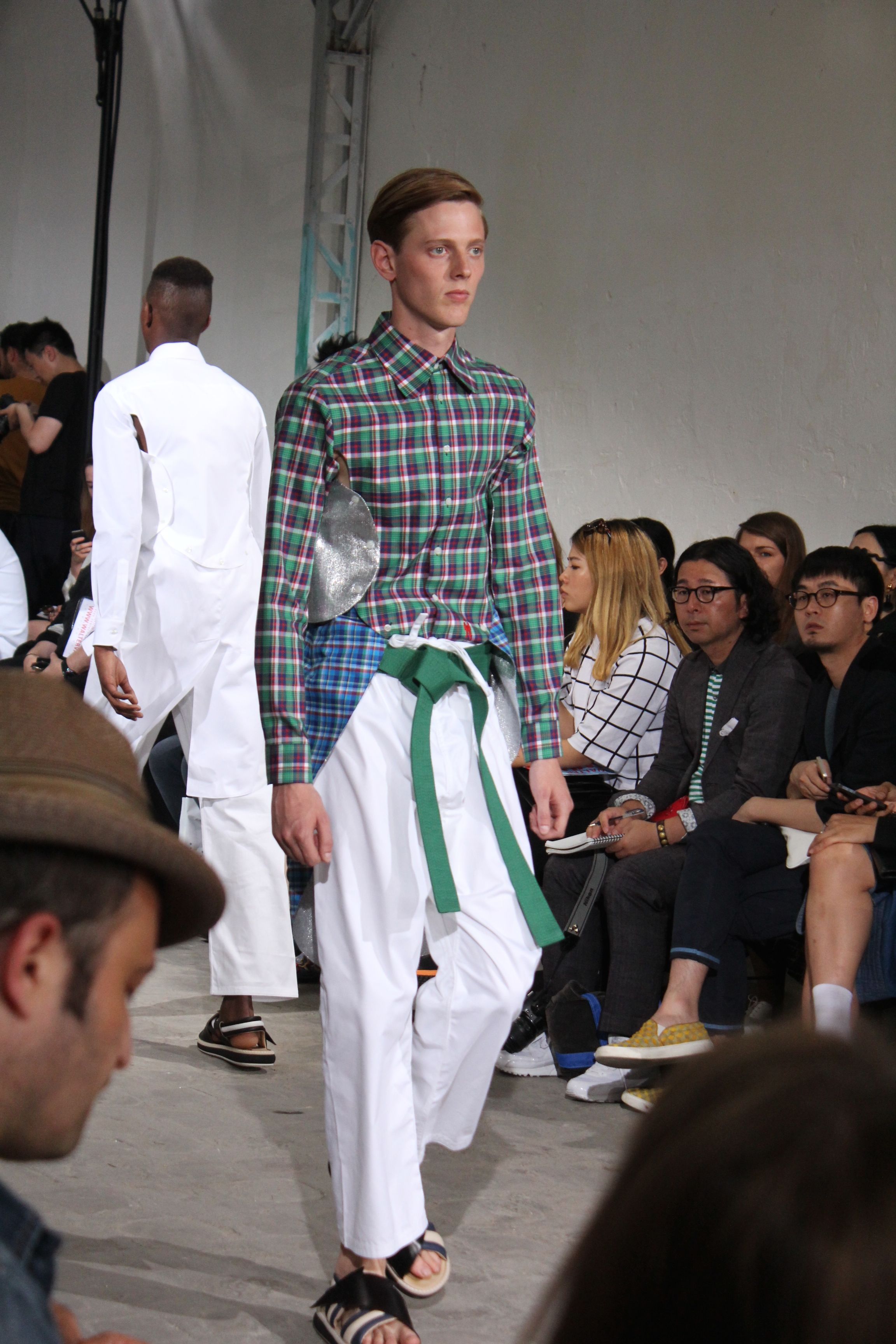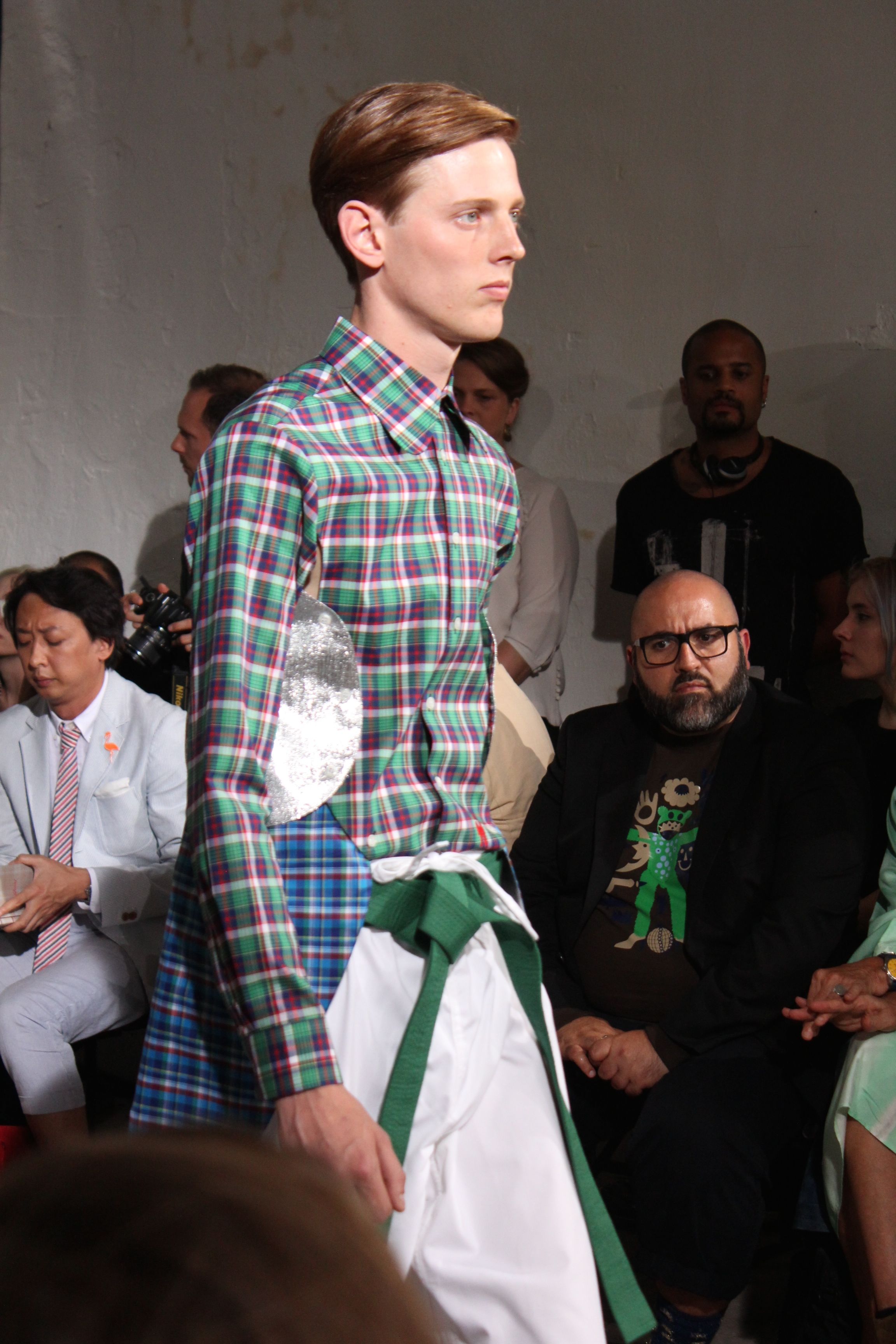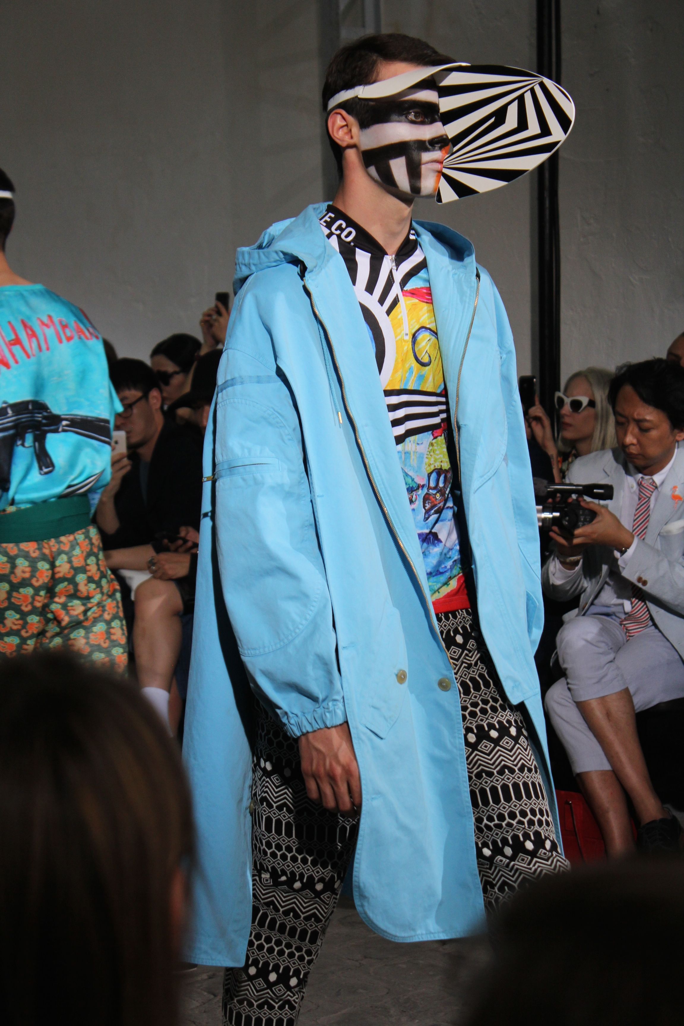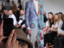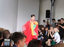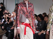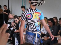 Romantisme et allure conquérante chez Walter Van Beirendonck…Chaque collection de Walter Van Beirendonck est construite au-delà du vêtement. Le créateur anversois profite du défilé pour divulguer des messages sur le monde qui l’entoure, se reflétant sur directement sur son vestiaire. Le dandy romantique prend des allures de conquérant. Les vestes et queues de pie sont construites pour se décomposer grâce à des boutons pression. Les ceintures comme les vestes kimonos et les pantalons amples sont inspirés du monde du judo. Le surfeur tel qu’il est vu par Walter, arrive en fuseau ou combinaison graphique et colorée. On retrouve les essentiels du créateur comme les combinaisons de travailleurs ou les tee-shirts amples. Le travail sur les matières – des brocards aux cotons épais – reste le point de départ, jusqu’à ses peintures imprimées réalisées par l’artiste Scooter Laforge.