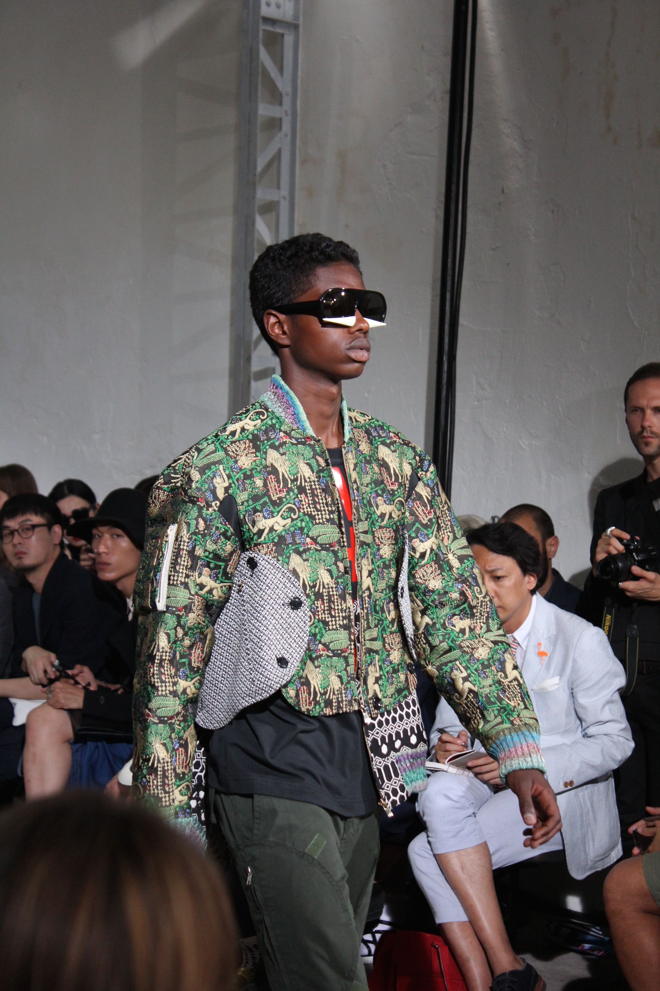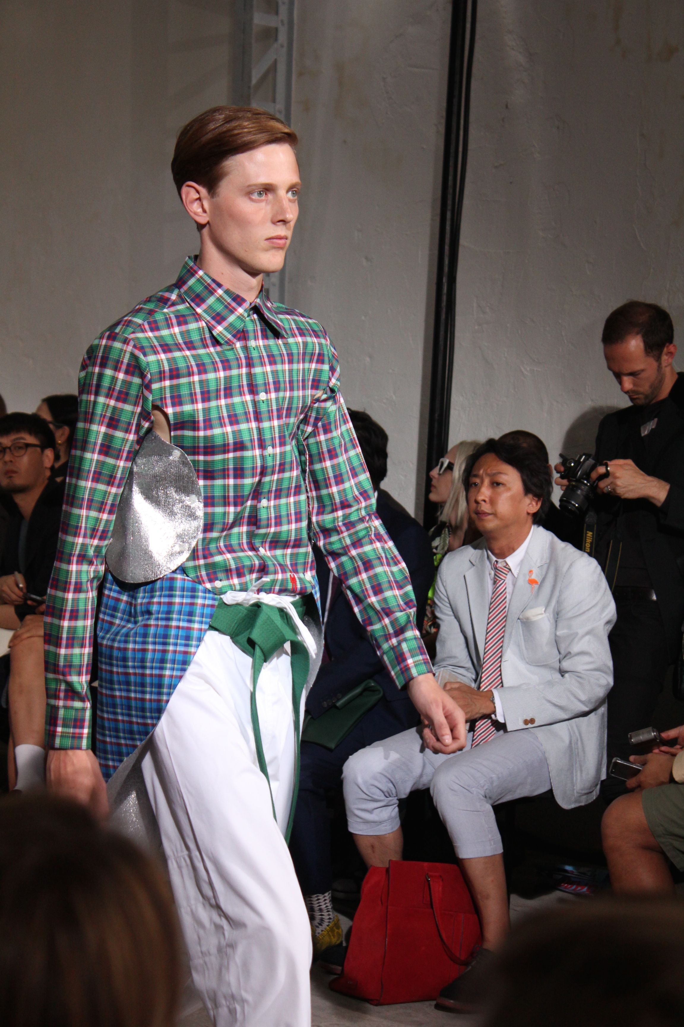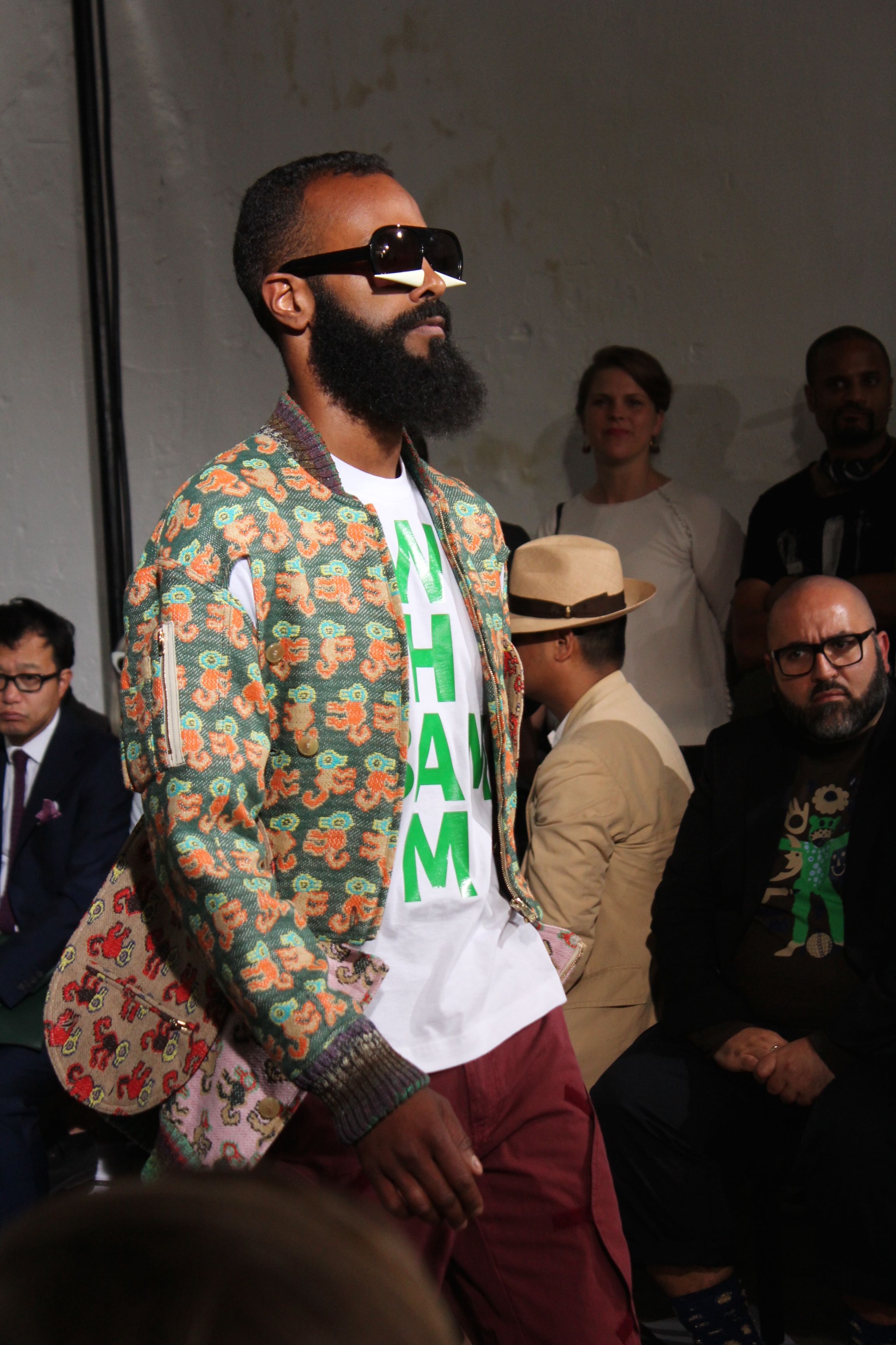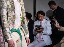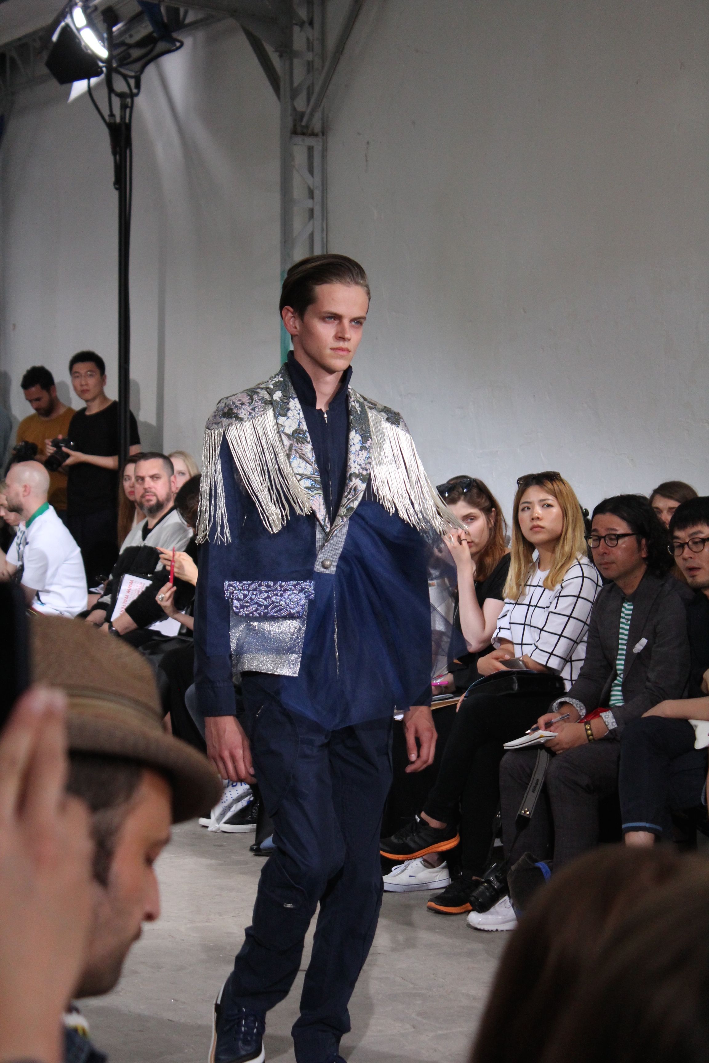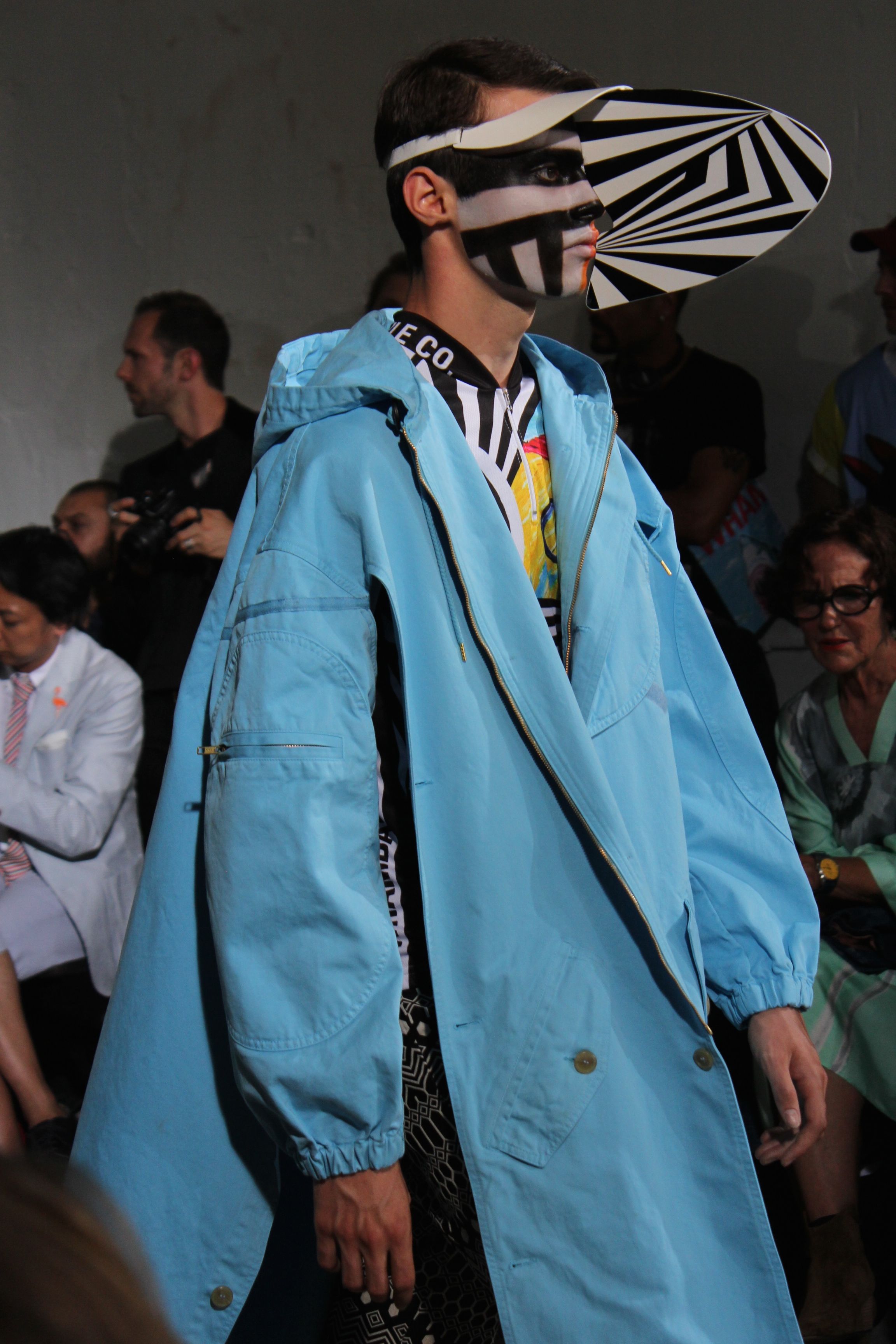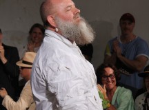 Romantisme et allure conquérante chez Walter Van Beirendonck…Chaque collection de Walter Van Beirendonck est construite au-delà du vêtement. Le créateur anversois profite du défilé pour divulguer des messages sur le monde qui l’entoure, se reflétant sur directement sur son vestiaire. Le dandy romantique prend des allures de conquérant. Les vestes et queues de pie sont construites pour se décomposer grâce à des boutons pression. Les ceintures comme les vestes kimonos et les pantalons amples sont inspirés du monde du judo. Le surfeur tel qu’il est vu par Walter, arrive en fuseau ou combinaison graphique et colorée. On retrouve les essentiels du créateur comme les combinaisons de travailleurs ou les tee-shirts amples. Le travail sur les matières – des brocards aux cotons épais – reste le point de départ, jusqu’à ses peintures imprimées réalisées par l’artiste Scooter Laforge.