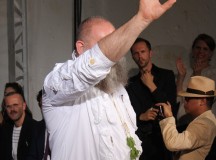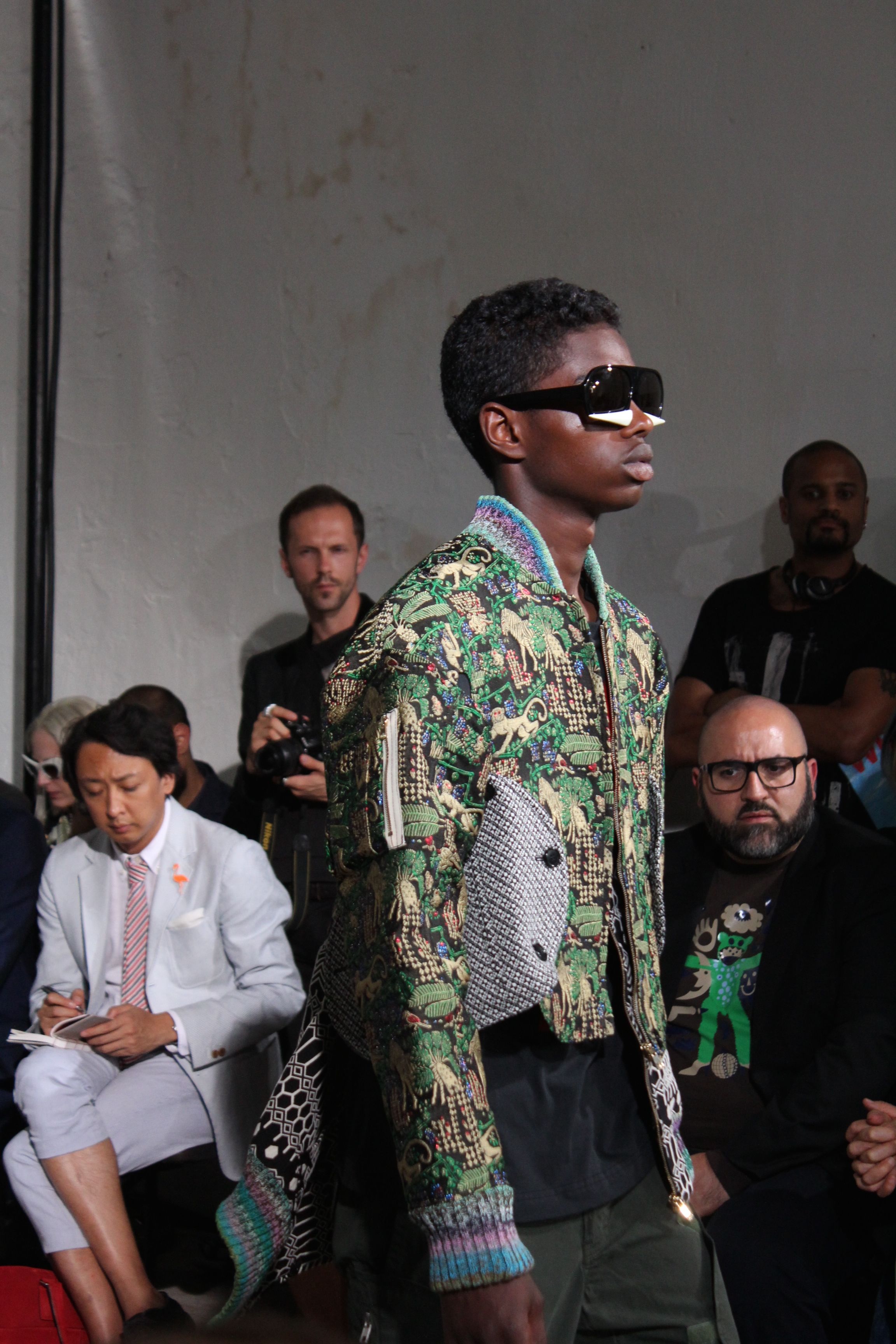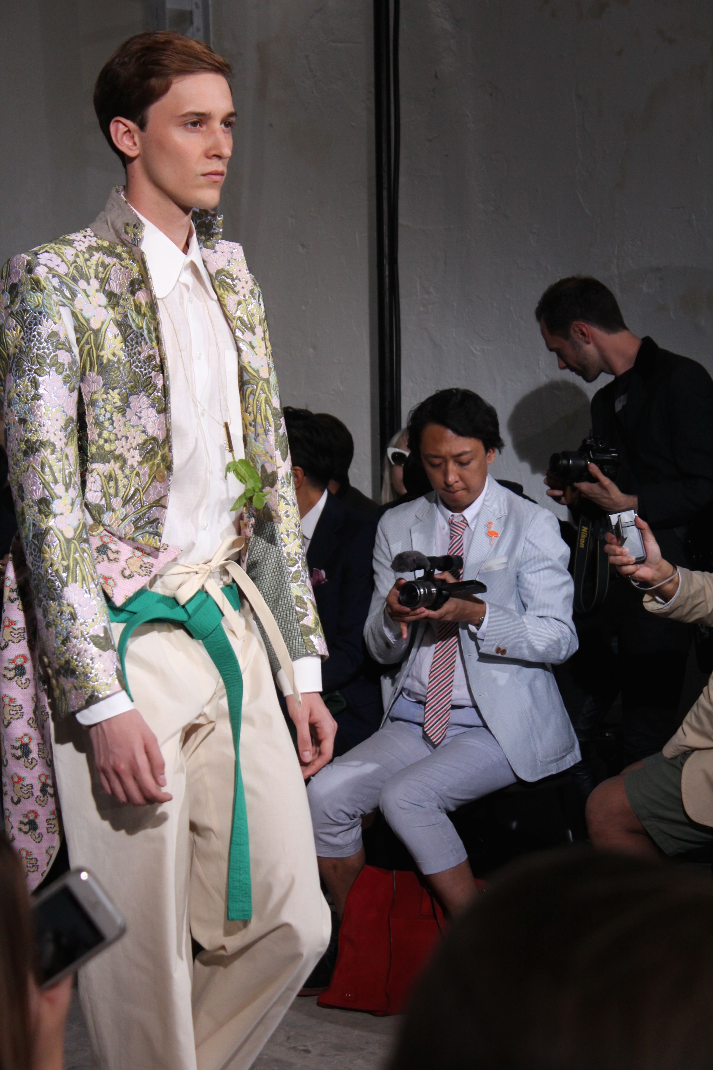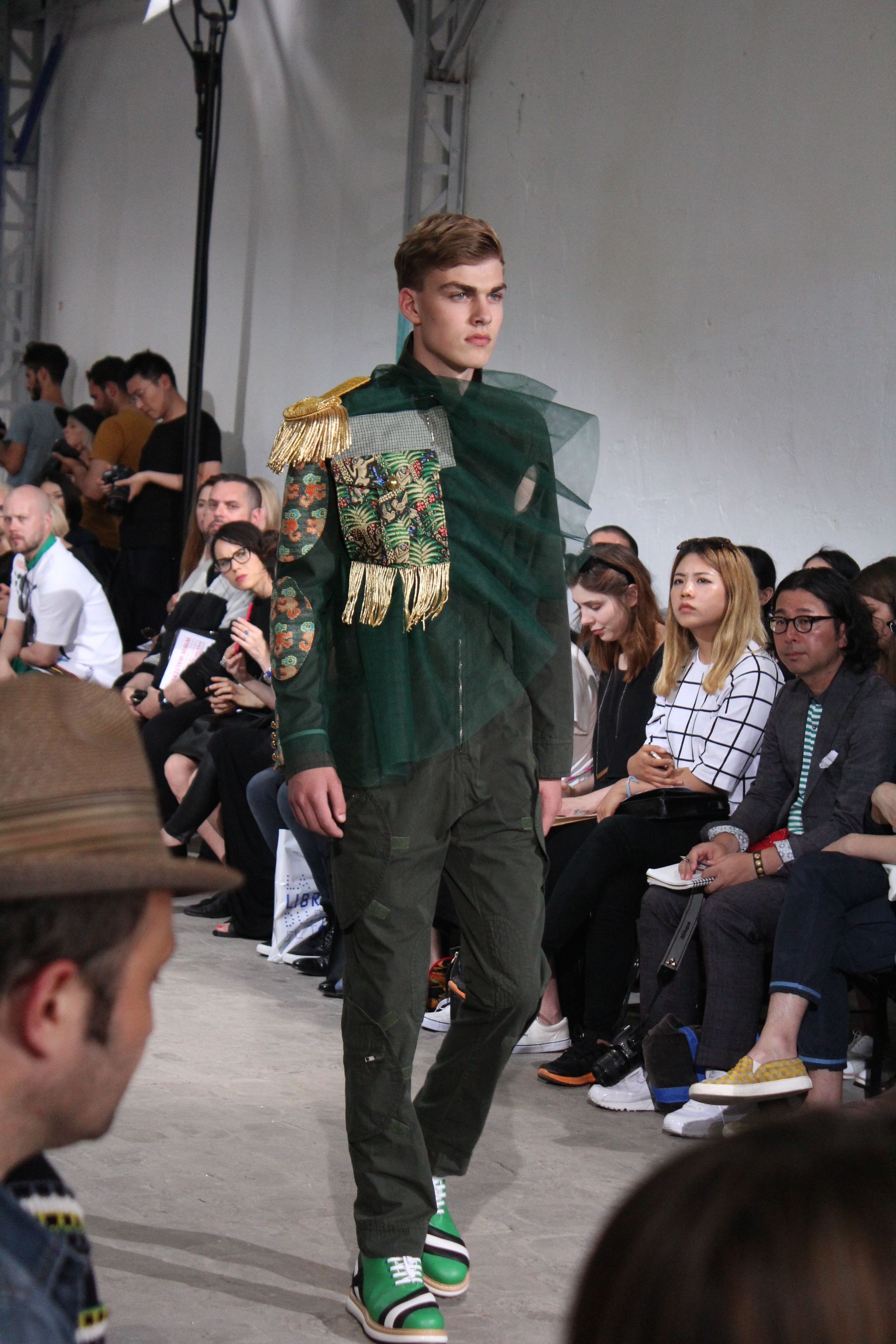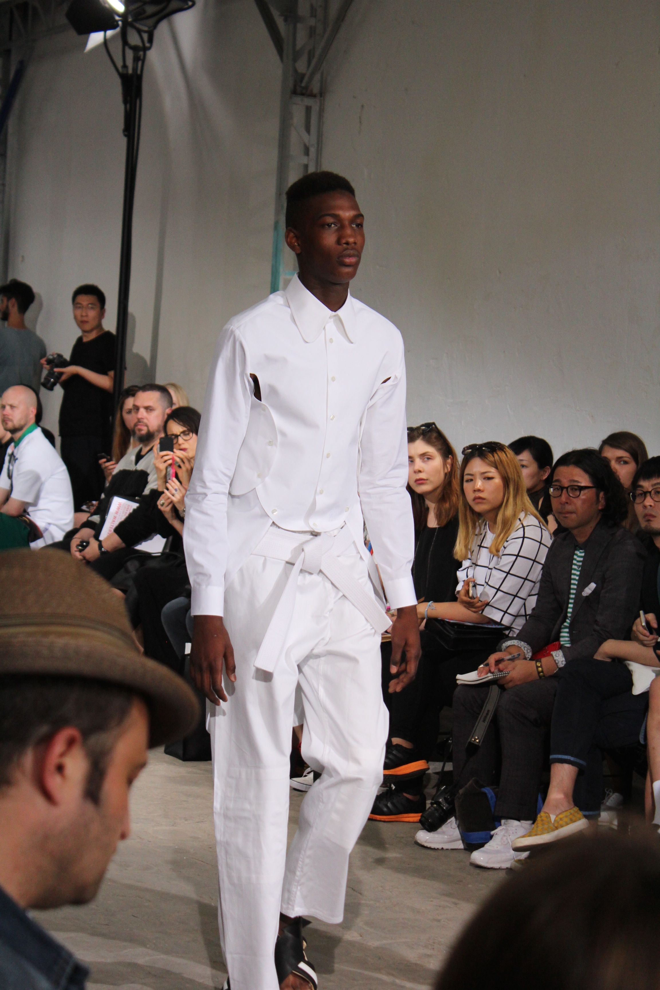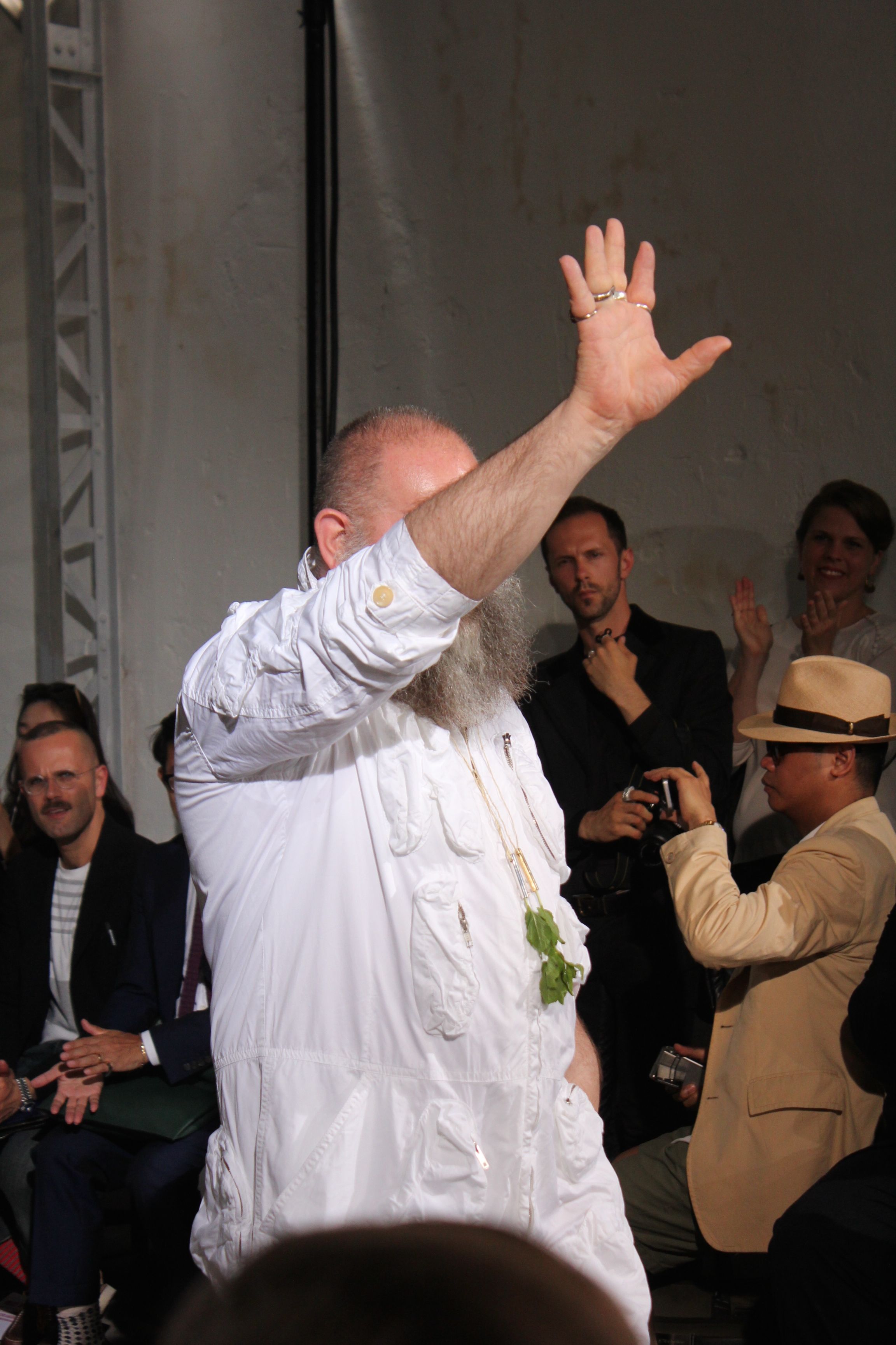 Romantisme et allure conquérante chez Walter Van Beirendonck…Chaque collection de Walter Van Beirendonck est construite au-delà du vêtement. Le créateur anversois profite du défilé pour divulguer des messages sur le monde qui l’entoure, se reflétant sur directement sur son vestiaire. Le dandy romantique prend des allures de conquérant. Les vestes et queues de pie sont construites pour se décomposer grâce à des boutons pression. Les ceintures comme les vestes kimonos et les pantalons amples sont inspirés du monde du judo. Le surfeur tel qu’il est vu par Walter, arrive en fuseau ou combinaison graphique et colorée. On retrouve les essentiels du créateur comme les combinaisons de travailleurs ou les tee-shirts amples. Le travail sur les matières – des brocards aux cotons épais – reste le point de départ, jusqu’à ses peintures imprimées réalisées par l’artiste Scooter Laforge.