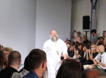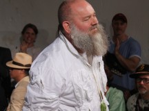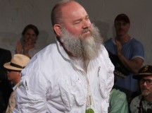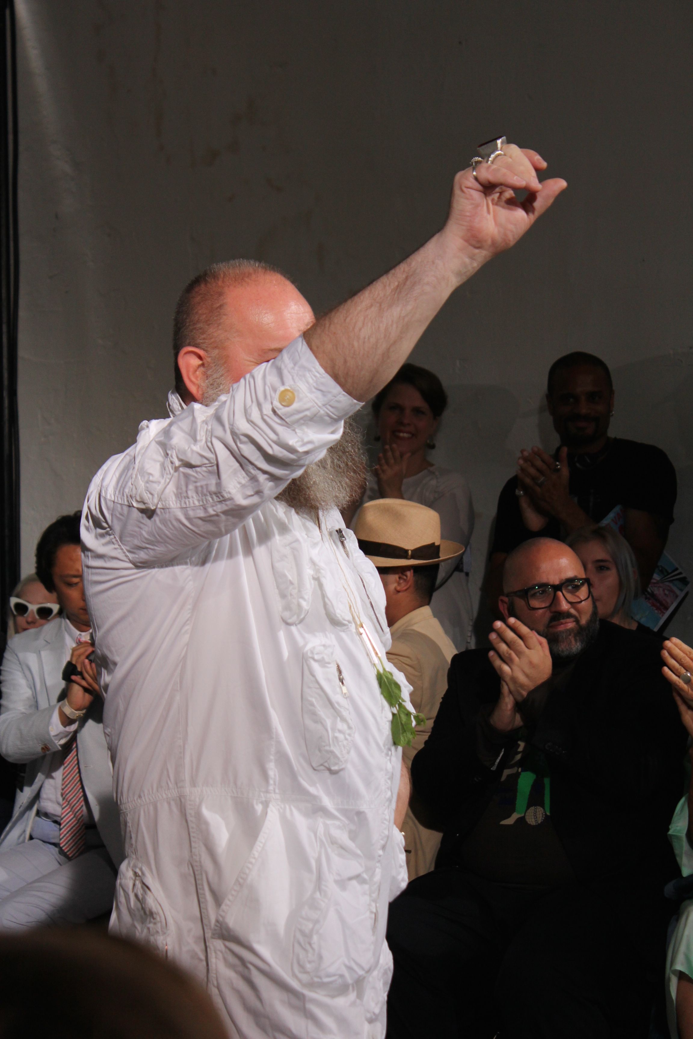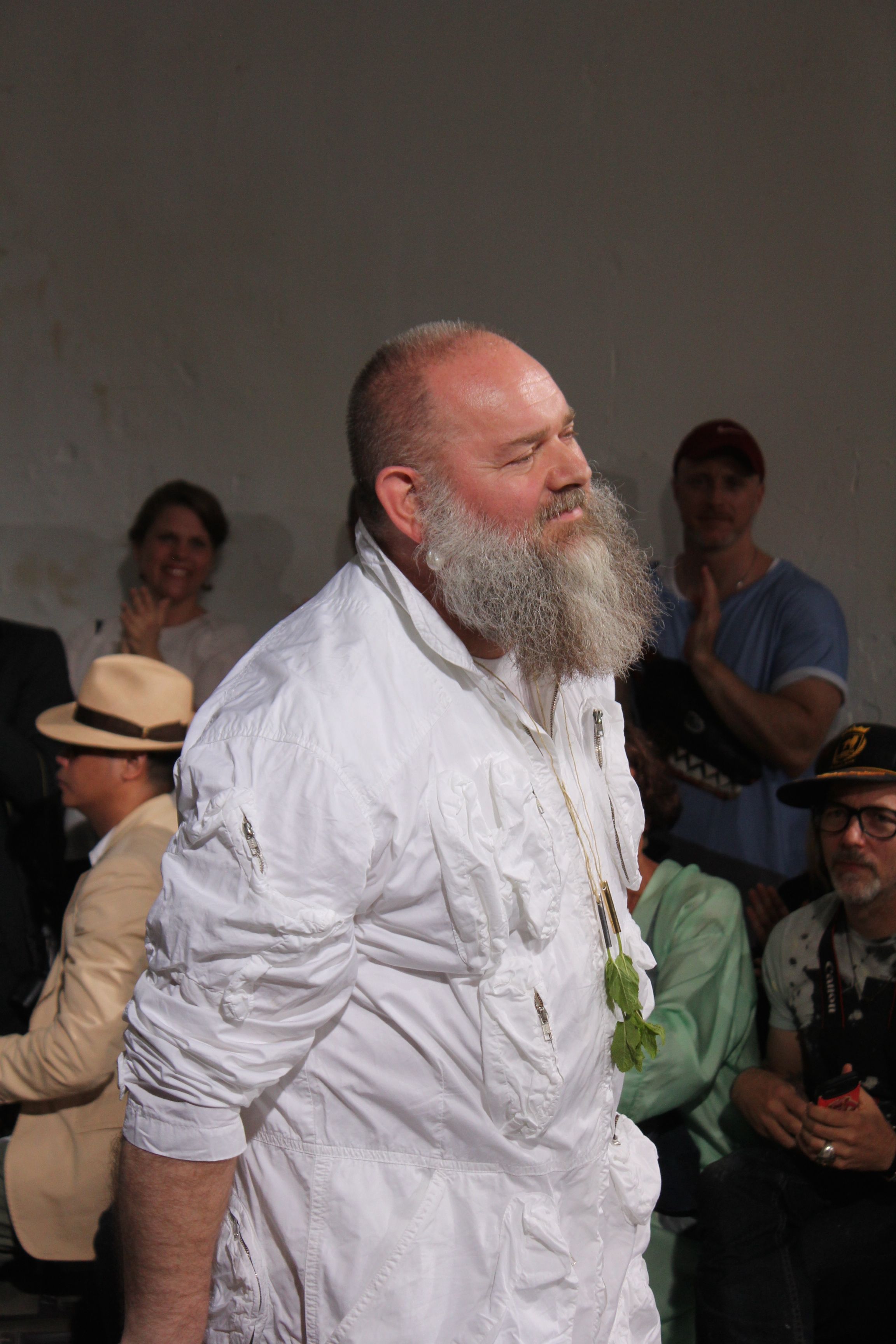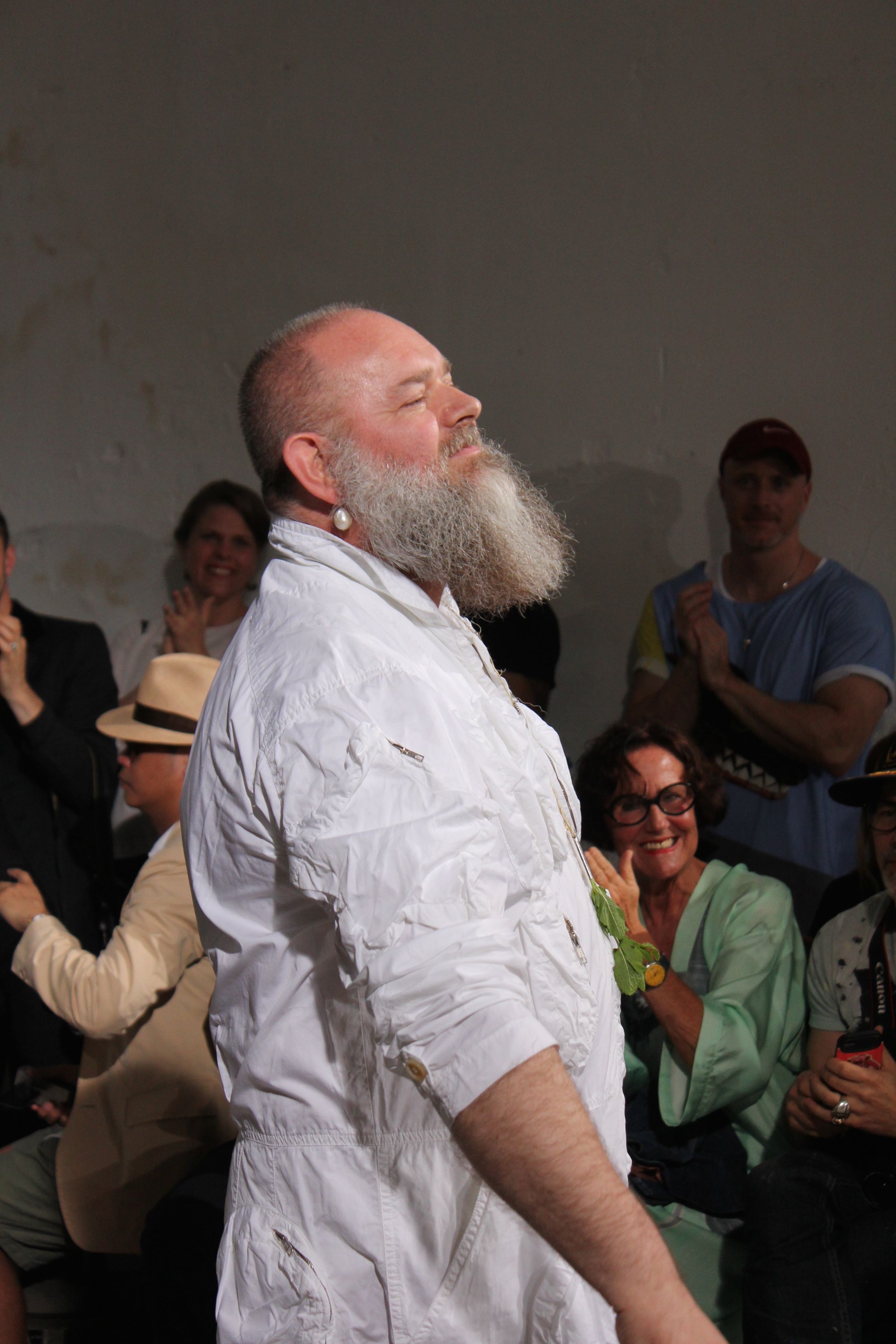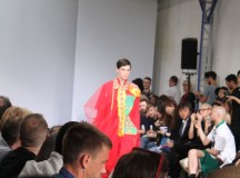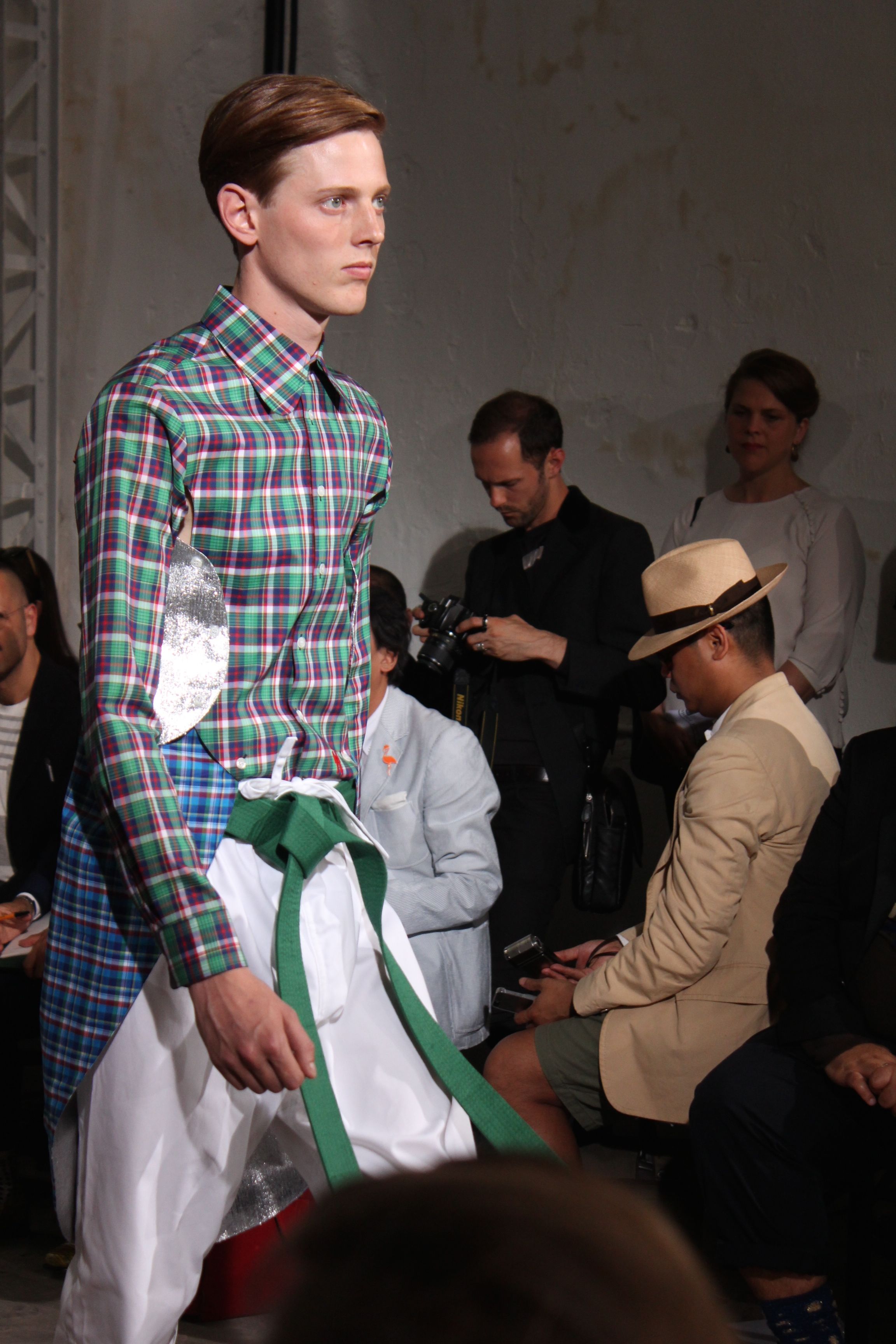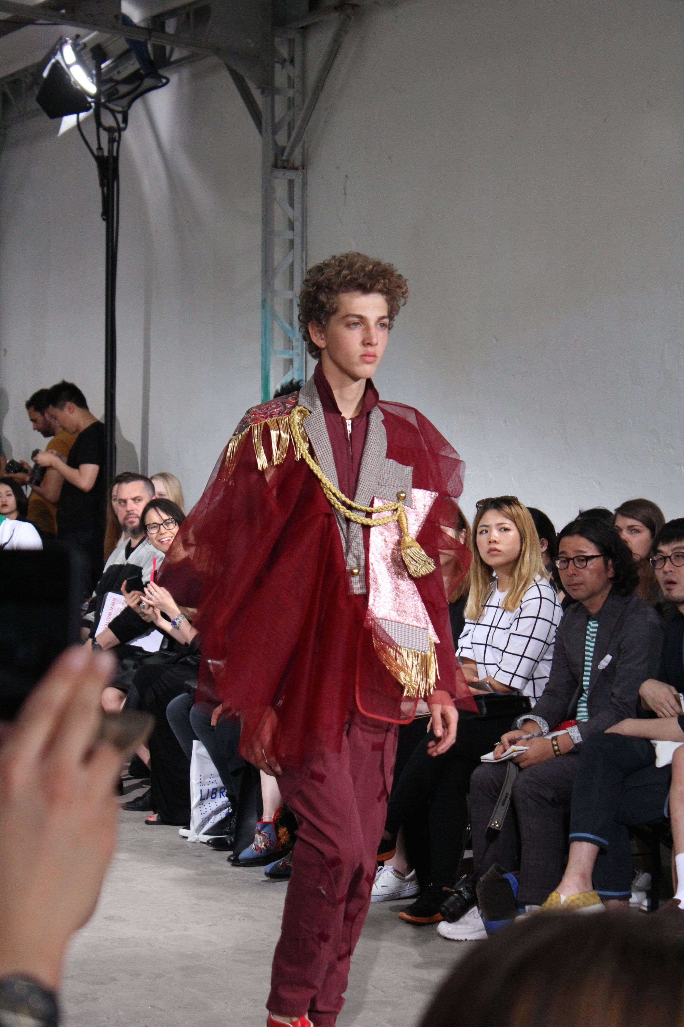 Romantisme et allure conquérante chez Walter Van Beirendonck…Chaque collection de Walter Van Beirendonck est construite au-delà du vêtement. Le créateur anversois profite du défilé pour divulguer des messages sur le monde qui l’entoure, se reflétant sur directement sur son vestiaire. Le dandy romantique prend des allures de conquérant. Les vestes et queues de pie sont construites pour se décomposer grâce à des boutons pression. Les ceintures comme les vestes kimonos et les pantalons amples sont inspirés du monde du judo. Le surfeur tel qu’il est vu par Walter, arrive en fuseau ou combinaison graphique et colorée. On retrouve les essentiels du créateur comme les combinaisons de travailleurs ou les tee-shirts amples. Le travail sur les matières – des brocards aux cotons épais – reste le point de départ, jusqu’à ses peintures imprimées réalisées par l’artiste Scooter Laforge.