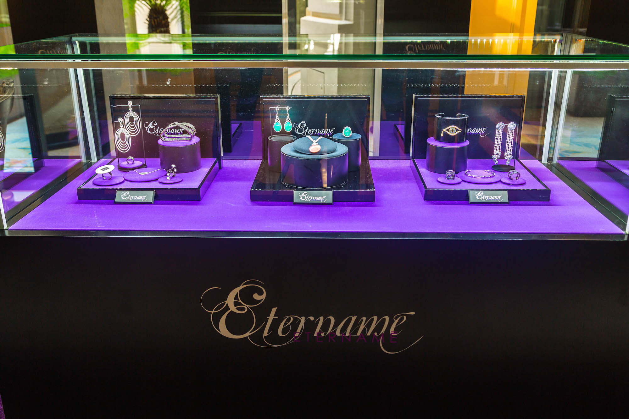 A l’image du Boudoir, la boutique s’inscrit parfaitement dans l’univers Eternamé. Ornée de miroirs inspirés de la collection Lunaria, elle révèle tout le raffinement des créations. Aux couleurs violettes et parme, soulignées par une note dorée, c’est dans une ambiance feutrée que les clients seront accueillis. Vitrines et meubles en bois laqué noir révèlent les collections, avant de se diriger vers un petit salon privé pour finaliser son choix. Un lieu unique pour une Maison de Joaillerie unique en son genre.