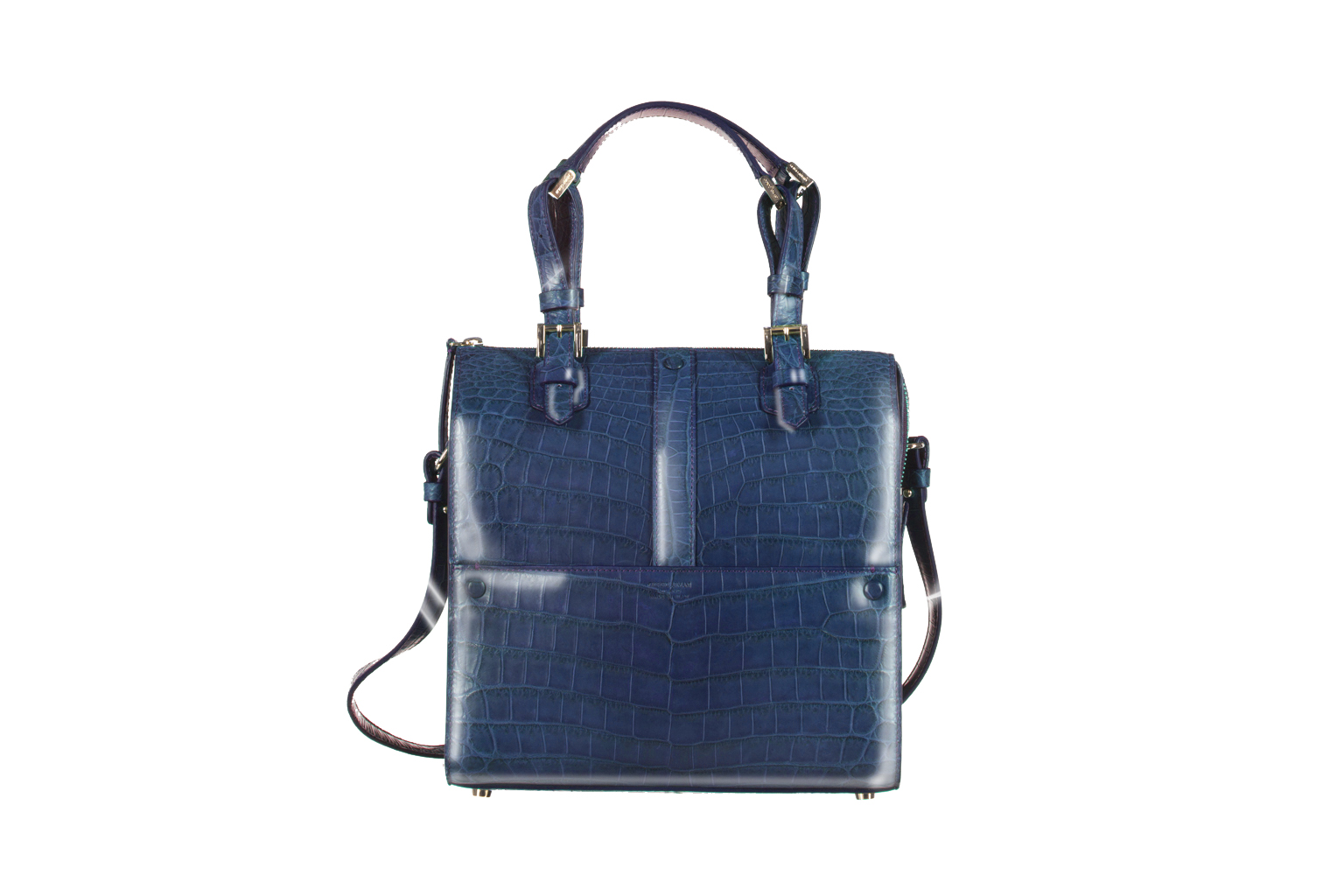 En crocodile bleu avec double anse et fermeture éclair, et sa doublure doré clair.