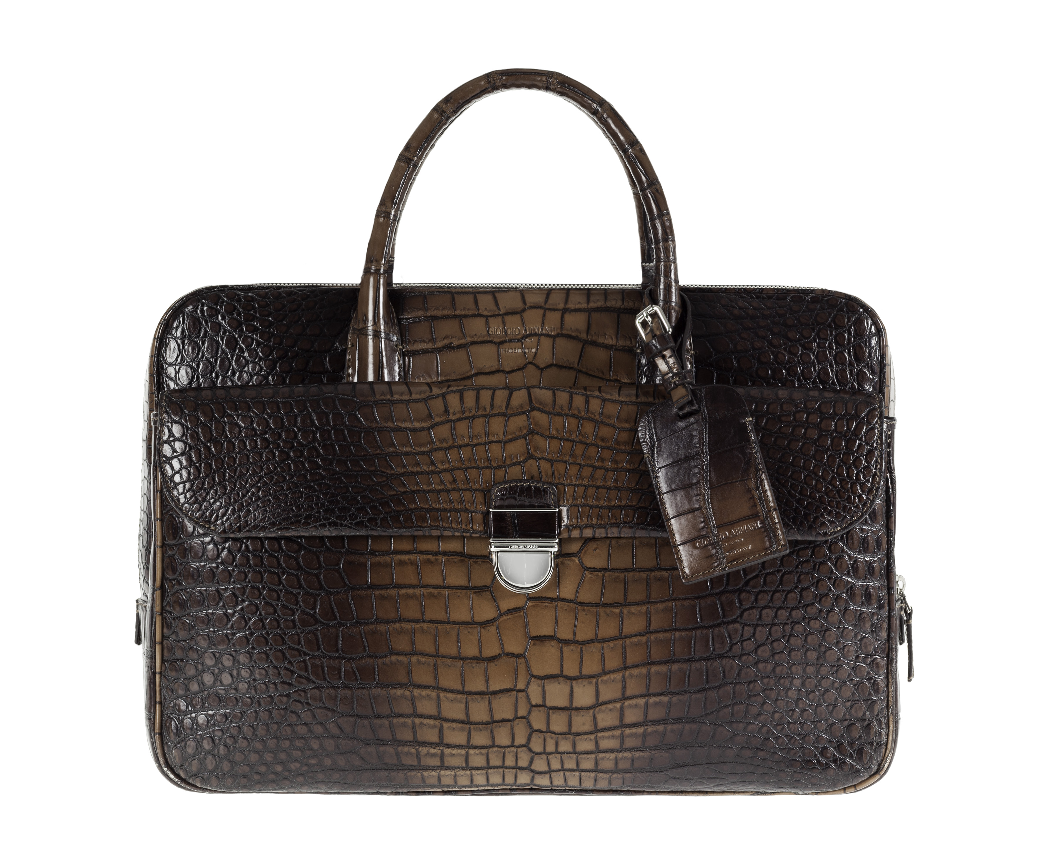 L’effet dégradé du sac crocodile Giorgio Armani a été réalisé grâce à une peinture à la main, où les parties les plus sombres se concentrent sur les bords.