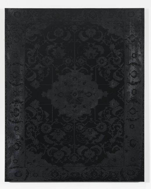 Rudolph Stingel est un artiste majeur de la scène internationale contemporaine. Le principe de ce tableau est qu’il reproduit le motif d’un tapis classique. Le tapis est un objet de décoration de luxe et de raffinement, qui est ici complètement réinterprété dans quelque chose de définitivement plus moderne et radical, de part le monochrome noir et le support tableau.