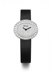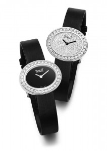 Les montres en forme de solitaire, ovales horizontales reflètent ces deux combinaisons; Soit le contraste de la laque noire et des diamants, ou, un étincelant pavage de diamants.