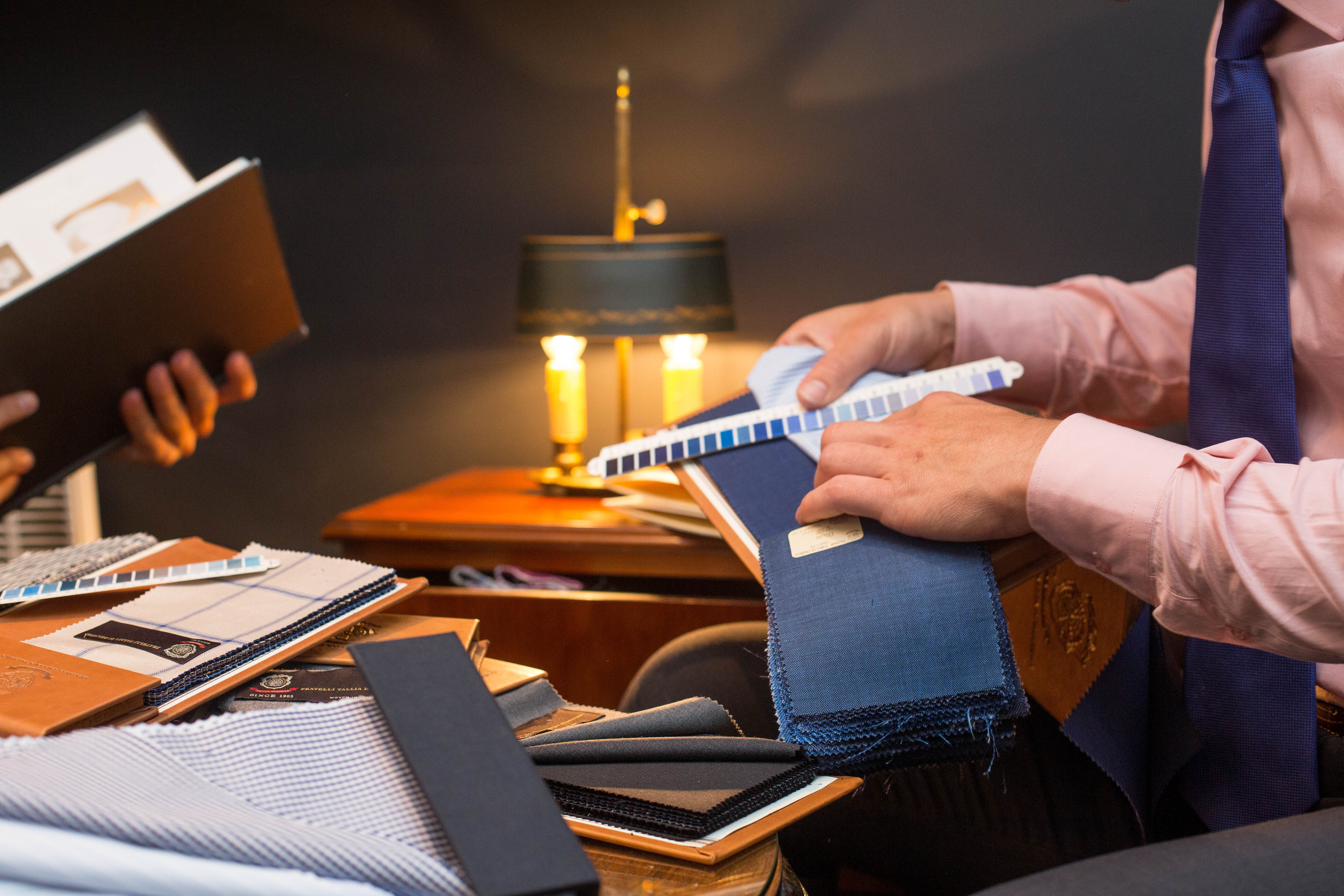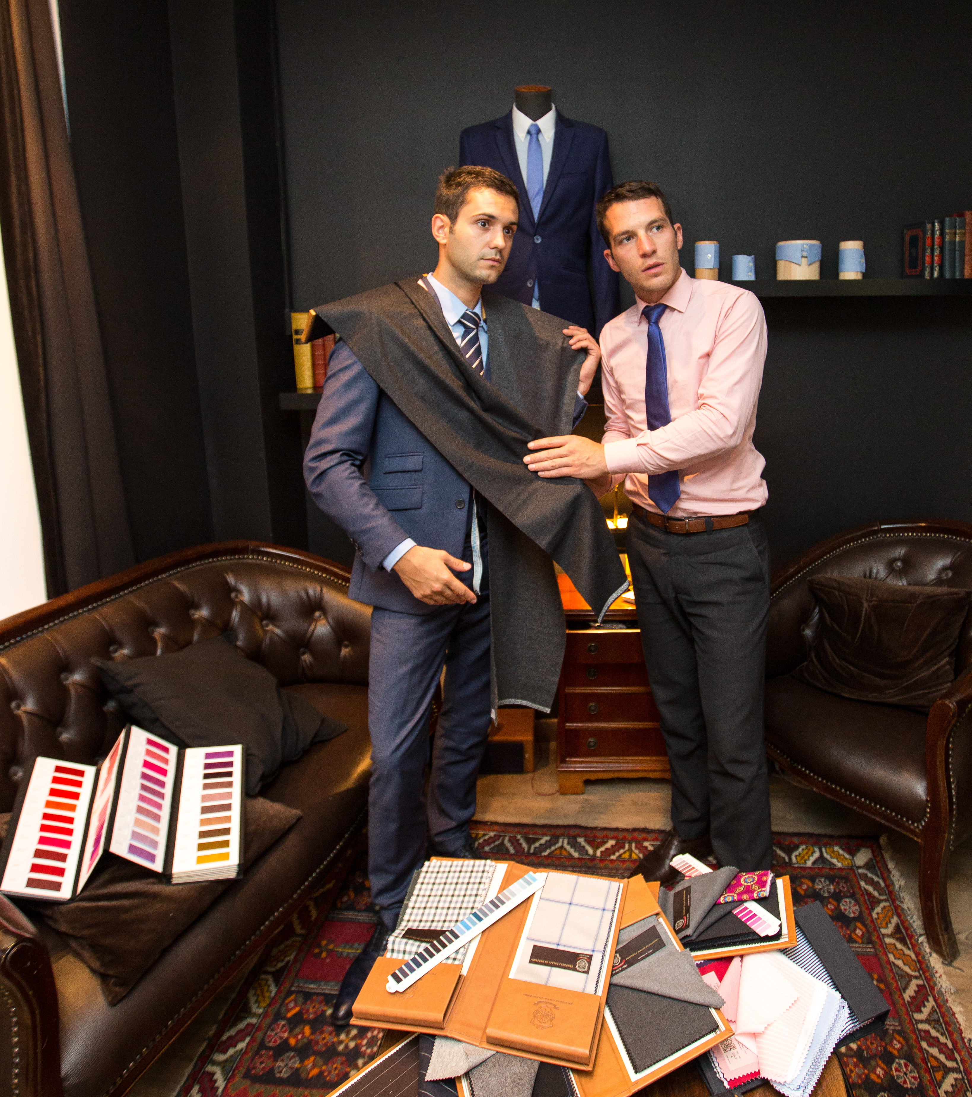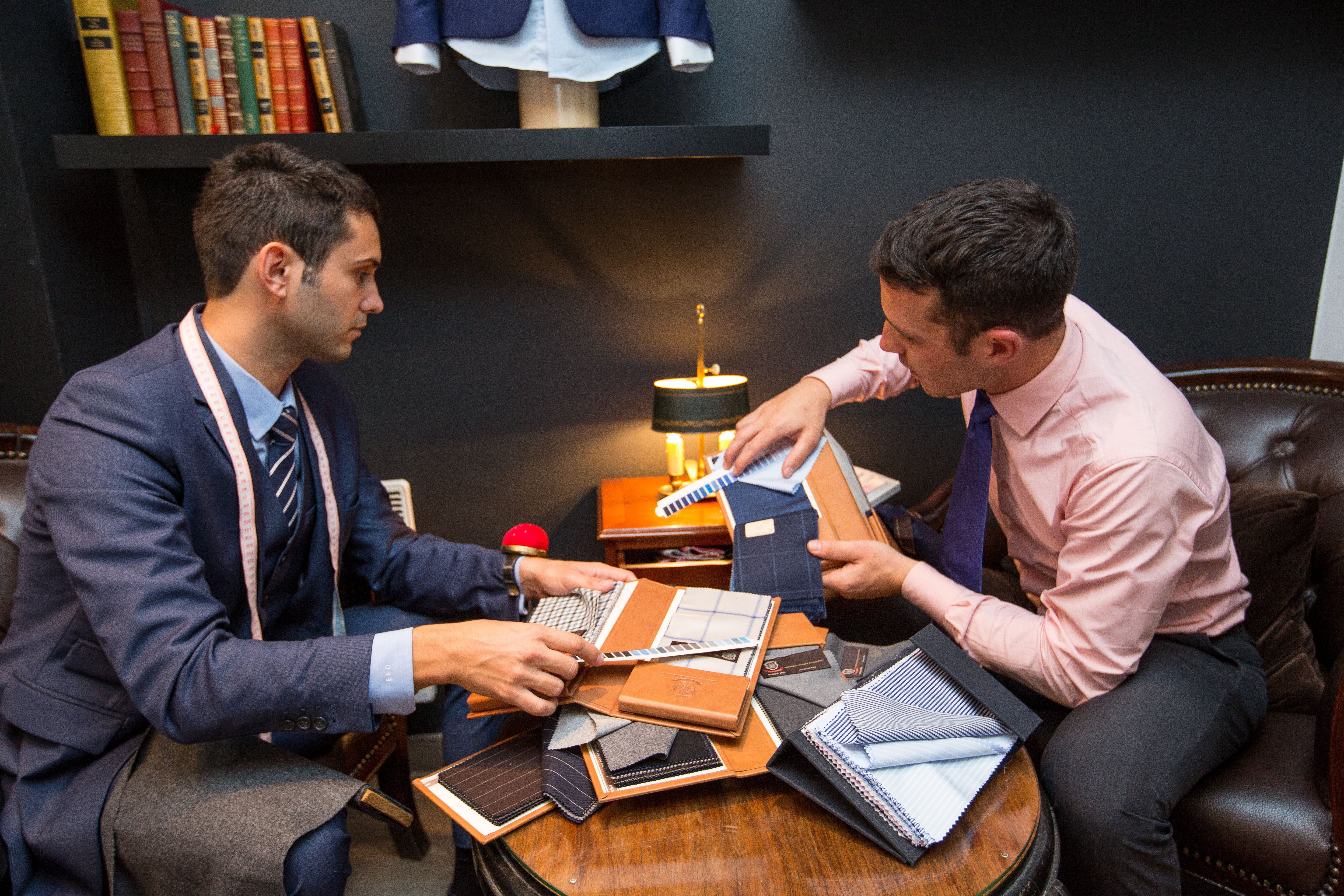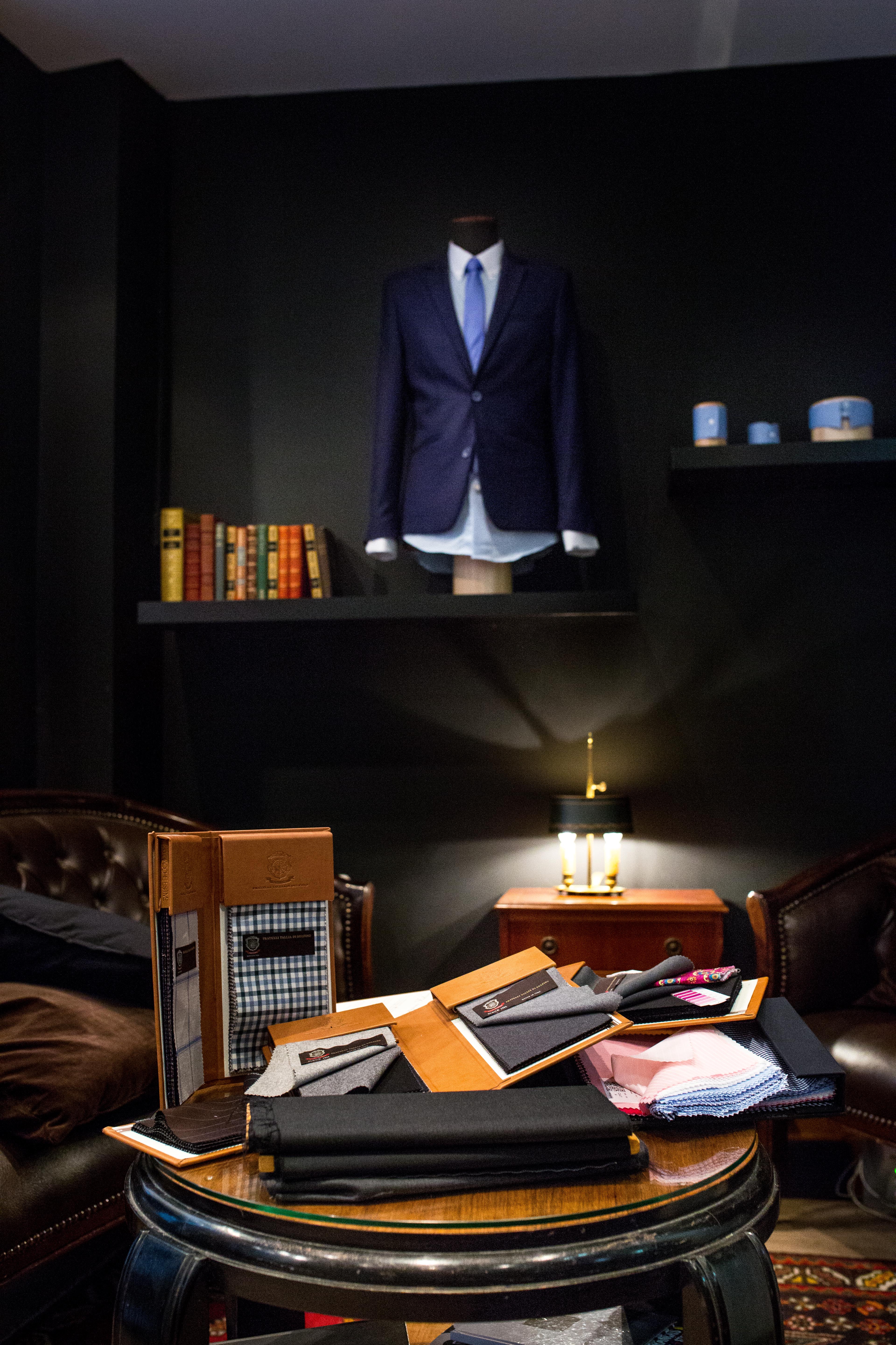 Tout a commencé il y a quelques semaines dans une boutique cosy de paris que vous retrouverez 9 rue de Palestro 75002 Paris. Confortablement assis dans un fauteuil nous faisons défiler les tissus et les matières pour choisir le costume de nos rêves.