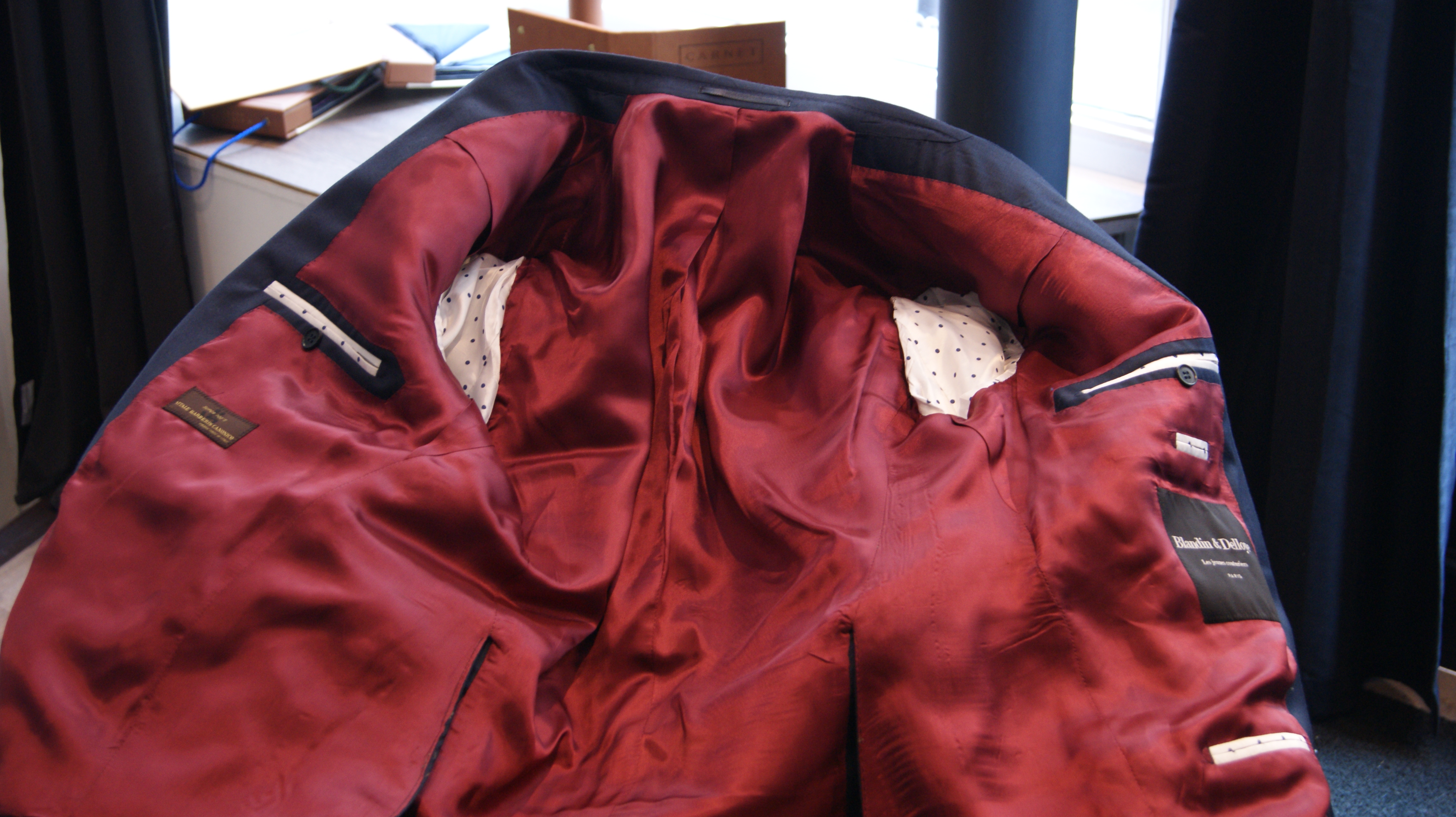 Tissus italiens, intérieurs, doublures tout y passe, nous customisons tout pour arriver au costume que nous désirons. Notre choix se porte sur un costume de tissus italien Vitale Barberis Canonico bleu nuit, intérieur bordeaux pour le contraste et intérieurs manches blanc et pois.