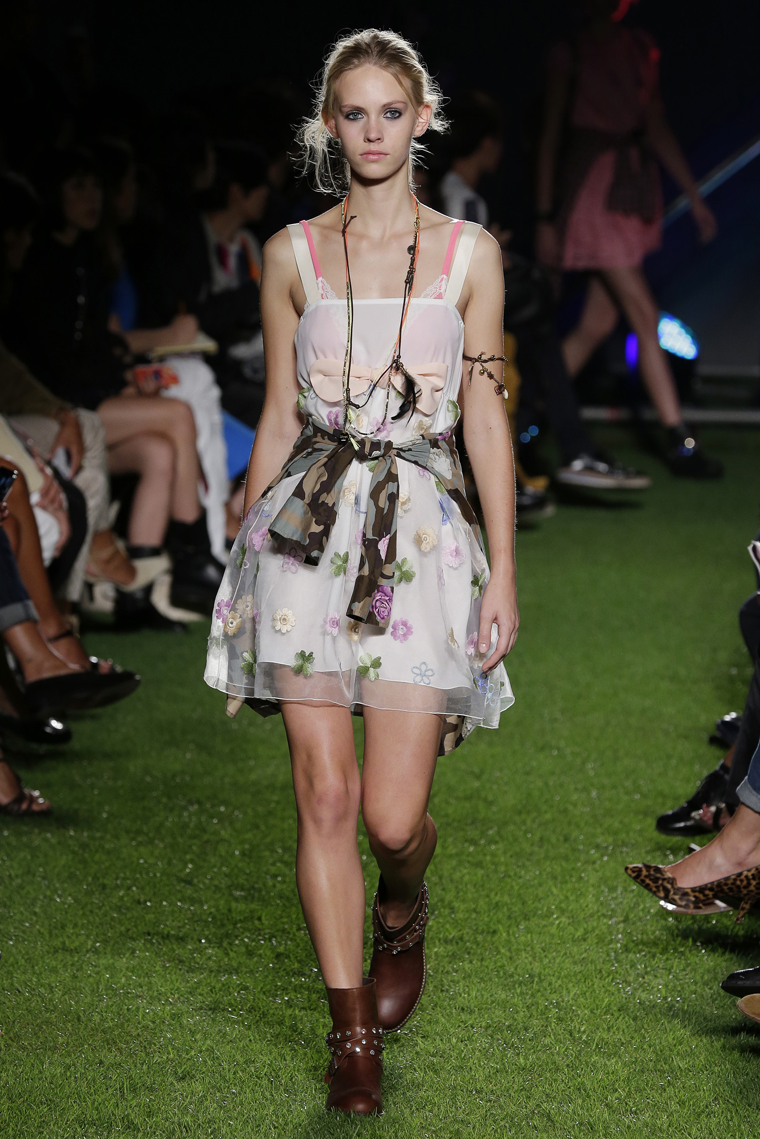 Les motifs camouflage sont rehaussés d’imprimés floraux. Les jupes en mousseline de soie côtoient les robes en jersey girly, les t-shirts en dentelle se voient complétés de vestes et les shorts en jean qui font un clin d’œil aux années folles.