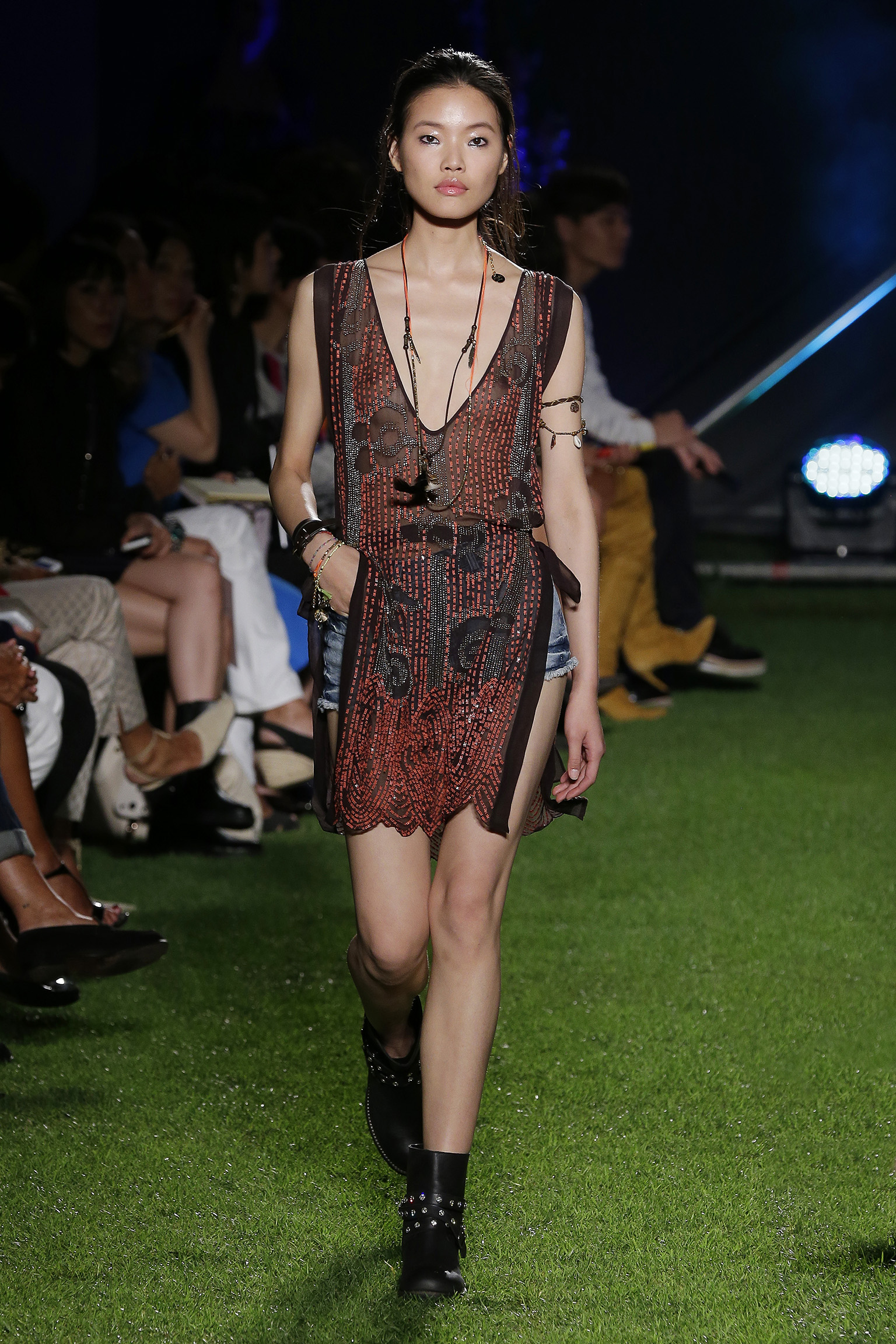 Les vestes en denim brodées et déchirées se mélangent aux Caftans. Le long joue avec le court, la transparence s’oppose aux broderies. Les tuniques satinées sont combinées avec short. Les robes en corolle sont marquées à la taille par des ceintures en cuir. Les robes en dentelle Sangallo noir irradient de lumière.