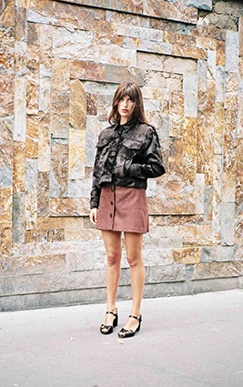 3. Blouson cropped en faux poulain (350 €) (existe aussi en version pied de coq noir et écru en drap de laine 275€ ) avec jupe courte évasée dans les bruns ambrés.