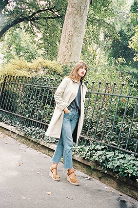 5. Trench droit emprunté aux 60th à col sage. (340 €) et pull pumpy en cachemire bleu denim chiné.