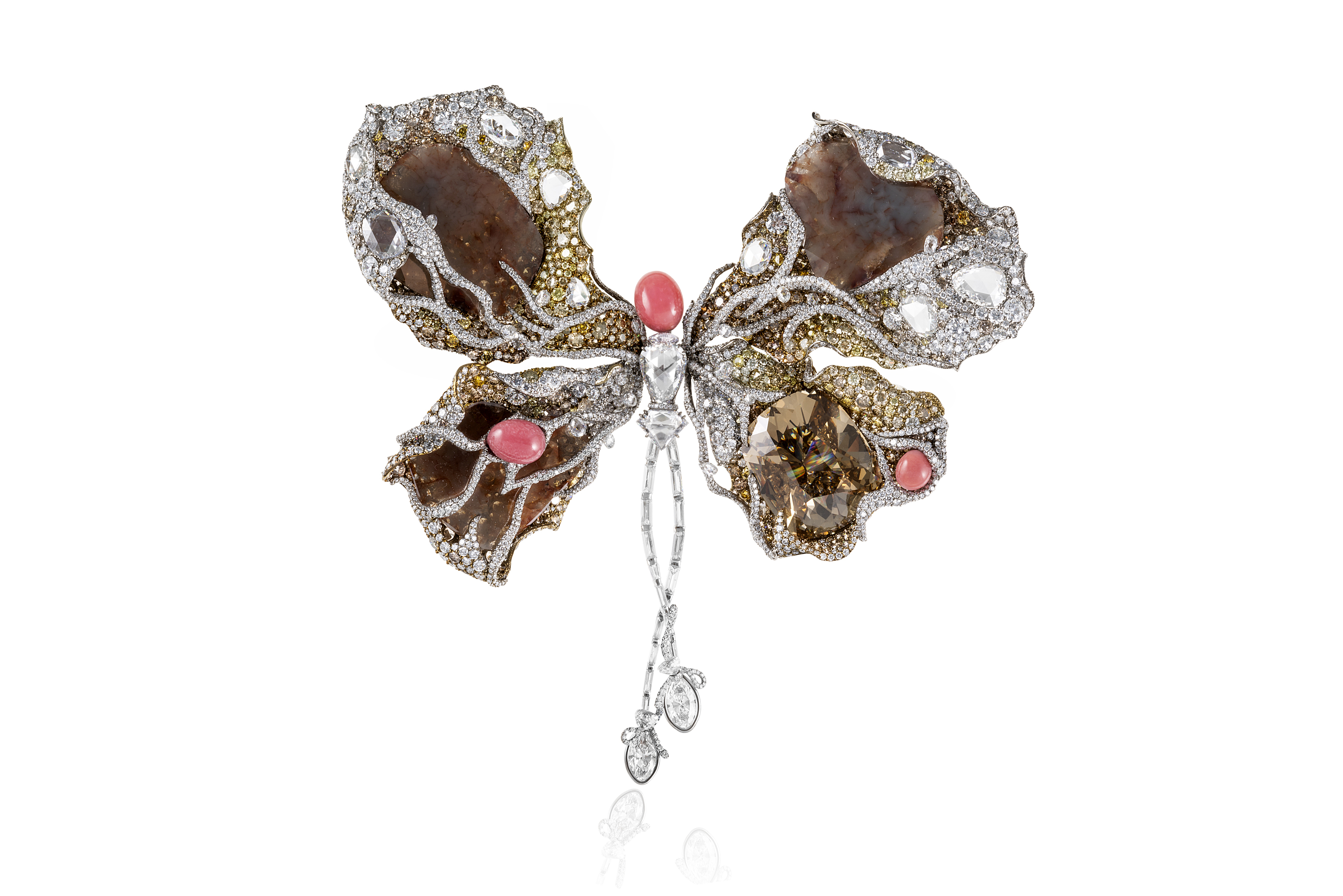 Un diamant coussin brun de 26,27 carats, trois diamants bruts bruns pesant 47,71 carats au total, trois perles de conque de 7,25 carats au total, entourés de 4 698 diamants et diamants fantaisie colorés de 98,09 carats.
