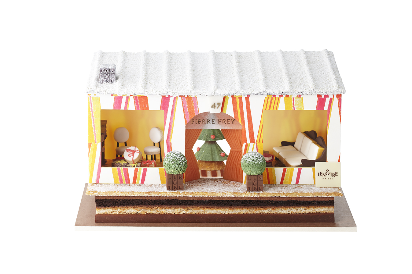Pour dessiner la bûche de Noël, Patrick Frey et Pierre son fils aîné, ont imaginé avec la complicité de Guy Krenzer, Directeur de la Création Lenôtre, un salon chaleureux et confortable derrière la façade du «47» revêtue des grands losanges multicolores du tissu Carriacou, l’un des best sellers de la Maison.